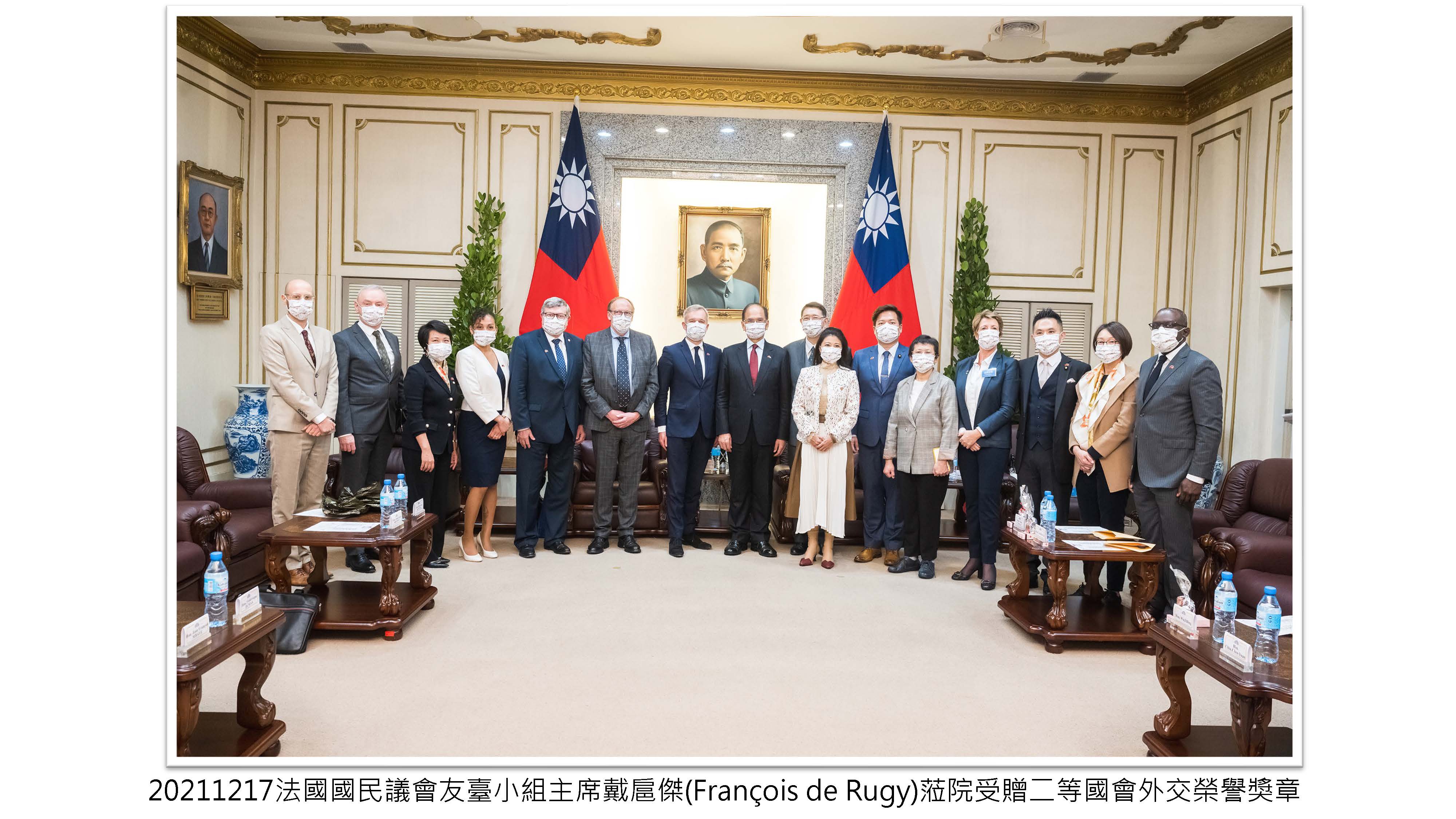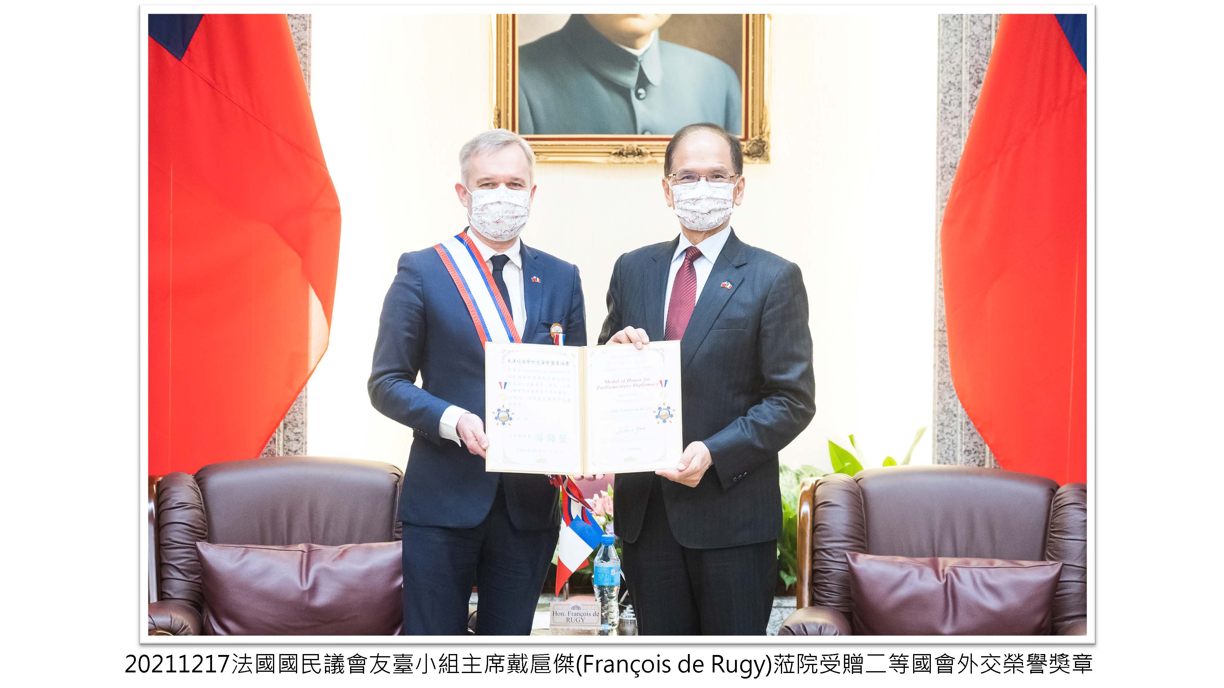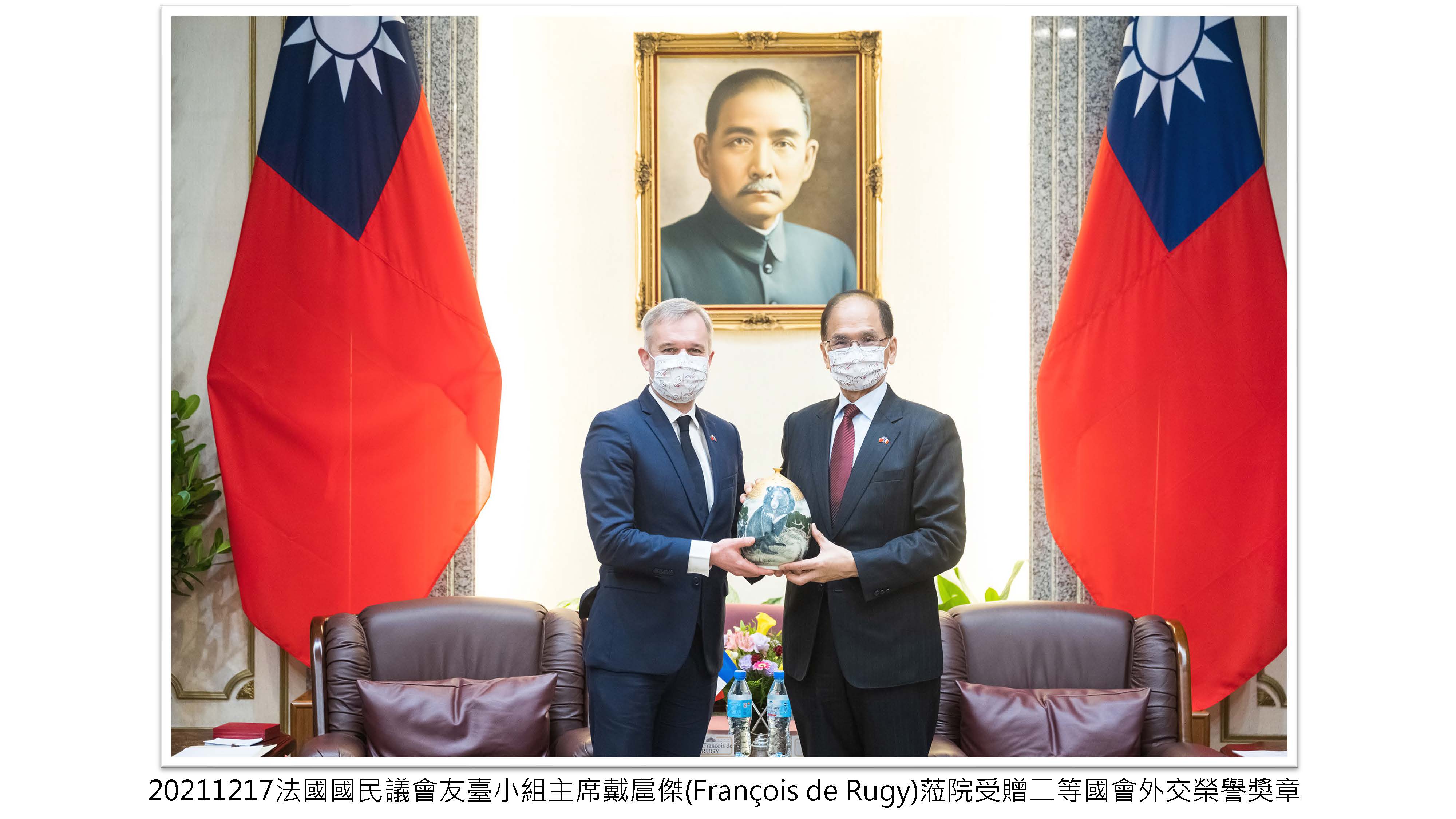 法國國民議會友臺小組主席戴扈傑(François de Rugy)蒞院受贈二等國會外交榮譽獎章,並致贈本院友臺決議文,表達法國會對臺強烈支持。