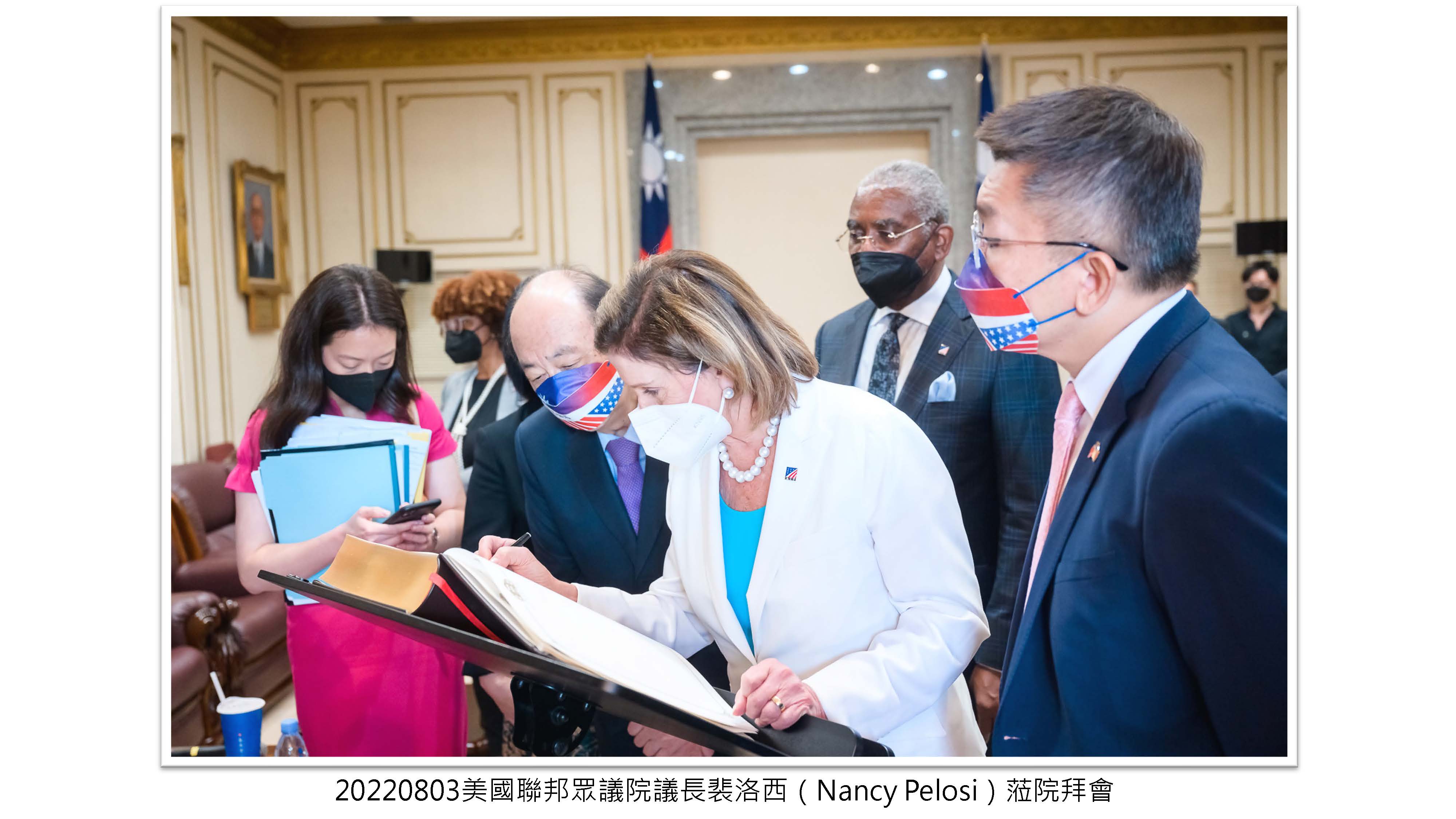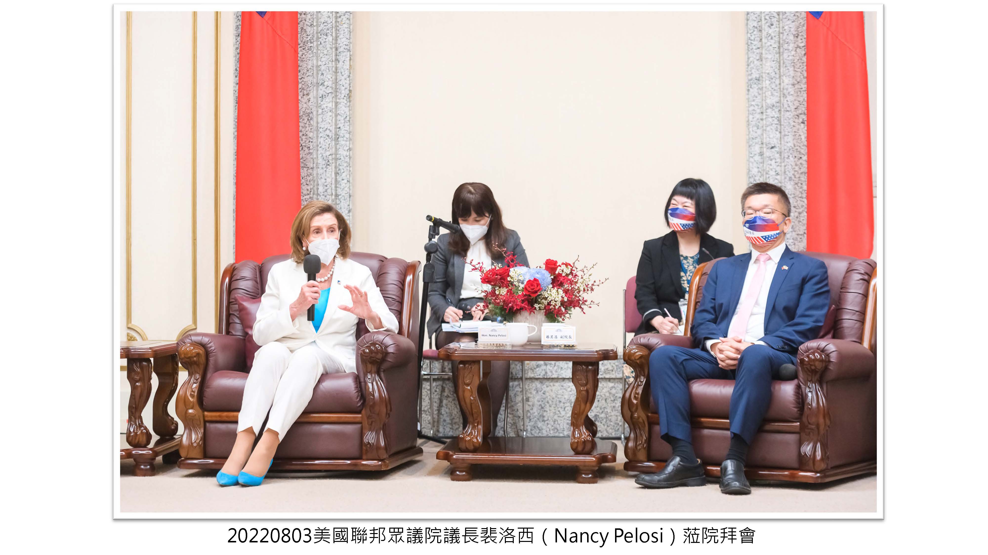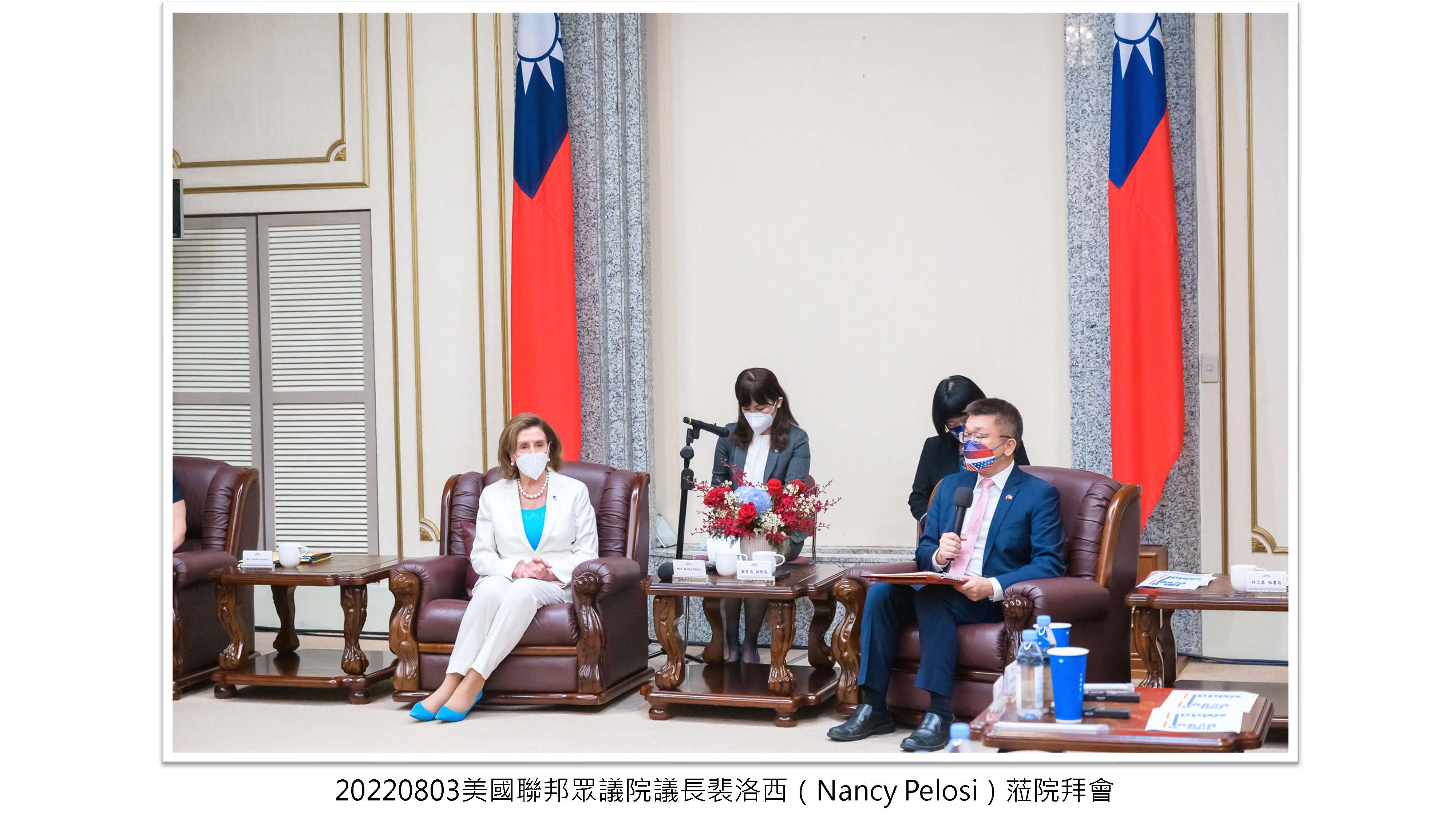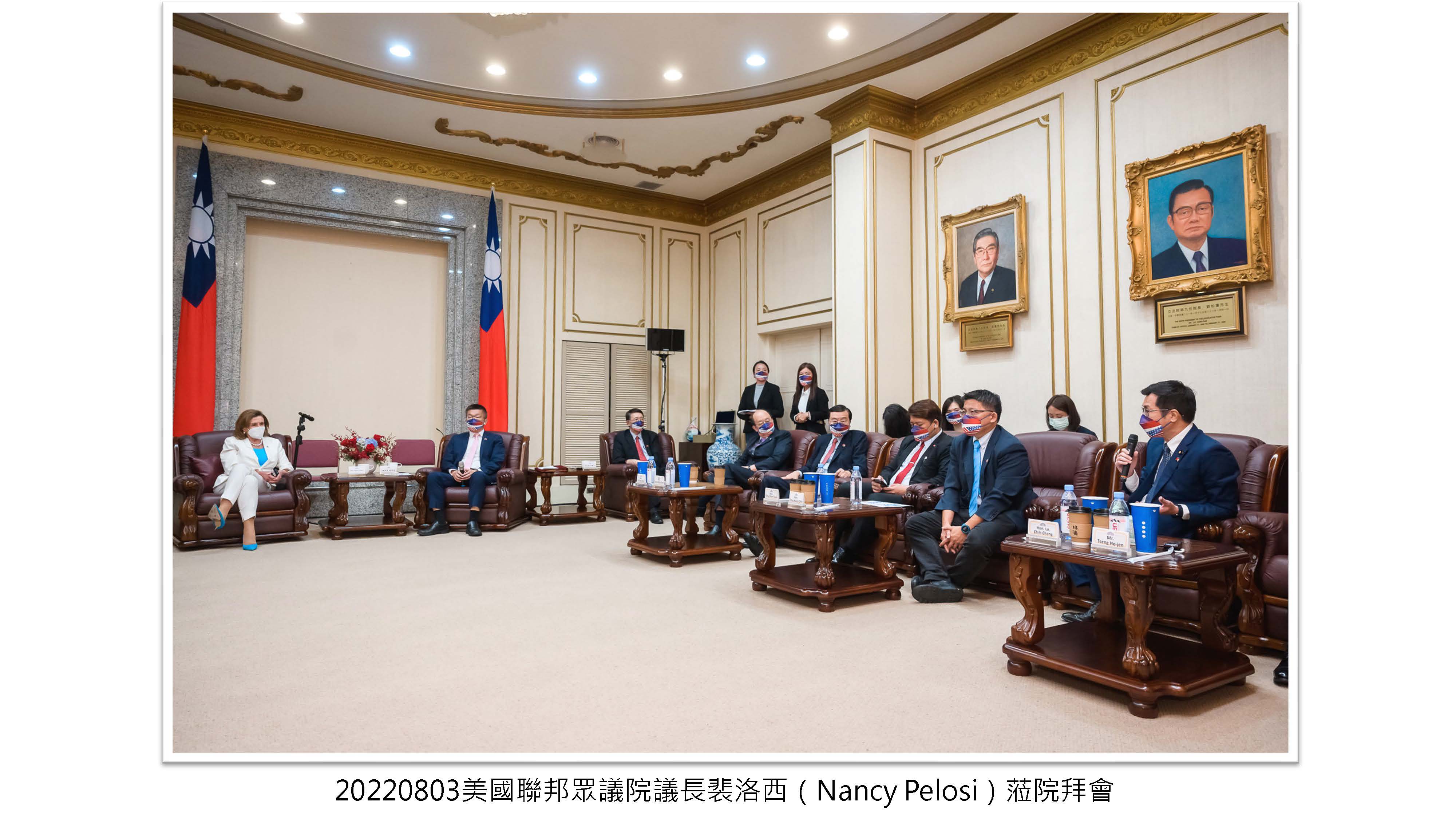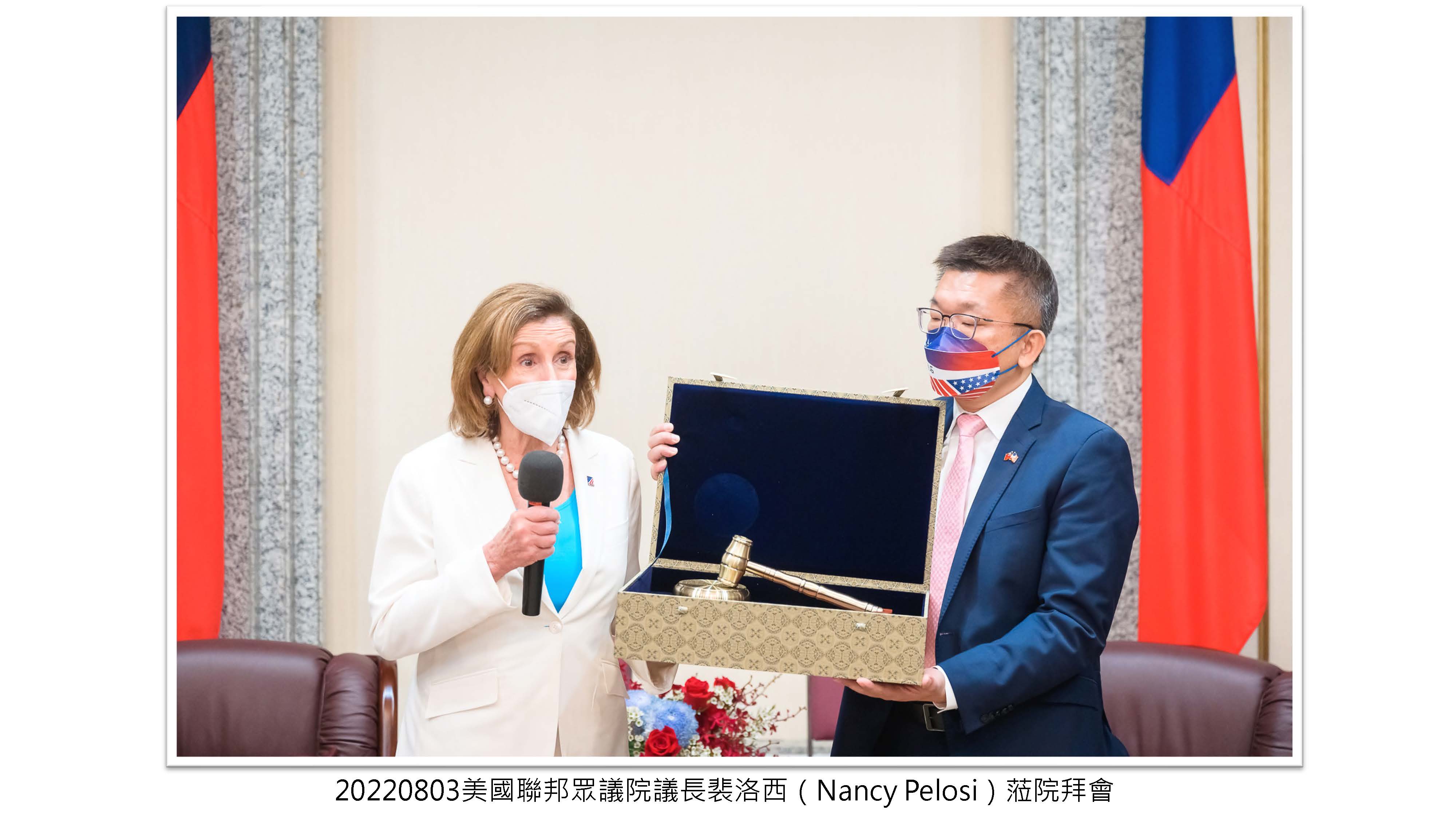 美國聯邦眾議院議長裴洛西(Nancy Pelosi)蒞院拜會展現美國對臺強烈的支持,並就臺美合作、印太局勢、晶片法案、退伍軍人福利、氣候變遷等議題交換意見。