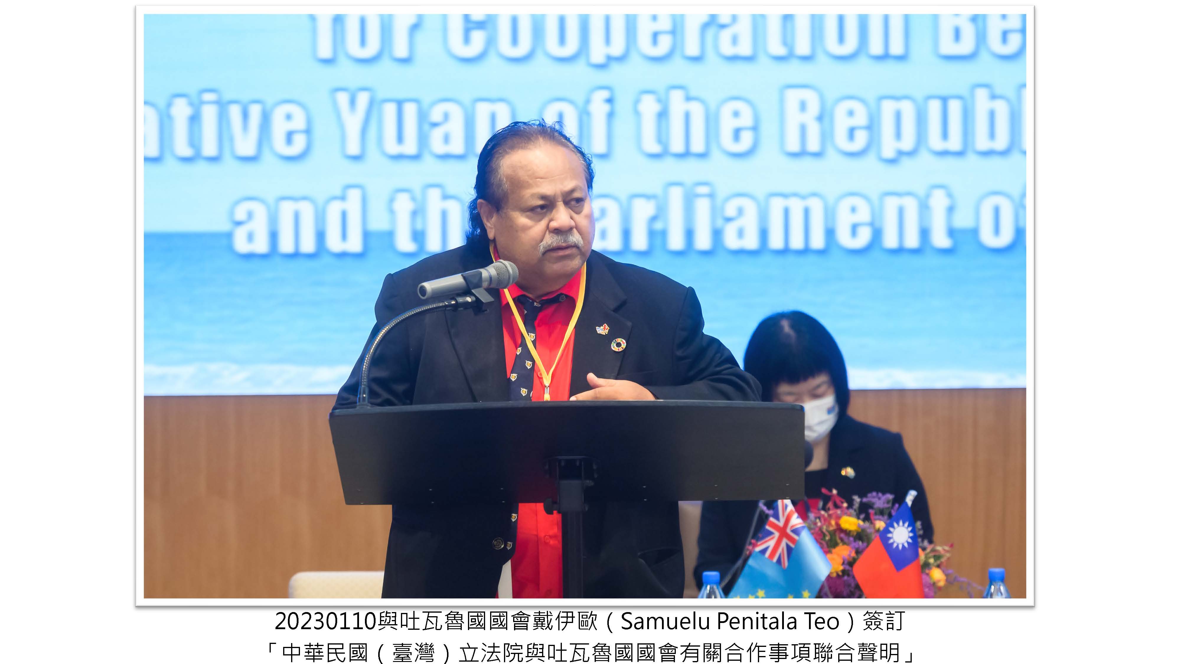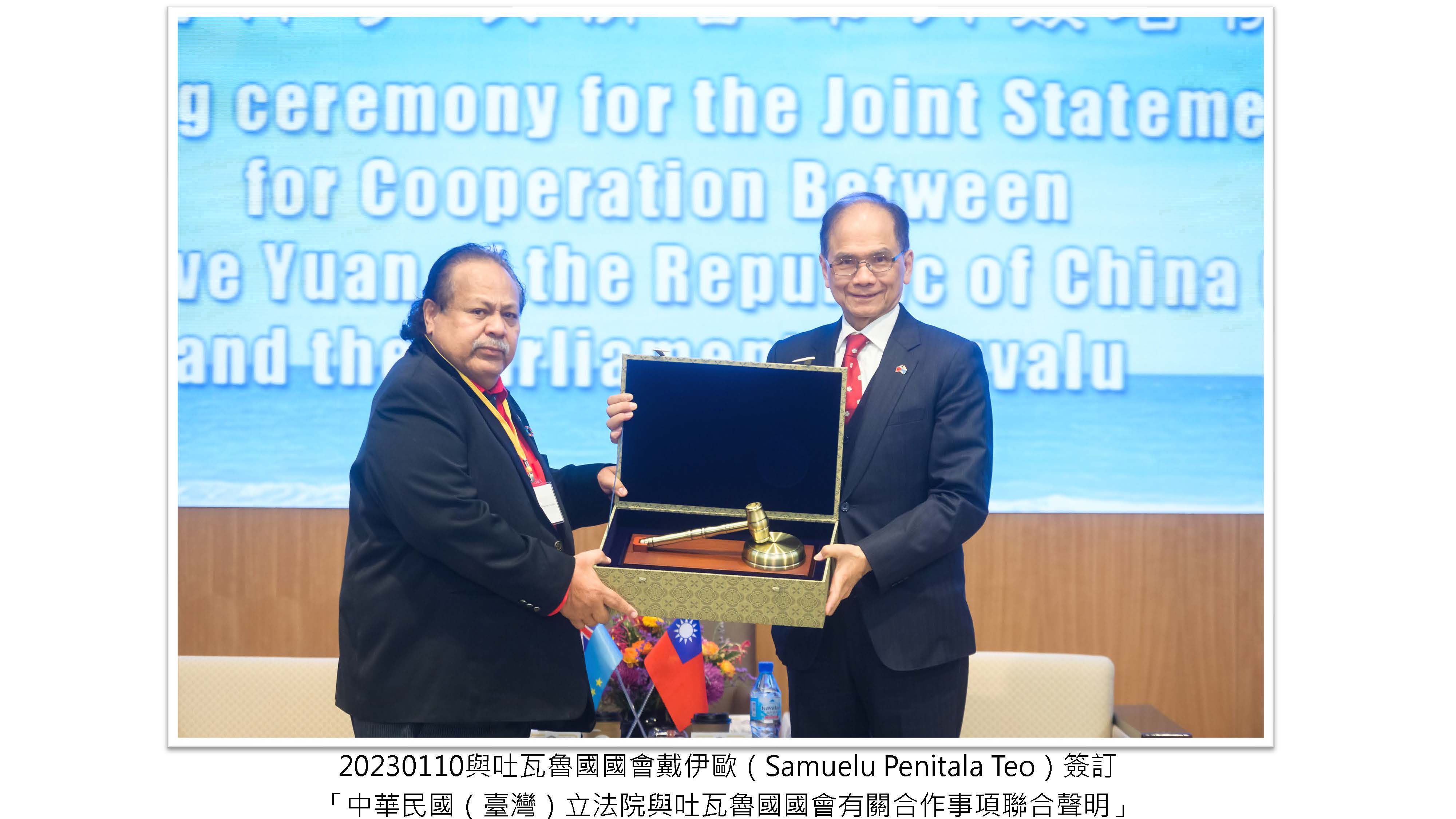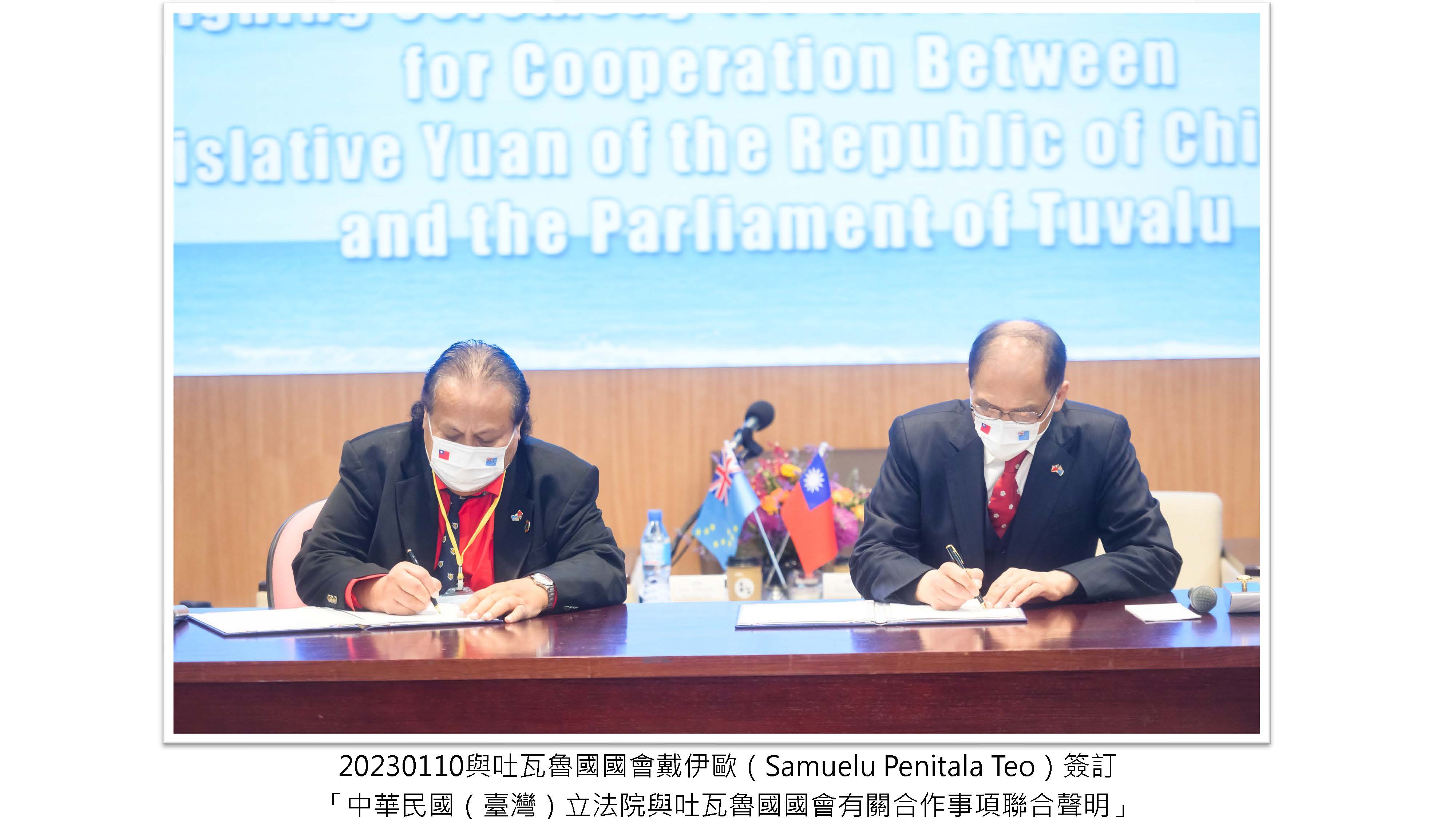 與吐瓦魯國國會戴伊歐(Samuelu Penitala Teo)簽訂「中華民國(臺灣)立法院與吐瓦魯國國會有關合作事項聯合聲明」,盼深化兩國國會交流,促進雙方產業合作及經驗共享,並為更和平繁榮的印太地區共同努力。