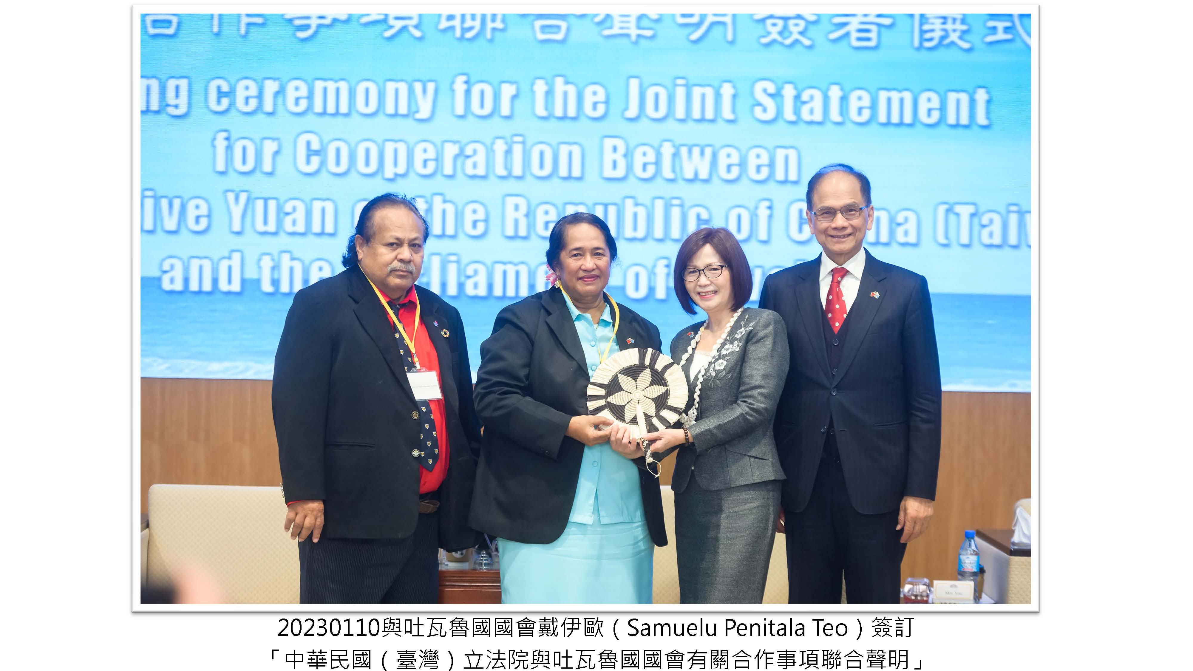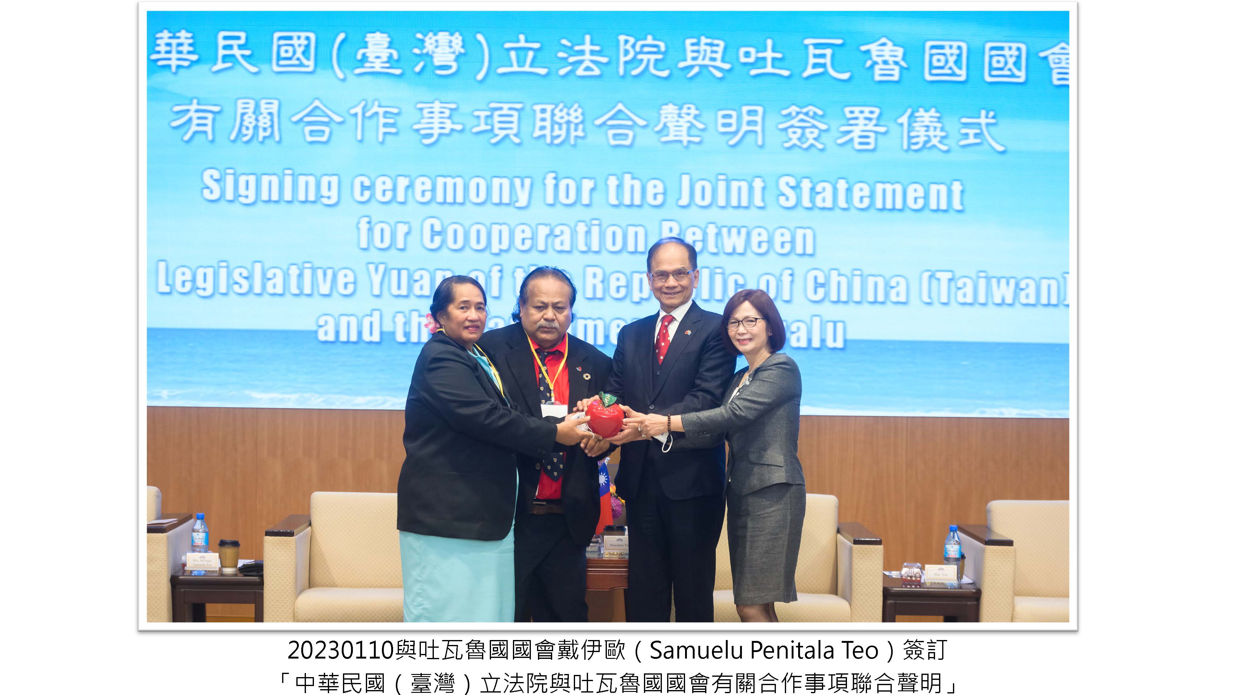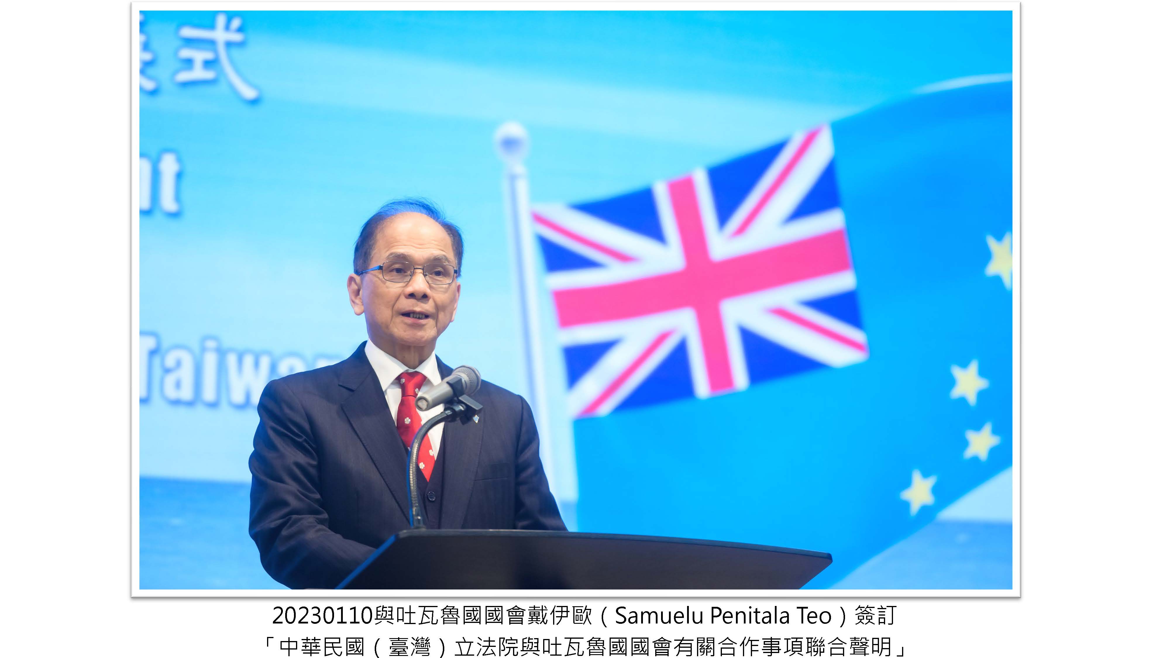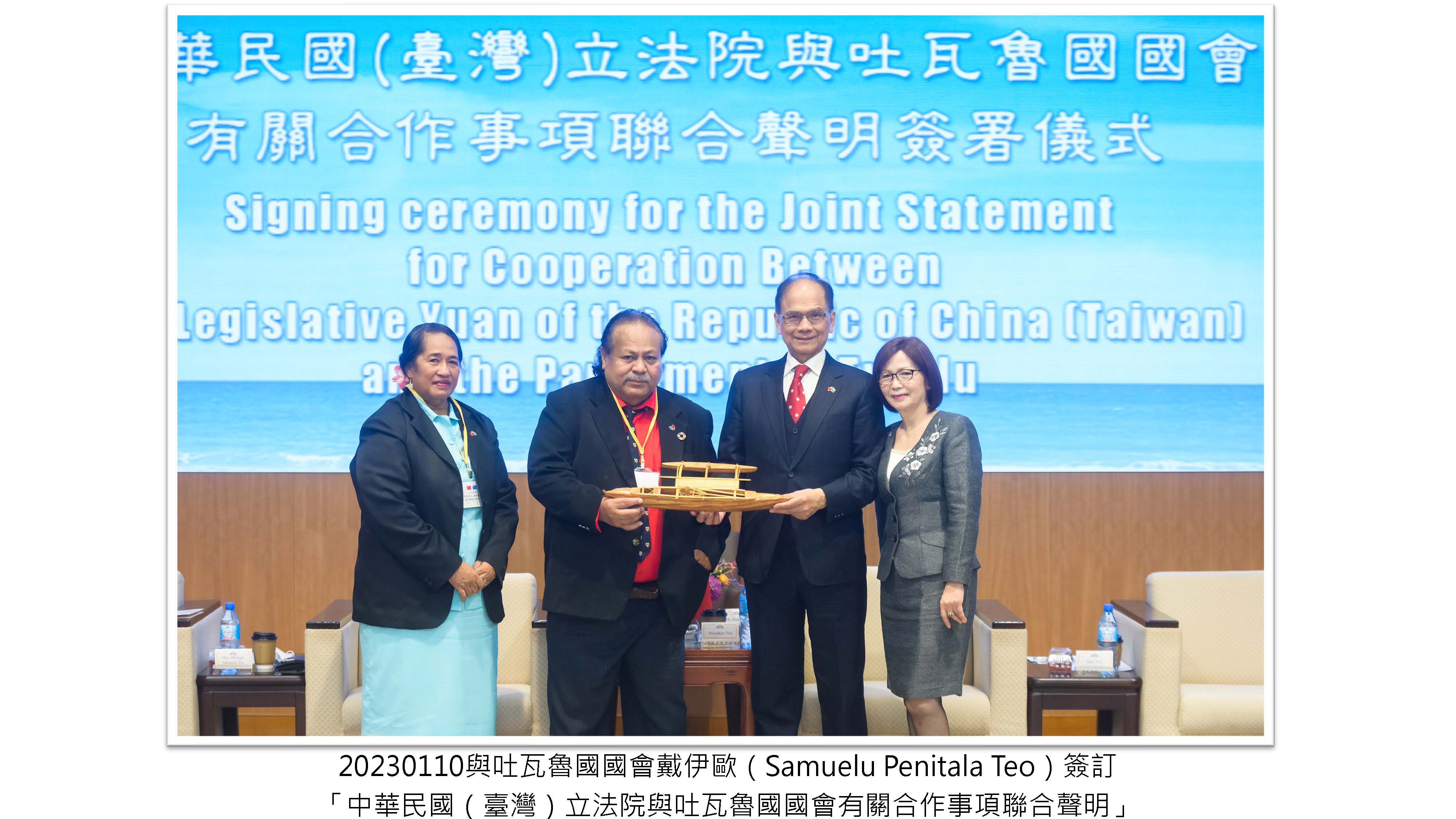 與吐瓦魯國國會戴伊歐(Samuelu Penitala Teo)簽訂「中華民國(臺灣)立法院與吐瓦魯國國會有關合作事項聯合聲明」,盼深化兩國國會交流,促進雙方產業合作及經驗共享,並為更和平繁榮的印太地區共同努力。