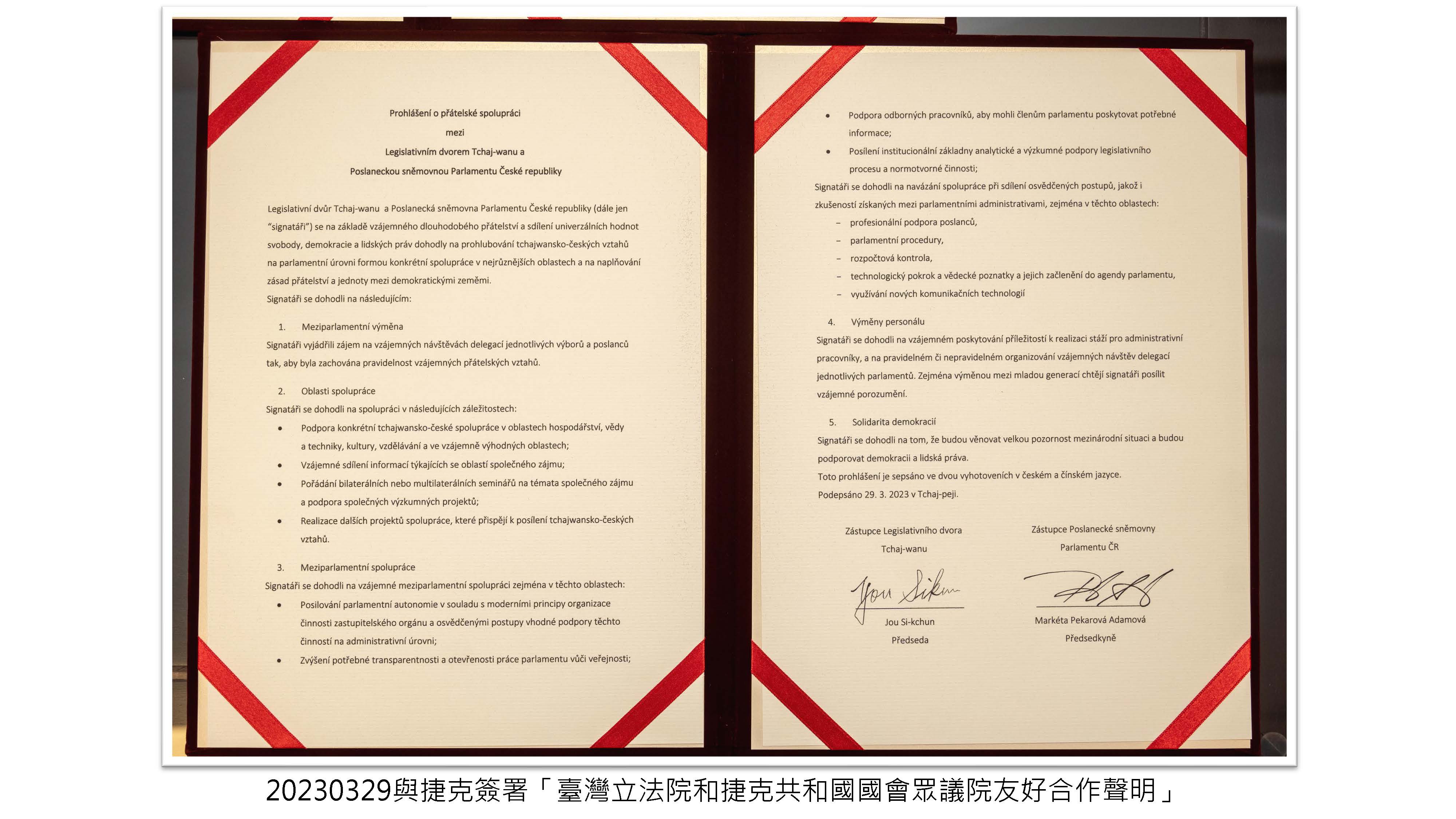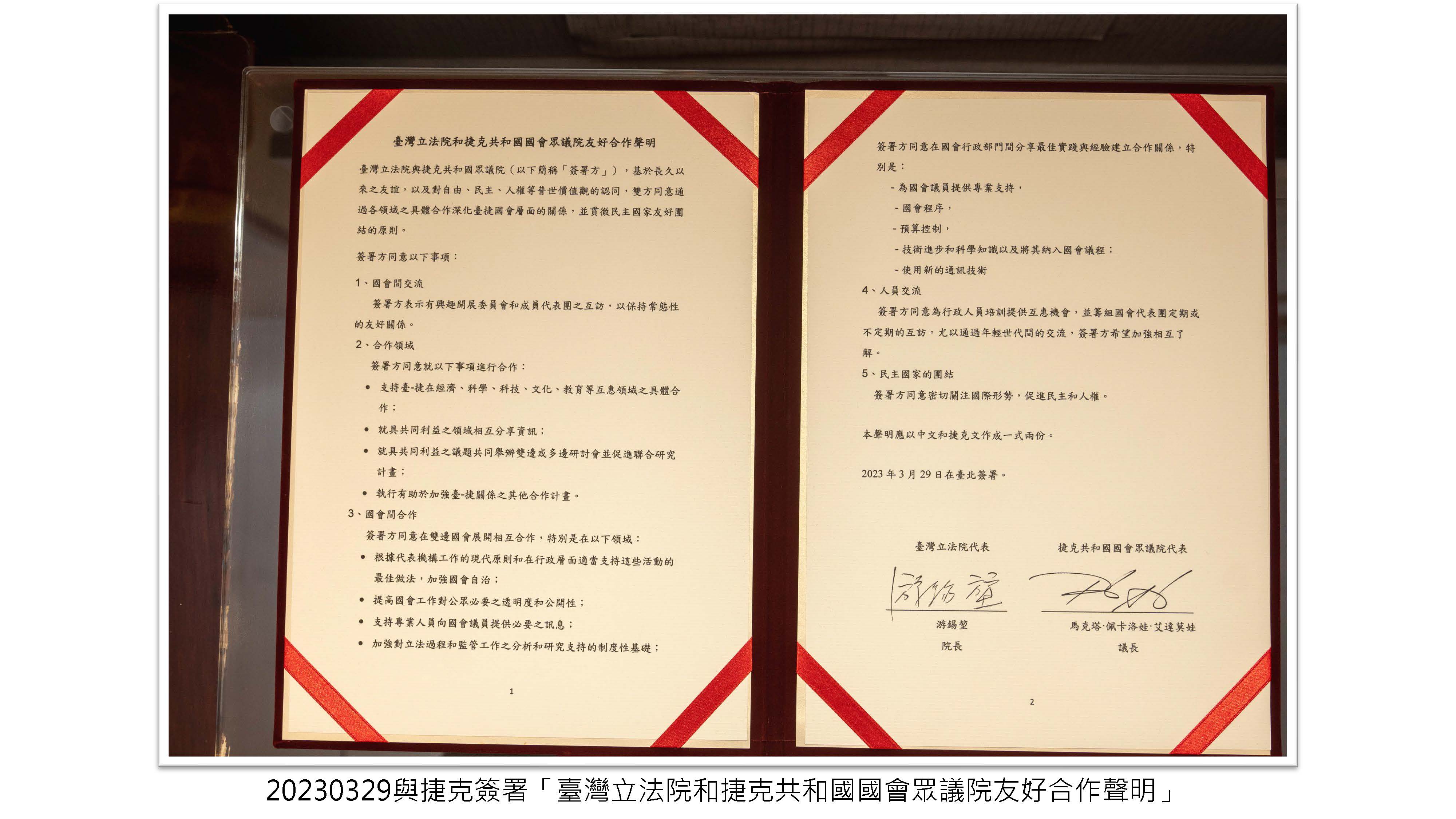 此為立法院首次與非邦交國國會簽署之正式合作聲明,全稱「臺灣立法院和捷克共和國國會眾議院友好合作聲明」,無論中文與捷克文版本均以臺灣為名。