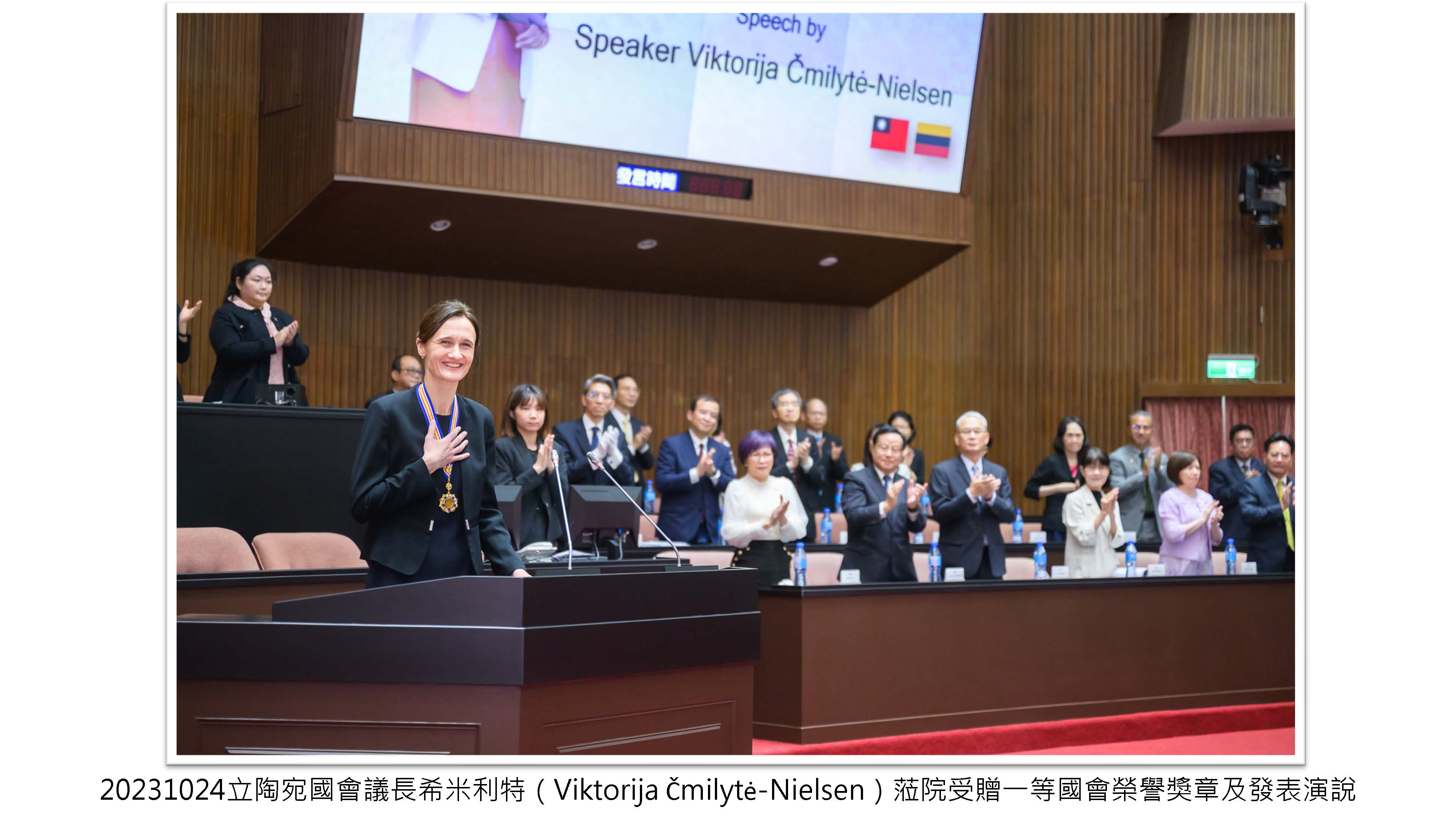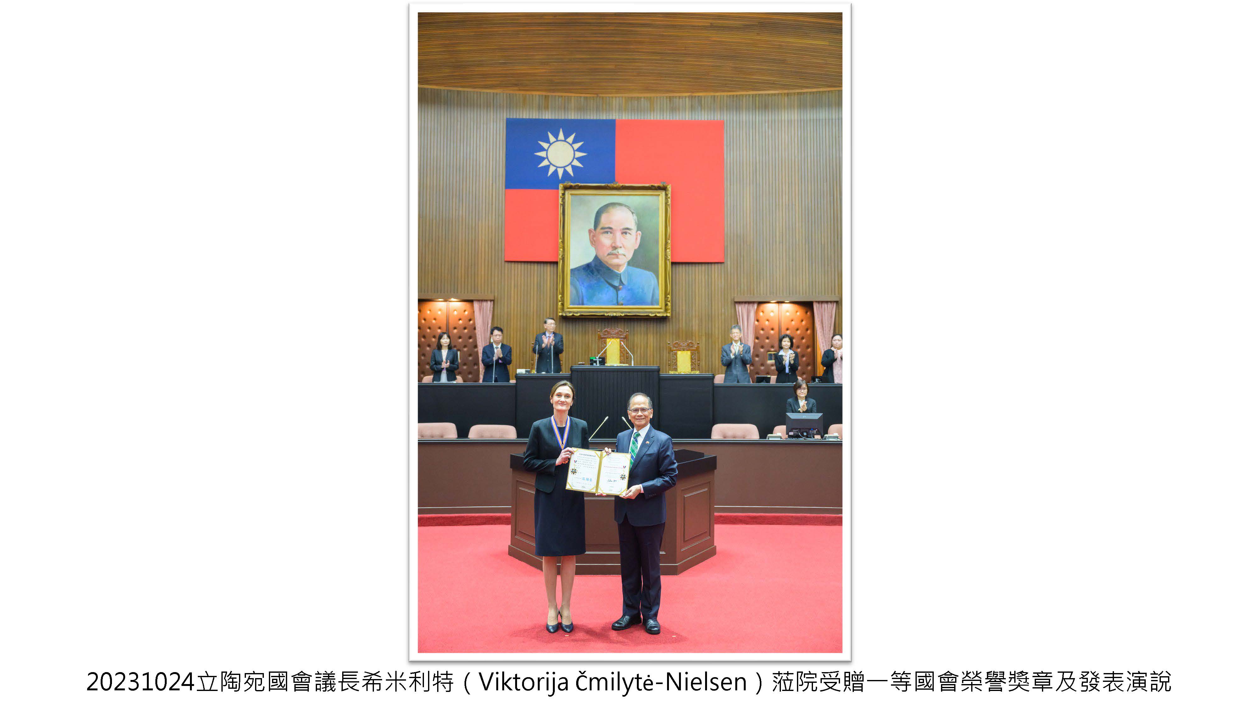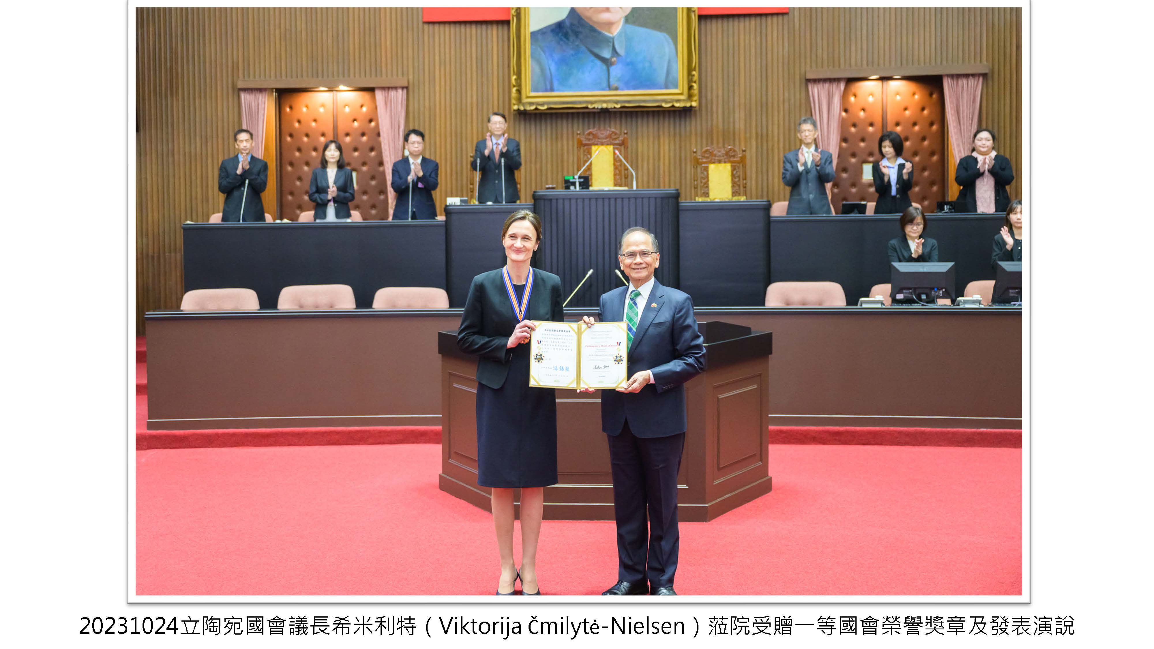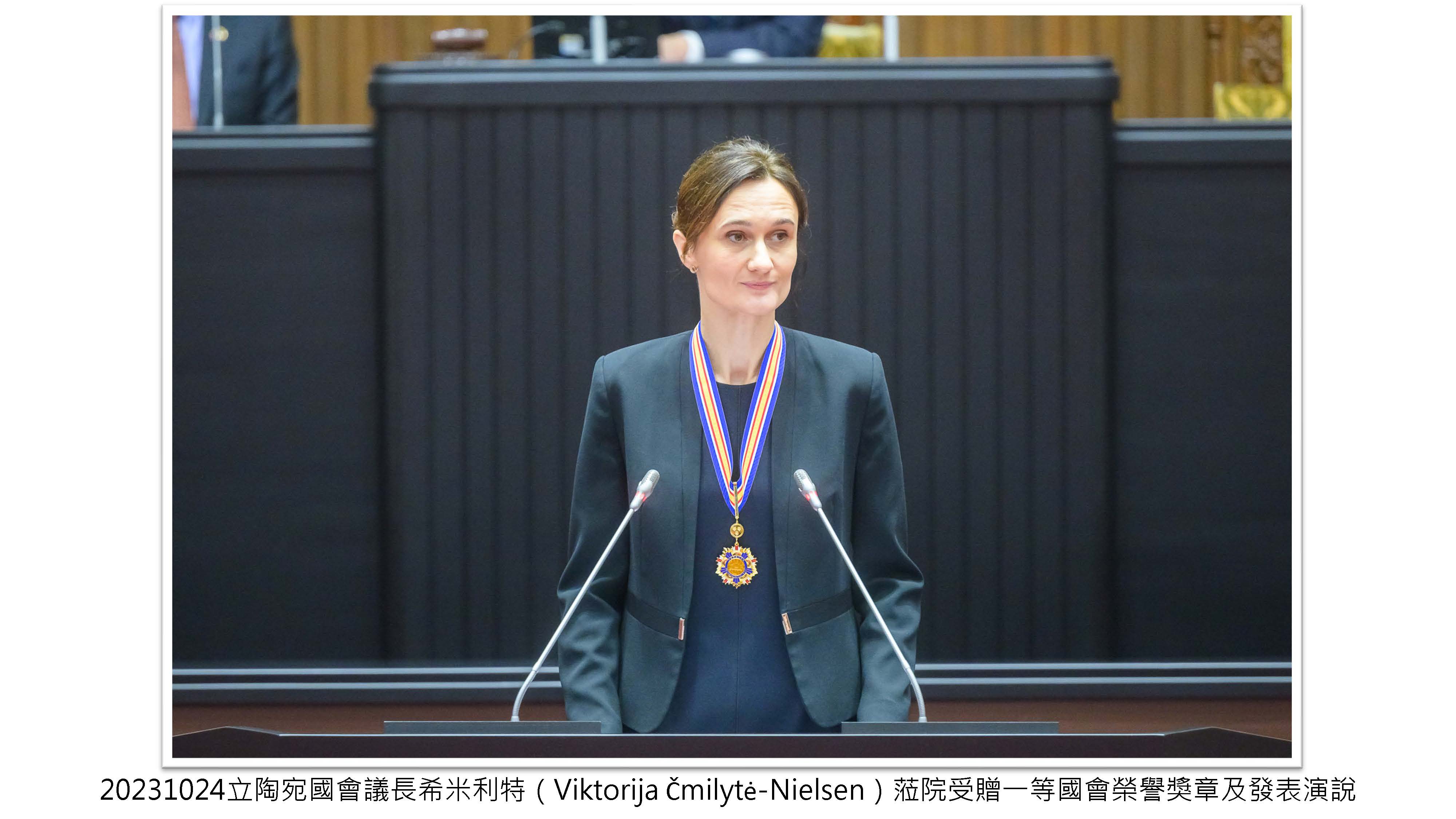 立陶宛國會議長希米利特(Viktorija Čmilytė-Nielsen)蒞院受贈一等國會榮譽獎章及發表演說,聲明臺立團結共同捍衛自由民主。