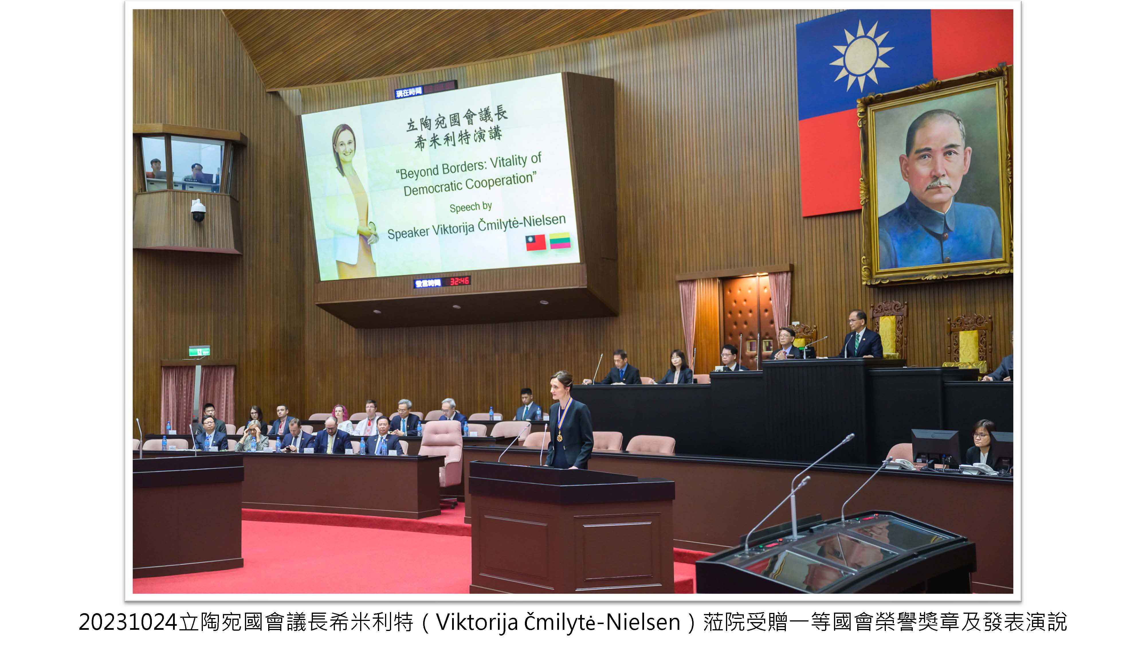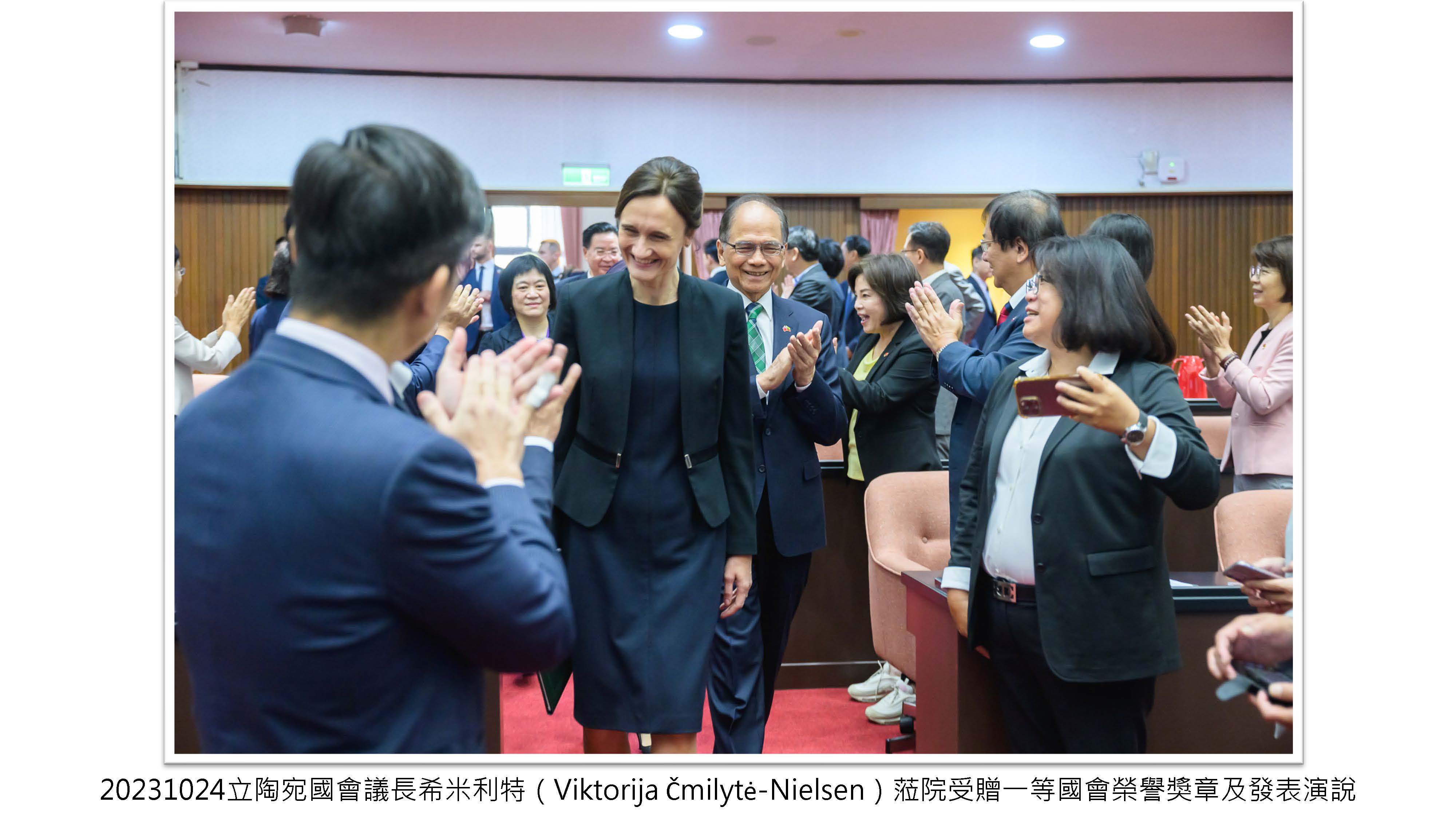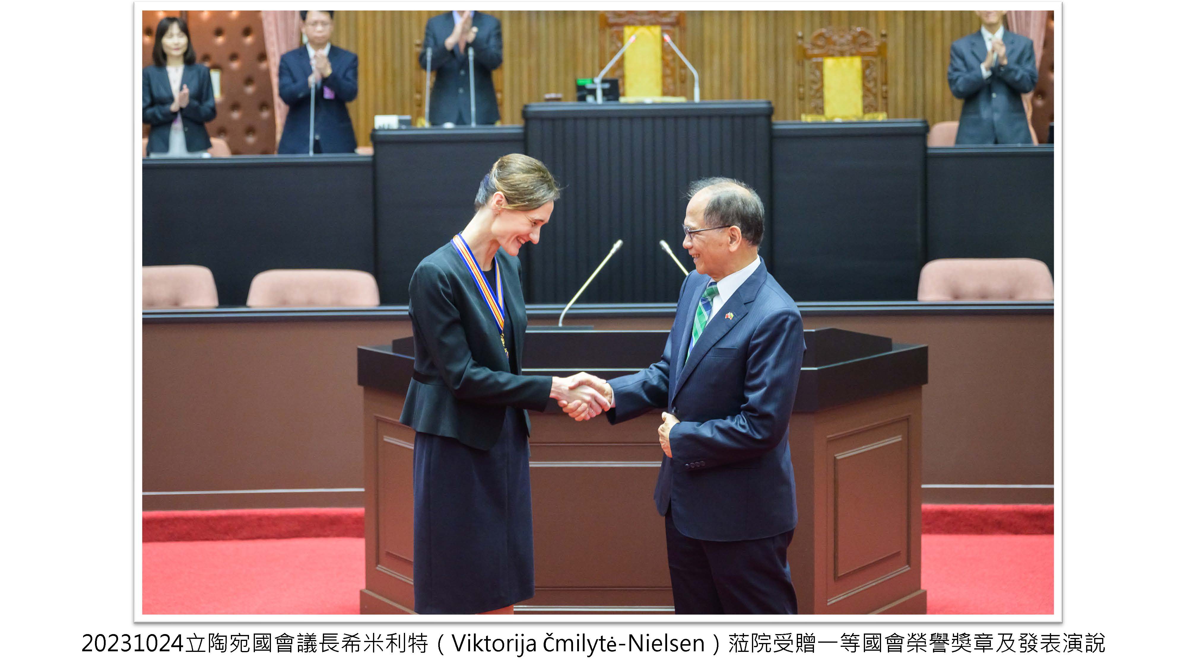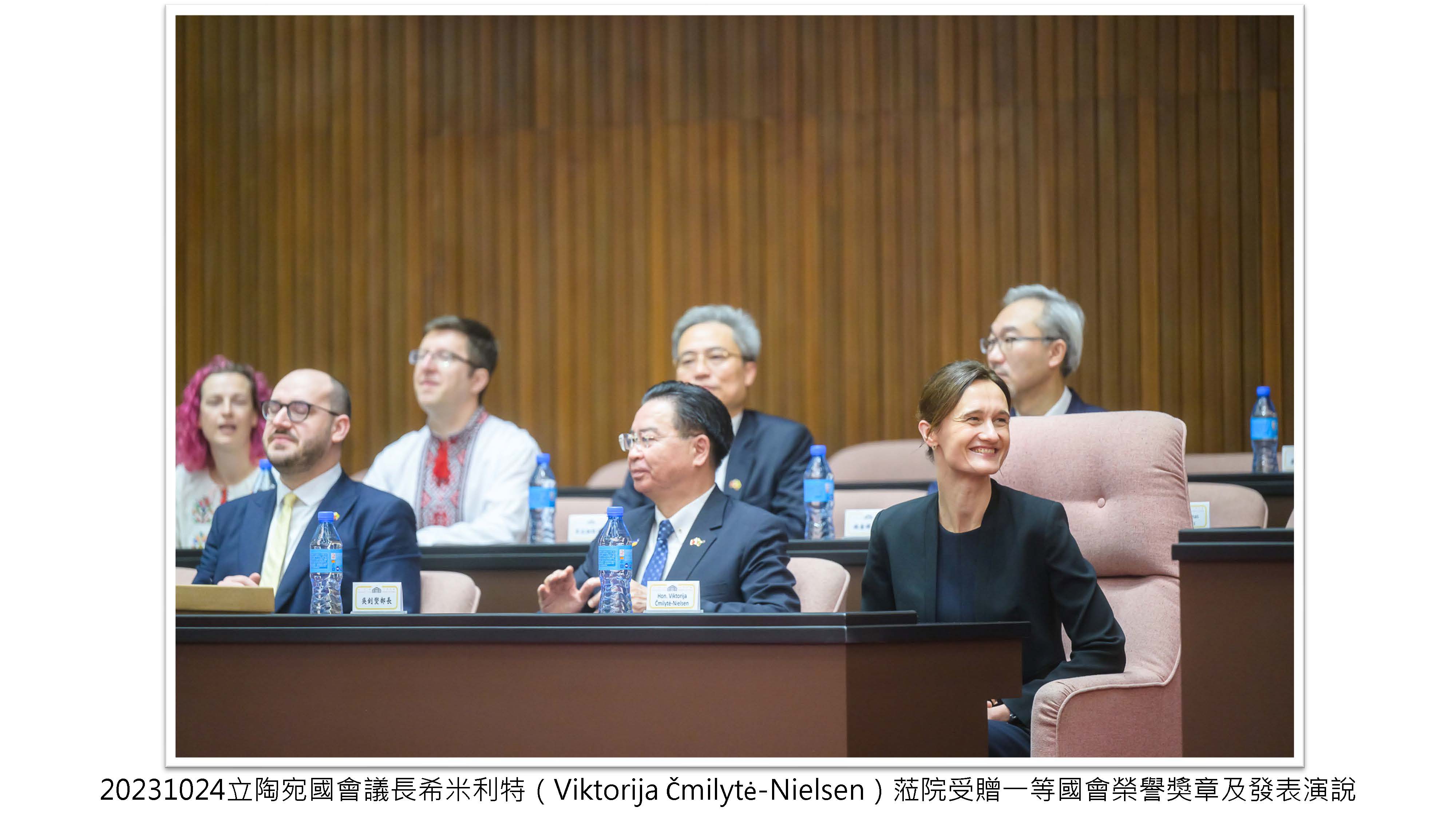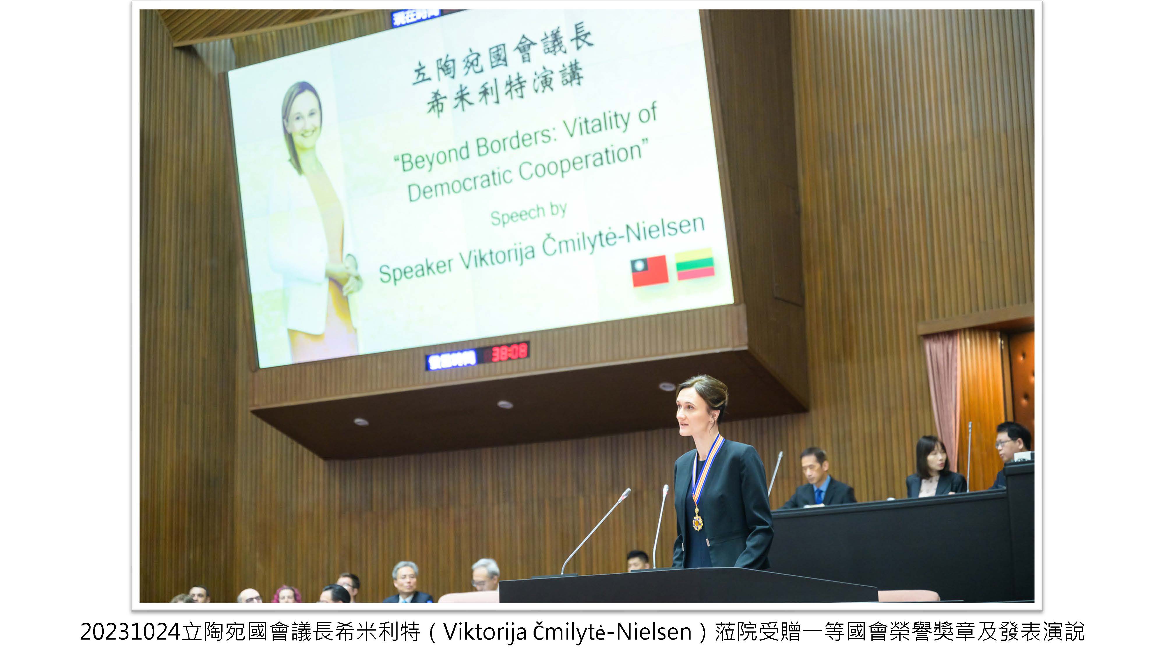 立陶宛國會議長希米利特(Viktorija Čmilytė-Nielsen)蒞院受贈一等國會榮譽獎章及發表演說,聲明臺立團結共同捍衛自由民主。