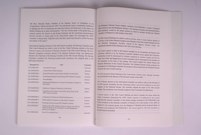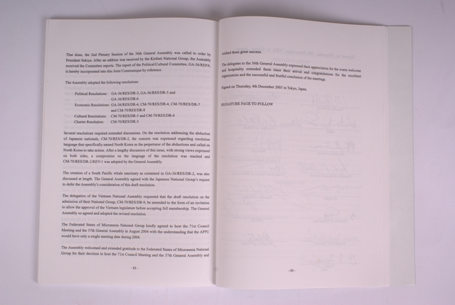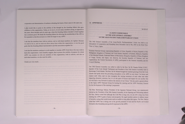 1.第36屆亞洲太平洋國會議員聯合會(Asian-Pacific Parliamentarians’Union,APPU)於日本東京舉行,立法院院長王金平指派江丙坤副院長擔任團長於民國92年(2003年)12月2日率領我「中華民國國會議員團」出發與會,團員是依政黨比例函請立法院各黨團推派,民進黨黨團推派沈委員富雄、林委員忠正、王委員淑慧等3人;國民黨黨團推派李委員全教、郭委員添財2人;親民黨黨團推派高委員明見、林委員政義2人及無黨聯盟推派鄭委員余鎮等共10餘位。 2.由上(第69)屆理事會主席帛琉共和國國會議長吉伯特先生(Hon. Mr. Mario S. Endo Gulibert)召集,各國代表援例公推APPU中央秘書處秘書長若杉慎(Mr. Shunichi Yamaguchi)主持本屆理事會,會中討論通過了本屆各國提案。 3. 大會於12月4日閉幕典禮,吉里巴斯國會議員團代表太平洋區亞太議聯議員團國家致閉幕辭,亞洲區由我國代理團長沈富雄委員代表致閉幕謝辭,大會討論了委員會所提各個議案後通過聯合公報並由各國議員團代表簽署,大會在各國代表簽署聯合公報後圓滿閉幕。 4.第36屆大會主席暨日本代表團團長關谷勝嗣(Hon. Mr. Katsutsugu Sekiya)帶領各會員國代表簽署英文之聯合公報內容共長7頁,第6頁第一個簽名的會員國代表即中華民國國會議員團副團長沈富雄委員。