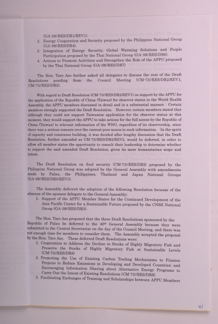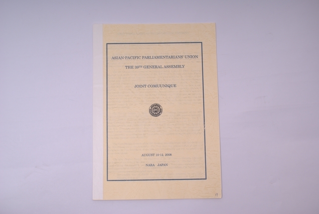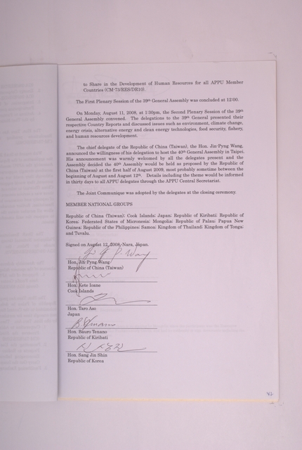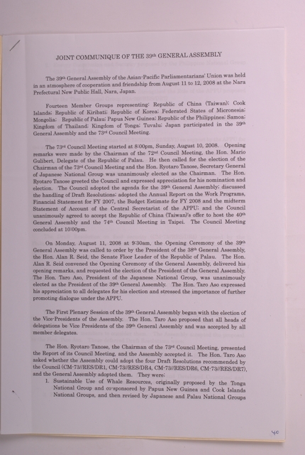1.第39屆亞洲太平洋國會議員聯合會(APPU)及第73次聯合理事會於日本奈良縣新公會堂(Nara Prefectural New Public Hall)舉行。 立法院院長王金平於民國97(2008)年8月10日至12日率團出席。這是王院長首度參與亞太議聯年會活動。本次團員計有朱鳳芝委員、李嘉進委員、黃義交委員、鄭金玲委員、李鴻鈞委員及李復興委員等國民黨6位;蔡同榮委員、李俊毅委員、王幸男委員、陳瑩委員等民進黨4位,共10位委員。除主辦國日本國會議員團及我國代表團外,尚有庫克群島、吉里巴斯共和國、韓國、密克羅尼西亞聯邦、蒙古、帛琉共和國、巴布亞紐幾內亞、菲律賓、泰國王國、東加王國、吐瓦魯等共14個會員國代表與會。 2.第39屆大會主題以「針對亞洲太平洋國會議員聯合會員國所提倡之行動:強化國際能源安全、潔淨發展及氣候變遷合作」為主題。閉幕式於8月12日上午舉行,日本國會議員團團長主席麻生太郎(Hon. Mr. Taro ASO)宣布大會經討論後通過聯合公報並由各國代表團團長簽署,我國由王院長代表簽署。 3.英文撰寫之聯合公報內容共長5頁,王院長英文簽名於第4頁眾會員國之首。