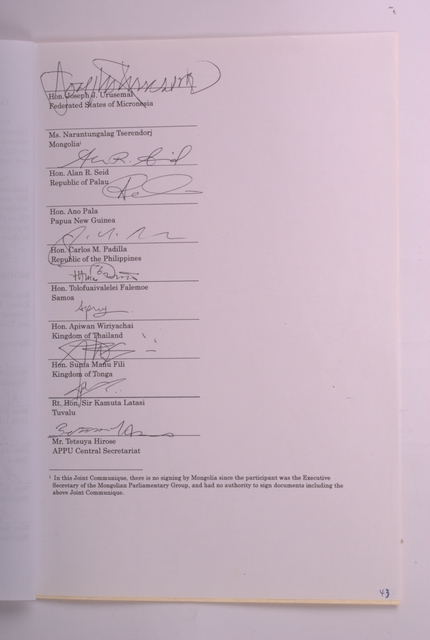 第39屆APPU年會於日本奈良舉行,與會14個會員國代表共同簽署之「聯合公報」。