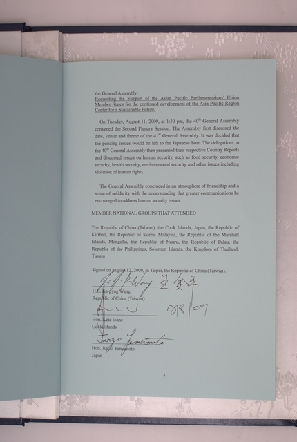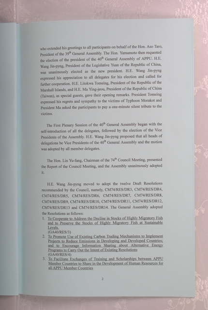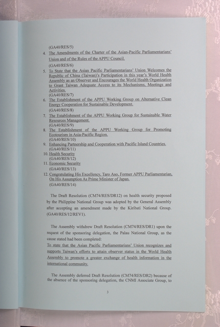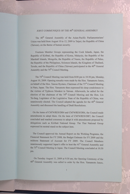 第40屆亞洲太平洋國會議員聯合年會於台北舉行,與會會員國共同簽署之聯合公報