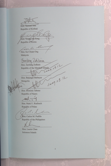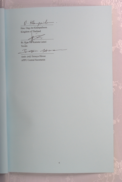 1.亞洲太平洋國會議員聯合會(APPU)第40屆年會之閉幕儀式,於民國98年8月12日上午在立法院群賢樓9樓大禮堂舉行,由立法院院長王金平主持。儀式之後,在全體與會國國會議員的見證下,14國代表團團長及APPU中央秘書處廣瀨秘書長共同簽署「聯合公報」(Joint Communique)。 2.英文撰寫之聯合公報(Joint Communique)內容共7頁,王院長英文簽名於第5頁居眾會員國之首。