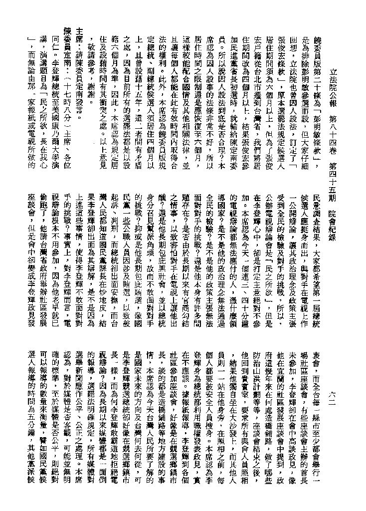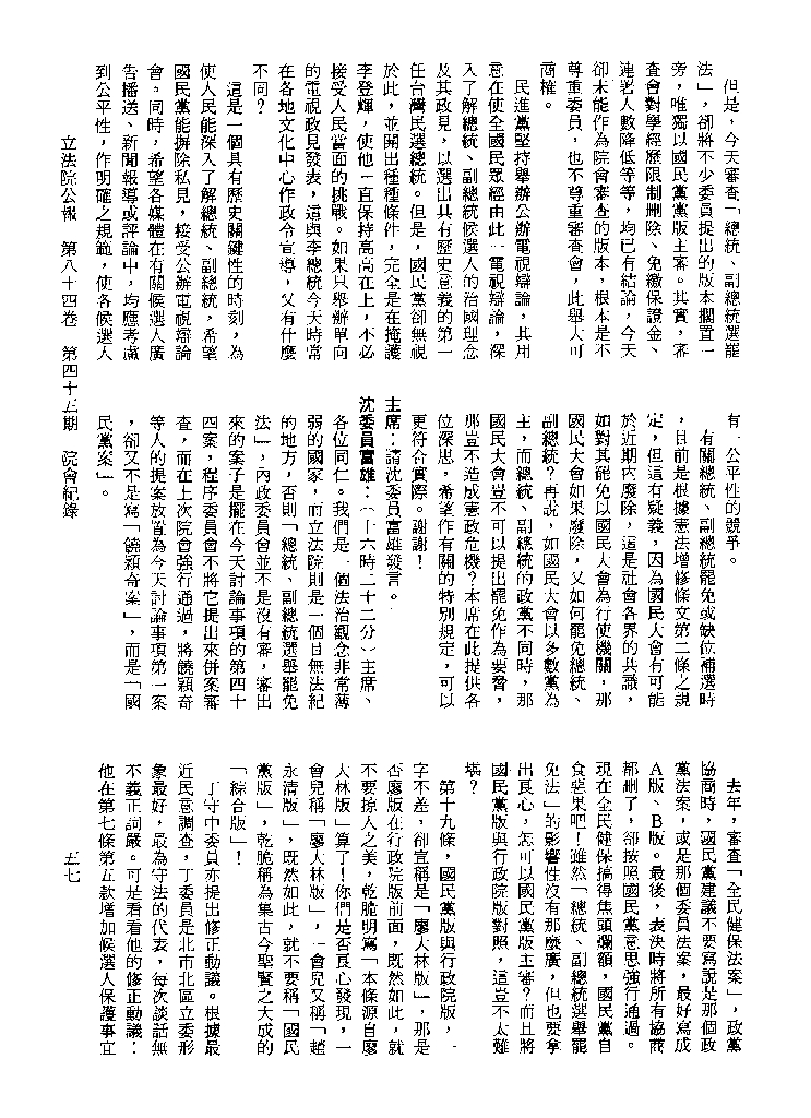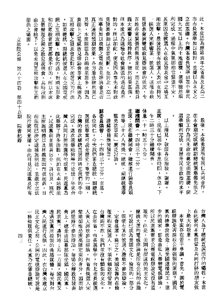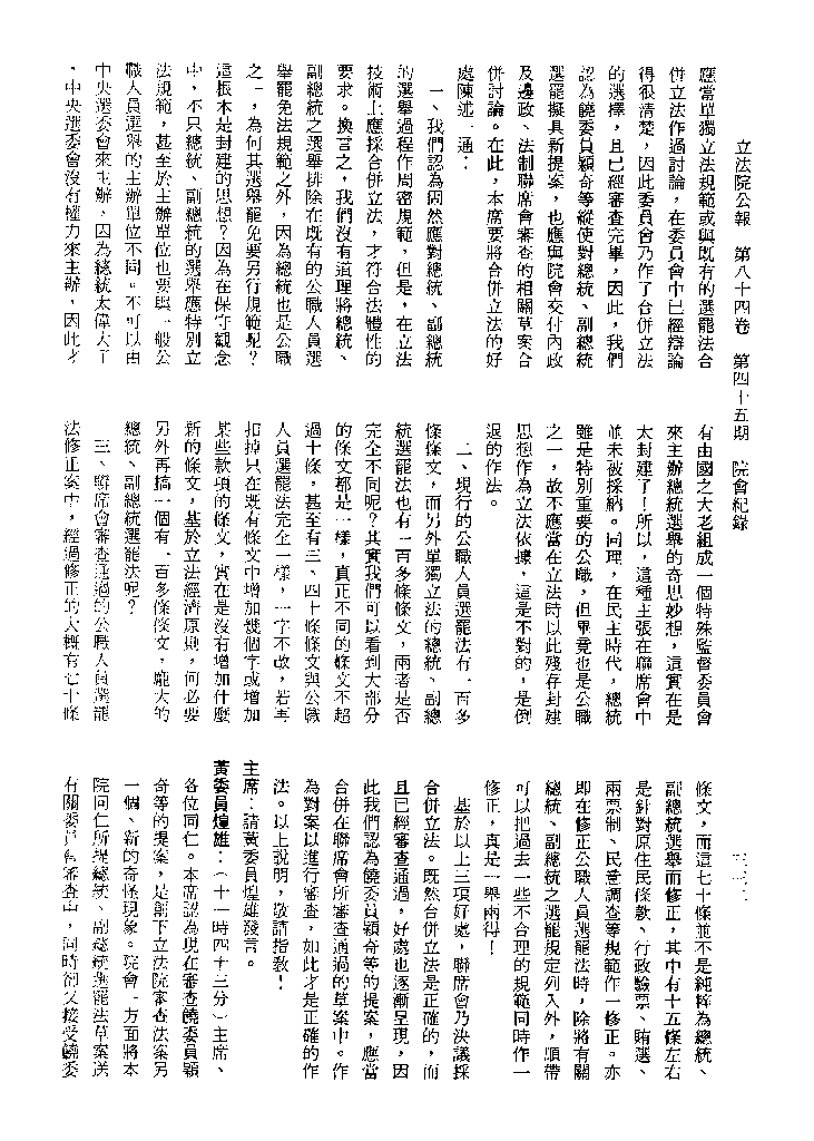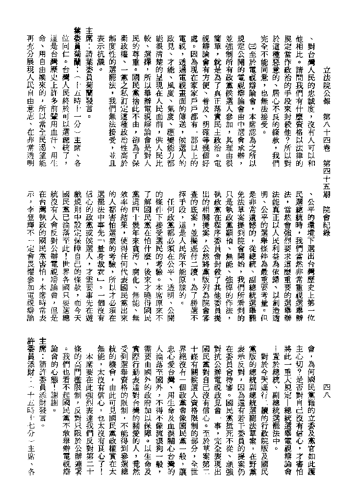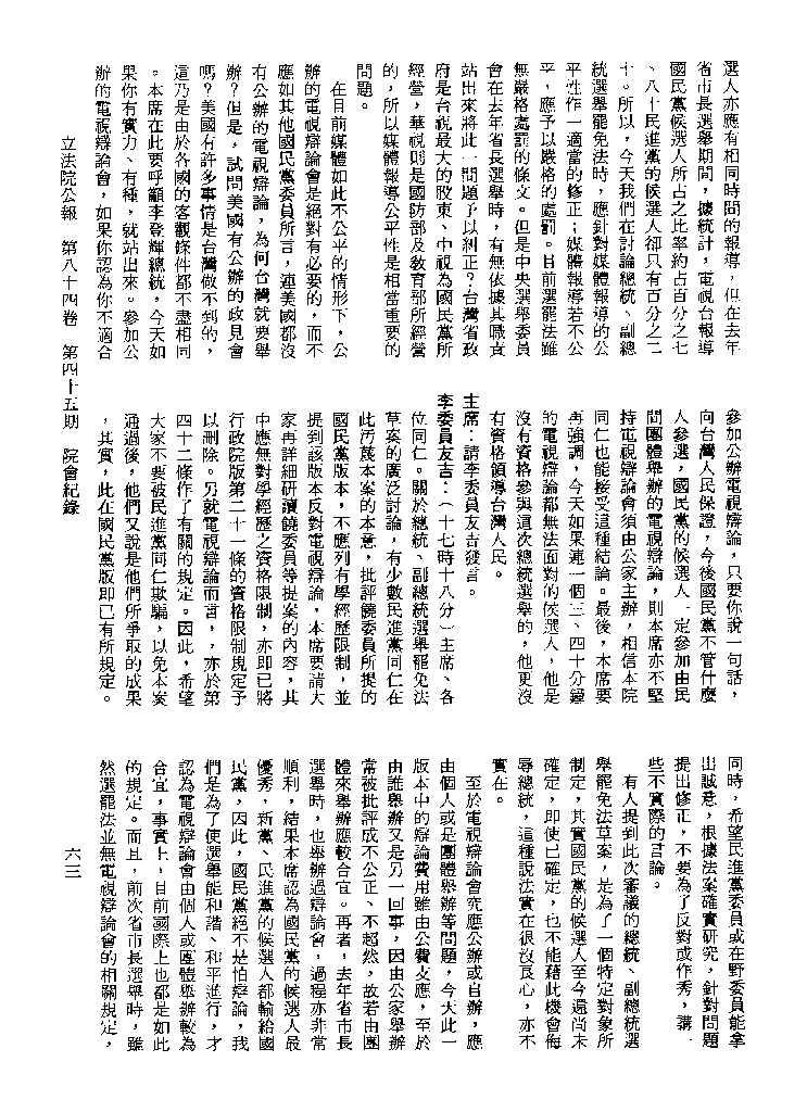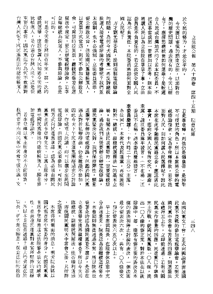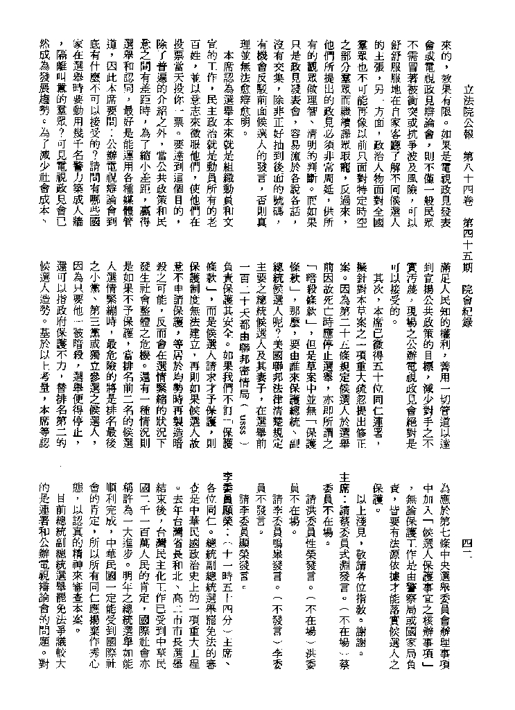 1.立法院饒穎奇委員等30人提案,在民國84年7月10日第2屆第5會期第35次會議開始進行二讀,第35次會議當天係進行廣泛討論。 2.由於民進黨有關第42條舉行公辦電視辯論會之主張未獲國民黨同意,對本案之審議採取焦土策略,逐條提出修正動議,逐條討論及表決。在第36次會議中,對本案名稱及第1章章名、第1條即作冗長的發言,最後表決照饒委員穎奇提案通過。整天只有通過名稱、第1章章名及第1條條文。 3.本件立法院公報第84卷第45期,記載當日會議冗長討論及表決之經過(第35頁至第64頁、第331頁至359)。