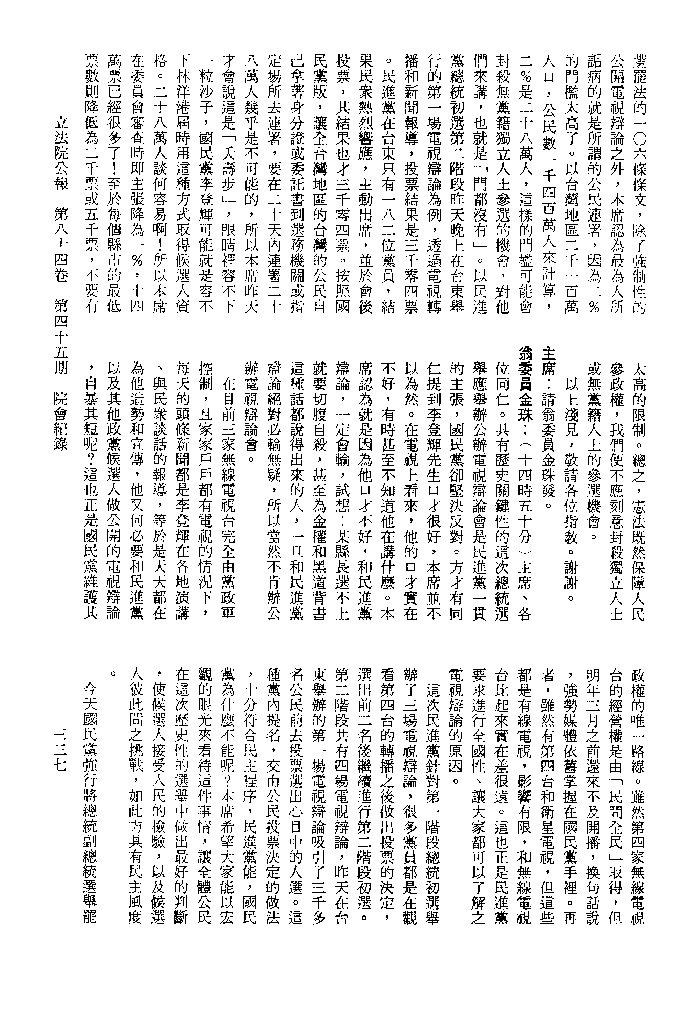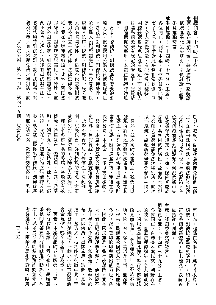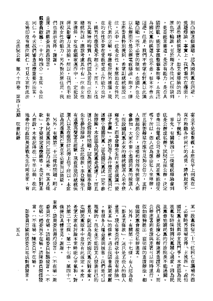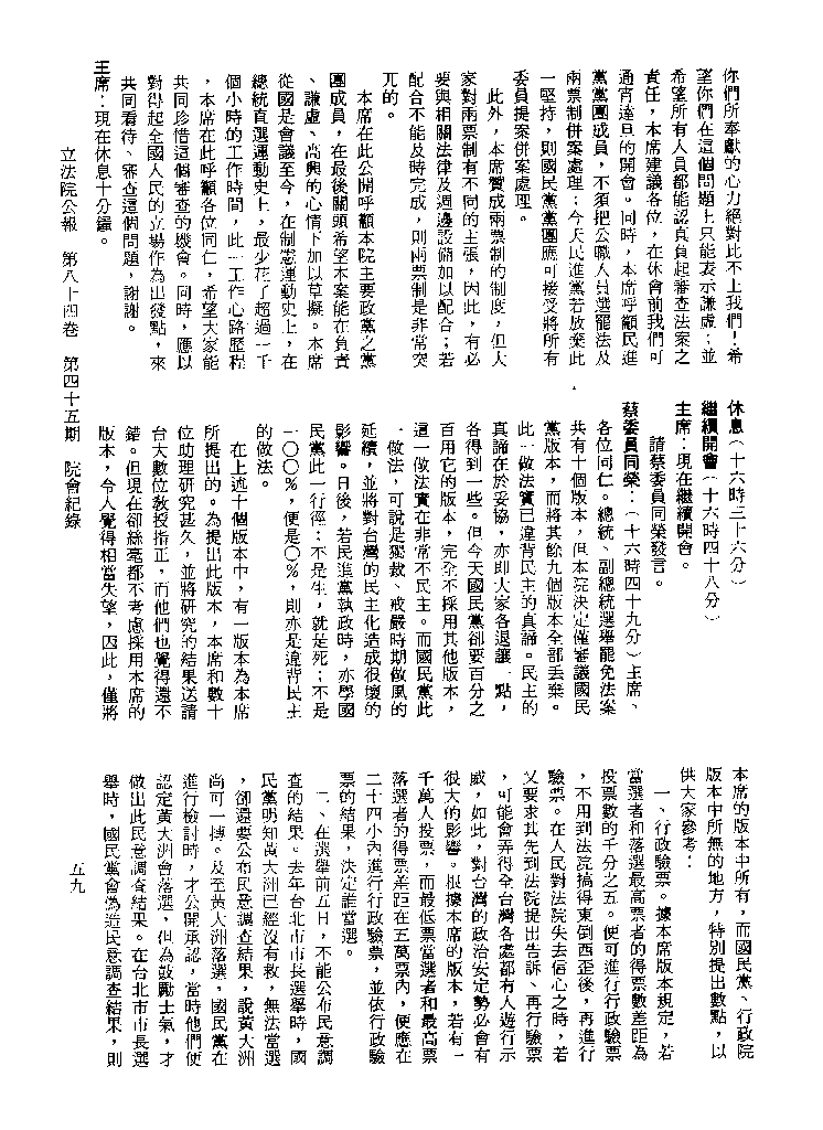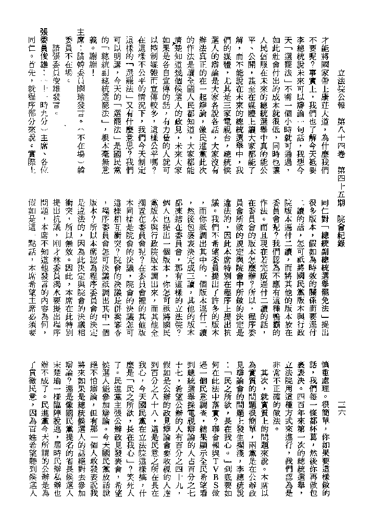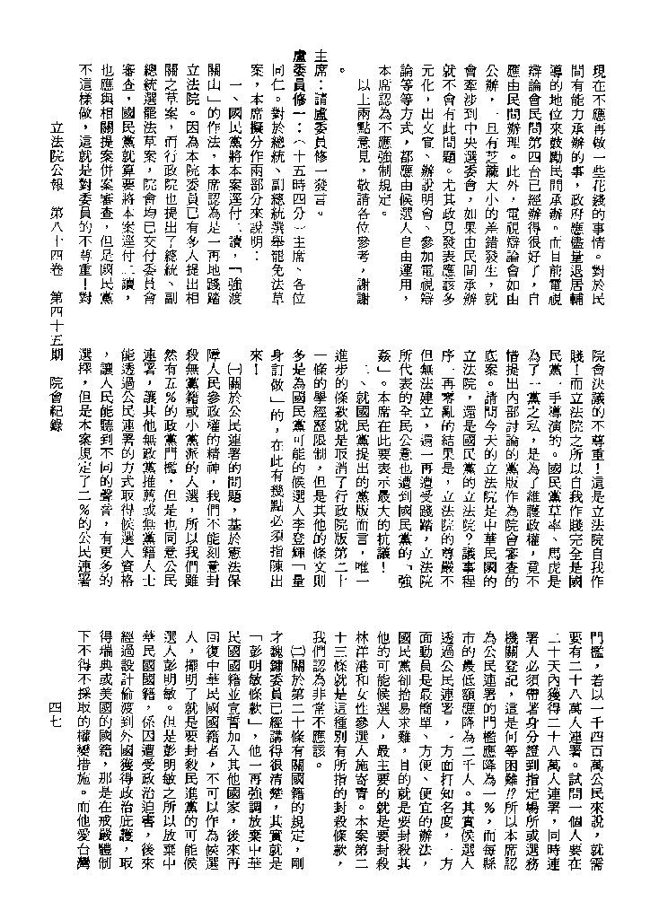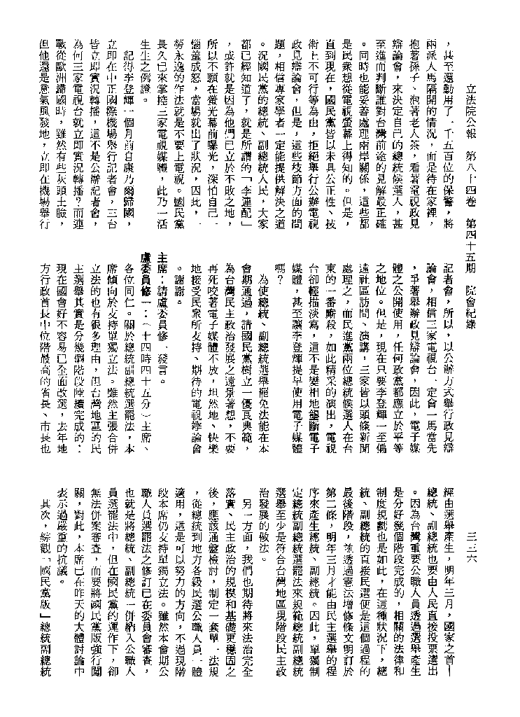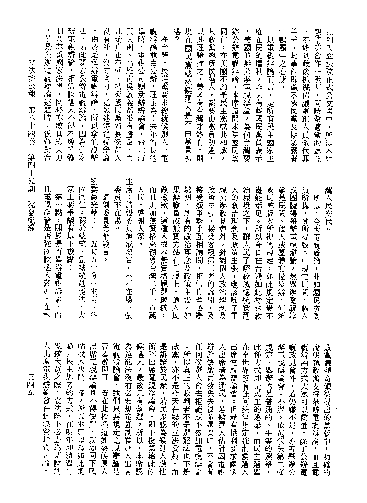 1.立法院饒穎奇委員等30人提案,在民國84年7月10日第2屆第5會期第35次會議開始進行二讀,第35次會議當天係進行廣泛討論。 2.由於民進黨有關第42條舉行公辦電視辯論會之主張未獲國民黨同意,對本案之審議採取焦土策略,逐條提出修正動議,逐條討論及表決。在第36次會議中,對本案名稱及第1章章名、第1條即作冗長的發言,最後表決照饒委員穎奇提案通過。整天只有通過名稱、第1章章名及第1條條文。 3.本件立法院公報第84卷第45期,記載當日會議冗長討論及表決之經過(第35頁至第64頁、第331頁至359)。