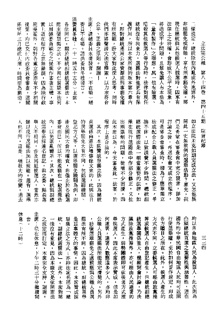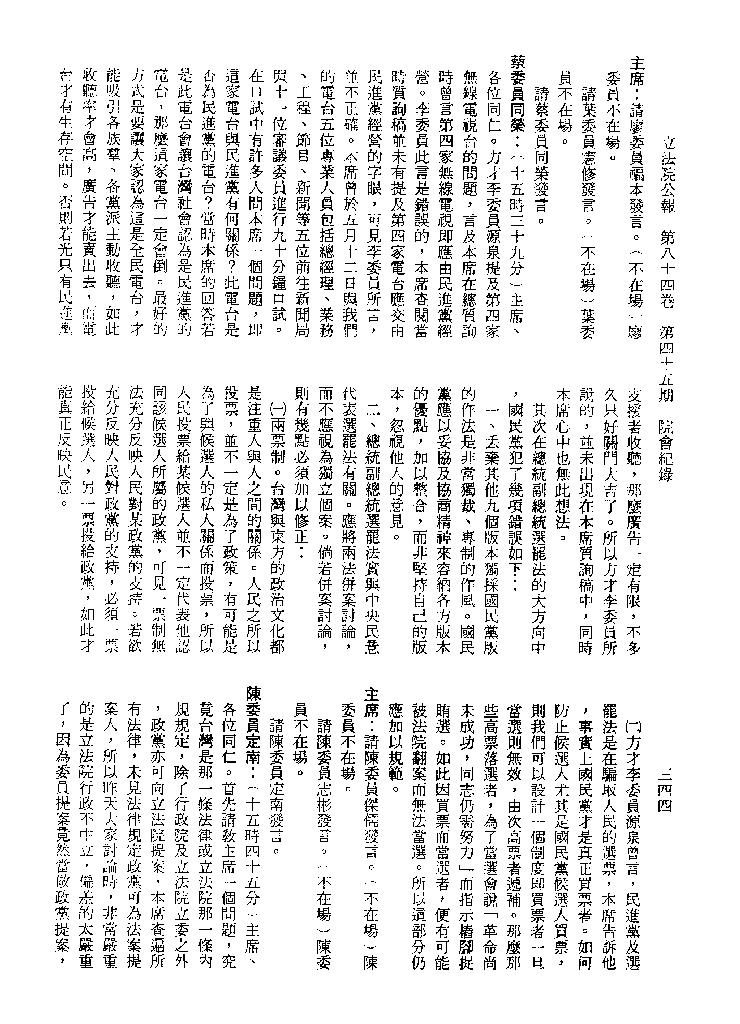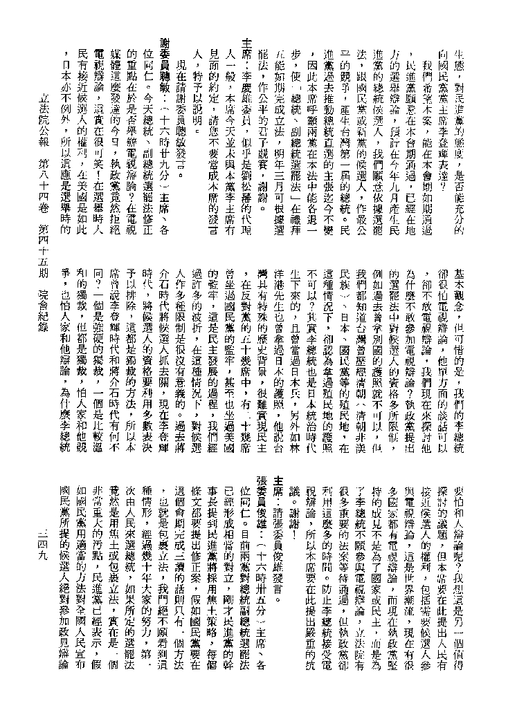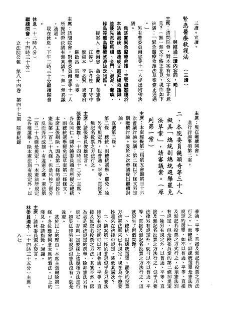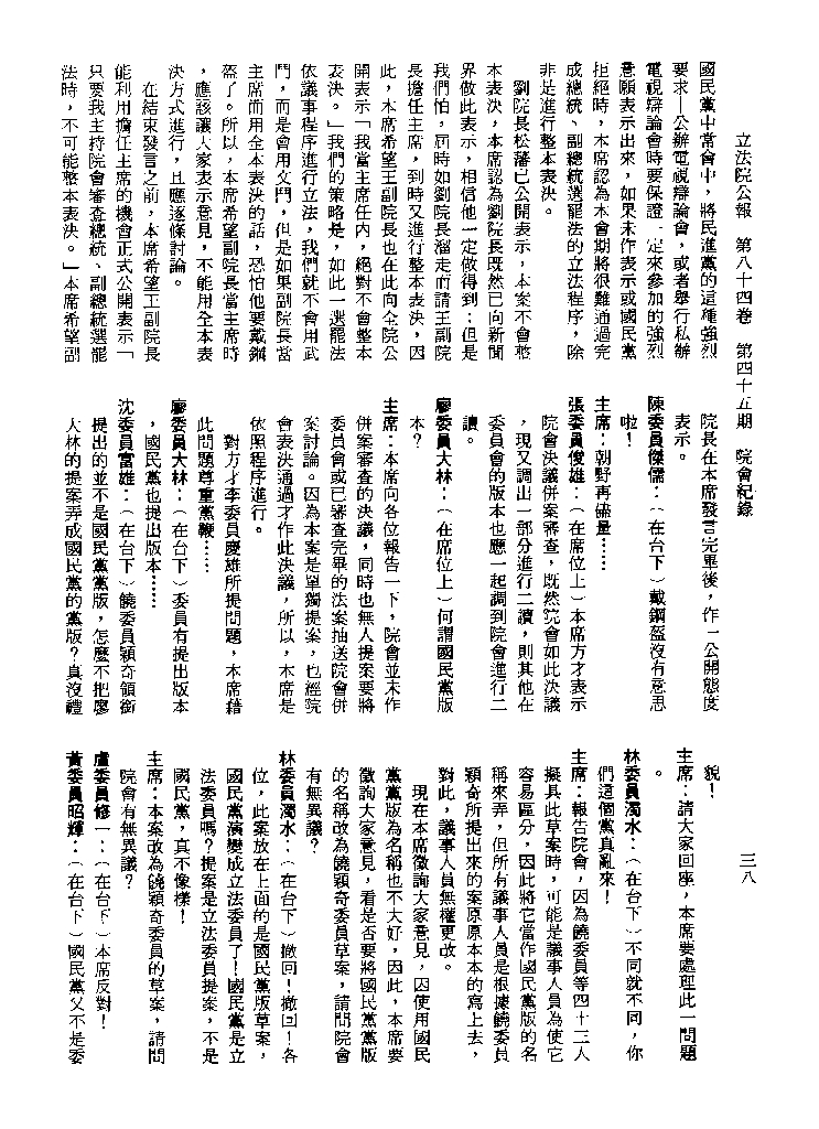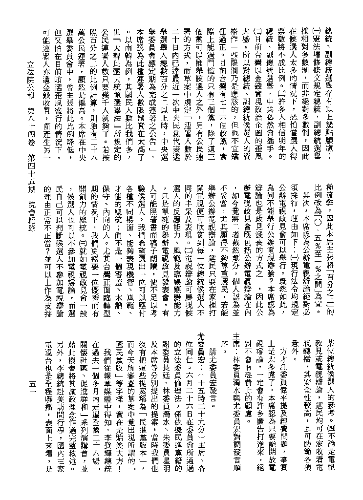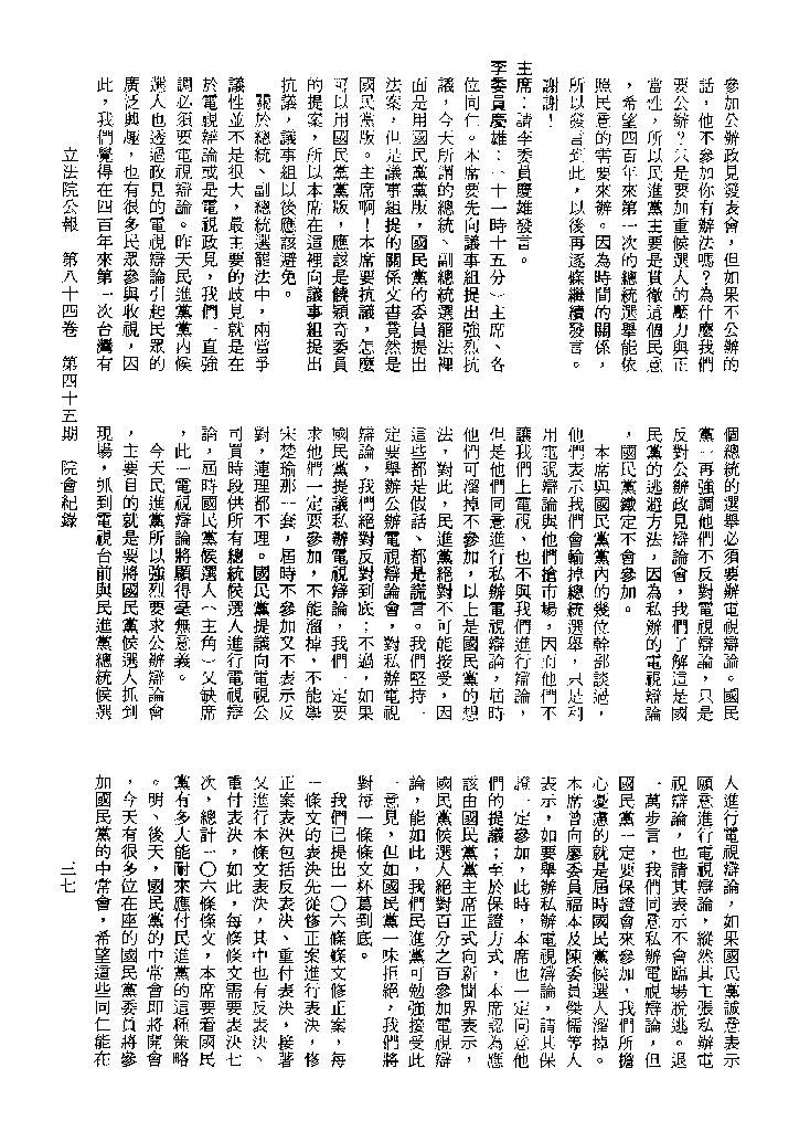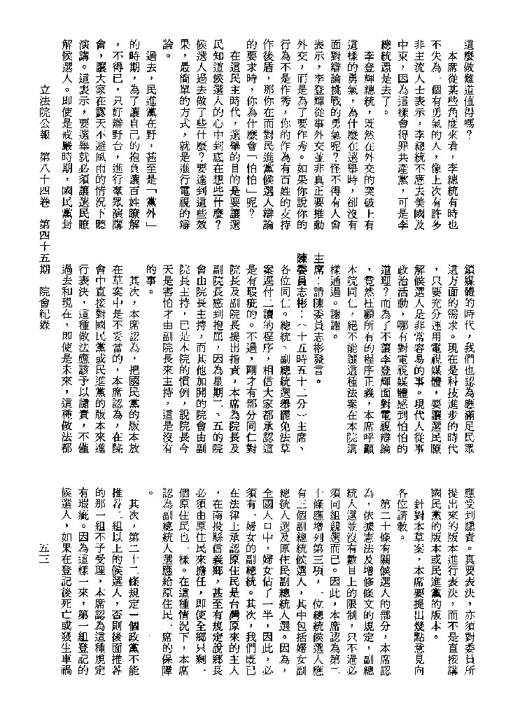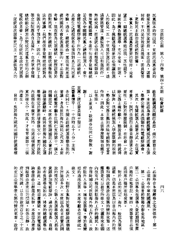 1.立法院饒穎奇委員等30人提案,在民國84年7月10日第2屆第5會期第35次會議開始進行二讀,第35次會議當天係進行廣泛討論。 2.由於民進黨有關第42條舉行公辦電視辯論會之主張未獲國民黨同意,對本案之審議採取焦土策略,逐條提出修正動議,逐條討論及表決。在第36次會議中,對本案名稱及第1章章名、第1條即作冗長的發言,最後表決照饒委員穎奇提案通過。整天只有通過名稱、第1章章名及第1條條文。 3.本件立法院公報第84卷第45期,記載當日會議冗長討論及表決之經過(第35頁至第64頁、第331頁至359)。