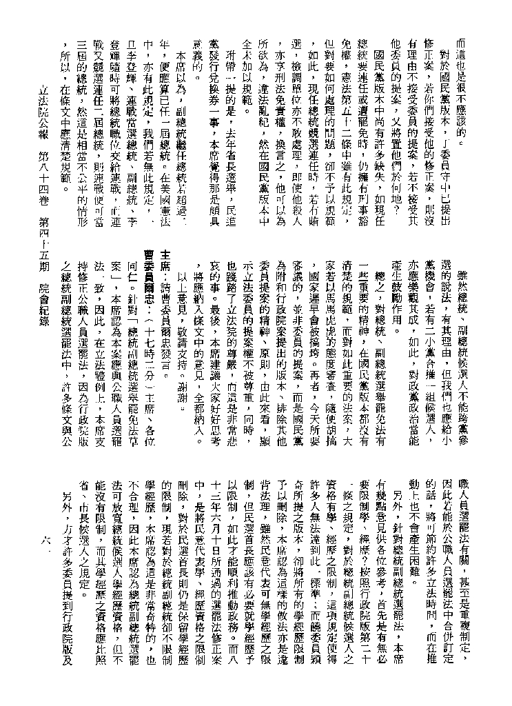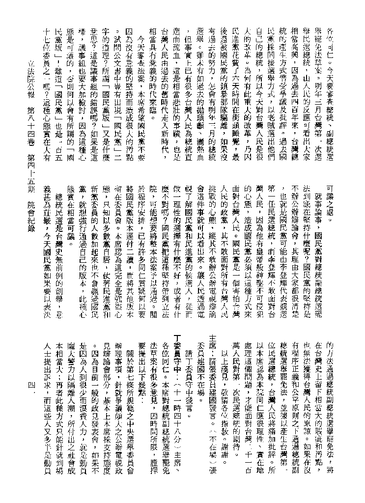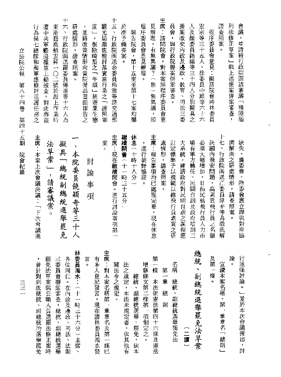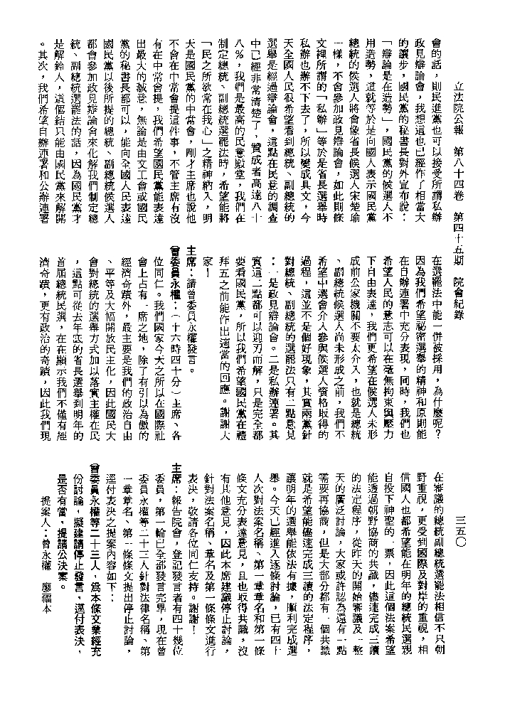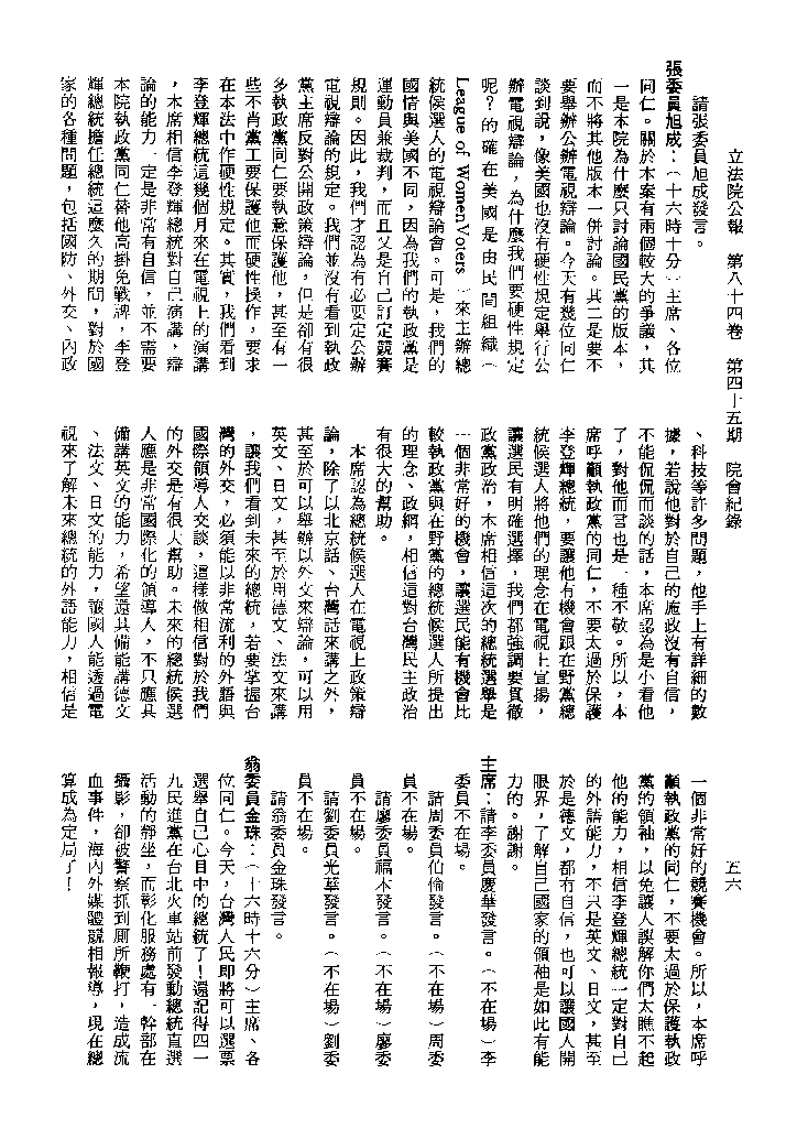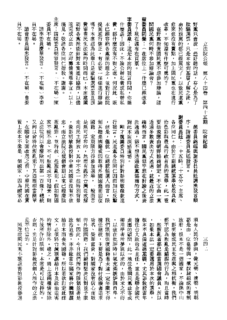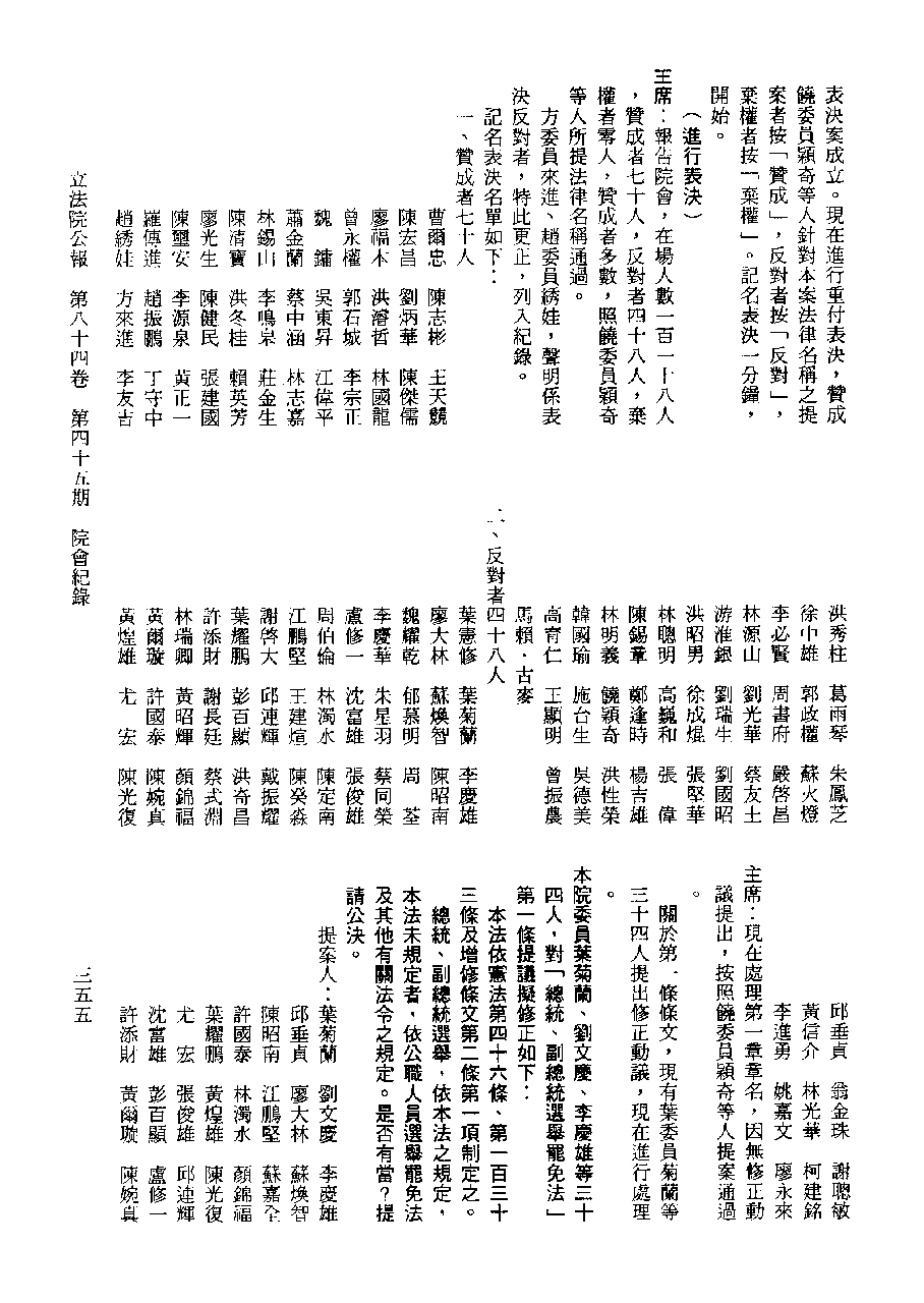 1.立法院饒穎奇委員等30人提案,在民國84年7月10日第2屆第5會期第35次會議開始進行二讀,第35次會議當天係進行廣泛討論。 2.由於民進黨有關第42條舉行公辦電視辯論會之主張未獲國民黨同意,對本案之審議採取焦土策略,逐條提出修正動議,逐條討論及表決。在第36次會議中,對本案名稱及第1章章名、第1條即作冗長的發言,最後表決照饒委員穎奇提案通過。整天只有通過名稱、第1章章名及第1條條文。 3.本件立法院公報第84卷第45期,記載當日會議冗長討論及表決之經過(第35頁至第64頁、第331頁至359)。