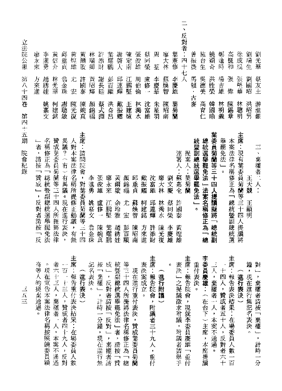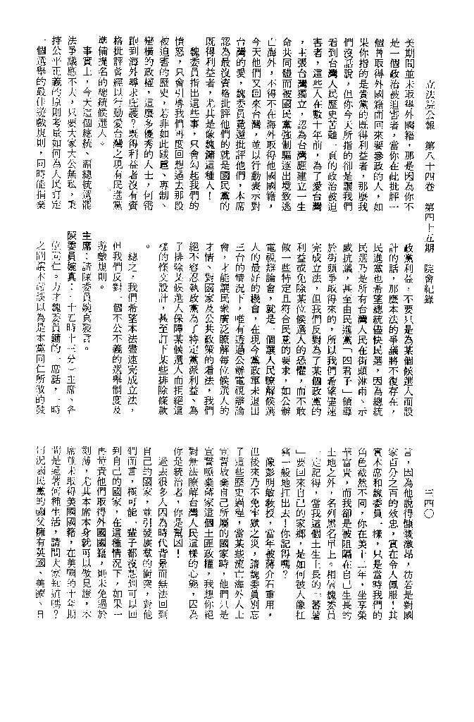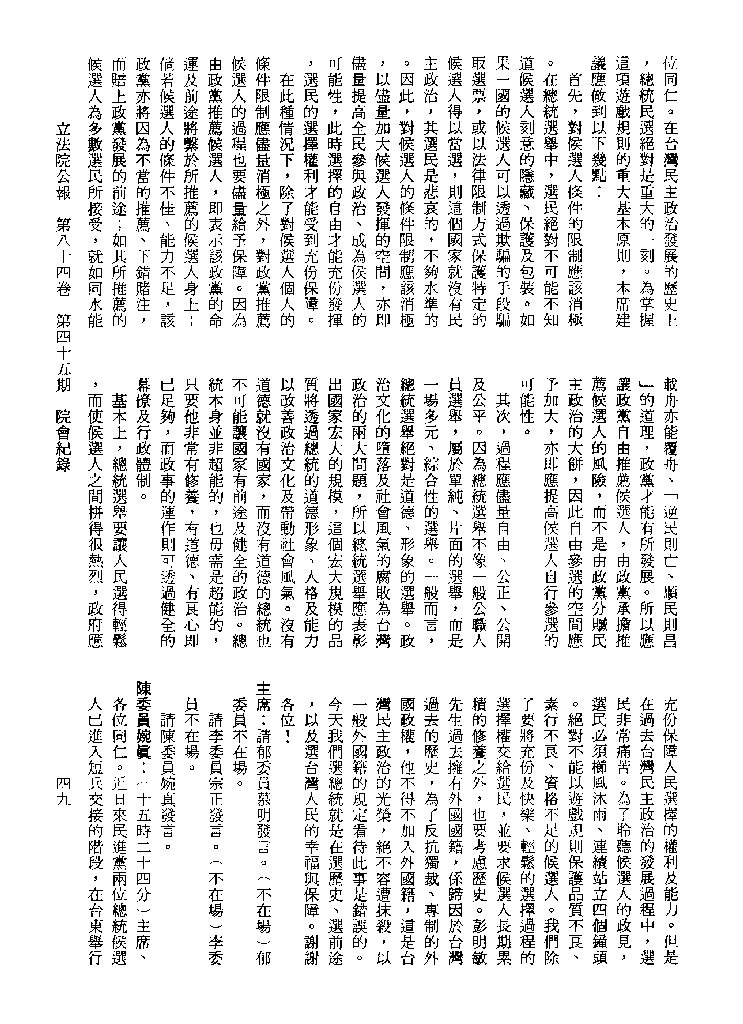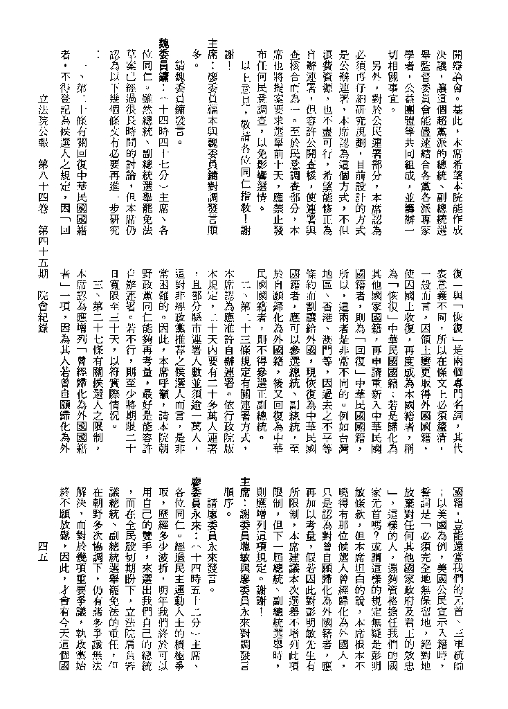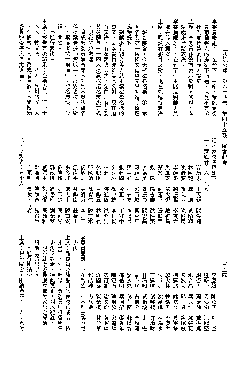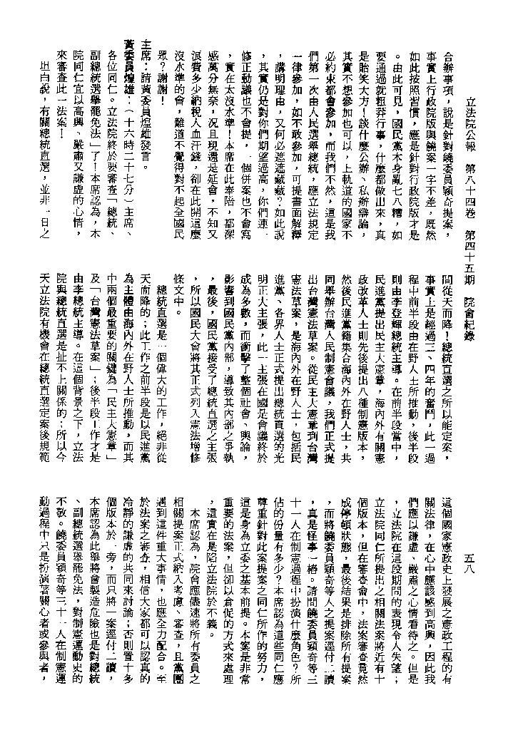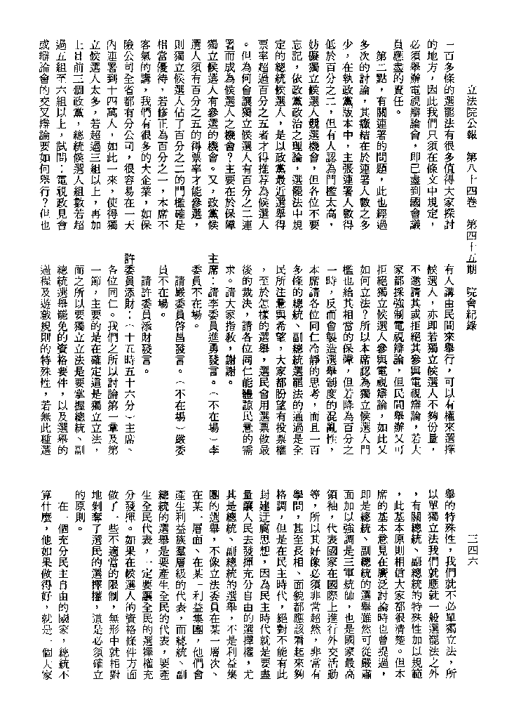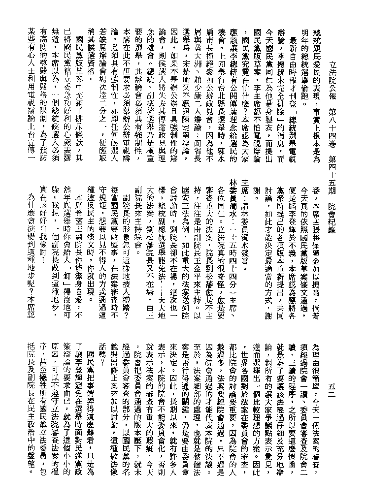 1.立法院饒穎奇委員等30人提案,在民國84年7月10日第2屆第5會期第35次會議開始進行二讀,第35次會議當天係進行廣泛討論。 2.由於民進黨有關第42條舉行公辦電視辯論會之主張未獲國民黨同意,對本案之審議採取焦土策略,逐條提出修正動議,逐條討論及表決。在第36次會議中,對本案名稱及第1章章名、第1條即作冗長的發言,最後表決照饒委員穎奇提案通過。整天只有通過名稱、第1章章名及第1條條文。 3.本件立法院公報第84卷第45期,記載當日會議冗長討論及表決之經過(第35頁至第64頁、第331頁至359)。