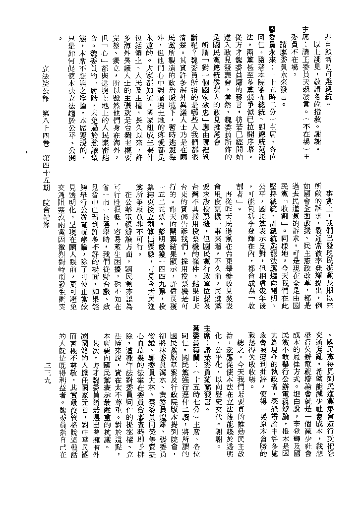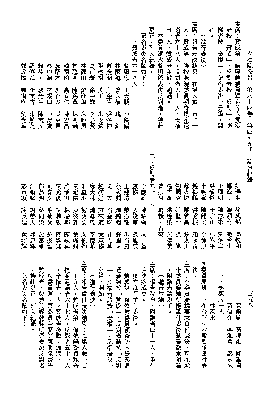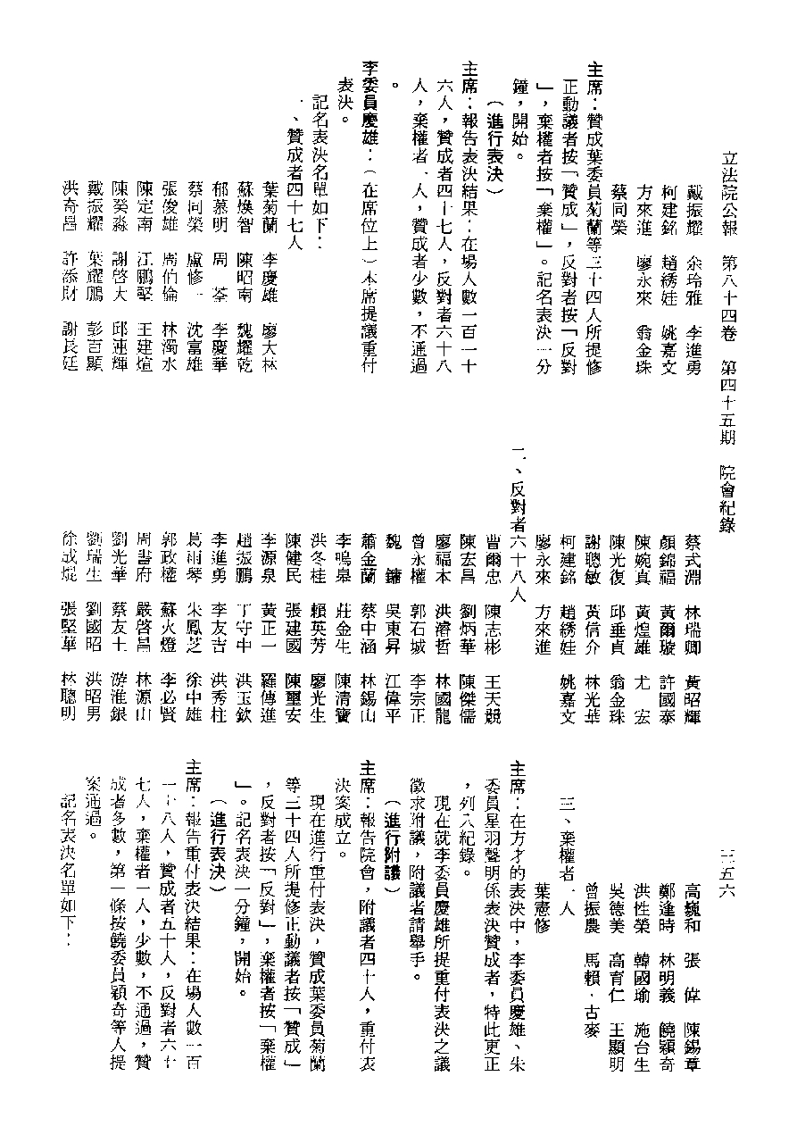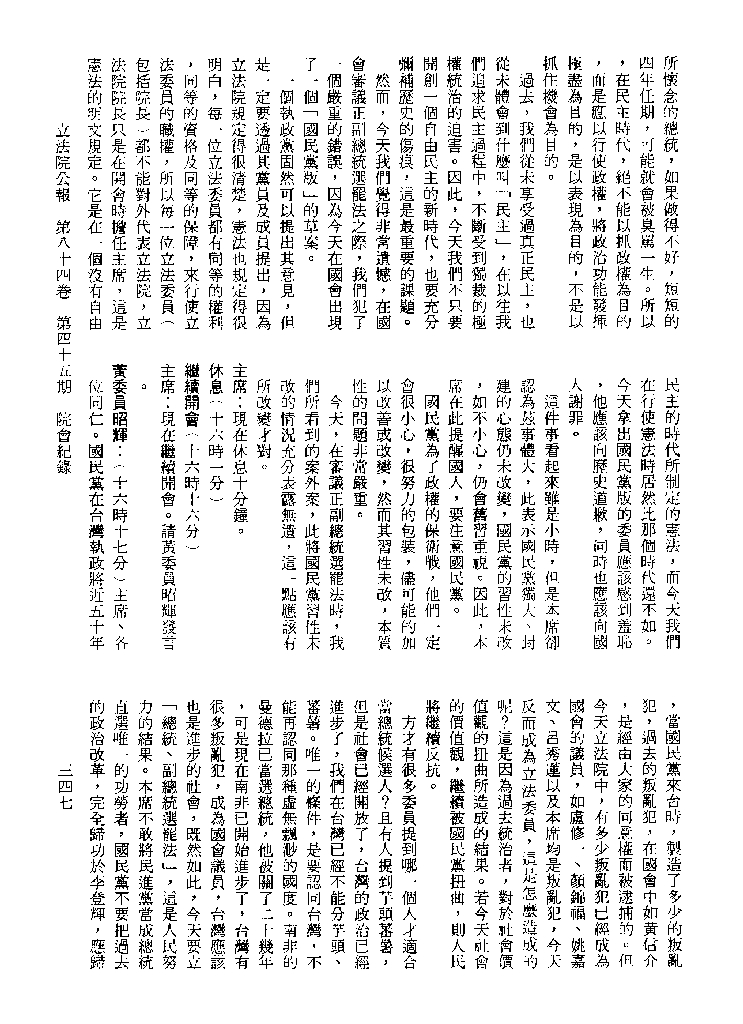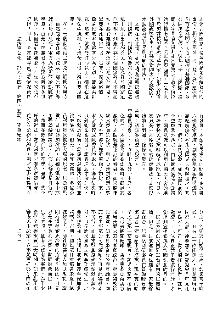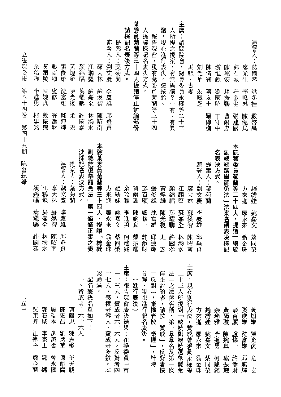 1.立法院饒穎奇委員等30人提案,在民國84年7月10日第2屆第5會期第35次會議開始進行二讀,第35次會議當天係進行廣泛討論。 2.由於民進黨有關第42條舉行公辦電視辯論會之主張未獲國民黨同意,對本案之審議採取焦土策略,逐條提出修正動議,逐條討論及表決。在第36次會議中,對本案名稱及第1章章名、第1條即作冗長的發言,最後表決照饒委員穎奇提案通過。整天只有通過名稱、第1章章名及第1條條文。 3.本件立法院公報第84卷第45期,記載當日會議冗長討論及表決之經過(第35頁至第64頁、第331頁至359)。