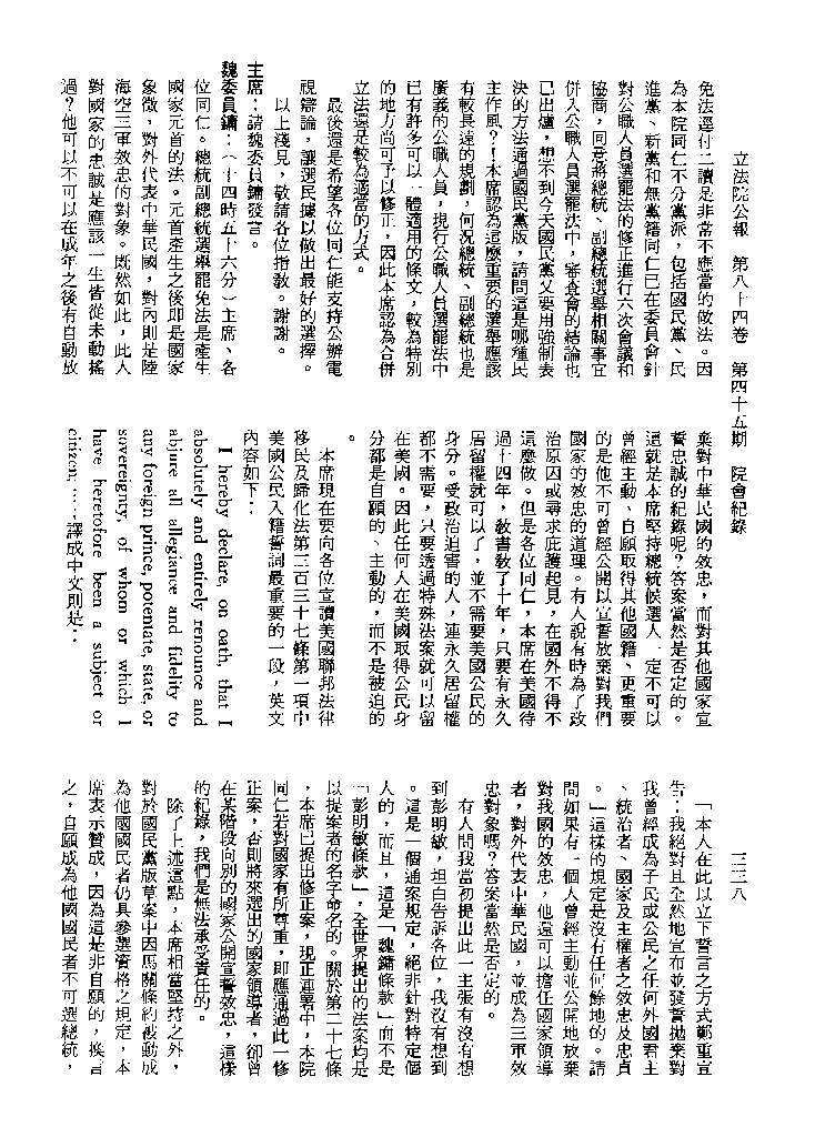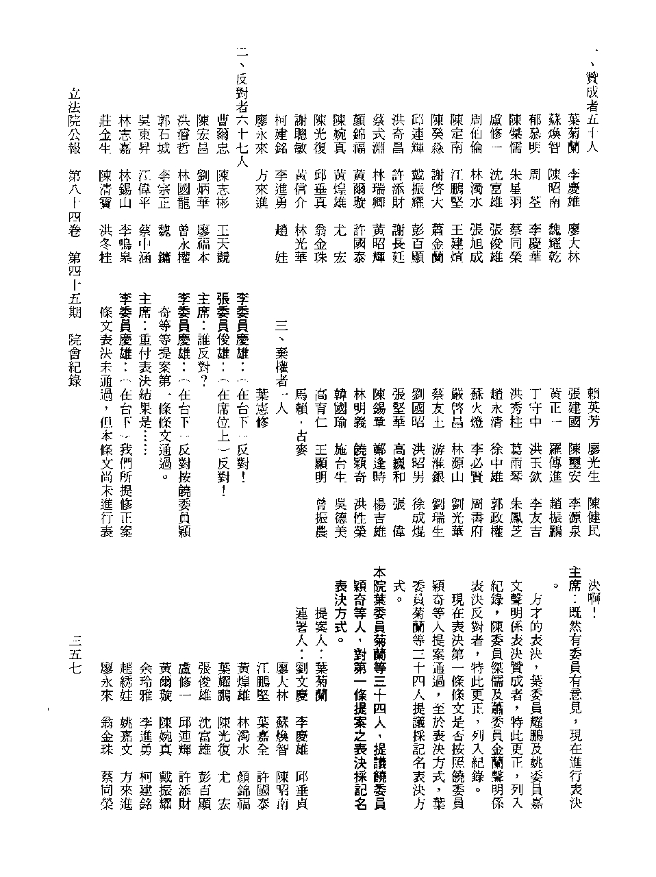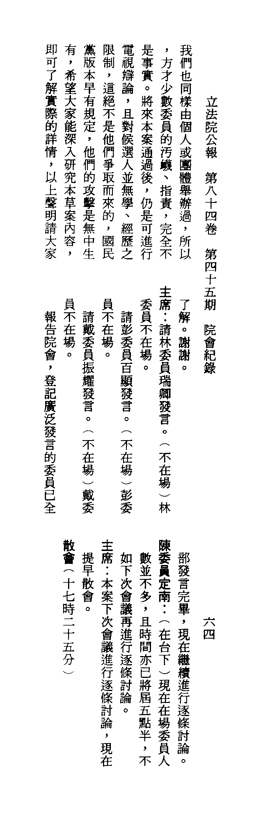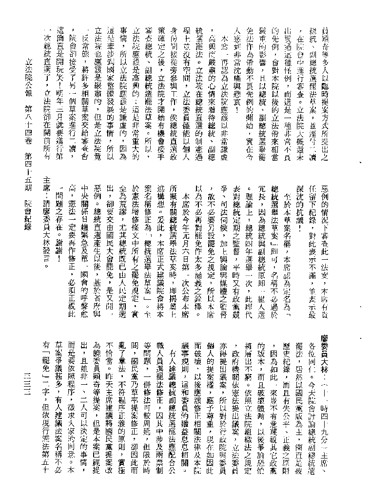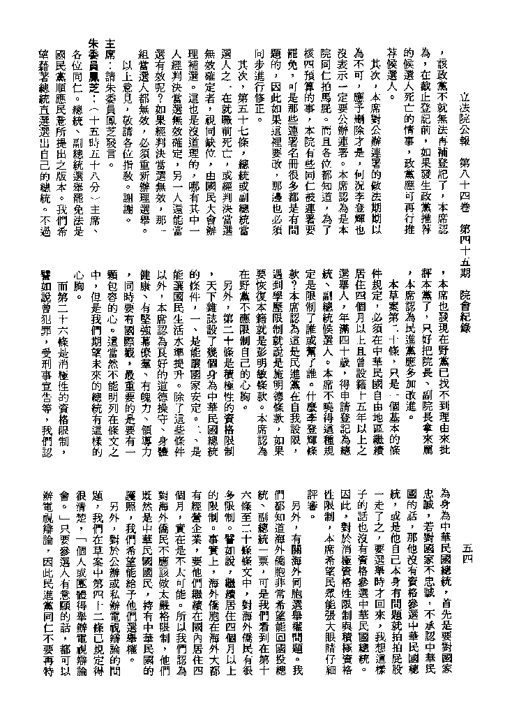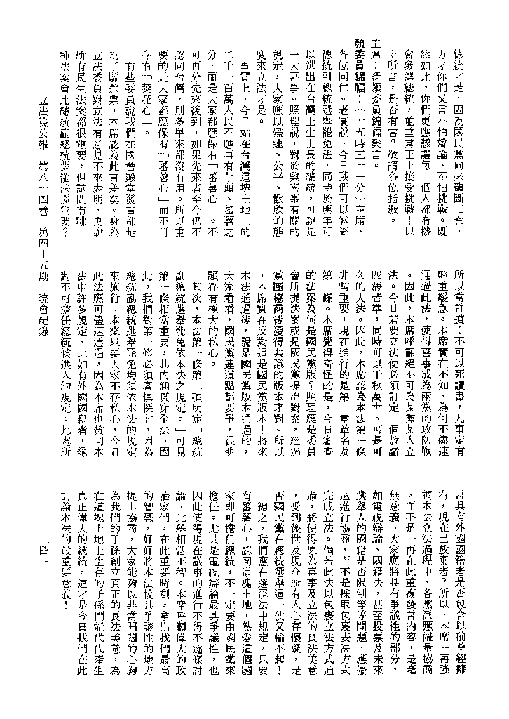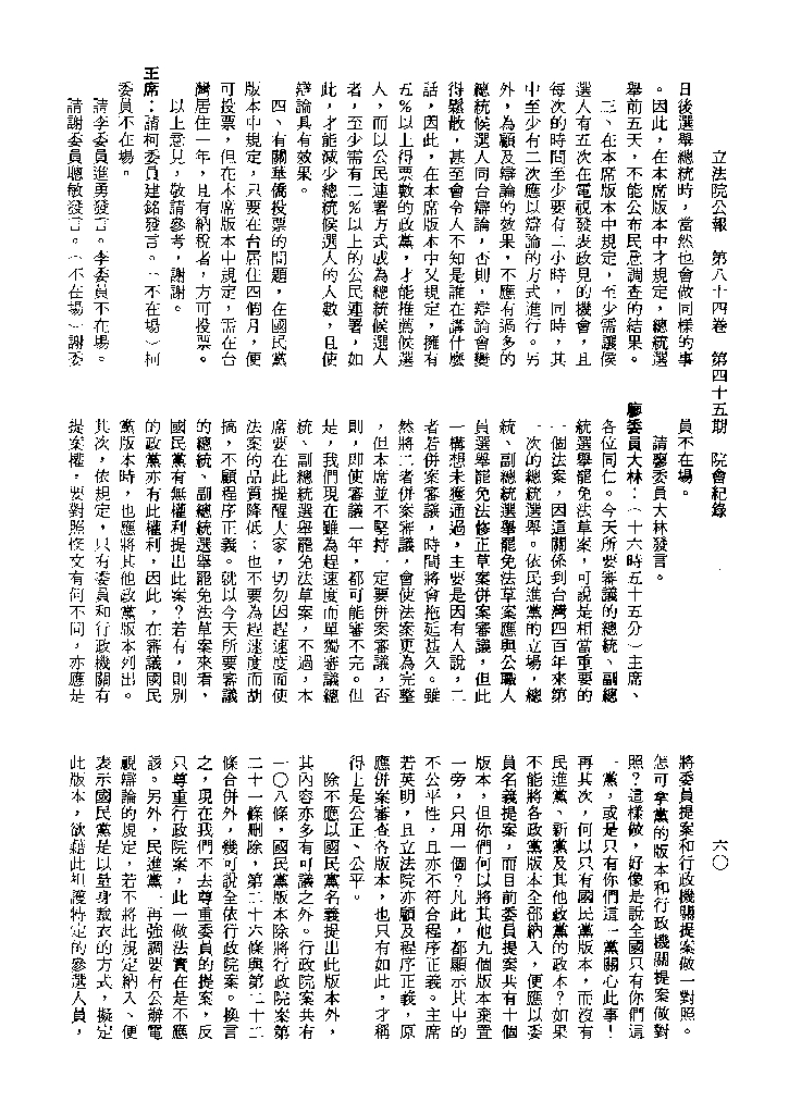 1.立法院饒穎奇委員等30人提案,在民國84年7月10日第2屆第5會期第35次會議開始進行二讀,第35次會議當天係進行廣泛討論。 2.由於民進黨有關第42條舉行公辦電視辯論會之主張未獲國民黨同意,對本案之審議採取焦土策略,逐條提出修正動議,逐條討論及表決。在第36次會議中,對本案名稱及第1章章名、第1條即作冗長的發言,最後表決照饒委員穎奇提案通過。整天只有通過名稱、第1章章名及第1條條文。 3.本件立法院公報第84卷第45期,記載當日會議冗長討論及表決之經過(第35頁至第64頁、第331頁至359)。