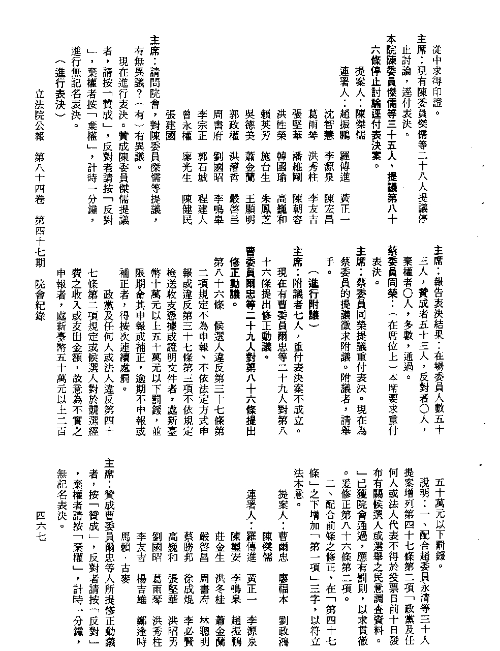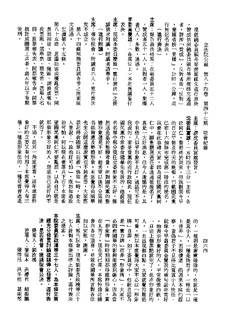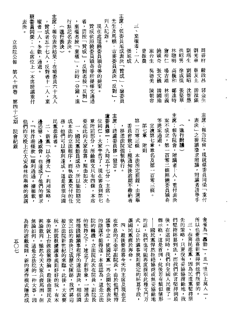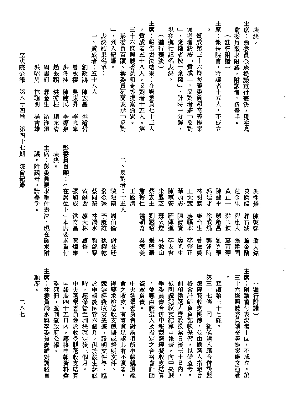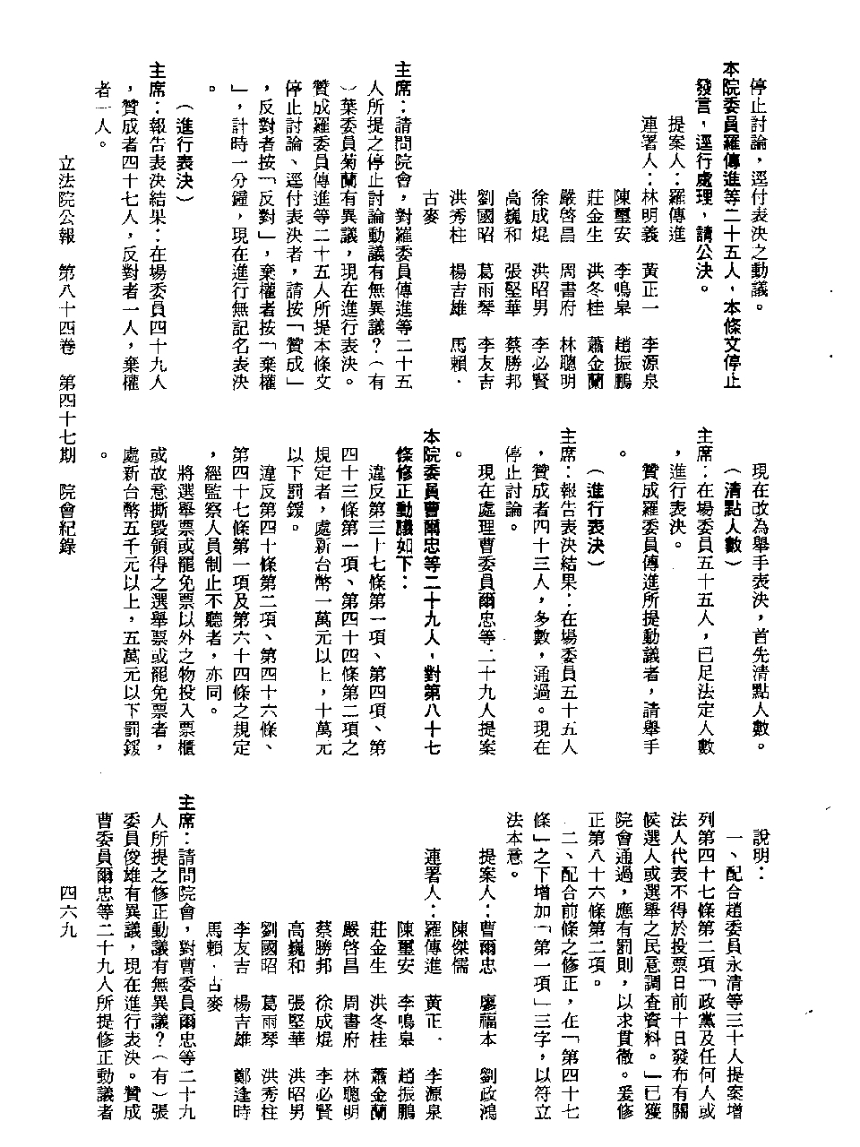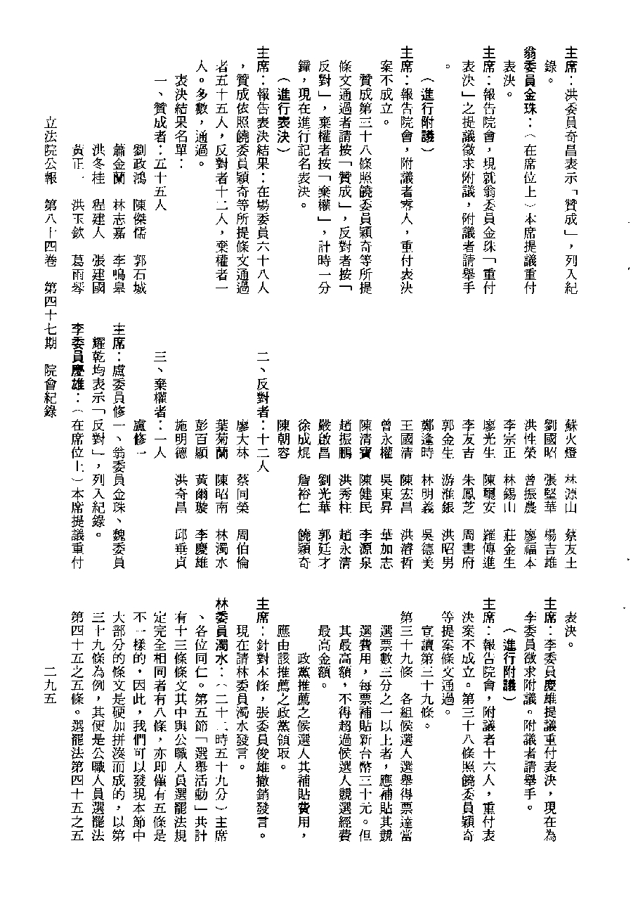1.本案第2條以下條文,立法院第2屆第5會期第38次會議進行審議,第38次院會共包括民國84年7月14日下午、7月17日、7月18日、7月19日及7月20日上午等5個會議日。 2.由於民進黨團採取焦土策略,會議主席堅持依據議事規則逐條處理,拒絕包裹表決。因此本案第2條以下各條文的進行,按議事規則作同一模式的處理,在宣讀條文後由1位或2位委員發言,國民黨團委員即提出停止討論逕付表決之動議,停止討論動議經表決通過,該條文停止討論提付表決,此時民進黨團委員提出書面修正動議,其修正動議如獲多數支持,即照其修正動議通過,如其修正動議少數不通過,即將饒委員提案條文提付表決通過。 3.本件立法院公報紀錄第84卷,記載第38次會議5個會議日逐條討論表決之經過(第47期第87頁至第523頁)。