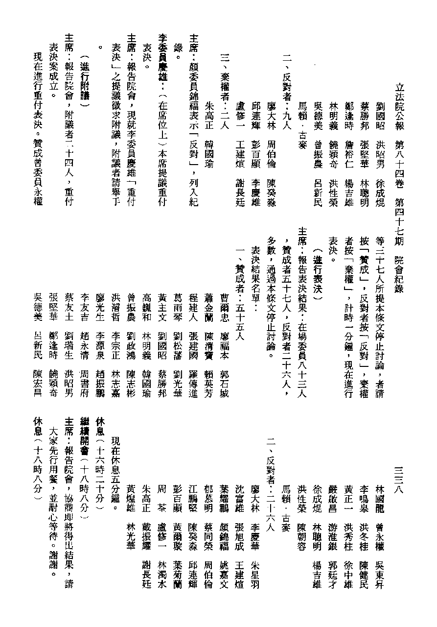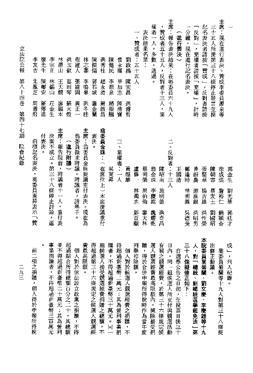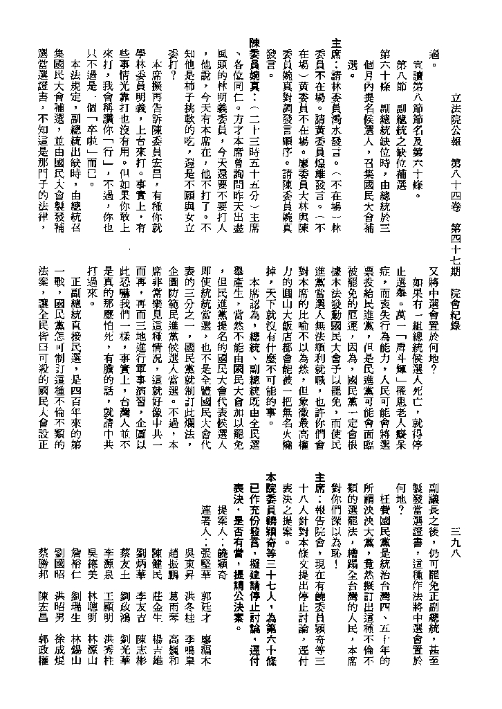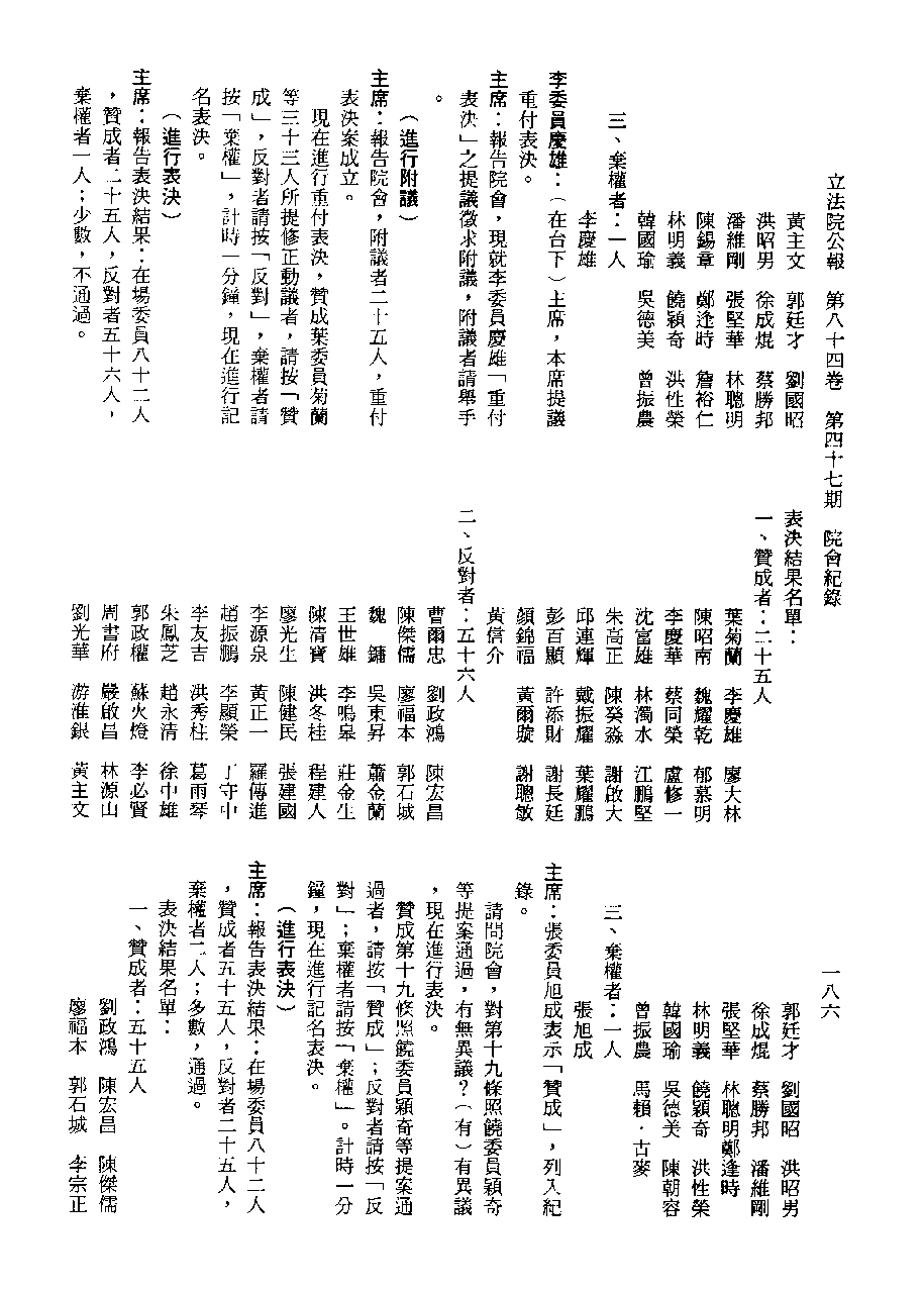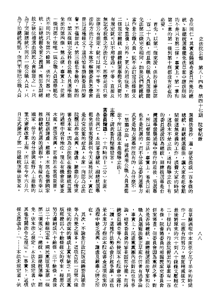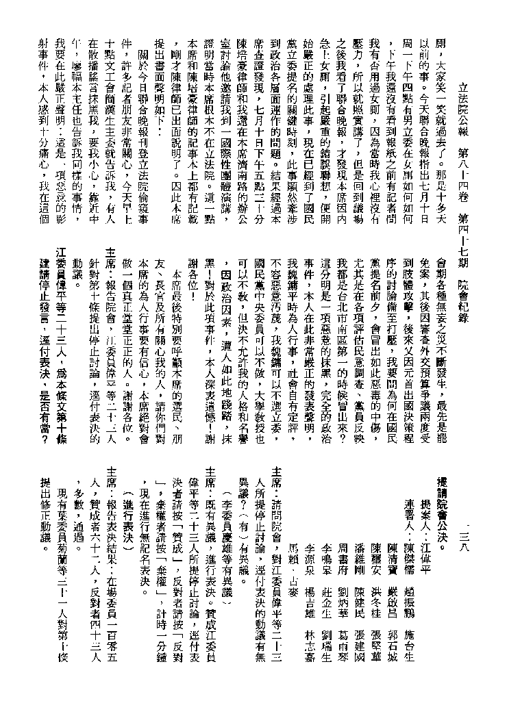 1.本案第2條以下條文,立法院第2屆第5會期第38次會議進行審議,第38次院會共包括民國84年7月14日下午、7月17日、7月18日、7月19日及7月20日上午等5個會議日。 2.由於民進黨團採取焦土策略,會議主席堅持依據議事規則逐條處理,拒絕包裹表決。因此本案第2條以下各條文的進行,按議事規則作同一模式的處理,在宣讀條文後由1位或2位委員發言,國民黨團委員即提出停止討論逕付表決之動議,停止討論動議經表決通過,該條文停止討論提付表決,此時民進黨團委員提出書面修正動議,其修正動議如獲多數支持,即照其修正動議通過,如其修正動議少數不通過,即將饒委員提案條文提付表決通過。 3.本件立法院公報紀錄第84卷,記載第38次會議5個會議日逐條討論表決之經過(第47期第87頁至第523頁)。