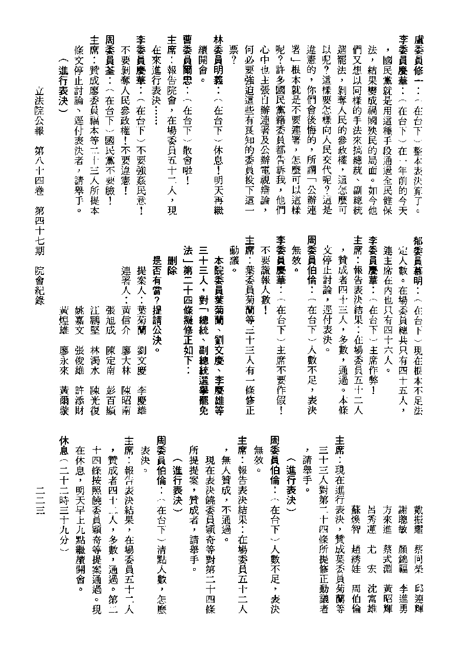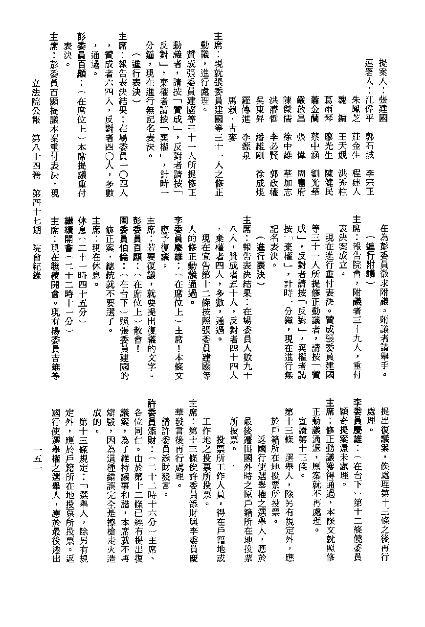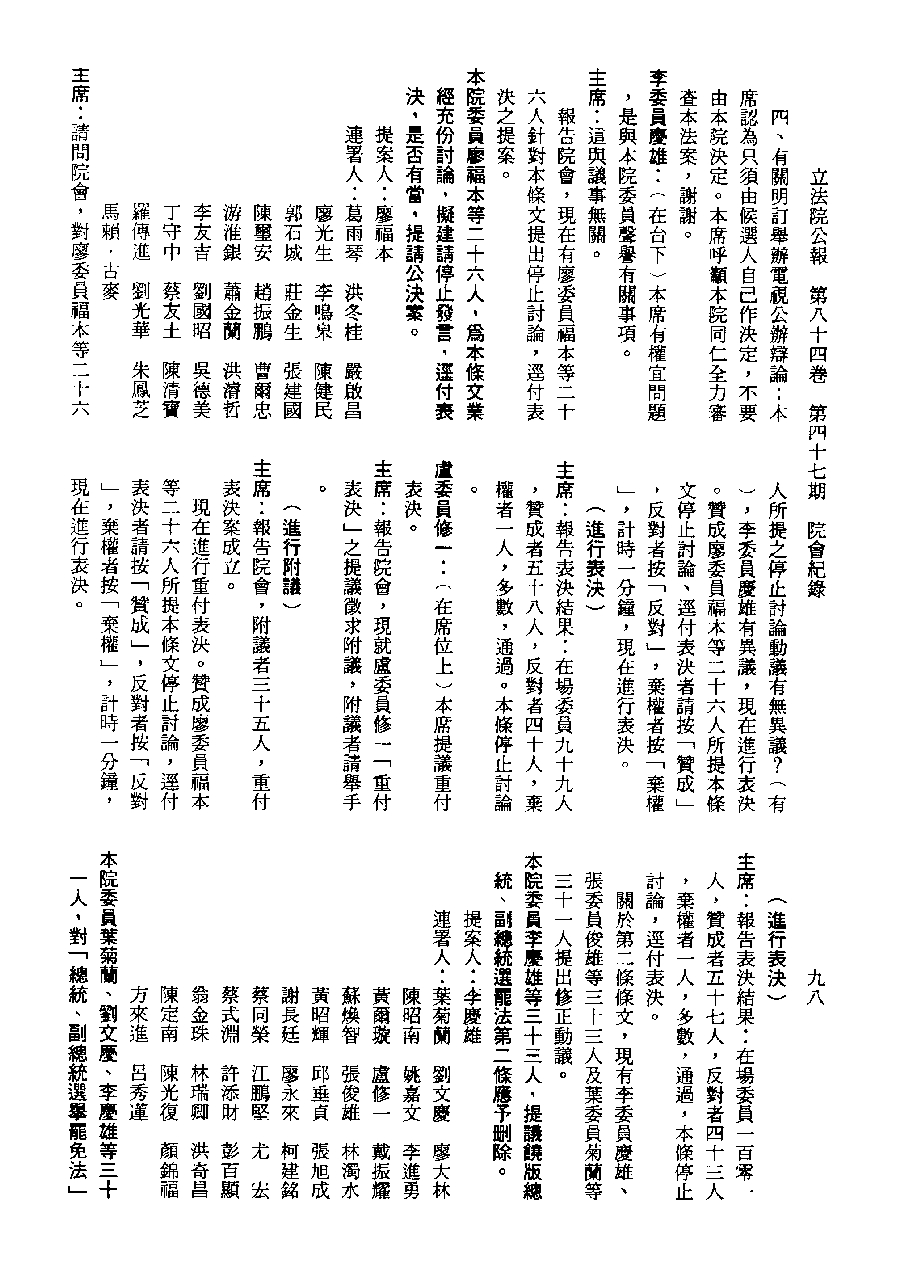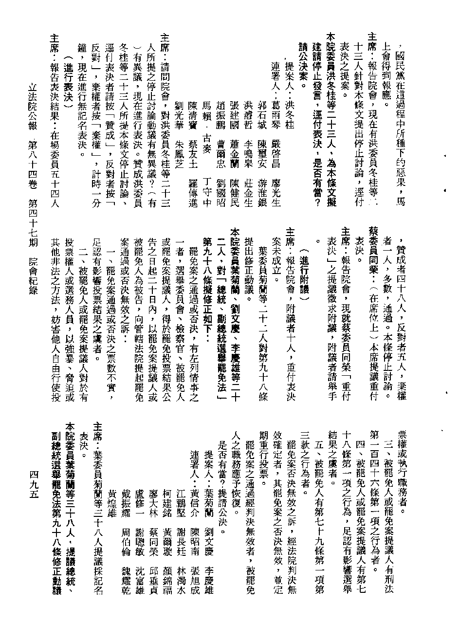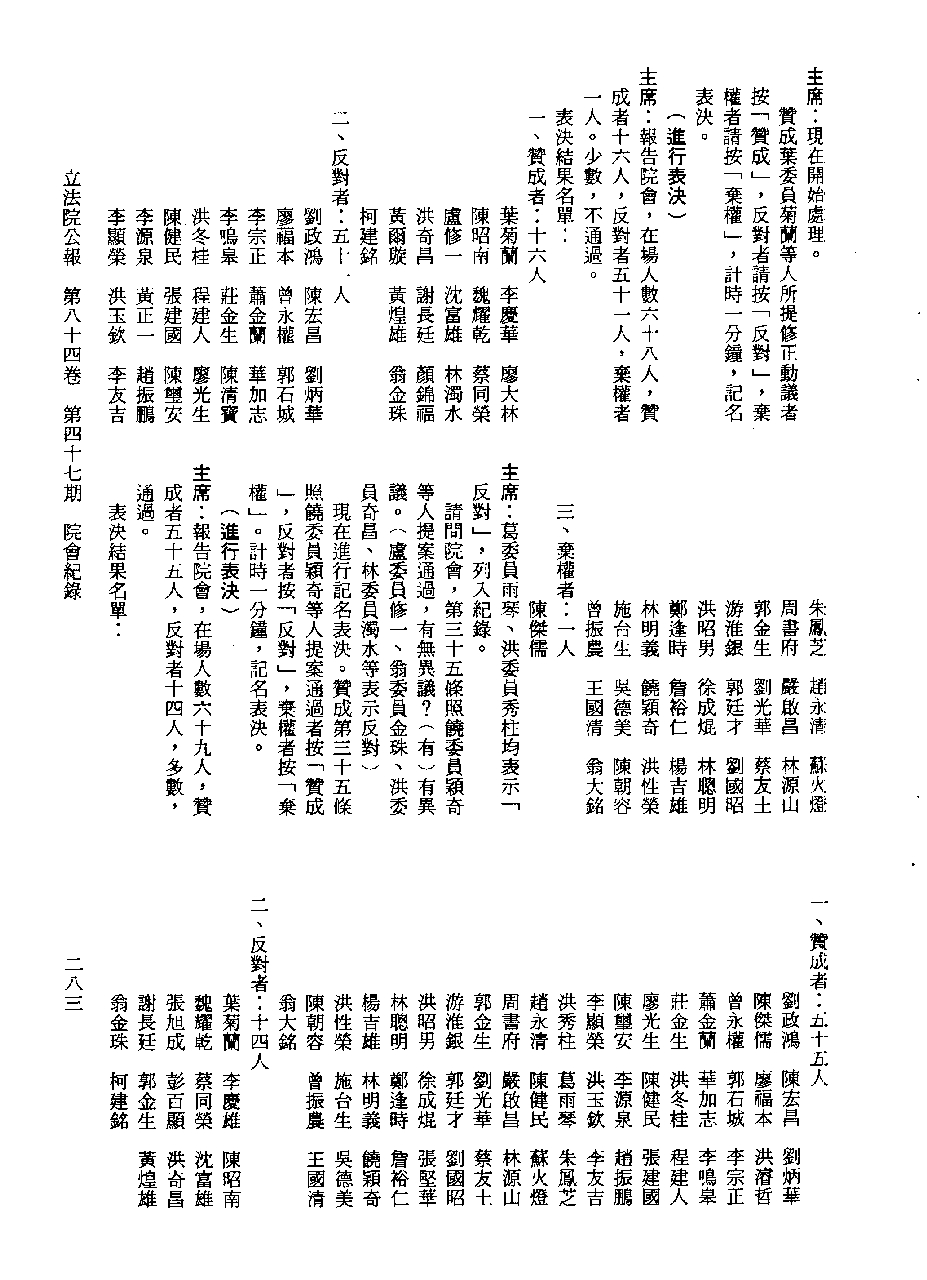 1.本案第2條以下條文,立法院第2屆第5會期第38次會議進行審議,第38次院會共包括民國84年7月14日下午、7月17日、7月18日、7月19日及7月20日上午等5個會議日。 2.由於民進黨團採取焦土策略,會議主席堅持依據議事規則逐條處理,拒絕包裹表決。因此本案第2條以下各條文的進行,按議事規則作同一模式的處理,在宣讀條文後由1位或2位委員發言,國民黨團委員即提出停止討論逕付表決之動議,停止討論動議經表決通過,該條文停止討論提付表決,此時民進黨團委員提出書面修正動議,其修正動議如獲多數支持,即照其修正動議通過,如其修正動議少數不通過,即將饒委員提案條文提付表決通過。 3.本件立法院公報紀錄第84卷,記載第38次會議5個會議日逐條討論表決之經過(第47期第87頁至第523頁)。