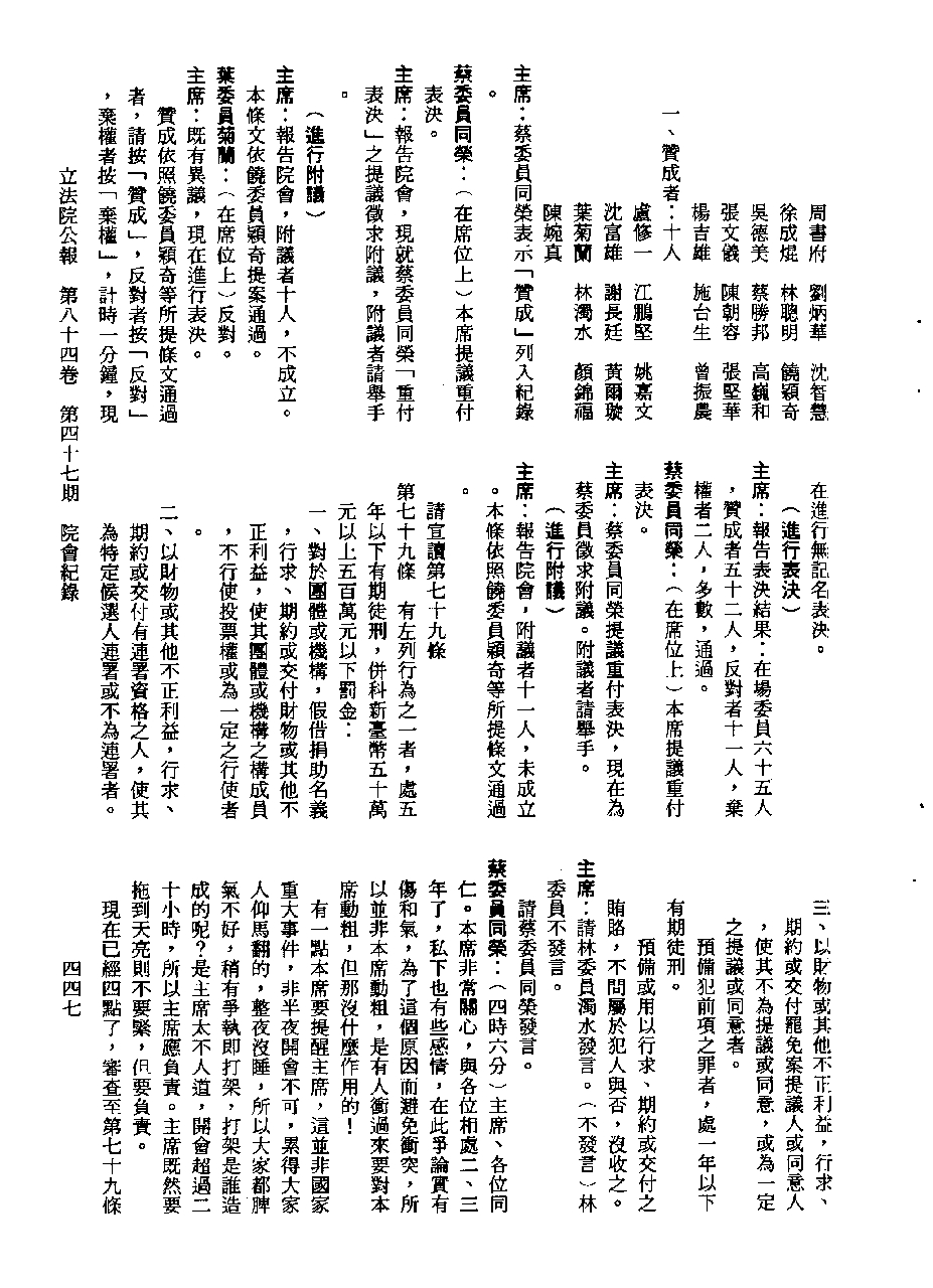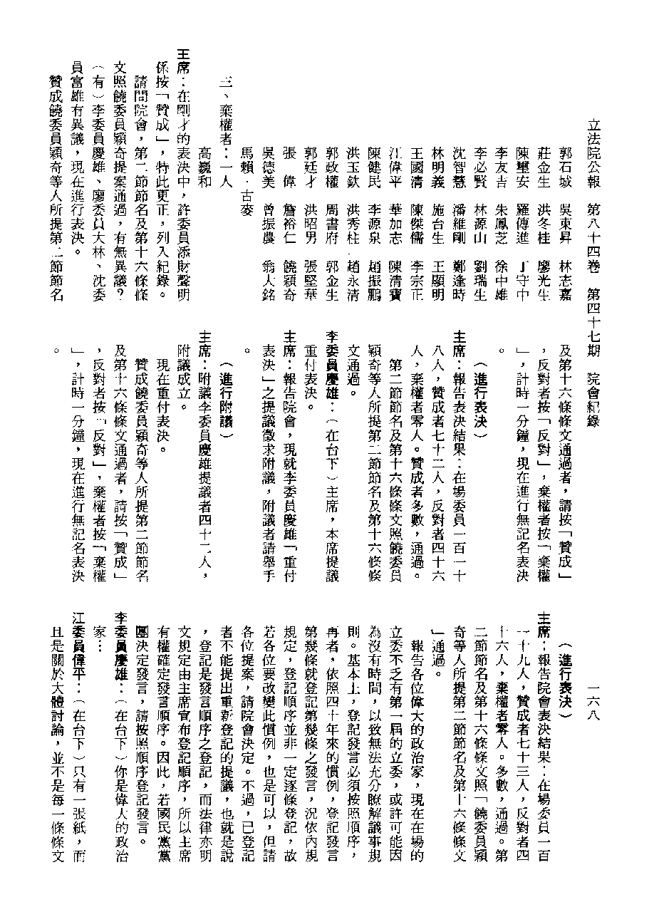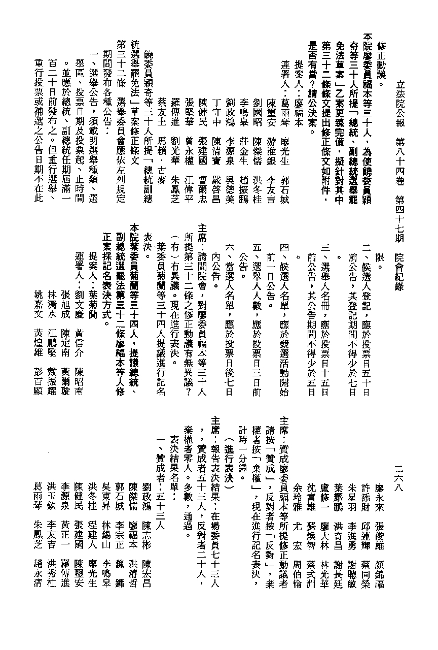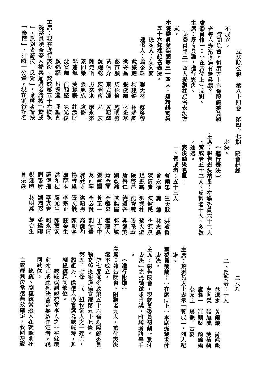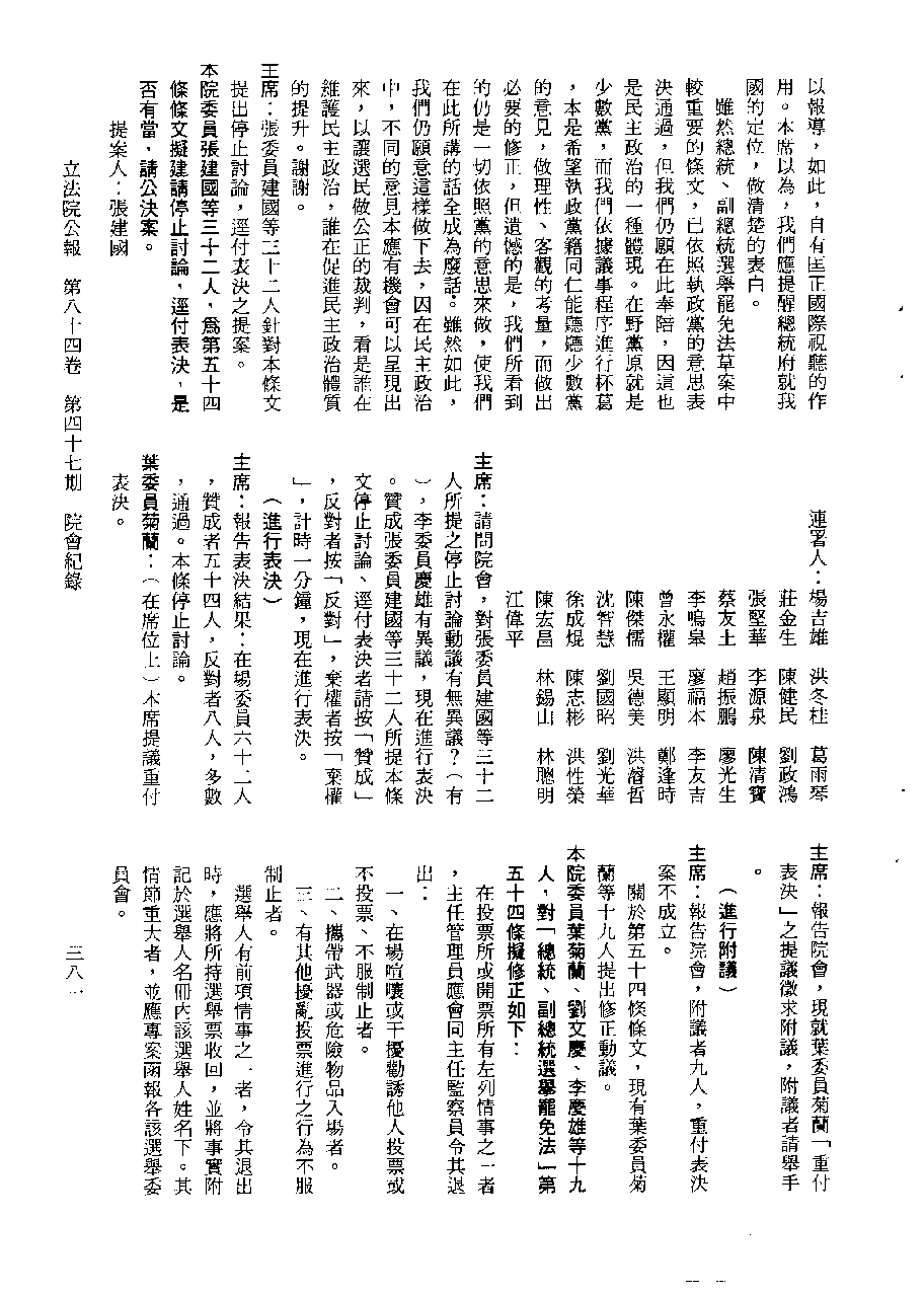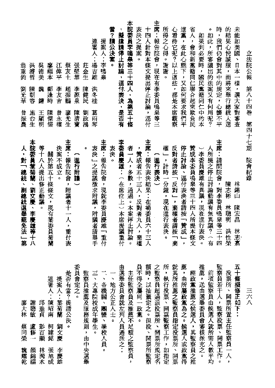 1.本案第2條以下條文,立法院第2屆第5會期第38次會議進行審議,第38次院會共包括民國84年7月14日下午、7月17日、7月18日、7月19日及7月20日上午等5個會議日。 2.由於民進黨團採取焦土策略,會議主席堅持依據議事規則逐條處理,拒絕包裹表決。因此本案第2條以下各條文的進行,按議事規則作同一模式的處理,在宣讀條文後由1位或2位委員發言,國民黨團委員即提出停止討論逕付表決之動議,停止討論動議經表決通過,該條文停止討論提付表決,此時民進黨團委員提出書面修正動議,其修正動議如獲多數支持,即照其修正動議通過,如其修正動議少數不通過,即將饒委員提案條文提付表決通過。 3.本件立法院公報紀錄第84卷,記載第38次會議5個會議日逐條討論表決之經過(第47期第87頁至第523頁)。