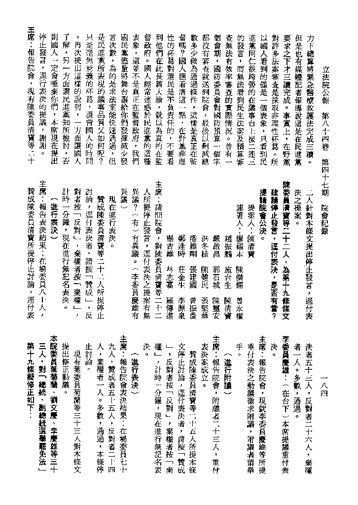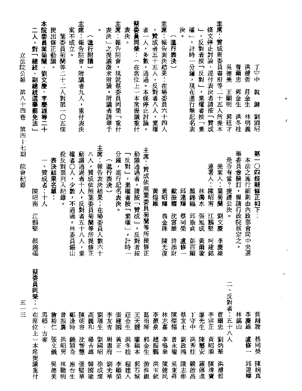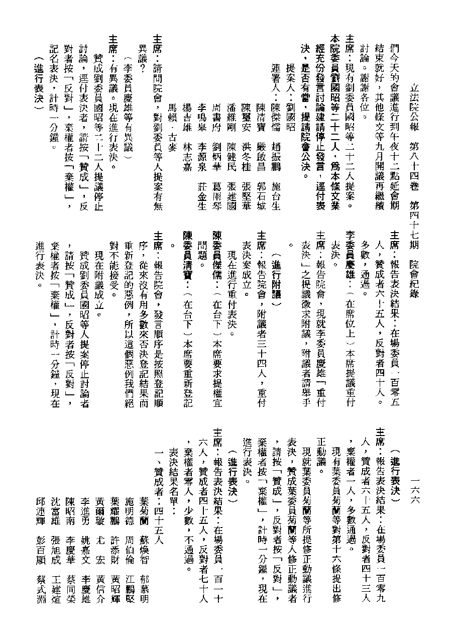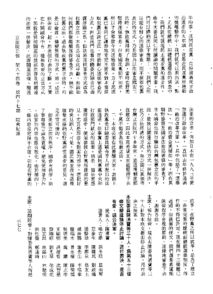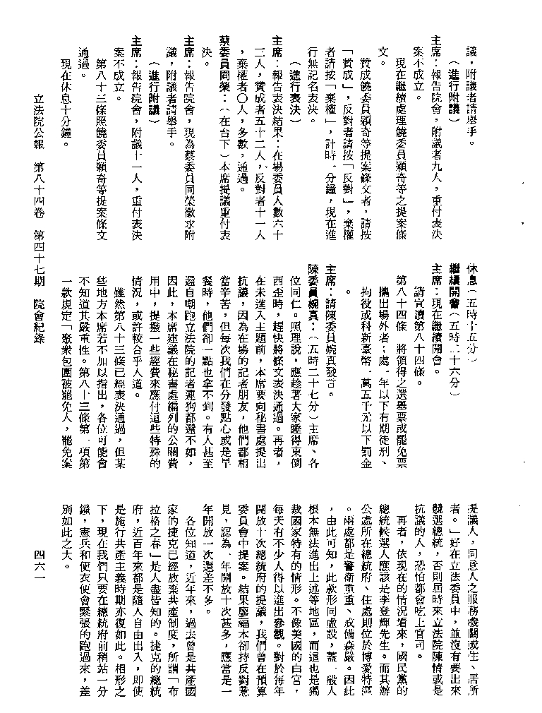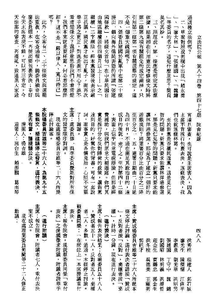 1.本案第2條以下條文,立法院第2屆第5會期第38次會議進行審議,第38次院會共包括民國84年7月14日下午、7月17日、7月18日、7月19日及7月20日上午等5個會議日。 2.由於民進黨團採取焦土策略,會議主席堅持依據議事規則逐條處理,拒絕包裹表決。因此本案第2條以下各條文的進行,按議事規則作同一模式的處理,在宣讀條文後由1位或2位委員發言,國民黨團委員即提出停止討論逕付表決之動議,停止討論動議經表決通過,該條文停止討論提付表決,此時民進黨團委員提出書面修正動議,其修正動議如獲多數支持,即照其修正動議通過,如其修正動議少數不通過,即將饒委員提案條文提付表決通過。 3.本件立法院公報紀錄第84卷,記載第38次會議5個會議日逐條討論表決之經過(第47期第87頁至第523頁)。