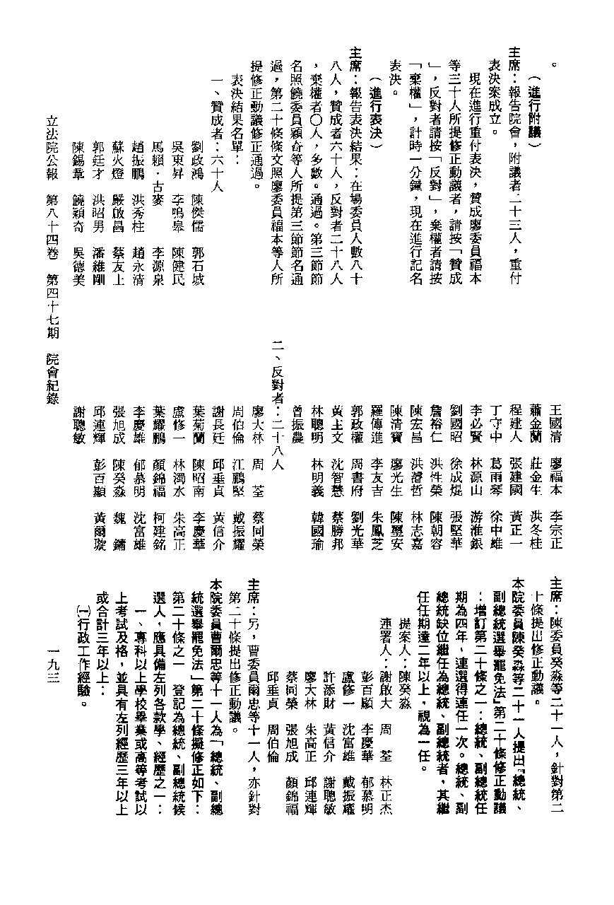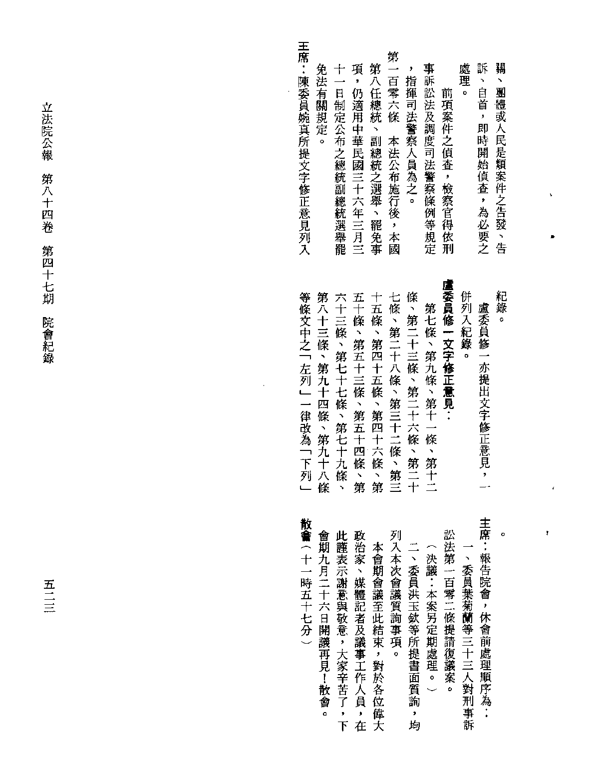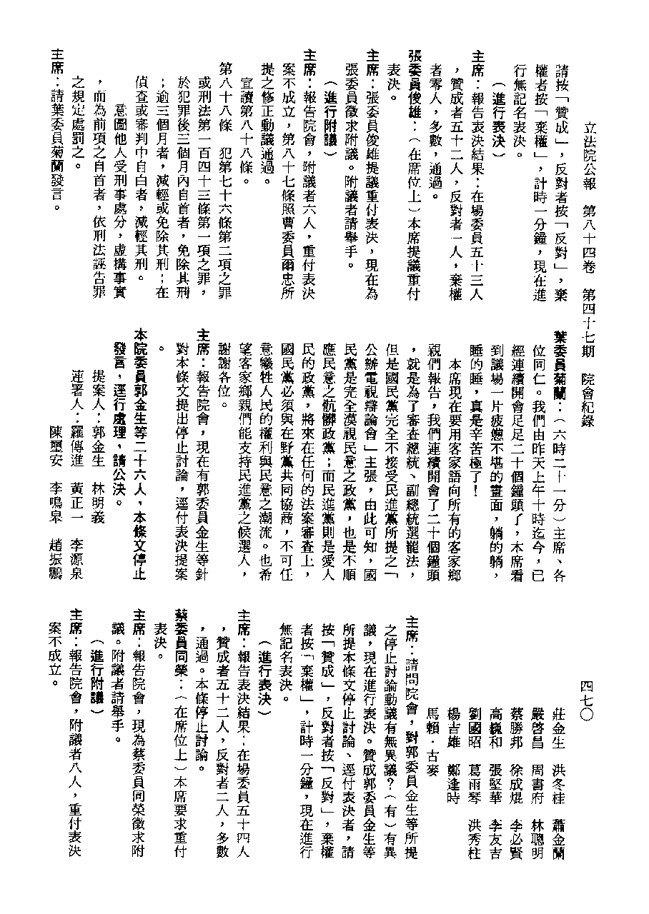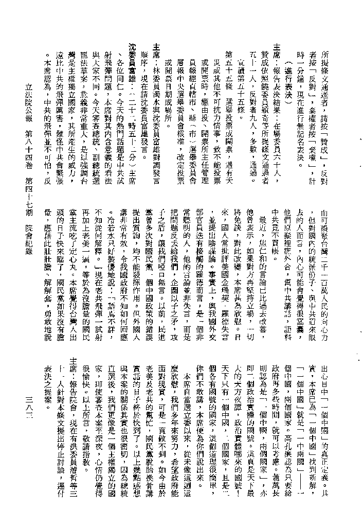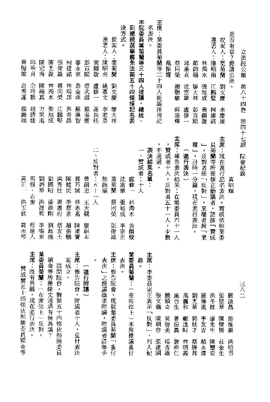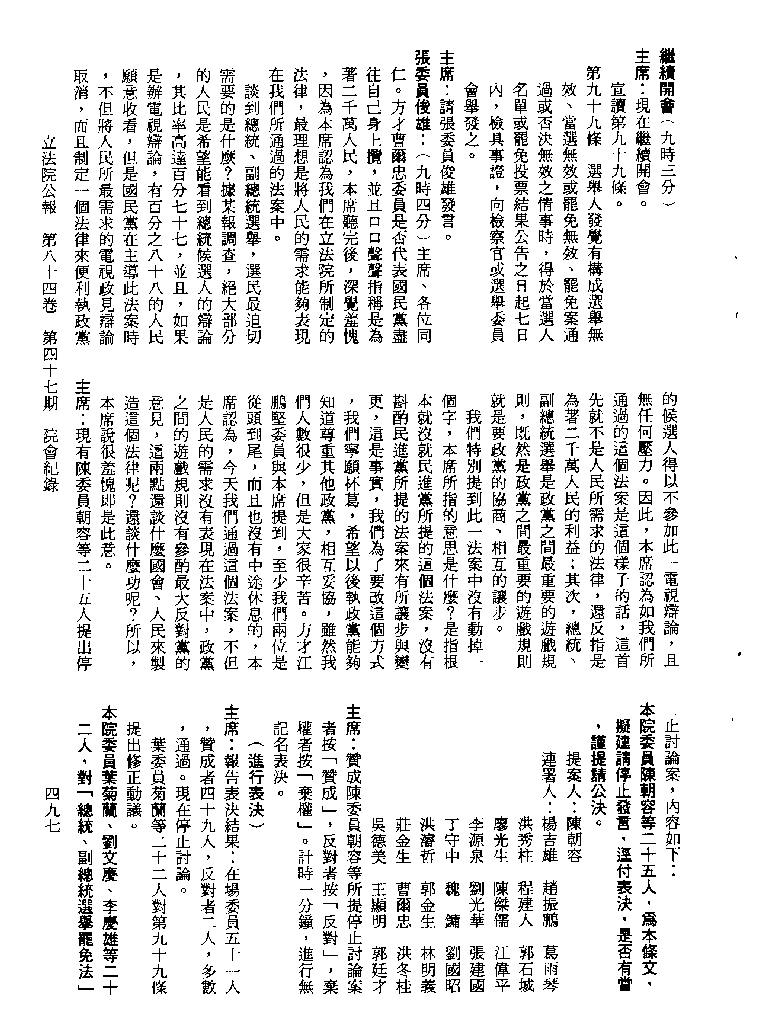 1.本案第2條以下條文,立法院第2屆第5會期第38次會議進行審議,第38次院會共包括民國84年7月14日下午、7月17日、7月18日、7月19日及7月20日上午等5個會議日。 2.由於民進黨團採取焦土策略,會議主席堅持依據議事規則逐條處理,拒絕包裹表決。因此本案第2條以下各條文的進行,按議事規則作同一模式的處理,在宣讀條文後由1位或2位委員發言,國民黨團委員即提出停止討論逕付表決之動議,停止討論動議經表決通過,該條文停止討論提付表決,此時民進黨團委員提出書面修正動議,其修正動議如獲多數支持,即照其修正動議通過,如其修正動議少數不通過,即將饒委員提案條文提付表決通過。 3.本件立法院公報紀錄第84卷,記載第38次會議5個會議日逐條討論表決之經過(第47期第87頁至第523頁)。