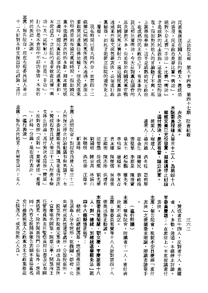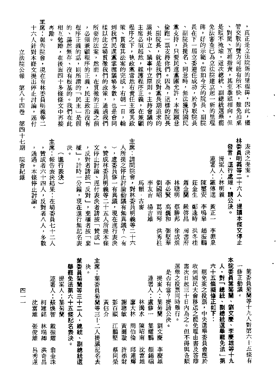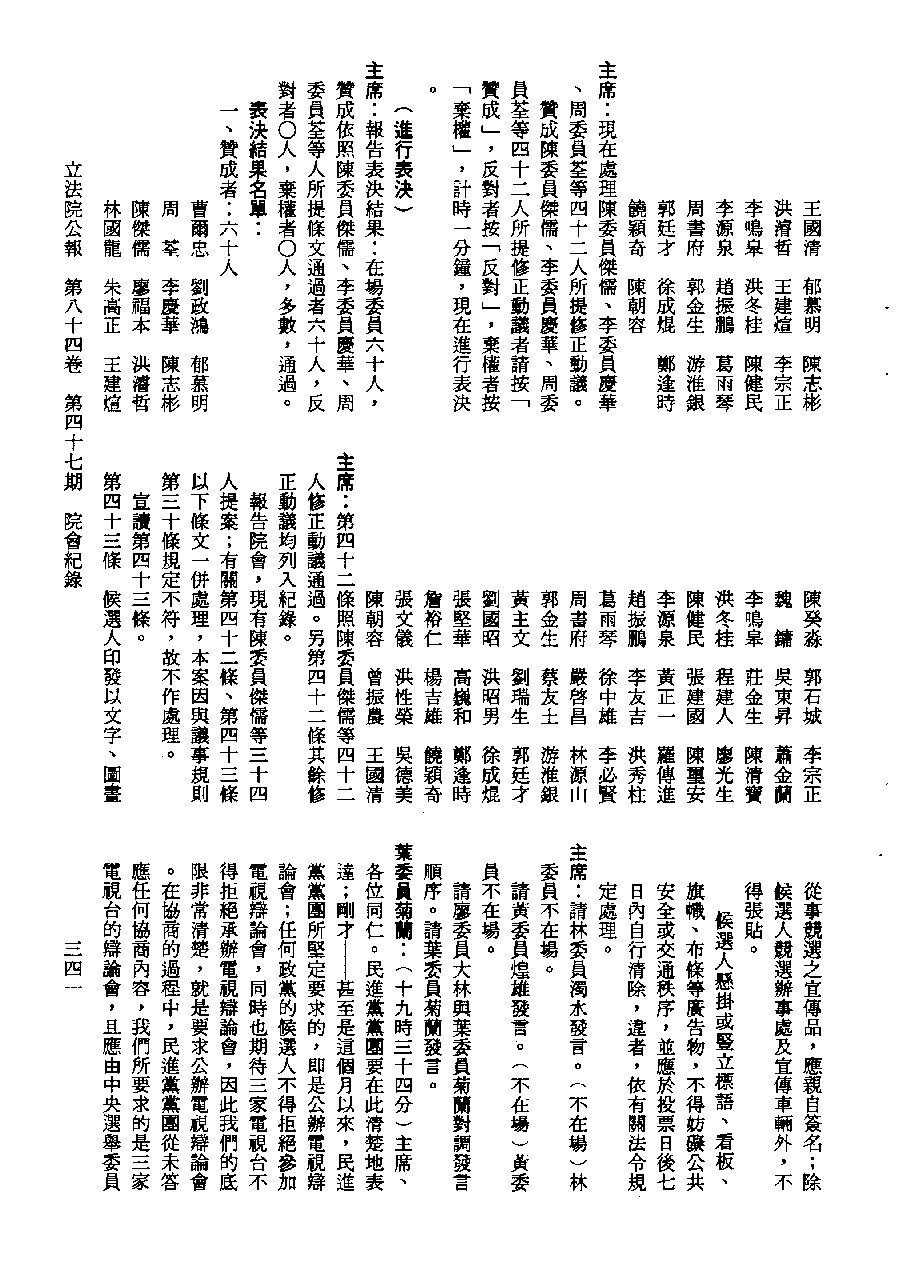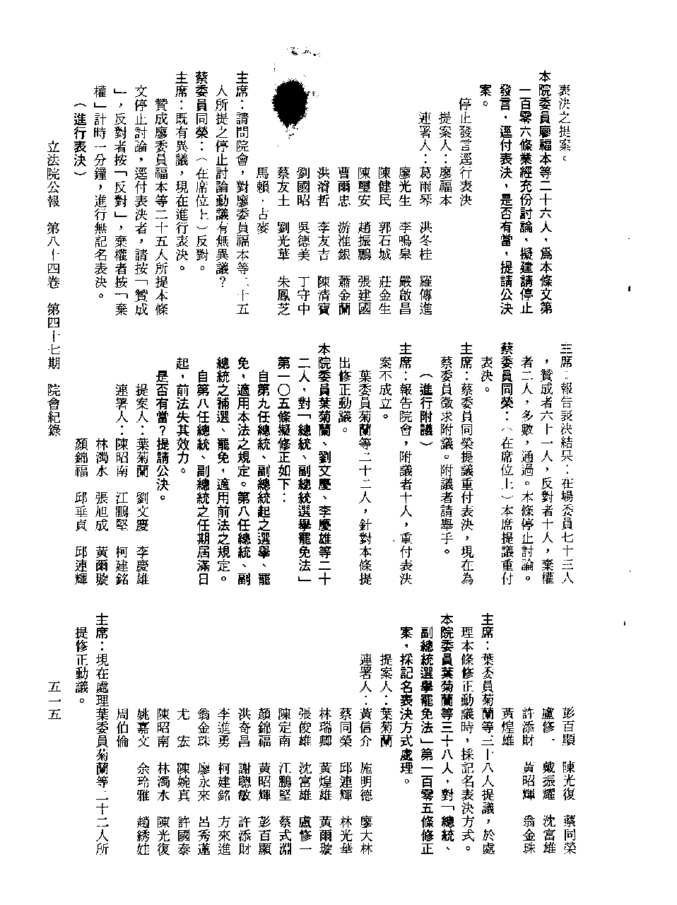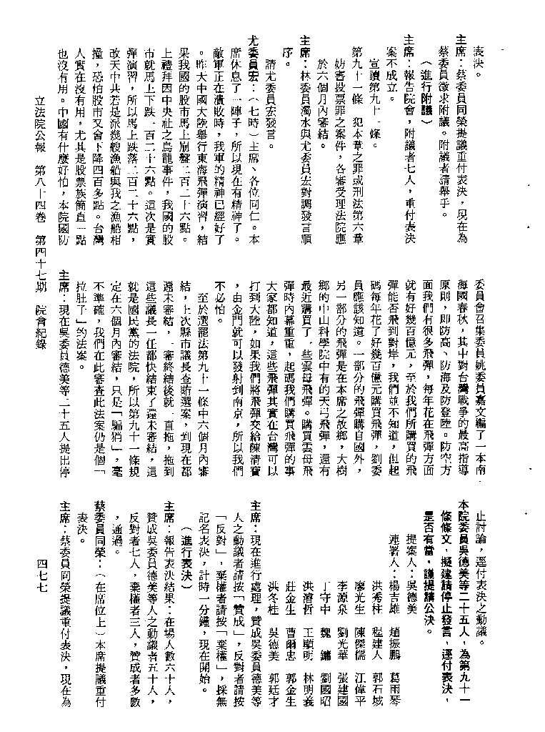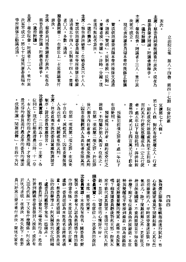 1.本案第2條以下條文,立法院第2屆第5會期第38次會議進行審議,第38次院會共包括民國84年7月14日下午、7月17日、7月18日、7月19日及7月20日上午等5個會議日。 2.由於民進黨團採取焦土策略,會議主席堅持依據議事規則逐條處理,拒絕包裹表決。因此本案第2條以下各條文的進行,按議事規則作同一模式的處理,在宣讀條文後由1位或2位委員發言,國民黨團委員即提出停止討論逕付表決之動議,停止討論動議經表決通過,該條文停止討論提付表決,此時民進黨團委員提出書面修正動議,其修正動議如獲多數支持,即照其修正動議通過,如其修正動議少數不通過,即將饒委員提案條文提付表決通過。 3.本件立法院公報紀錄第84卷,記載第38次會議5個會議日逐條討論表決之經過(第47期第87頁至第523頁)。