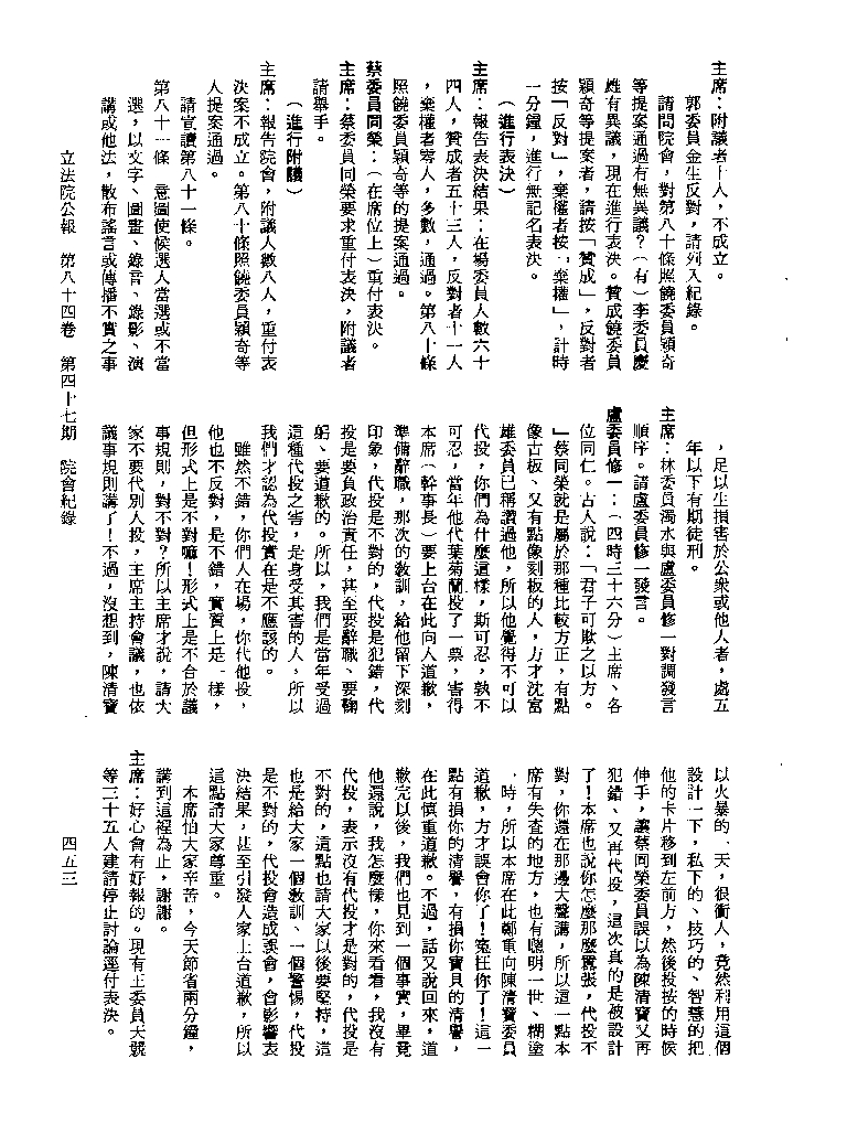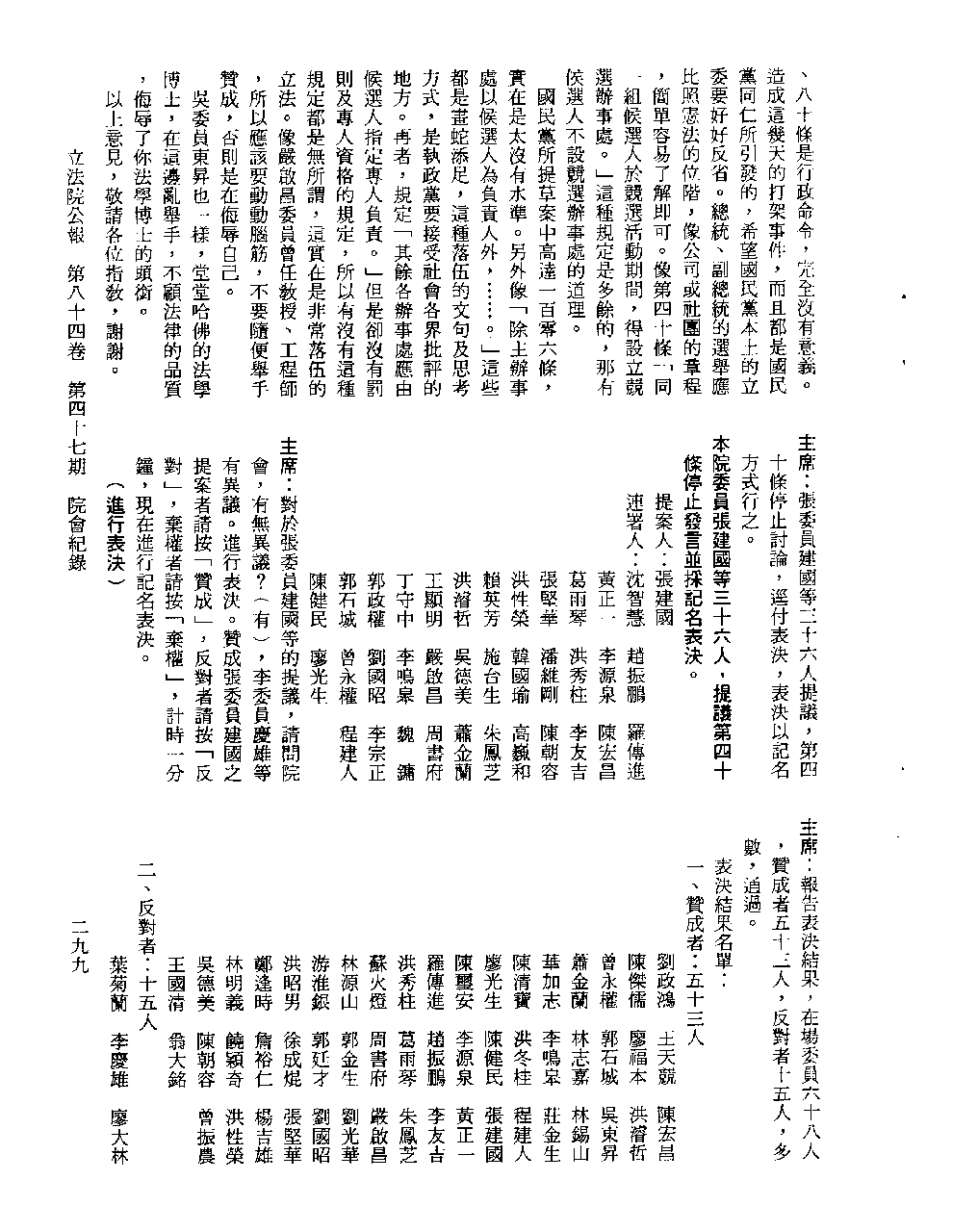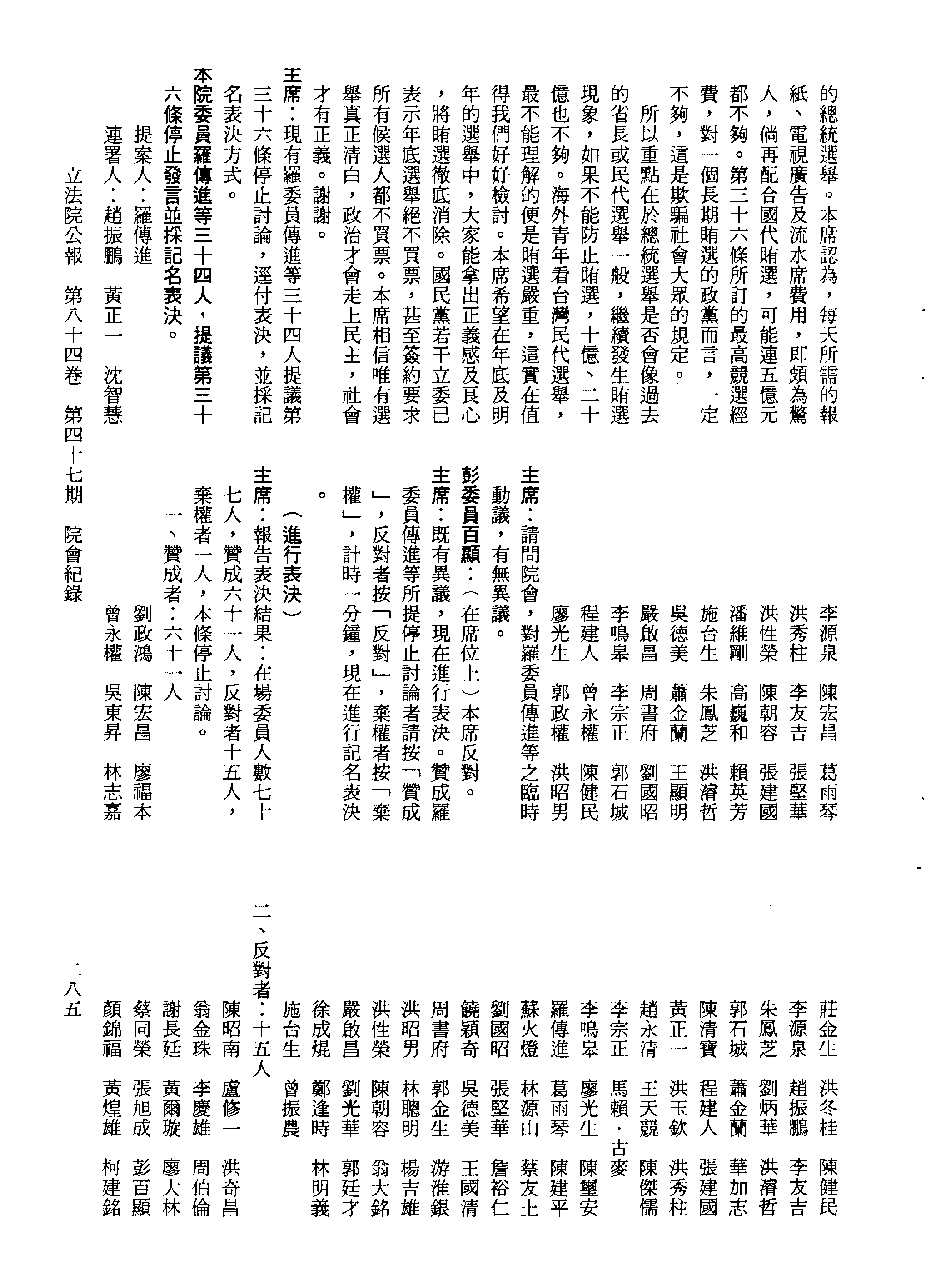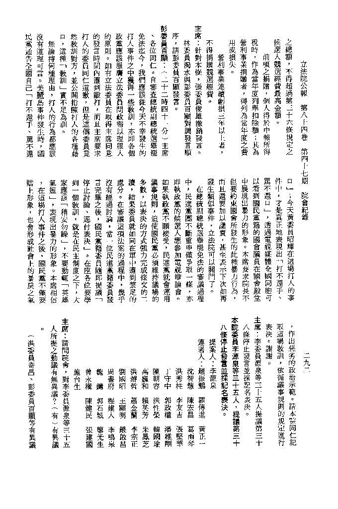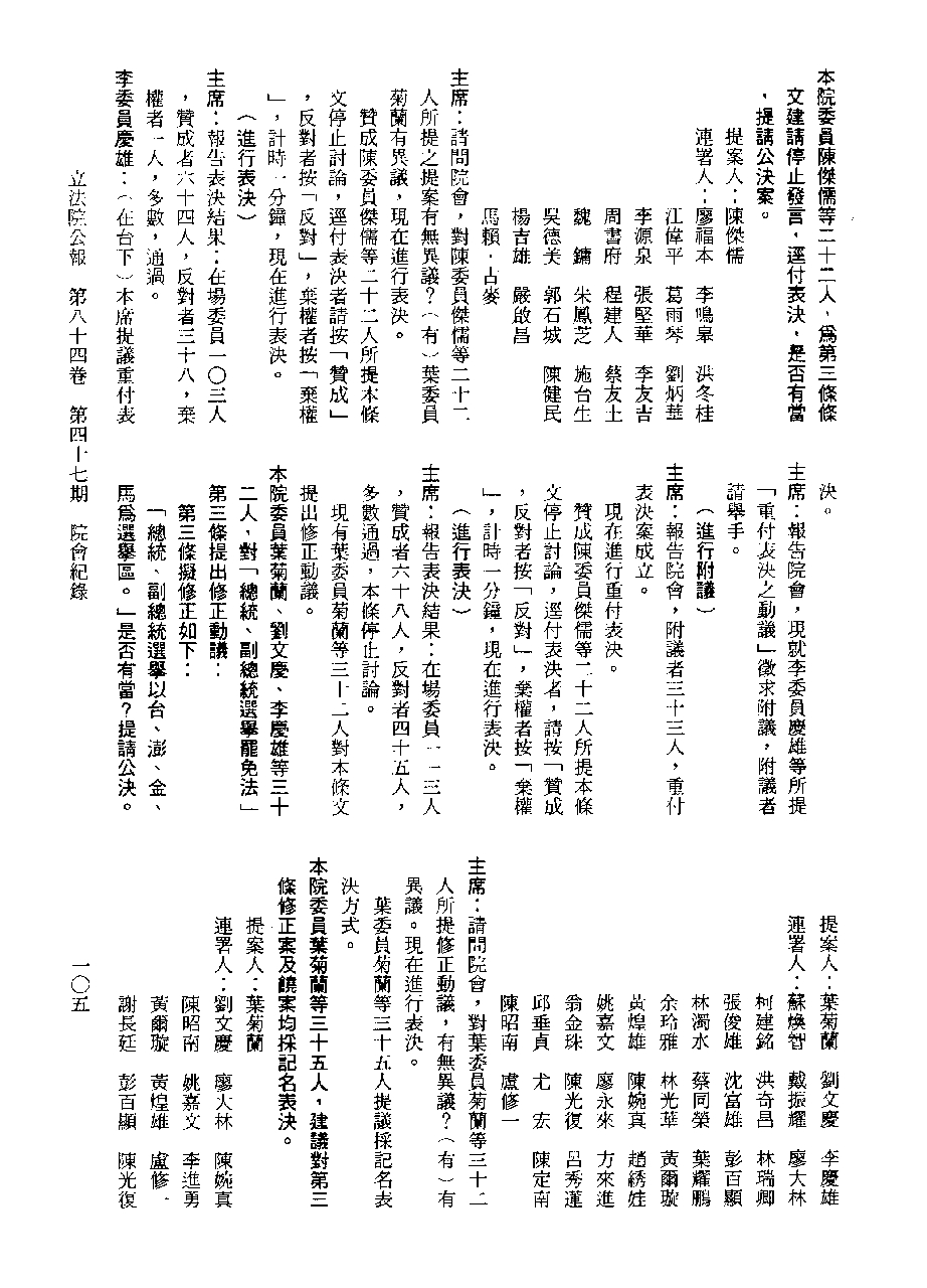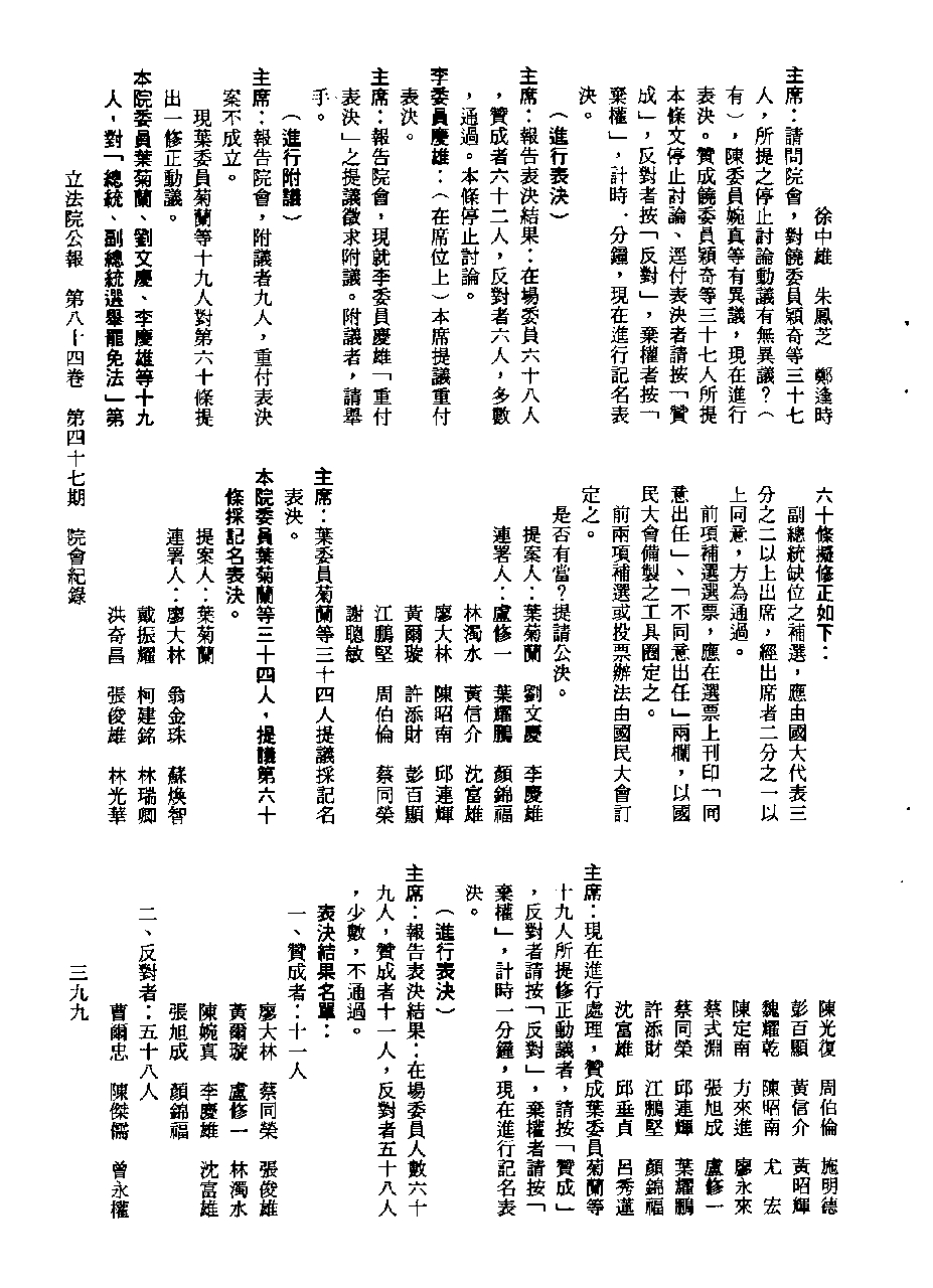 1.本案第2條以下條文,立法院第2屆第5會期第38次會議進行審議,第38次院會共包括民國84年7月14日下午、7月17日、7月18日、7月19日及7月20日上午等5個會議日。 2.由於民進黨團採取焦土策略,會議主席堅持依據議事規則逐條處理,拒絕包裹表決。因此本案第2條以下各條文的進行,按議事規則作同一模式的處理,在宣讀條文後由1位或2位委員發言,國民黨團委員即提出停止討論逕付表決之動議,停止討論動議經表決通過,該條文停止討論提付表決,此時民進黨團委員提出書面修正動議,其修正動議如獲多數支持,即照其修正動議通過,如其修正動議少數不通過,即將饒委員提案條文提付表決通過。 3.本件立法院公報紀錄第84卷,記載第38次會議5個會議日逐條討論表決之經過(第47期第87頁至第523頁)。
