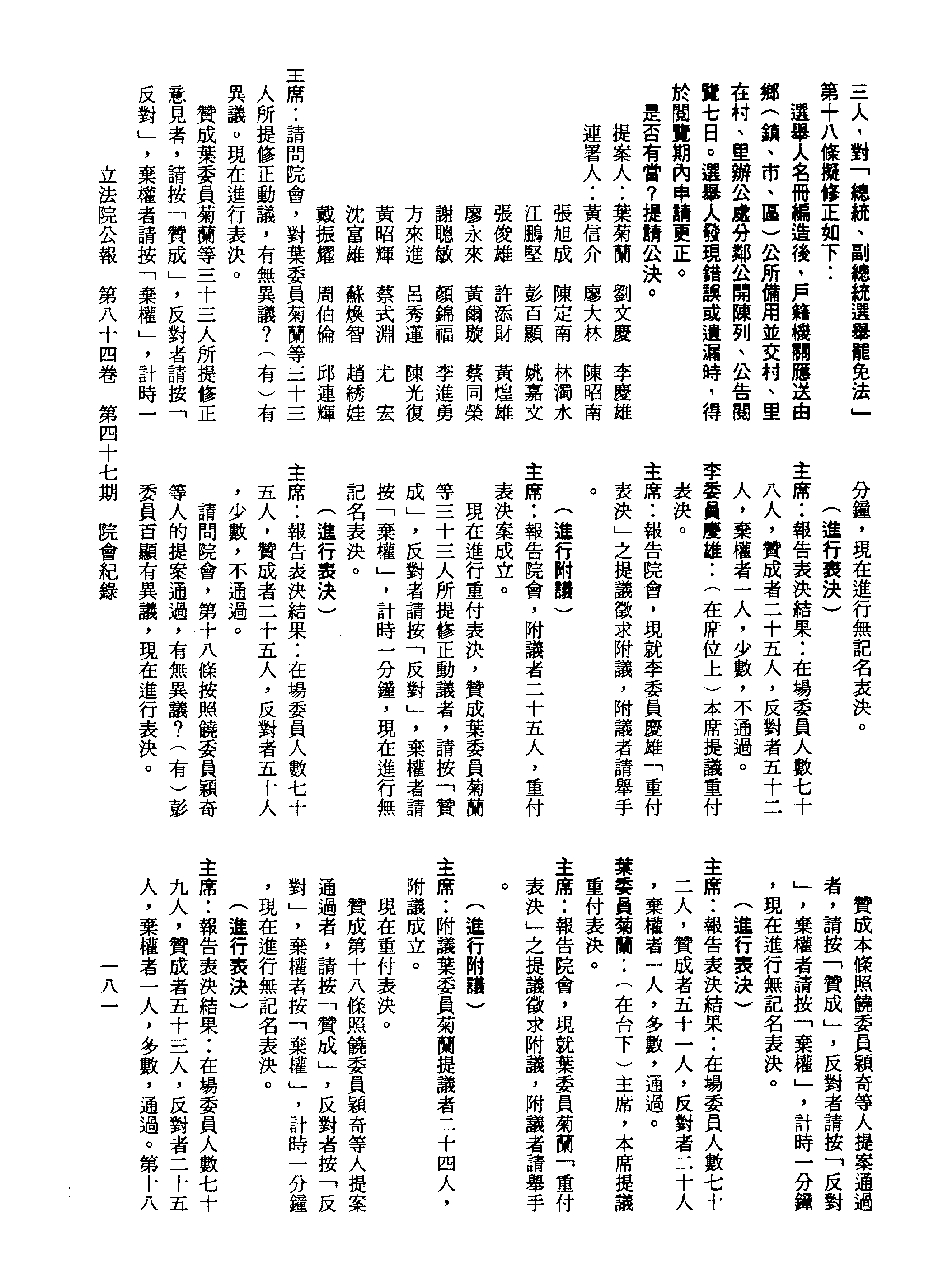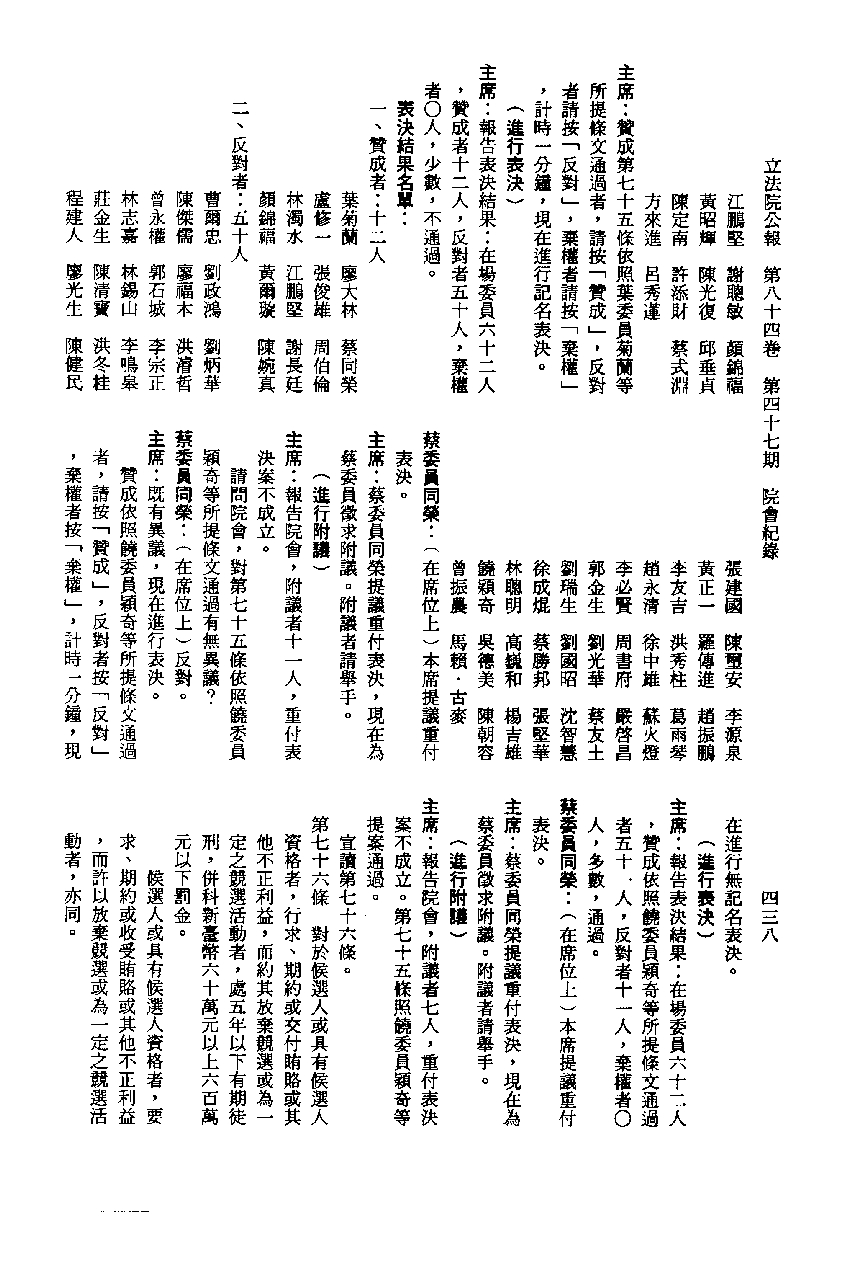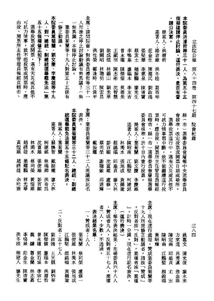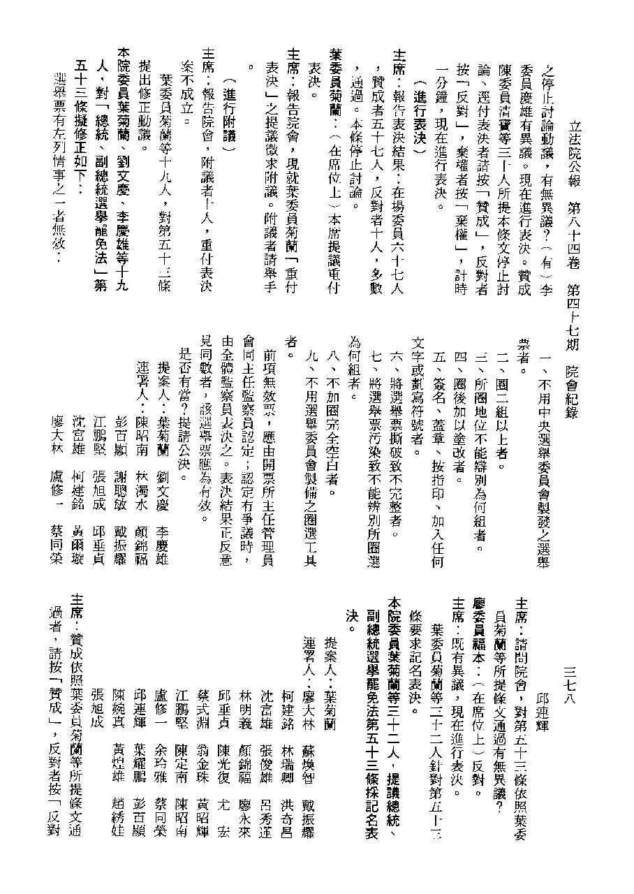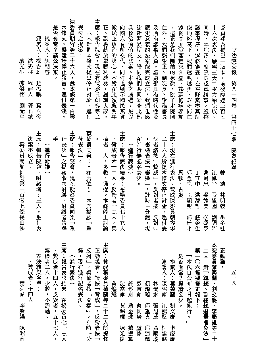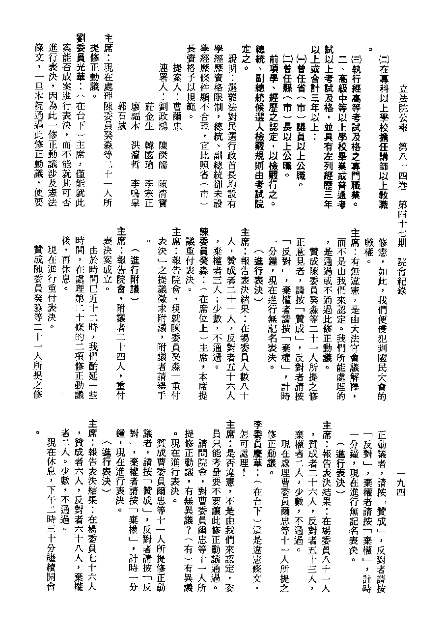 1.本案第2條以下條文,立法院第2屆第5會期第38次會議進行審議,第38次院會共包括民國84年7月14日下午、7月17日、7月18日、7月19日及7月20日上午等5個會議日。 2.由於民進黨團採取焦土策略,會議主席堅持依據議事規則逐條處理,拒絕包裹表決。因此本案第2條以下各條文的進行,按議事規則作同一模式的處理,在宣讀條文後由1位或2位委員發言,國民黨團委員即提出停止討論逕付表決之動議,停止討論動議經表決通過,該條文停止討論提付表決,此時民進黨團委員提出書面修正動議,其修正動議如獲多數支持,即照其修正動議通過,如其修正動議少數不通過,即將饒委員提案條文提付表決通過。 3.本件立法院公報紀錄第84卷,記載第38次會議5個會議日逐條討論表決之經過(第47期第87頁至第523頁)。