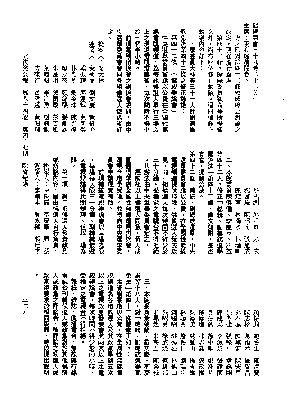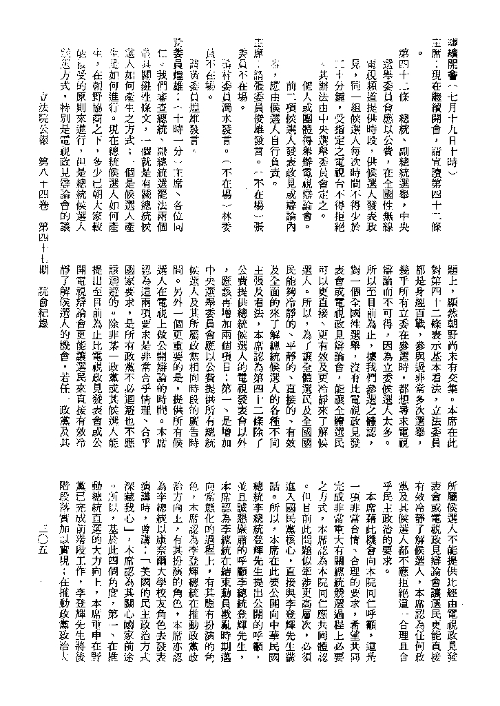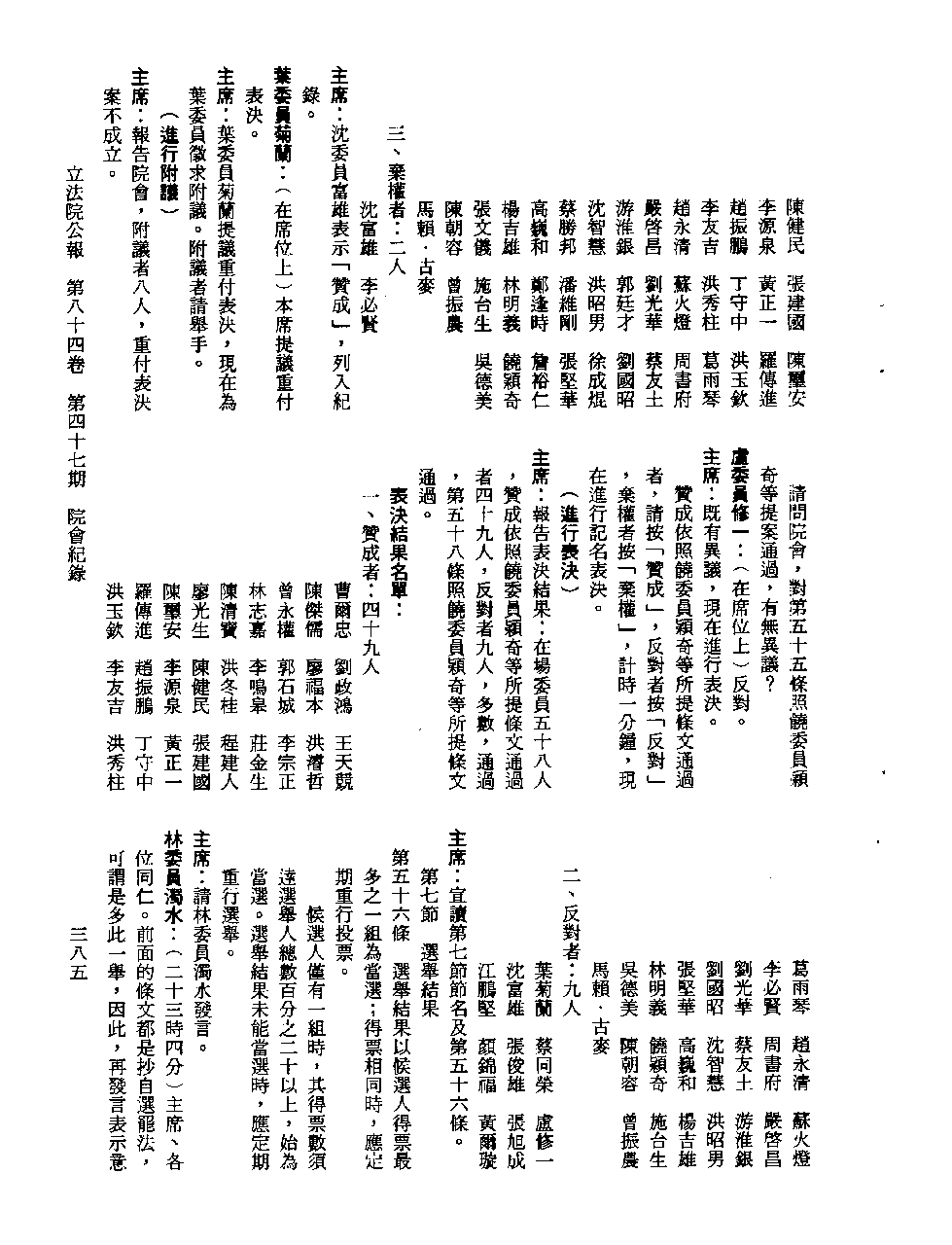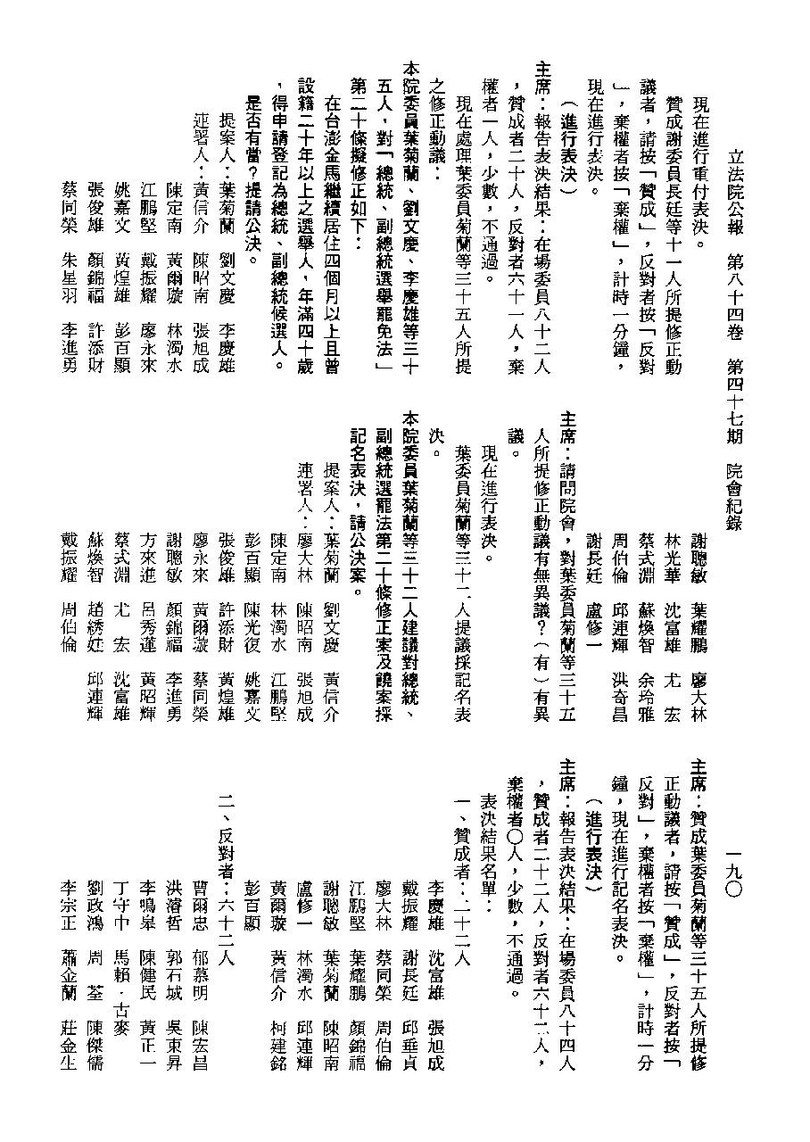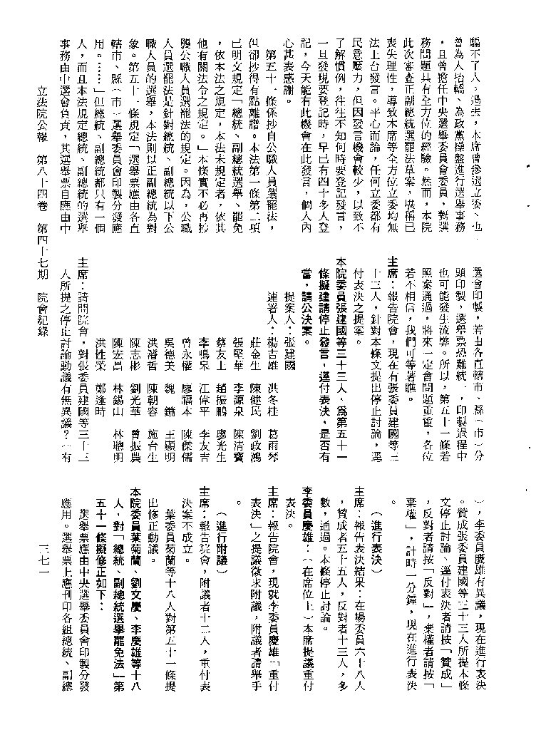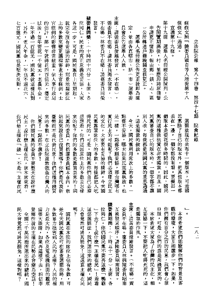 1.本案第2條以下條文,立法院第2屆第5會期第38次會議進行審議,第38次院會共包括民國84年7月14日下午、7月17日、7月18日、7月19日及7月20日上午等5個會議日。 2.由於民進黨團採取焦土策略,會議主席堅持依據議事規則逐條處理,拒絕包裹表決。因此本案第2條以下各條文的進行,按議事規則作同一模式的處理,在宣讀條文後由1位或2位委員發言,國民黨團委員即提出停止討論逕付表決之動議,停止討論動議經表決通過,該條文停止討論提付表決,此時民進黨團委員提出書面修正動議,其修正動議如獲多數支持,即照其修正動議通過,如其修正動議少數不通過,即將饒委員提案條文提付表決通過。 3.本件立法院公報紀錄第84卷,記載第38次會議5個會議日逐條討論表決之經過(第47期第87頁至第523頁)。