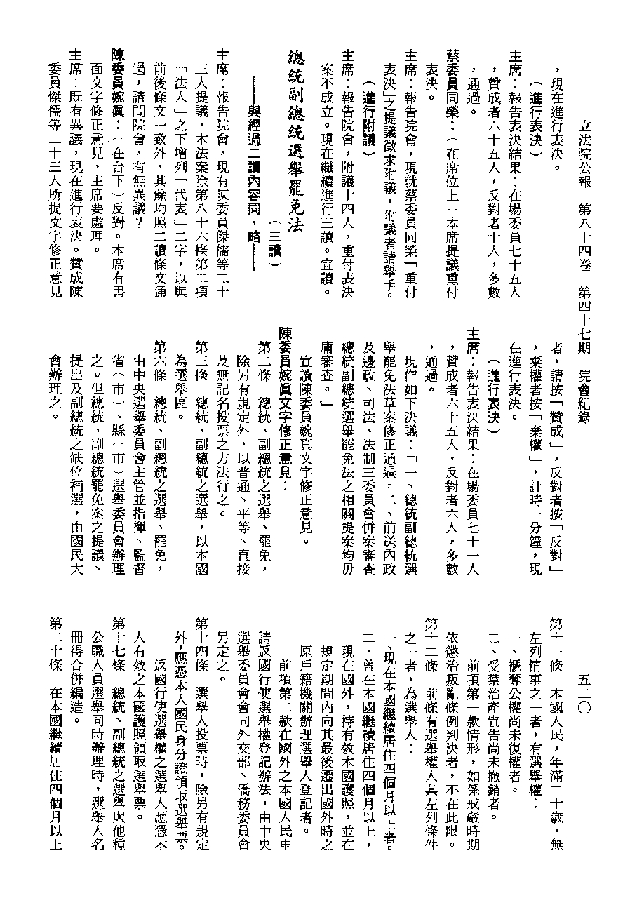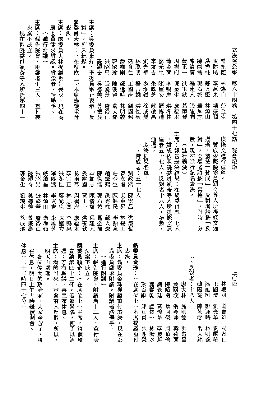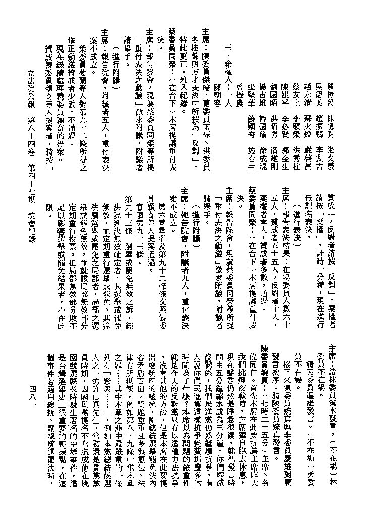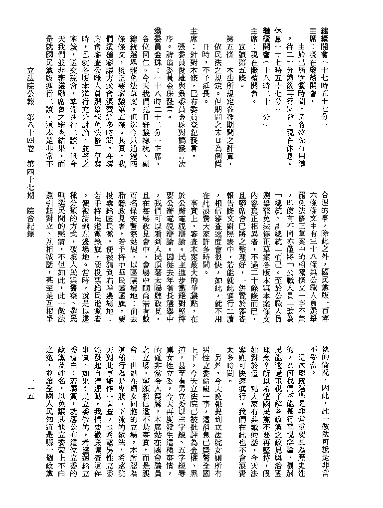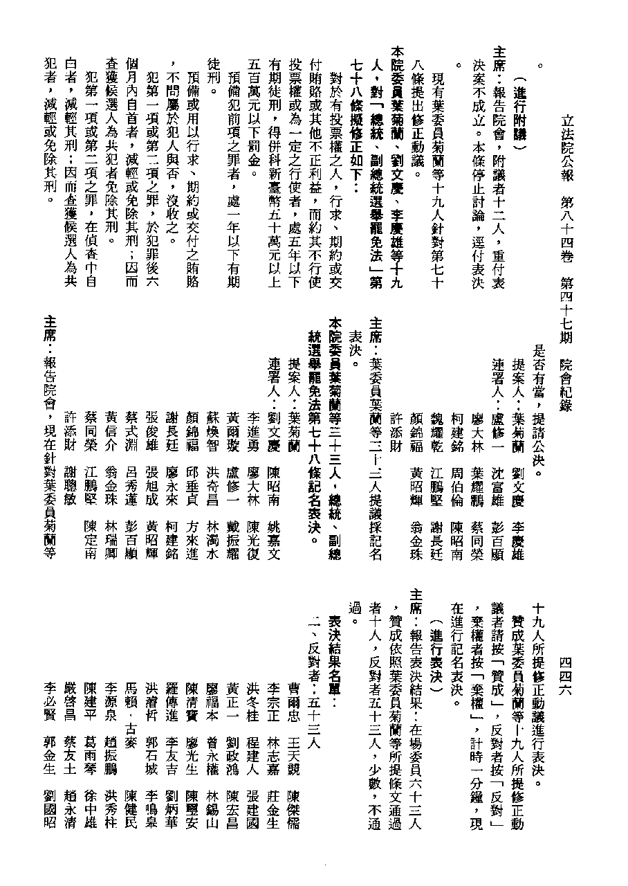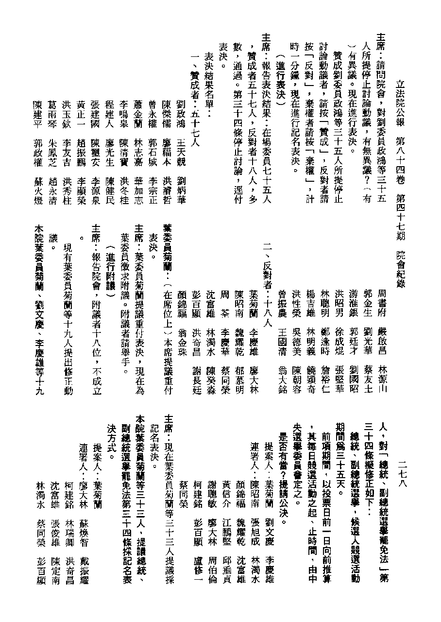 1.本案第2條以下條文,立法院第2屆第5會期第38次會議進行審議,第38次院會共包括民國84年7月14日下午、7月17日、7月18日、7月19日及7月20日上午等5個會議日。 2.由於民進黨團採取焦土策略,會議主席堅持依據議事規則逐條處理,拒絕包裹表決。因此本案第2條以下各條文的進行,按議事規則作同一模式的處理,在宣讀條文後由1位或2位委員發言,國民黨團委員即提出停止討論逕付表決之動議,停止討論動議經表決通過,該條文停止討論提付表決,此時民進黨團委員提出書面修正動議,其修正動議如獲多數支持,即照其修正動議通過,如其修正動議少數不通過,即將饒委員提案條文提付表決通過。 3.本件立法院公報紀錄第84卷,記載第38次會議5個會議日逐條討論表決之經過(第47期第87頁至第523頁)。