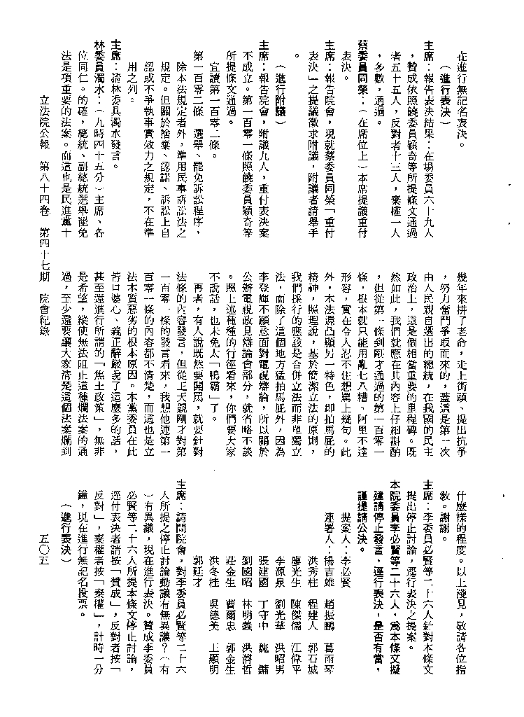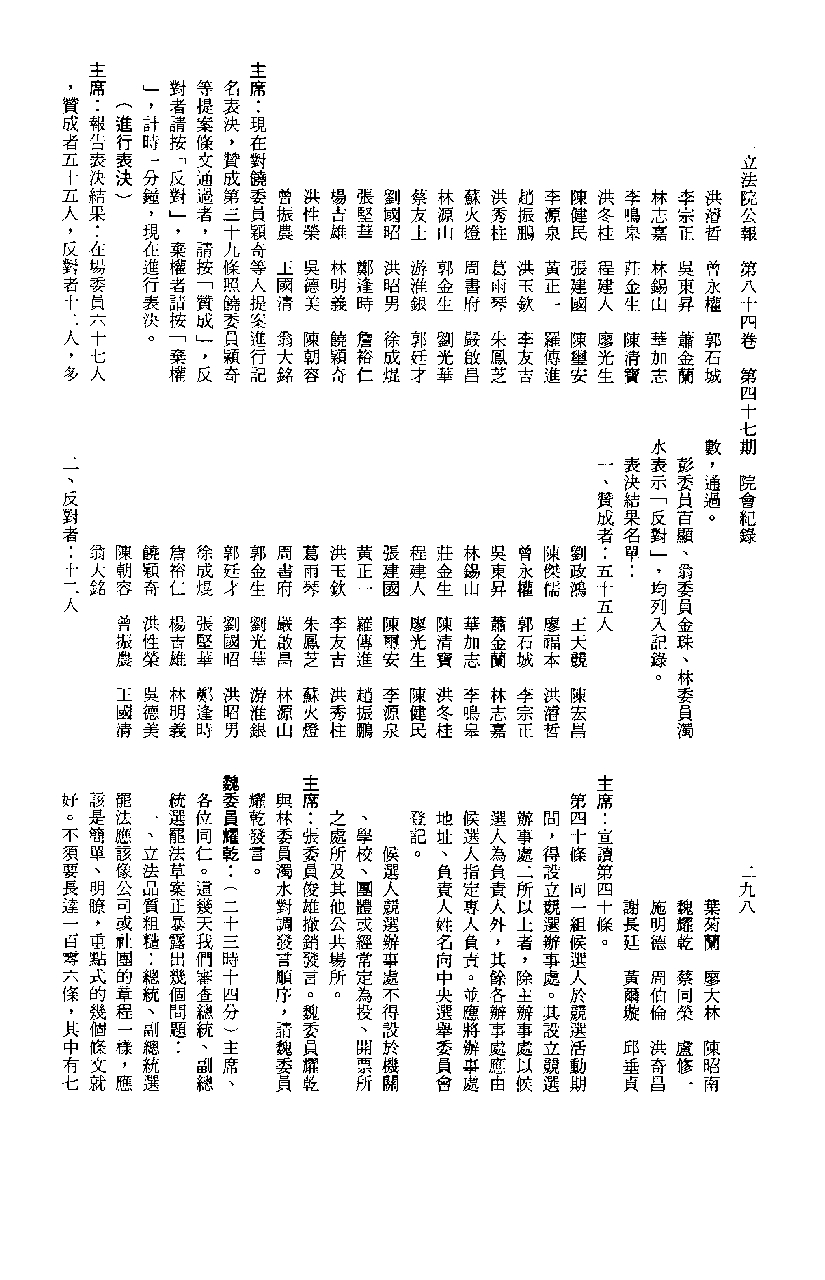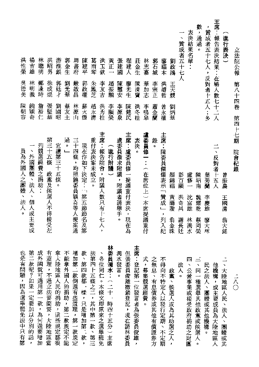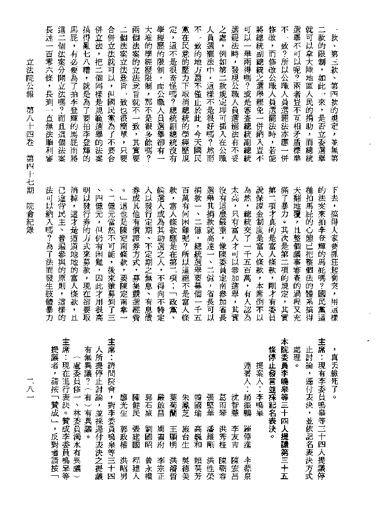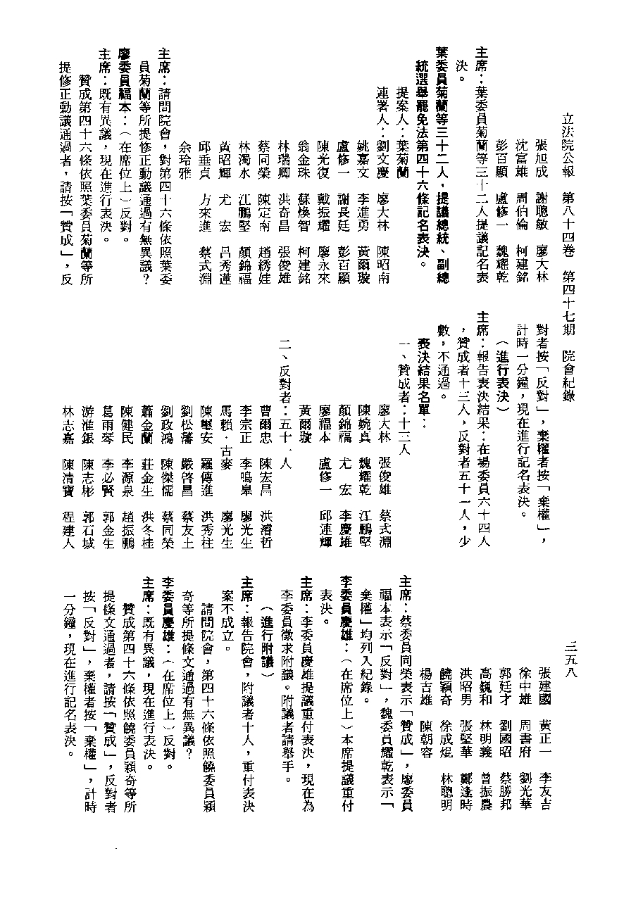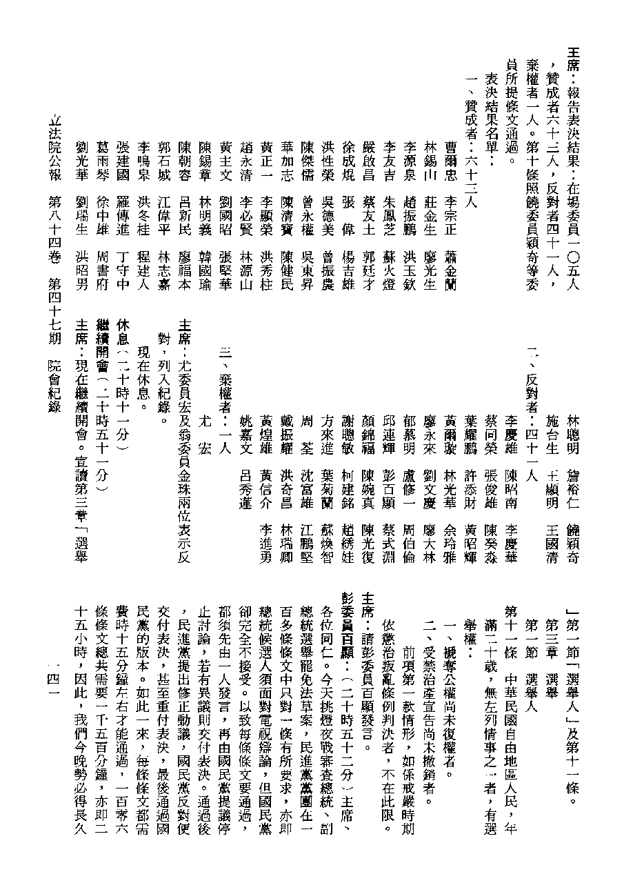 1.本案第2條以下條文,立法院第2屆第5會期第38次會議進行審議,第38次院會共包括民國84年7月14日下午、7月17日、7月18日、7月19日及7月20日上午等5個會議日。 2.由於民進黨團採取焦土策略,會議主席堅持依據議事規則逐條處理,拒絕包裹表決。因此本案第2條以下各條文的進行,按議事規則作同一模式的處理,在宣讀條文後由1位或2位委員發言,國民黨團委員即提出停止討論逕付表決之動議,停止討論動議經表決通過,該條文停止討論提付表決,此時民進黨團委員提出書面修正動議,其修正動議如獲多數支持,即照其修正動議通過,如其修正動議少數不通過,即將饒委員提案條文提付表決通過。 3.本件立法院公報紀錄第84卷,記載第38次會議5個會議日逐條討論表決之經過(第47期第87頁至第523頁)。
