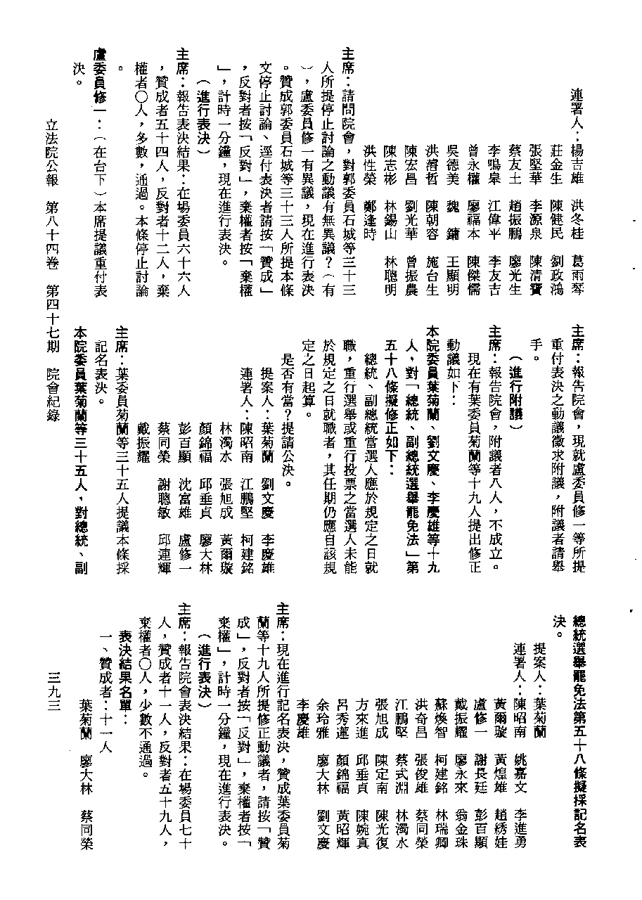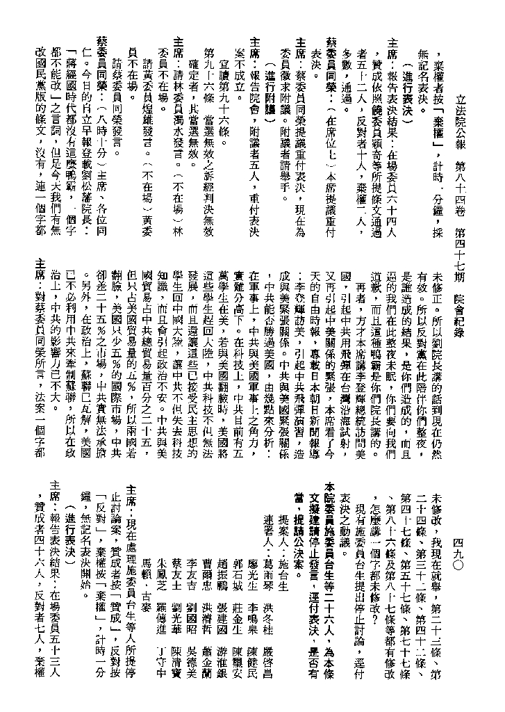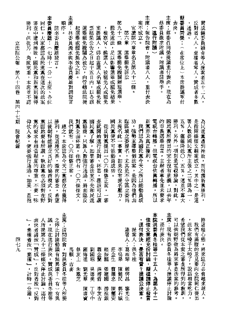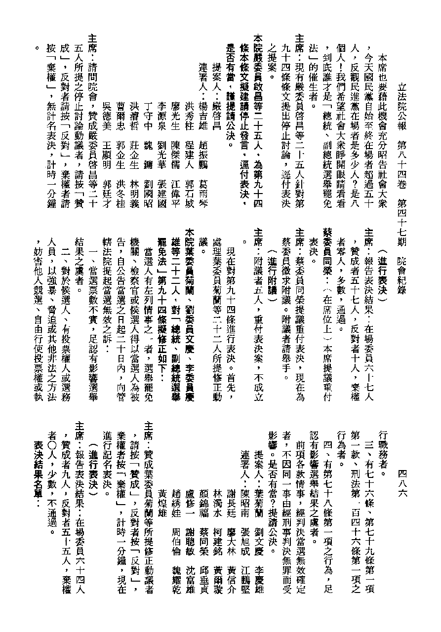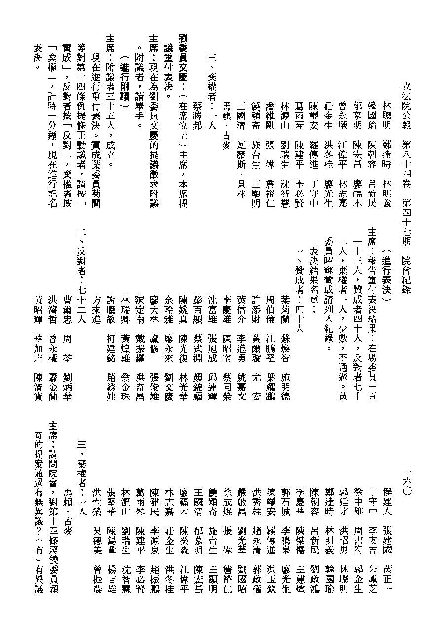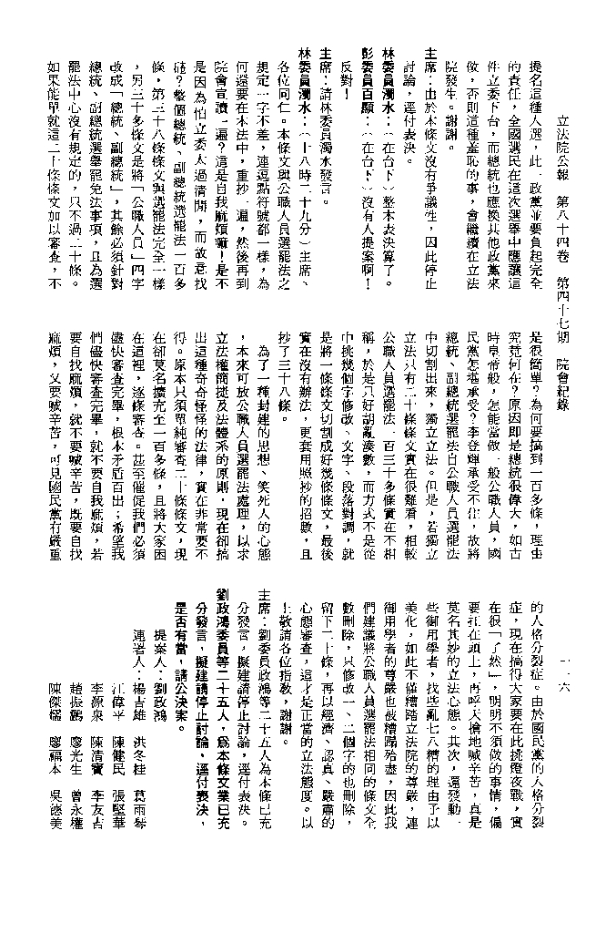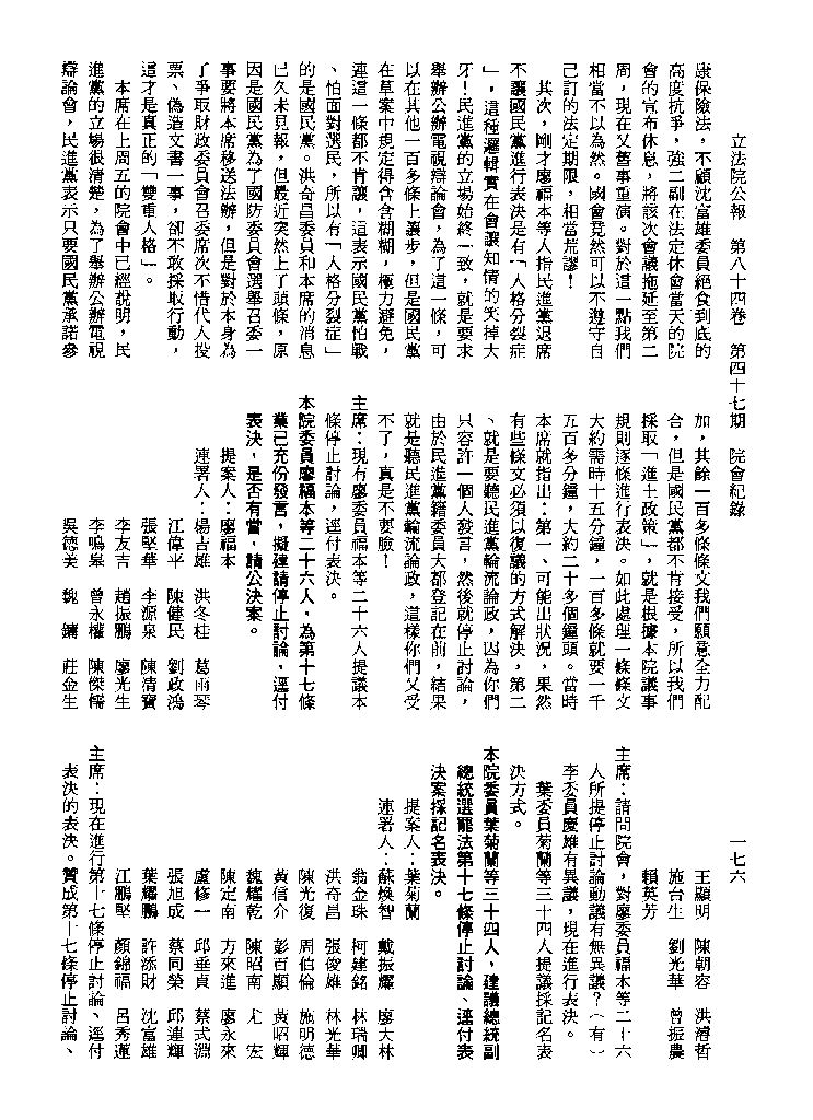 1.本案第2條以下條文,立法院第2屆第5會期第38次會議進行審議,第38次院會共包括民國84年7月14日下午、7月17日、7月18日、7月19日及7月20日上午等5個會議日。 2.由於民進黨團採取焦土策略,會議主席堅持依據議事規則逐條處理,拒絕包裹表決。因此本案第2條以下各條文的進行,按議事規則作同一模式的處理,在宣讀條文後由1位或2位委員發言,國民黨團委員即提出停止討論逕付表決之動議,停止討論動議經表決通過,該條文停止討論提付表決,此時民進黨團委員提出書面修正動議,其修正動議如獲多數支持,即照其修正動議通過,如其修正動議少數不通過,即將饒委員提案條文提付表決通過。 3.本件立法院公報紀錄第84卷,記載第38次會議5個會議日逐條討論表決之經過(第47期第87頁至第523頁)。