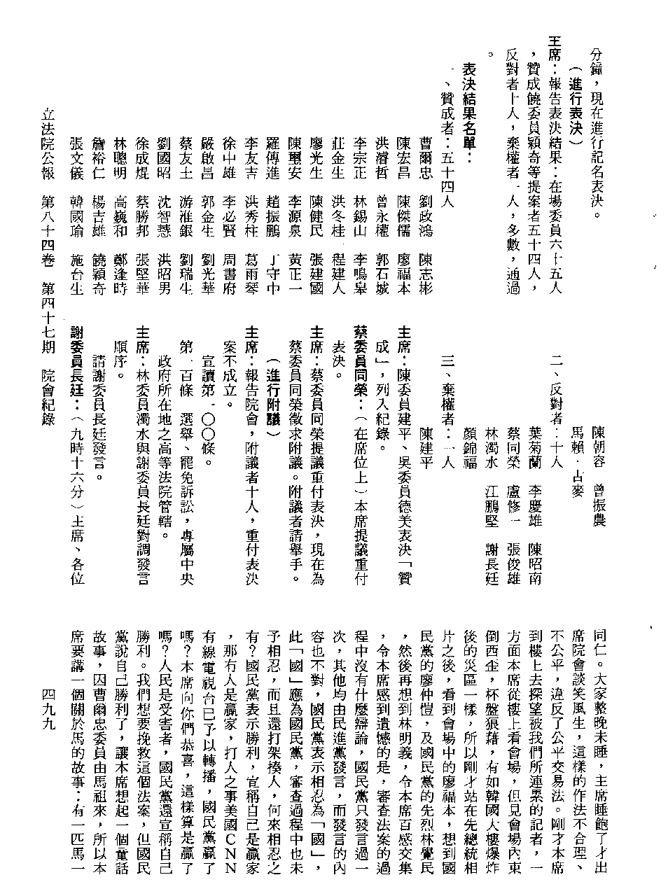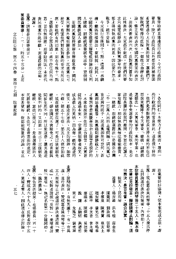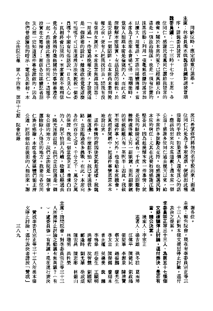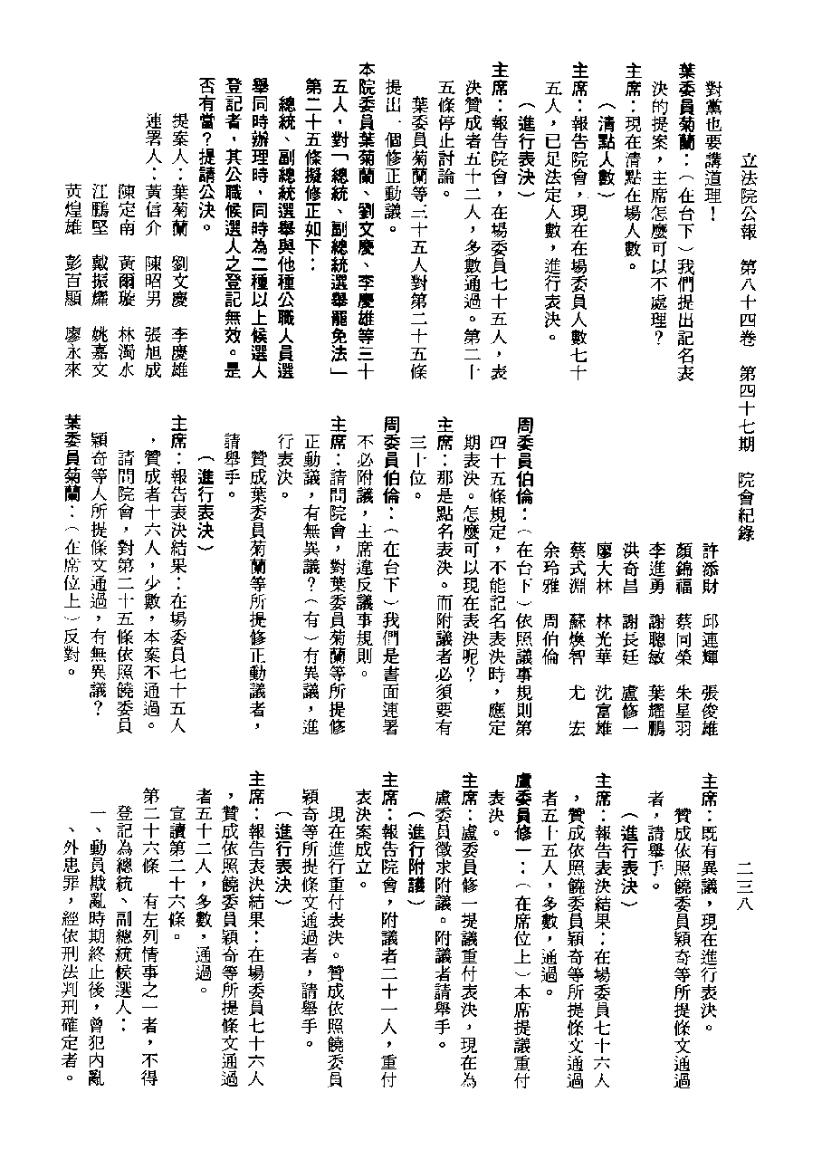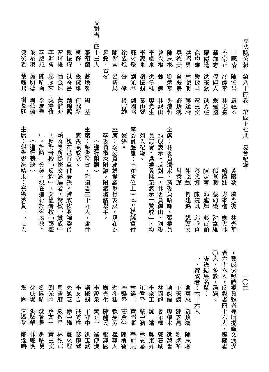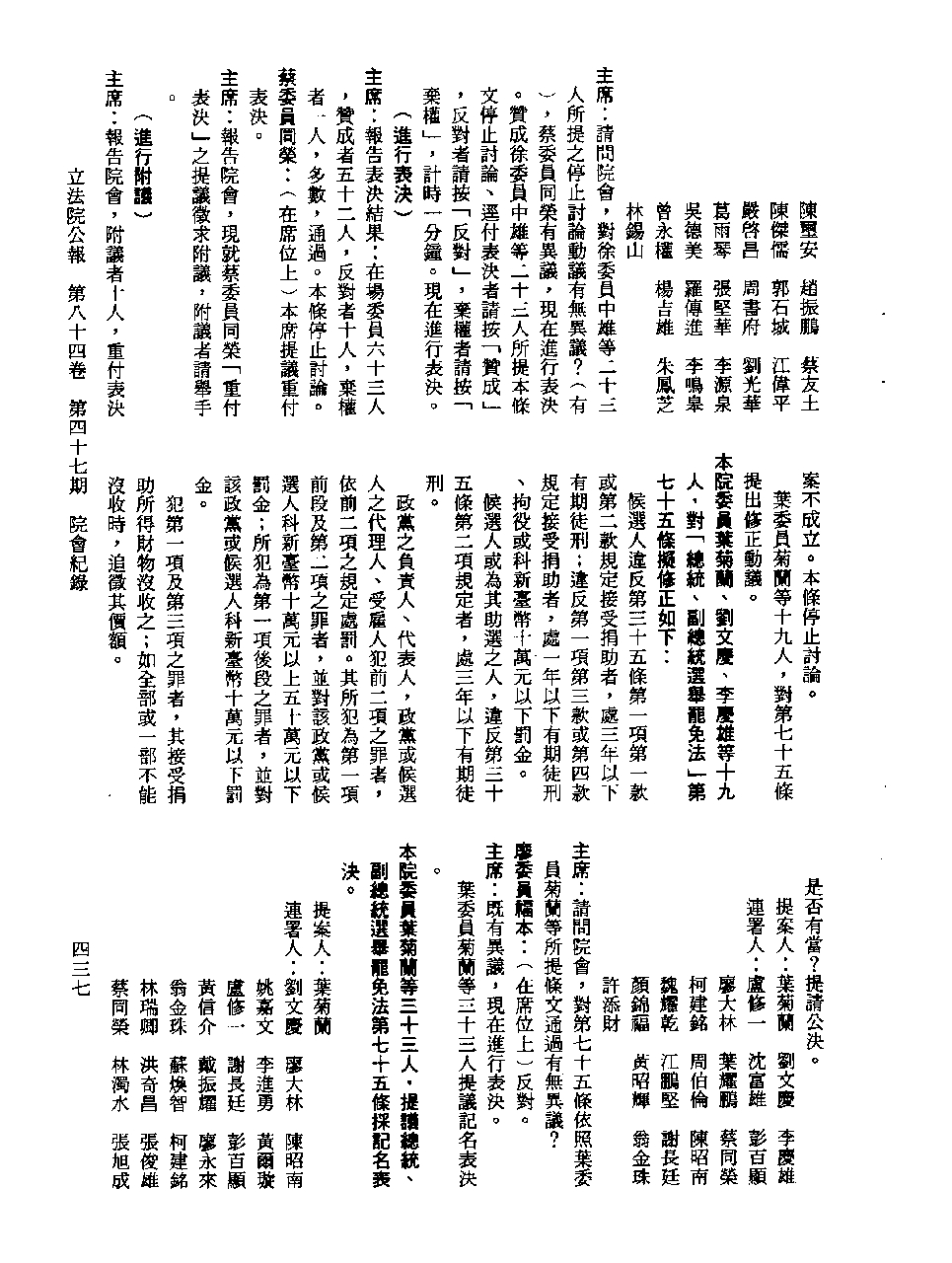 1.本案第2條以下條文,立法院第2屆第5會期第38次會議進行審議,第38次院會共包括民國84年7月14日下午、7月17日、7月18日、7月19日及7月20日上午等5個會議日。 2.由於民進黨團採取焦土策略,會議主席堅持依據議事規則逐條處理,拒絕包裹表決。因此本案第2條以下各條文的進行,按議事規則作同一模式的處理,在宣讀條文後由1位或2位委員發言,國民黨團委員即提出停止討論逕付表決之動議,停止討論動議經表決通過,該條文停止討論提付表決,此時民進黨團委員提出書面修正動議,其修正動議如獲多數支持,即照其修正動議通過,如其修正動議少數不通過,即將饒委員提案條文提付表決通過。 3.本件立法院公報紀錄第84卷,記載第38次會議5個會議日逐條討論表決之經過(第47期第87頁至第523頁)。