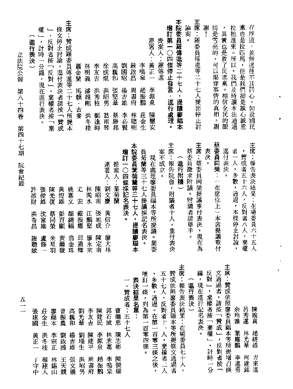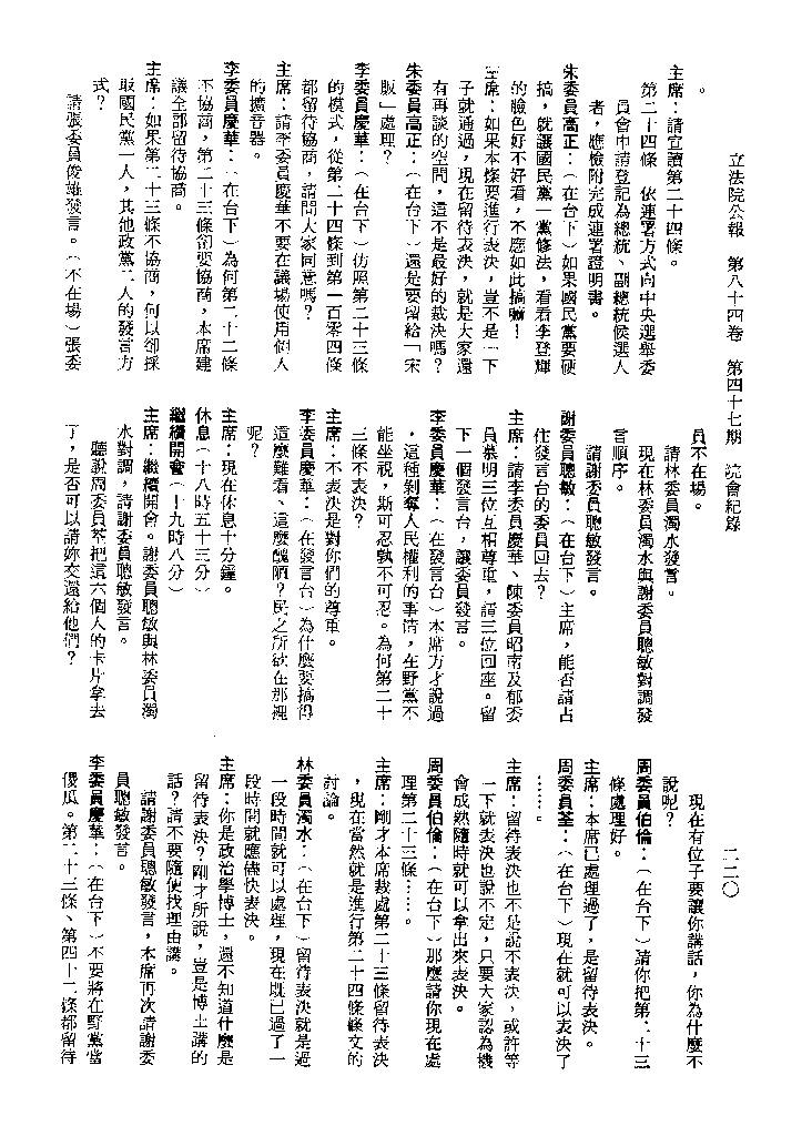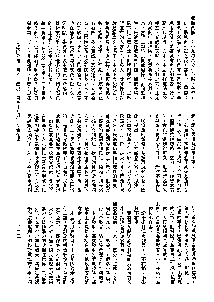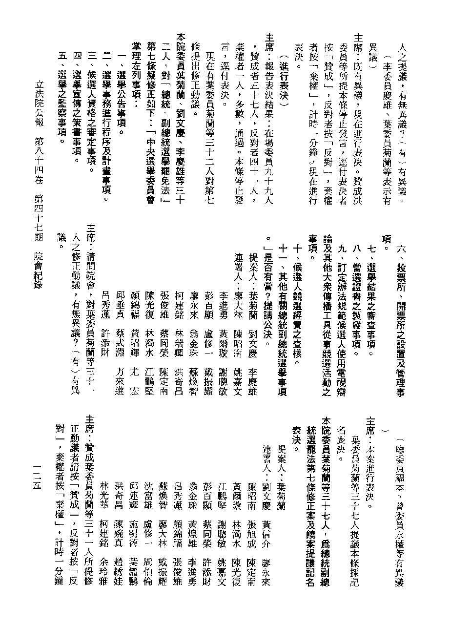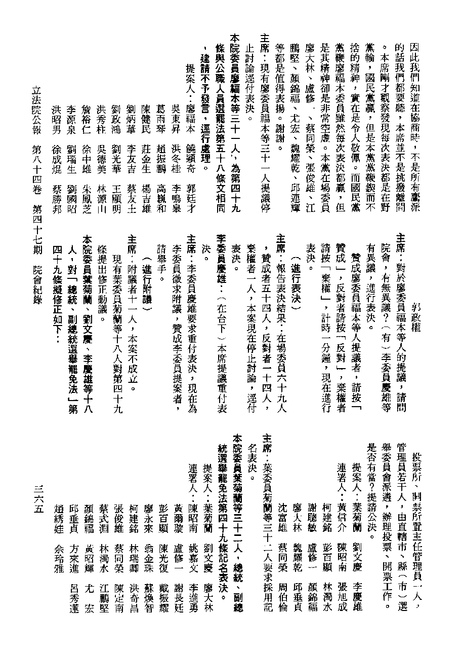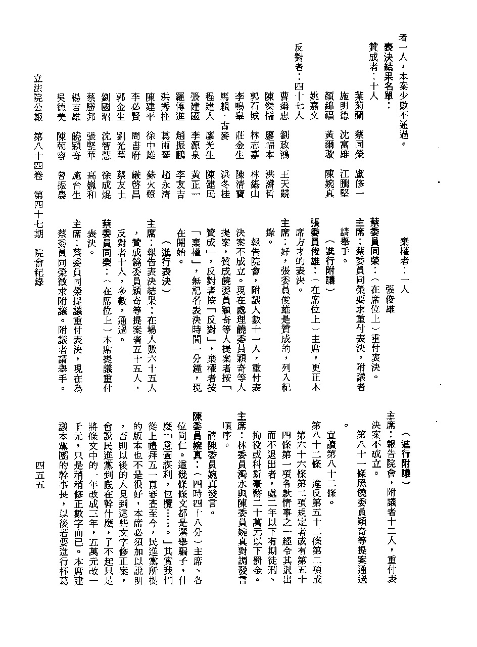 1.本案第2條以下條文,立法院第2屆第5會期第38次會議進行審議,第38次院會共包括民國84年7月14日下午、7月17日、7月18日、7月19日及7月20日上午等5個會議日。 2.由於民進黨團採取焦土策略,會議主席堅持依據議事規則逐條處理,拒絕包裹表決。因此本案第2條以下各條文的進行,按議事規則作同一模式的處理,在宣讀條文後由1位或2位委員發言,國民黨團委員即提出停止討論逕付表決之動議,停止討論動議經表決通過,該條文停止討論提付表決,此時民進黨團委員提出書面修正動議,其修正動議如獲多數支持,即照其修正動議通過,如其修正動議少數不通過,即將饒委員提案條文提付表決通過。 3.本件立法院公報紀錄第84卷,記載第38次會議5個會議日逐條討論表決之經過(第47期第87頁至第523頁)。