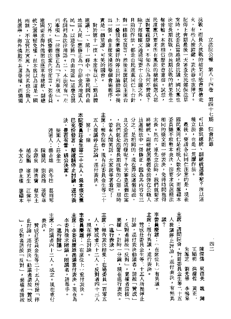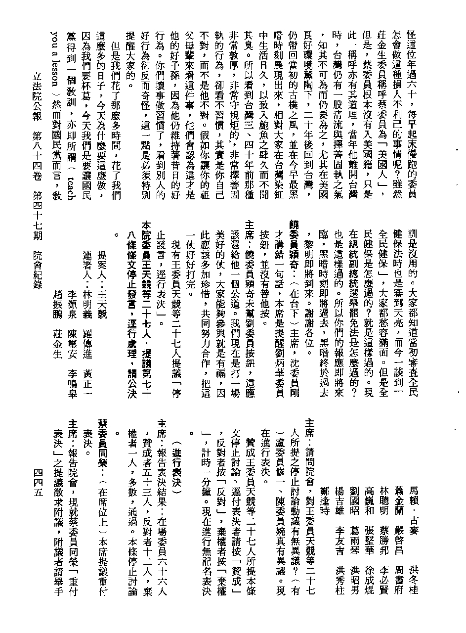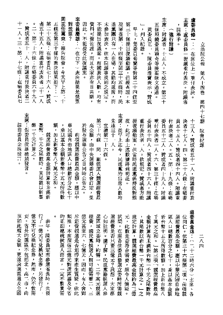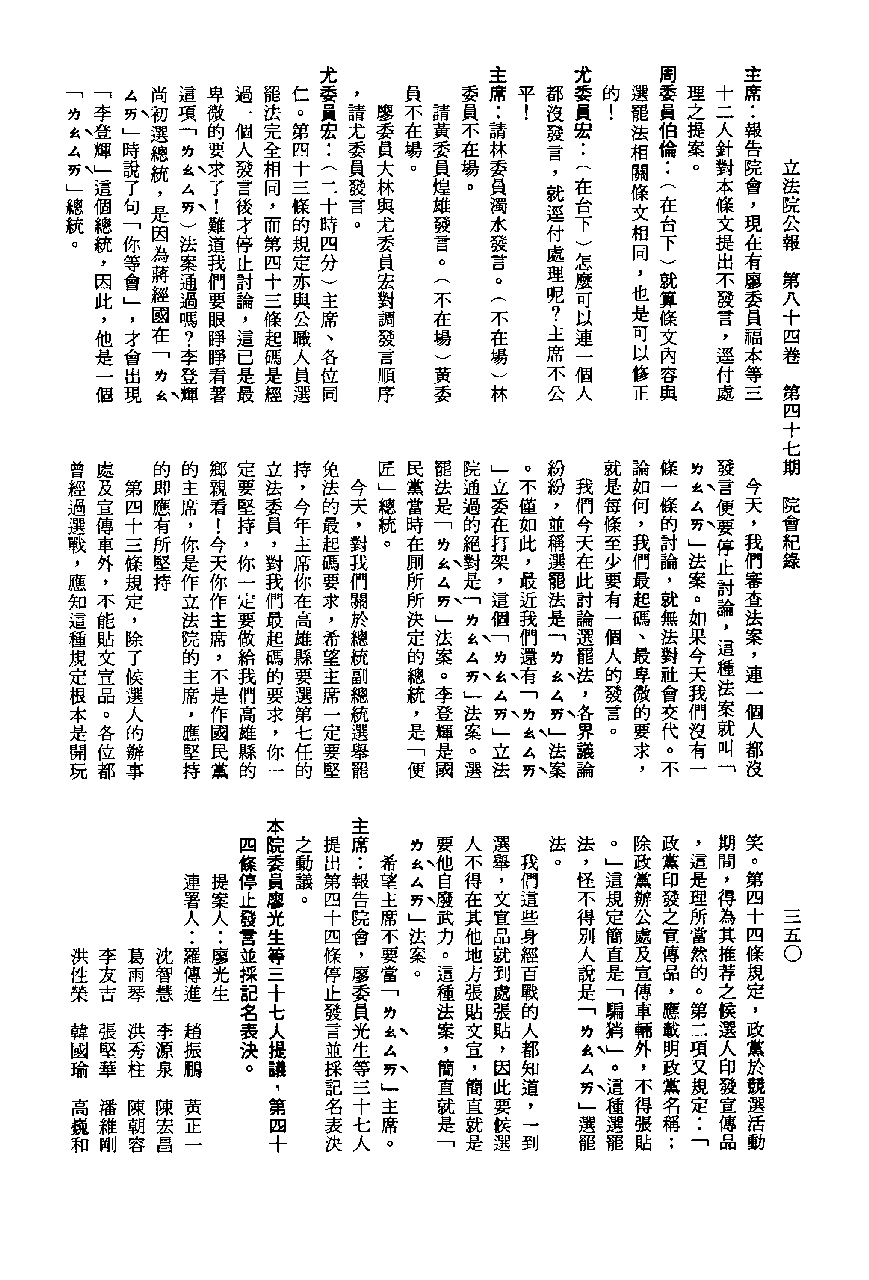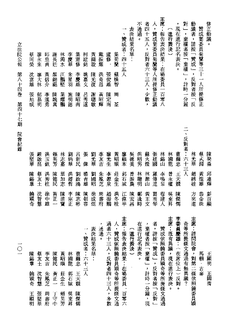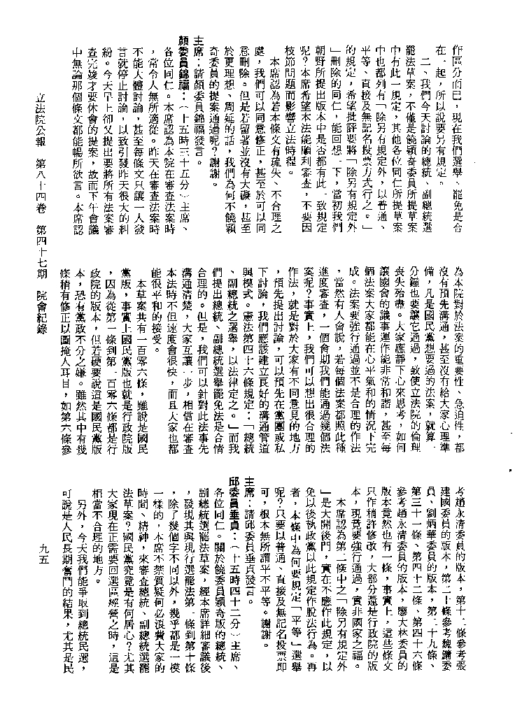 1.本案第2條以下條文,立法院第2屆第5會期第38次會議進行審議,第38次院會共包括民國84年7月14日下午、7月17日、7月18日、7月19日及7月20日上午等5個會議日。 2.由於民進黨團採取焦土策略,會議主席堅持依據議事規則逐條處理,拒絕包裹表決。因此本案第2條以下各條文的進行,按議事規則作同一模式的處理,在宣讀條文後由1位或2位委員發言,國民黨團委員即提出停止討論逕付表決之動議,停止討論動議經表決通過,該條文停止討論提付表決,此時民進黨團委員提出書面修正動議,其修正動議如獲多數支持,即照其修正動議通過,如其修正動議少數不通過,即將饒委員提案條文提付表決通過。 3.本件立法院公報紀錄第84卷,記載第38次會議5個會議日逐條討論表決之經過(第47期第87頁至第523頁)。