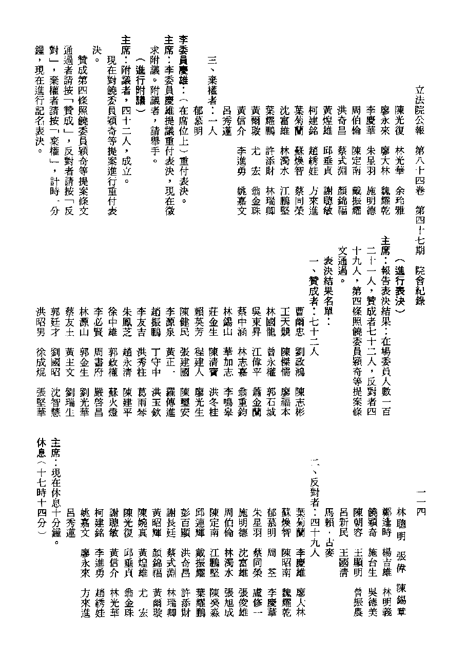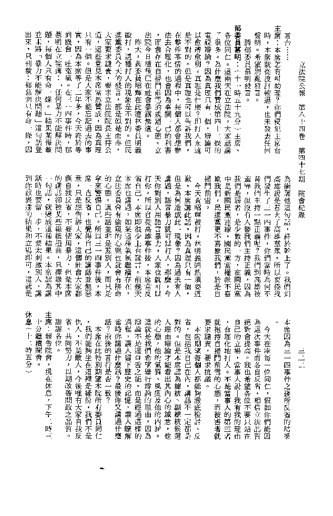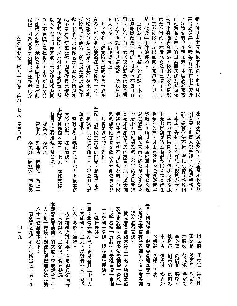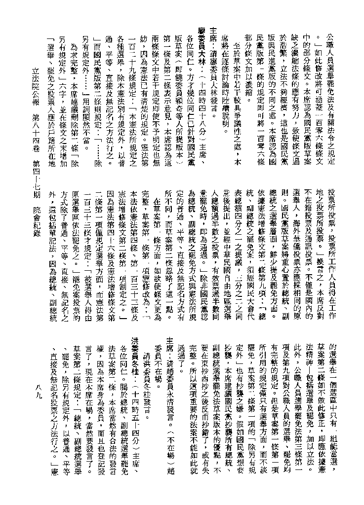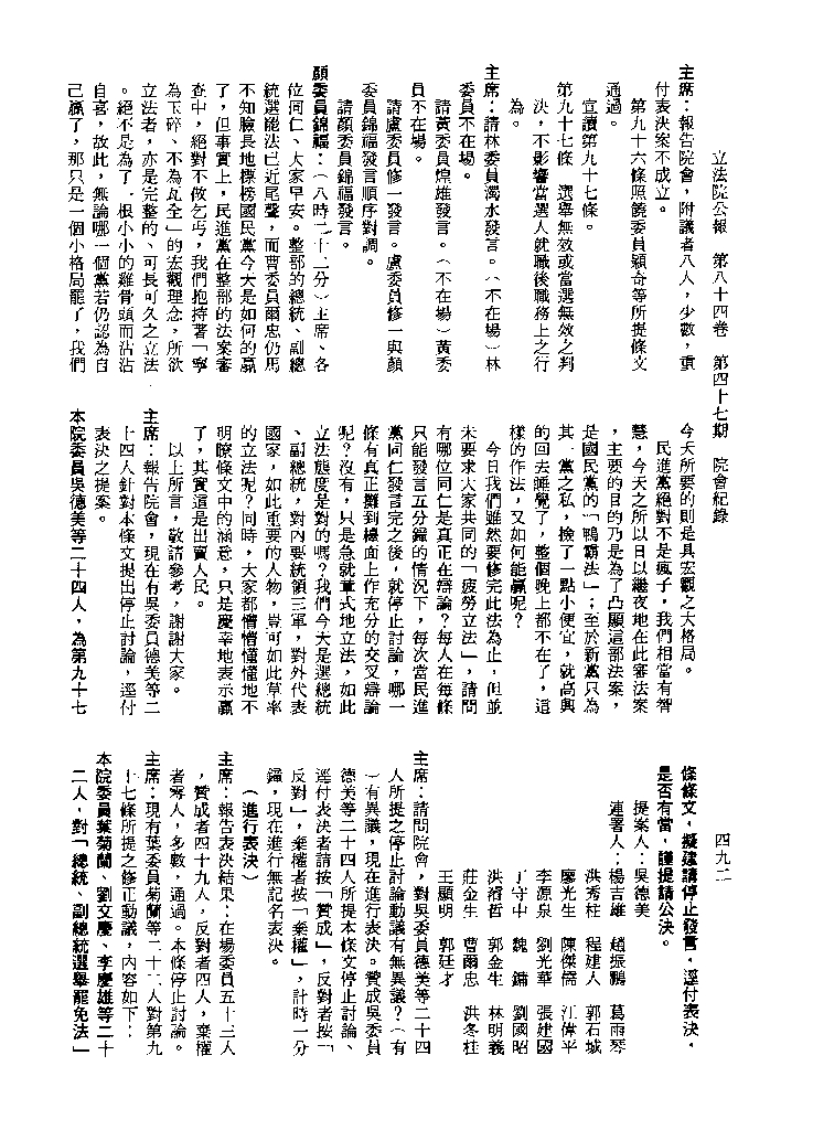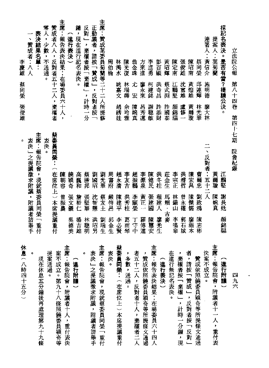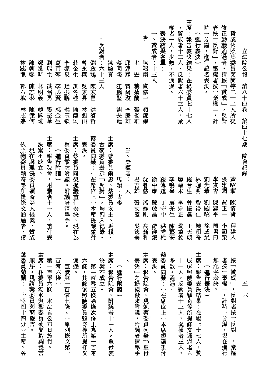 1.本案第2條以下條文,立法院第2屆第5會期第38次會議進行審議,第38次院會共包括民國84年7月14日下午、7月17日、7月18日、7月19日及7月20日上午等5個會議日。 2.由於民進黨團採取焦土策略,會議主席堅持依據議事規則逐條處理,拒絕包裹表決。因此本案第2條以下各條文的進行,按議事規則作同一模式的處理,在宣讀條文後由1位或2位委員發言,國民黨團委員即提出停止討論逕付表決之動議,停止討論動議經表決通過,該條文停止討論提付表決,此時民進黨團委員提出書面修正動議,其修正動議如獲多數支持,即照其修正動議通過,如其修正動議少數不通過,即將饒委員提案條文提付表決通過。 3.本件立法院公報紀錄第84卷,記載第38次會議5個會議日逐條討論表決之經過(第47期第87頁至第523頁)。