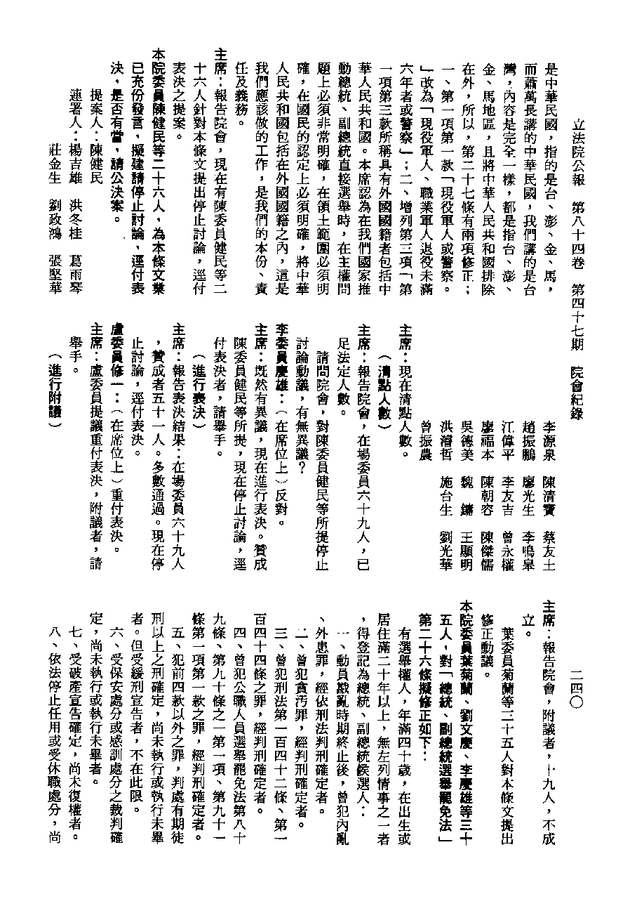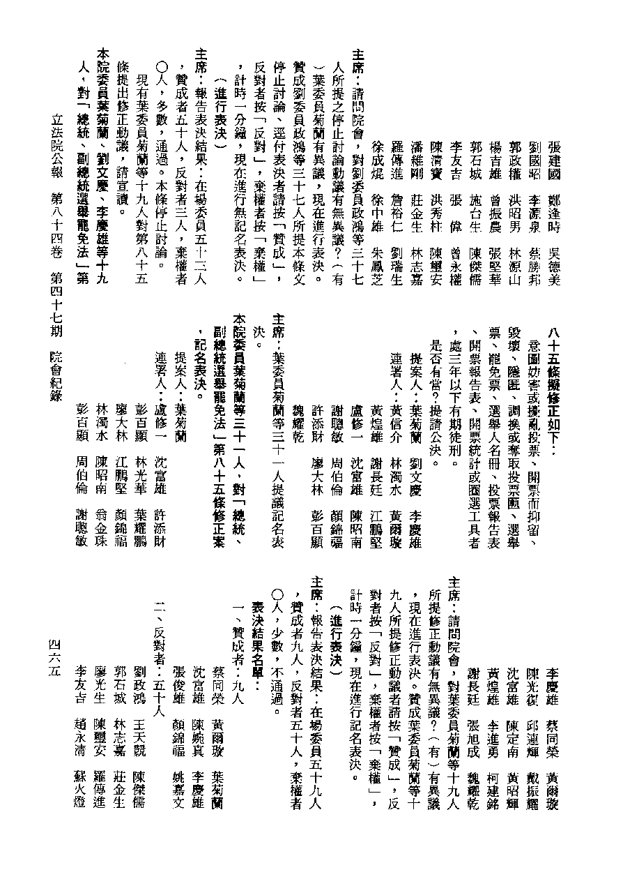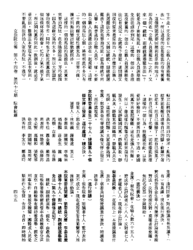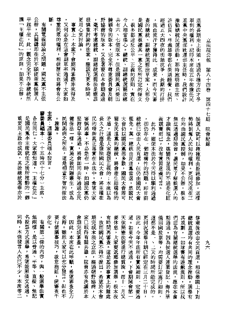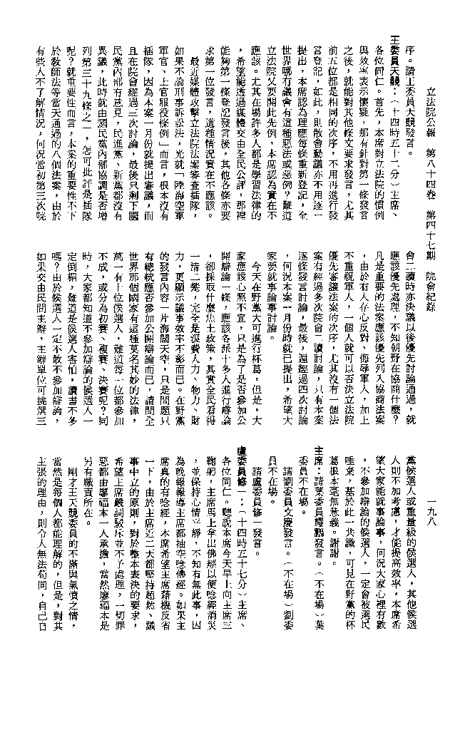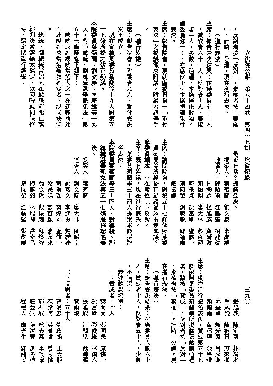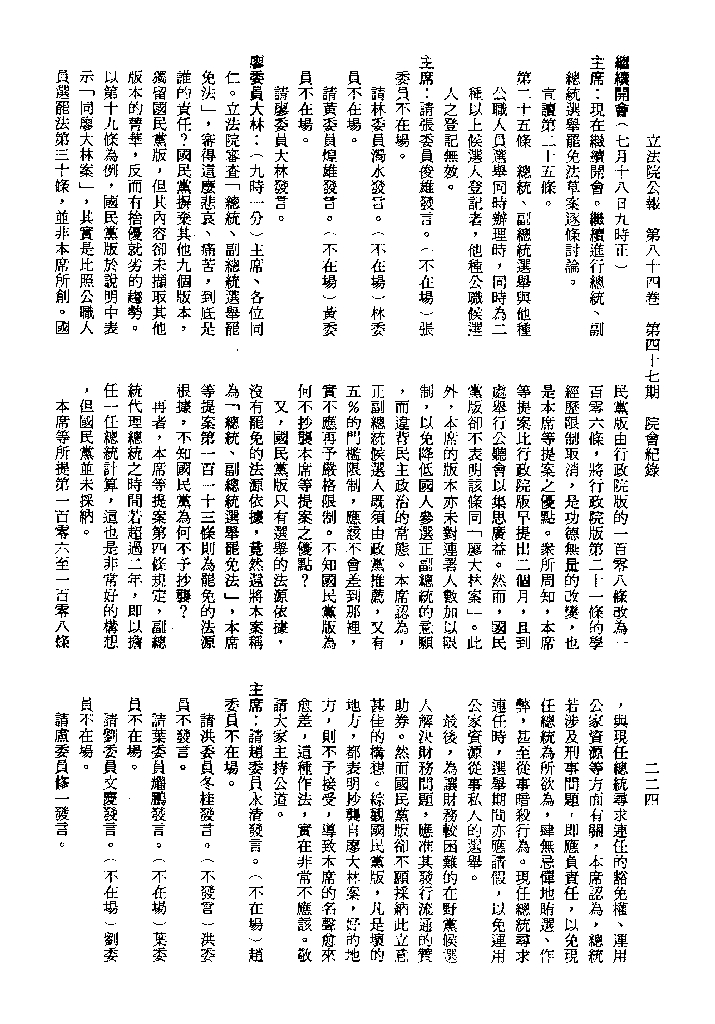 1.本案第2條以下條文,立法院第2屆第5會期第38次會議進行審議,第38次院會共包括民國84年7月14日下午、7月17日、7月18日、7月19日及7月20日上午等5個會議日。 2.由於民進黨團採取焦土策略,會議主席堅持依據議事規則逐條處理,拒絕包裹表決。因此本案第2條以下各條文的進行,按議事規則作同一模式的處理,在宣讀條文後由1位或2位委員發言,國民黨團委員即提出停止討論逕付表決之動議,停止討論動議經表決通過,該條文停止討論提付表決,此時民進黨團委員提出書面修正動議,其修正動議如獲多數支持,即照其修正動議通過,如其修正動議少數不通過,即將饒委員提案條文提付表決通過。 3.本件立法院公報紀錄第84卷,記載第38次會議5個會議日逐條討論表決之經過(第47期第87頁至第523頁)。