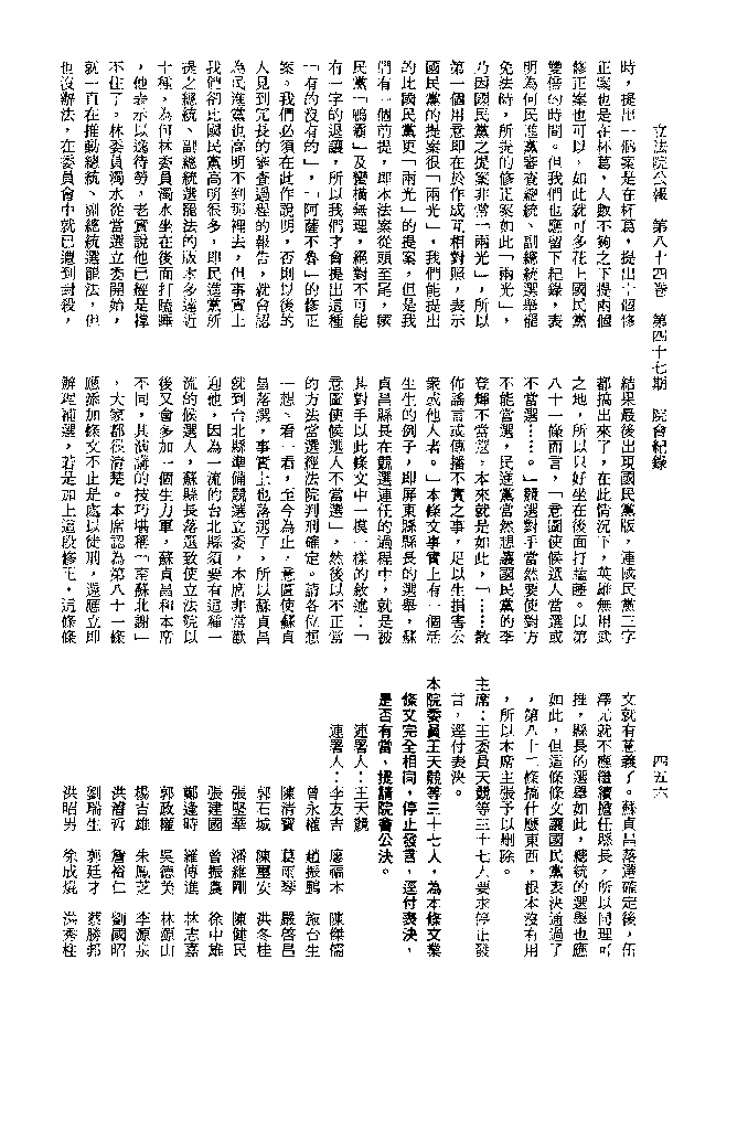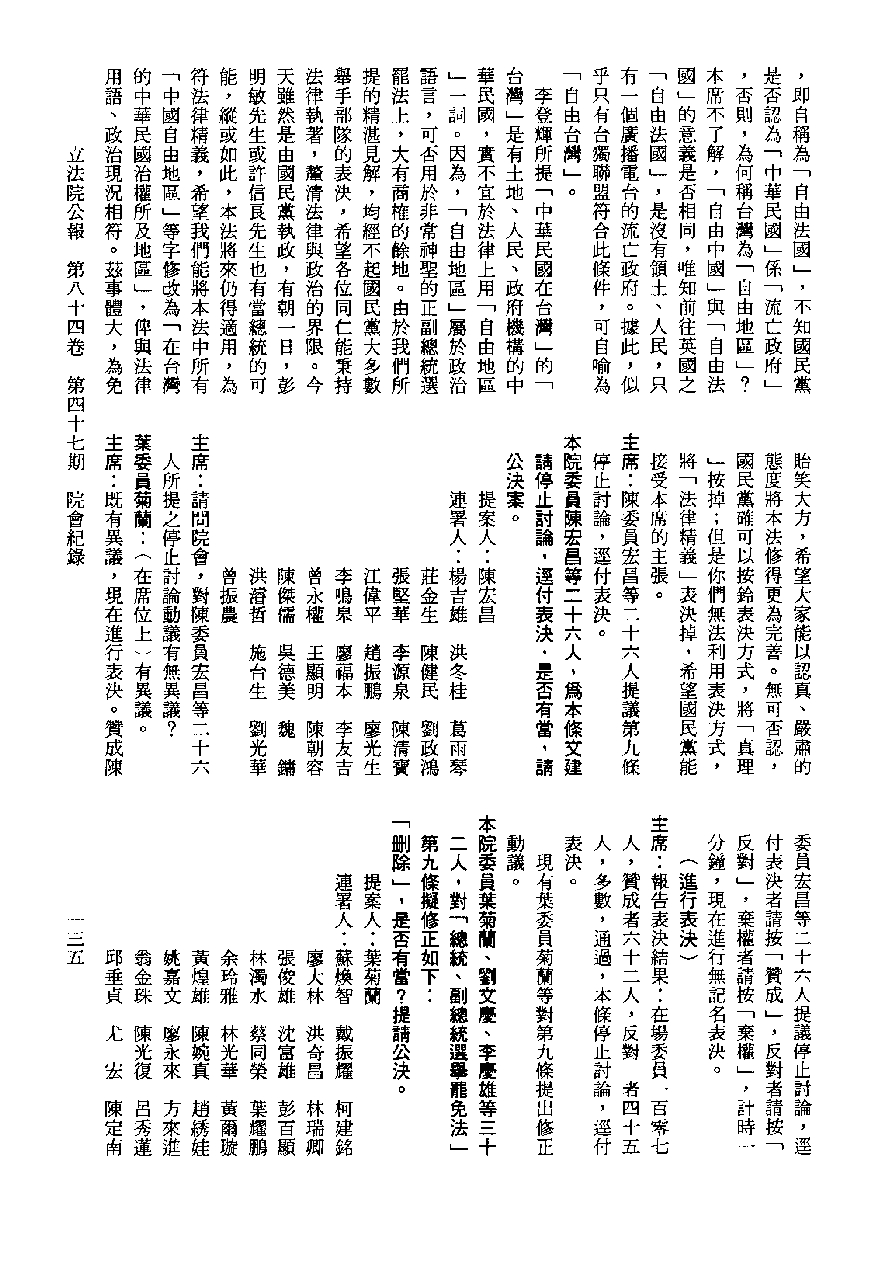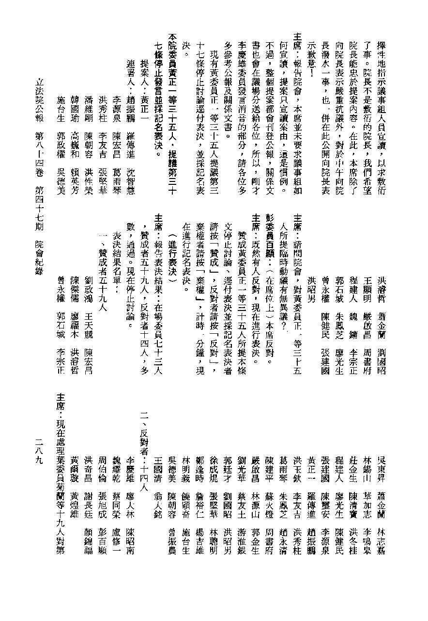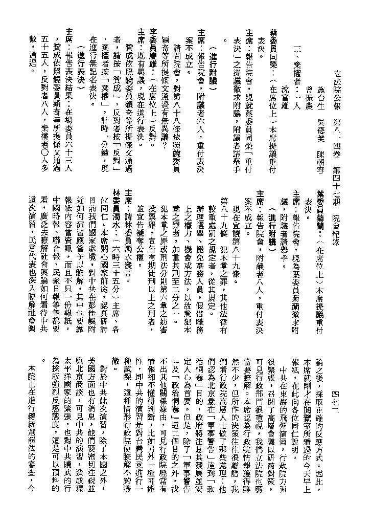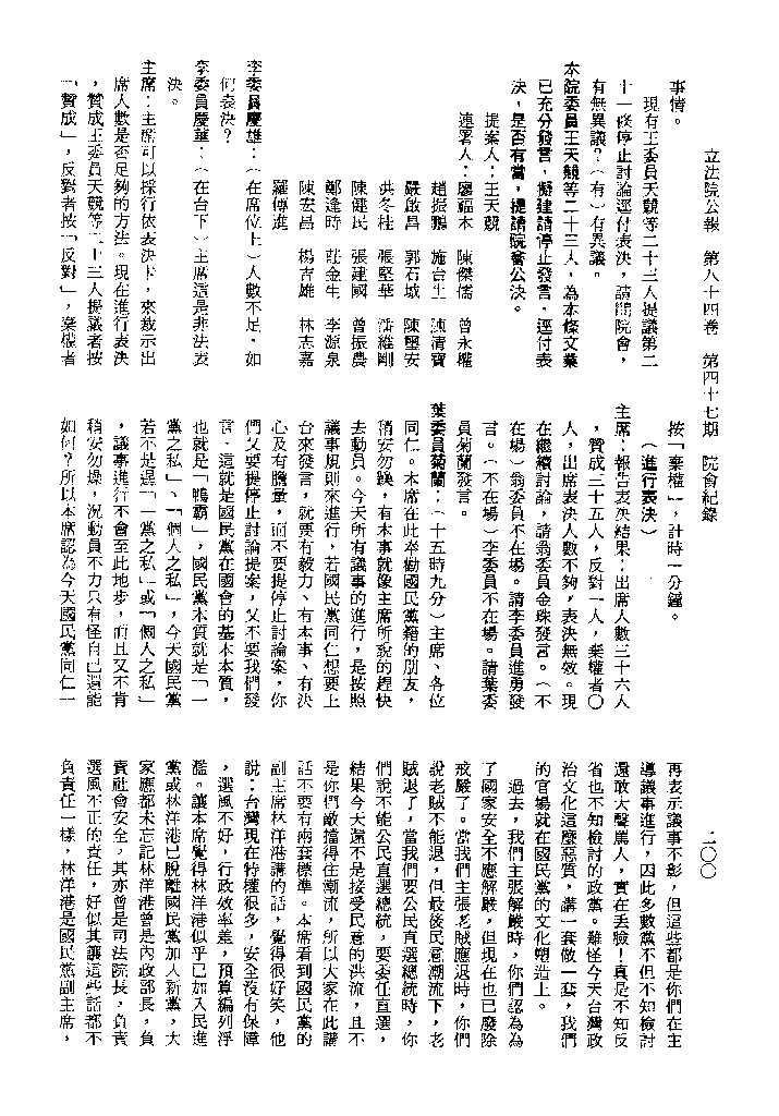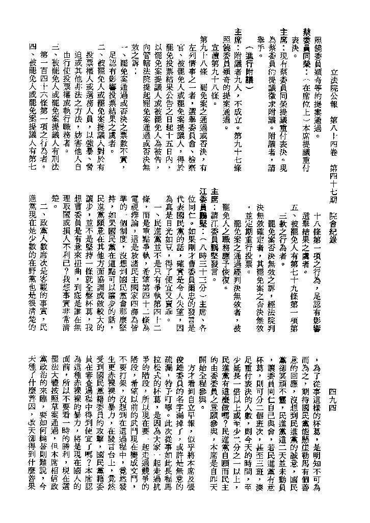 1.本案第2條以下條文,立法院第2屆第5會期第38次會議進行審議,第38次院會共包括民國84年7月14日下午、7月17日、7月18日、7月19日及7月20日上午等5個會議日。 2.由於民進黨團採取焦土策略,會議主席堅持依據議事規則逐條處理,拒絕包裹表決。因此本案第2條以下各條文的進行,按議事規則作同一模式的處理,在宣讀條文後由1位或2位委員發言,國民黨團委員即提出停止討論逕付表決之動議,停止討論動議經表決通過,該條文停止討論提付表決,此時民進黨團委員提出書面修正動議,其修正動議如獲多數支持,即照其修正動議通過,如其修正動議少數不通過,即將饒委員提案條文提付表決通過。 3.本件立法院公報紀錄第84卷,記載第38次會議5個會議日逐條討論表決之經過(第47期第87頁至第523頁)。
