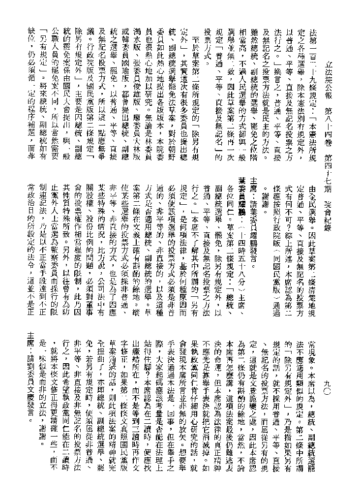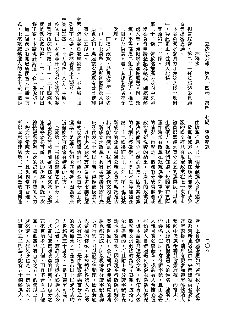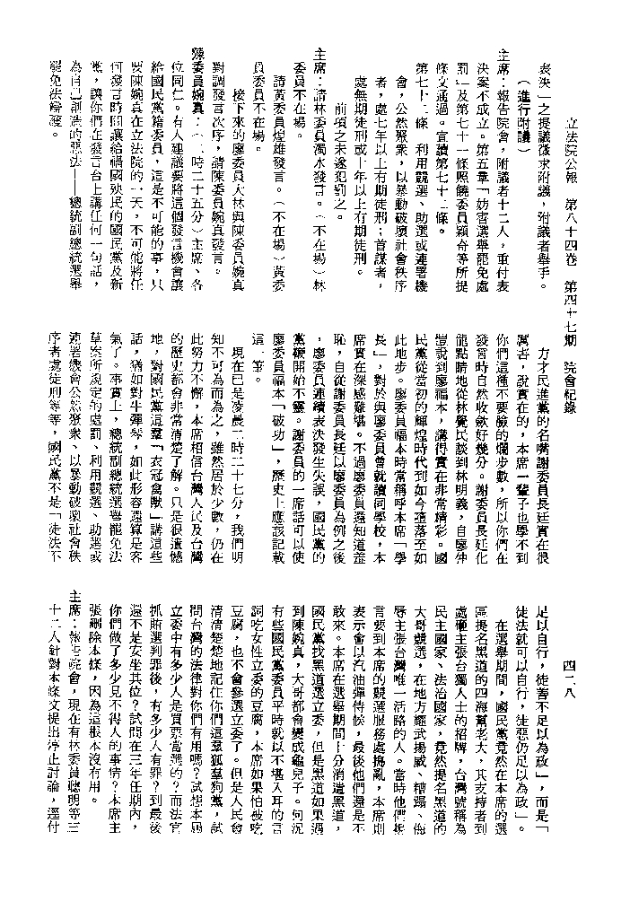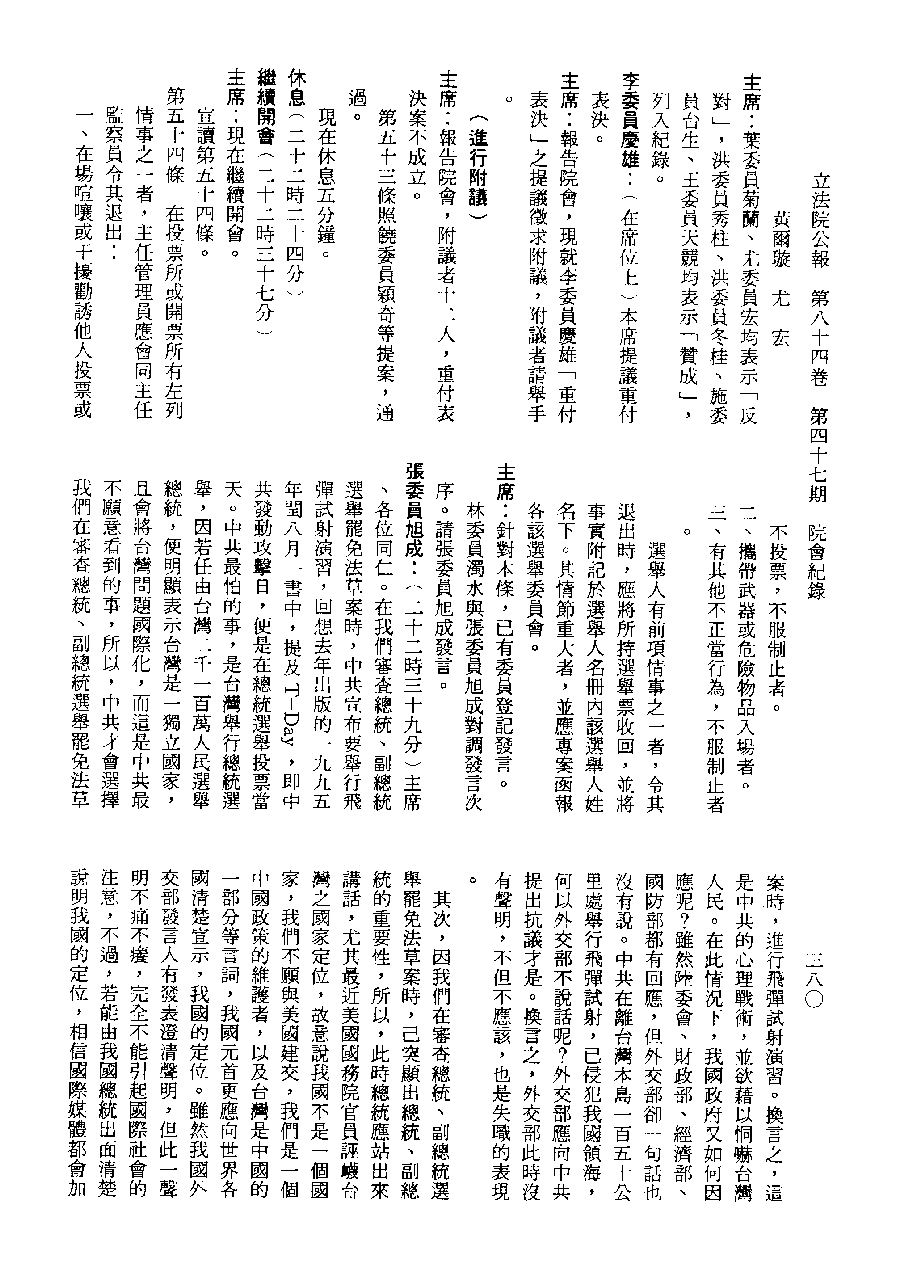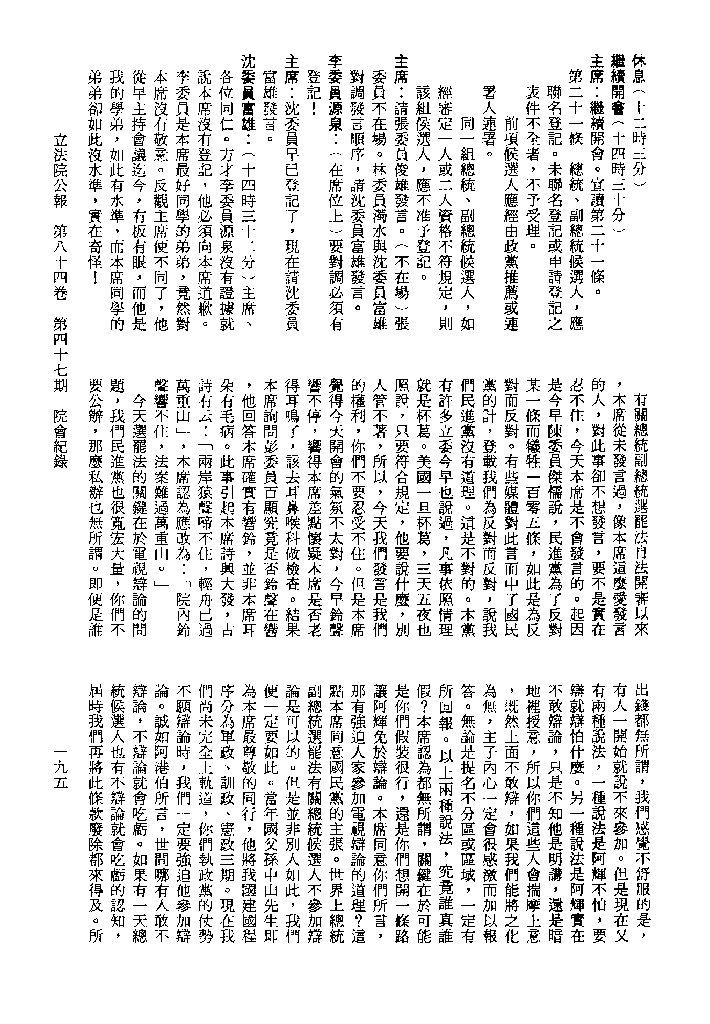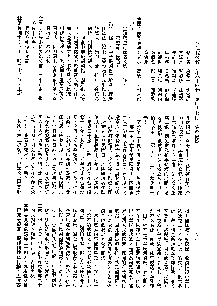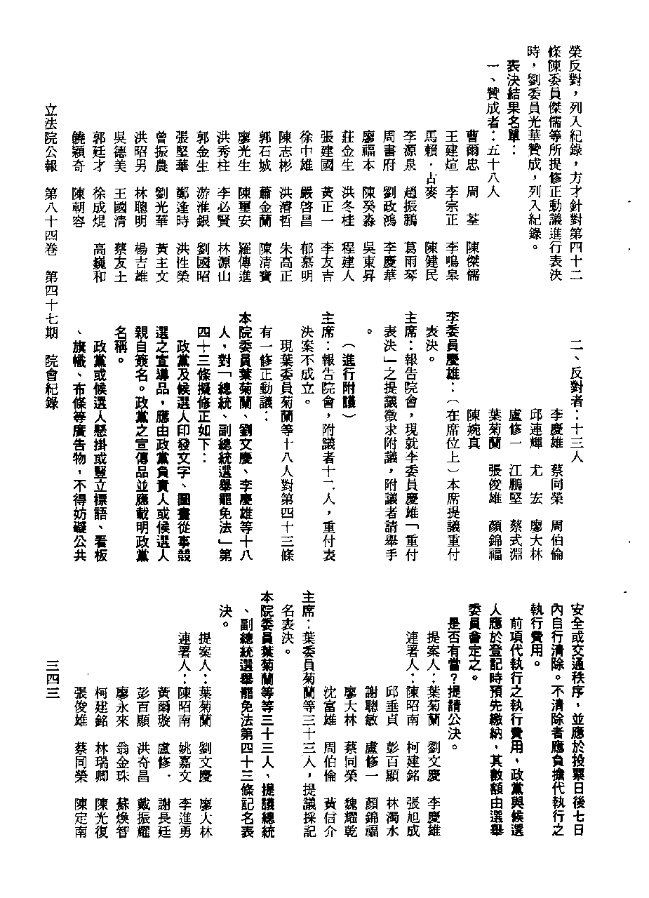 1.本案第2條以下條文,立法院第2屆第5會期第38次會議進行審議,第38次院會共包括民國84年7月14日下午、7月17日、7月18日、7月19日及7月20日上午等5個會議日。 2.由於民進黨團採取焦土策略,會議主席堅持依據議事規則逐條處理,拒絕包裹表決。因此本案第2條以下各條文的進行,按議事規則作同一模式的處理,在宣讀條文後由1位或2位委員發言,國民黨團委員即提出停止討論逕付表決之動議,停止討論動議經表決通過,該條文停止討論提付表決,此時民進黨團委員提出書面修正動議,其修正動議如獲多數支持,即照其修正動議通過,如其修正動議少數不通過,即將饒委員提案條文提付表決通過。 3.本件立法院公報紀錄第84卷,記載第38次會議5個會議日逐條討論表決之經過(第47期第87頁至第523頁)。