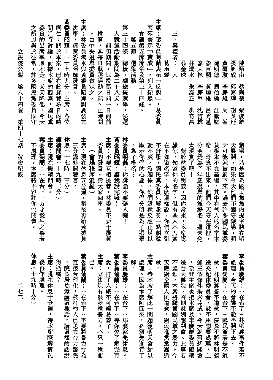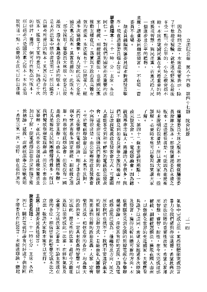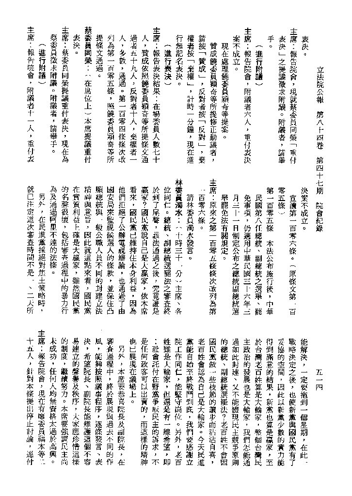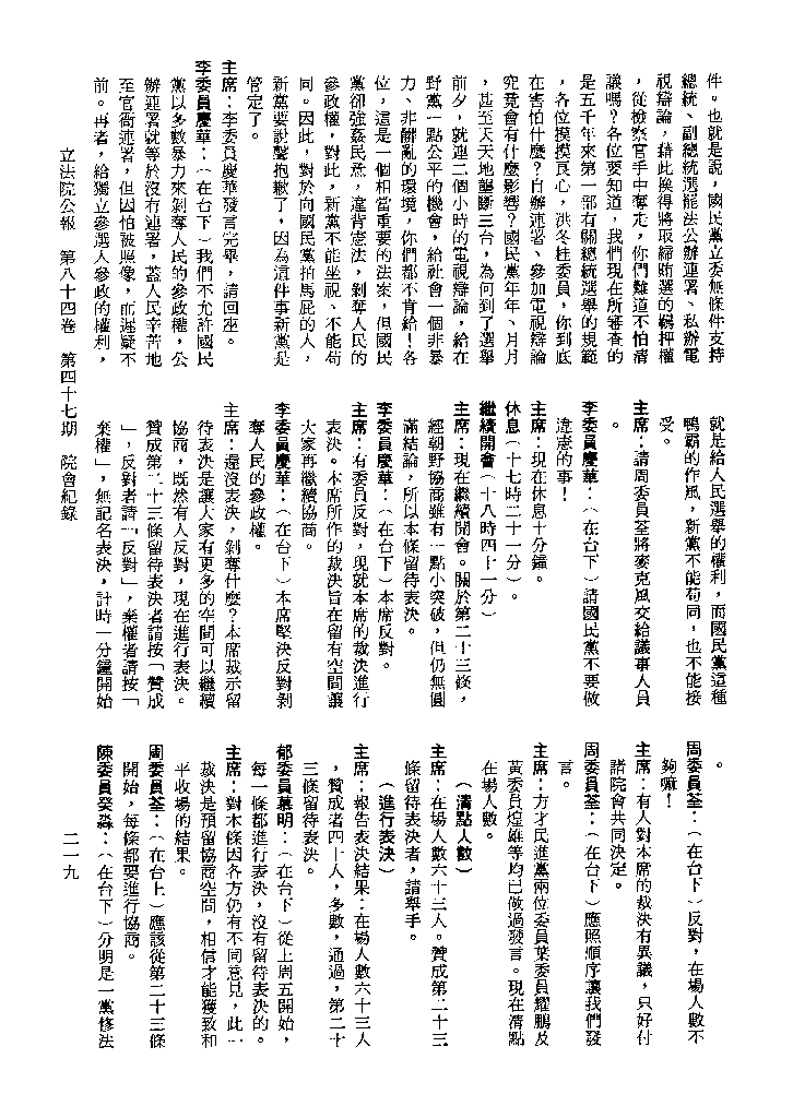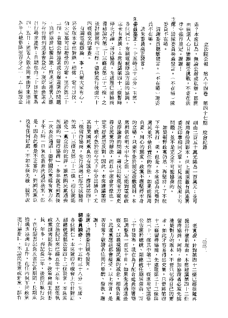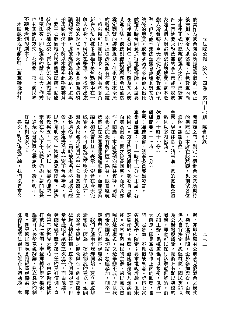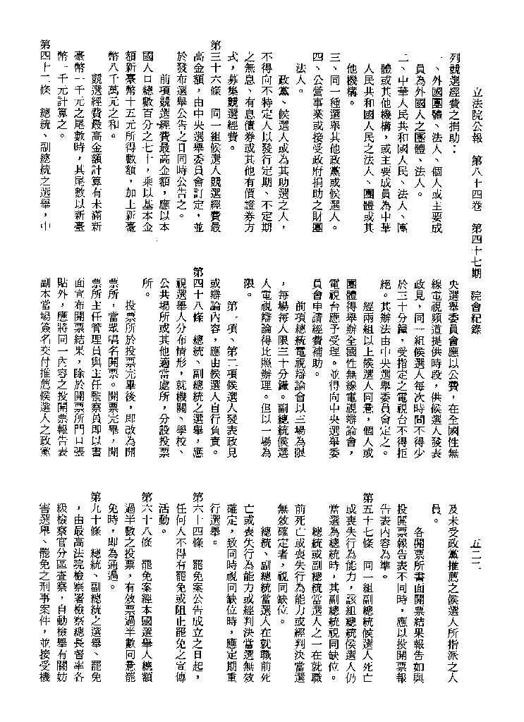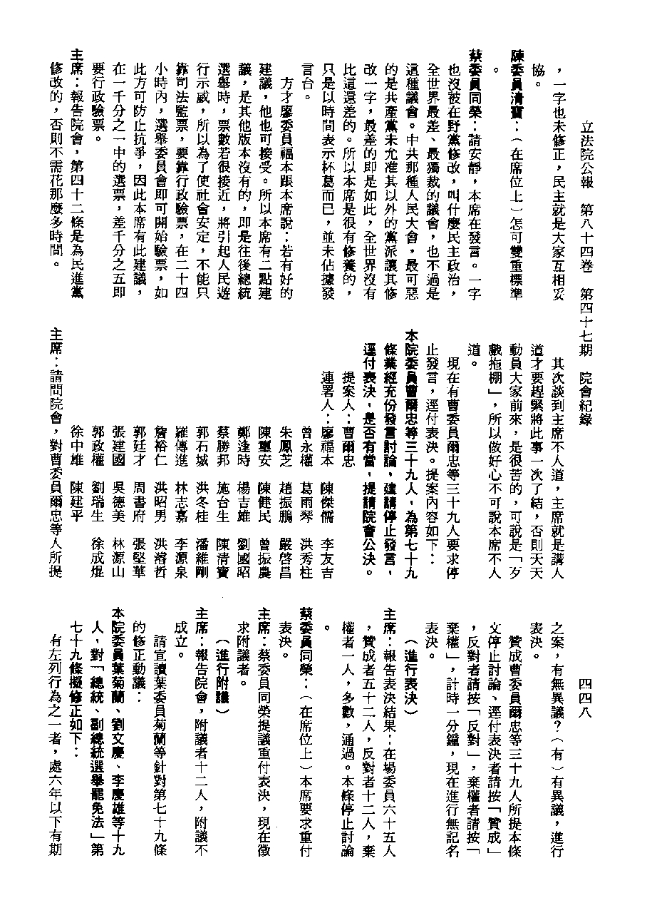 1.本案第2條以下條文,立法院第2屆第5會期第38次會議進行審議,第38次院會共包括民國84年7月14日下午、7月17日、7月18日、7月19日及7月20日上午等5個會議日。 2.由於民進黨團採取焦土策略,會議主席堅持依據議事規則逐條處理,拒絕包裹表決。因此本案第2條以下各條文的進行,按議事規則作同一模式的處理,在宣讀條文後由1位或2位委員發言,國民黨團委員即提出停止討論逕付表決之動議,停止討論動議經表決通過,該條文停止討論提付表決,此時民進黨團委員提出書面修正動議,其修正動議如獲多數支持,即照其修正動議通過,如其修正動議少數不通過,即將饒委員提案條文提付表決通過。 3.本件立法院公報紀錄第84卷,記載第38次會議5個會議日逐條討論表決之經過(第47期第87頁至第523頁)。