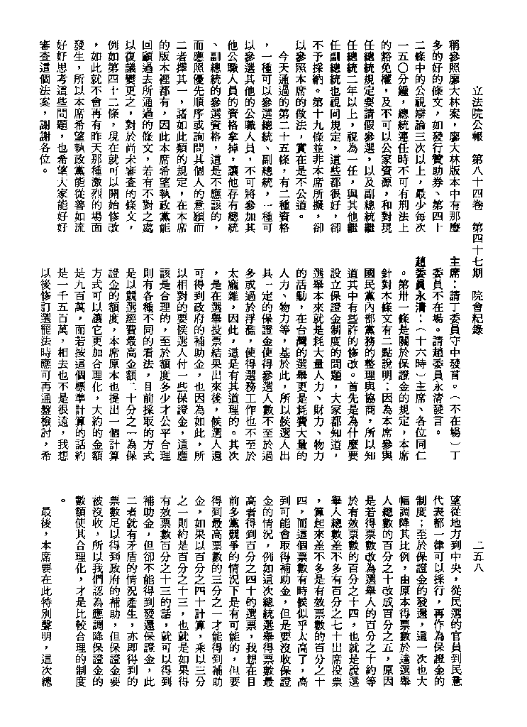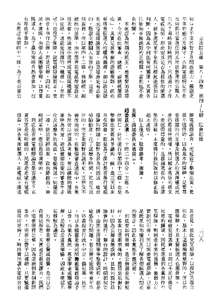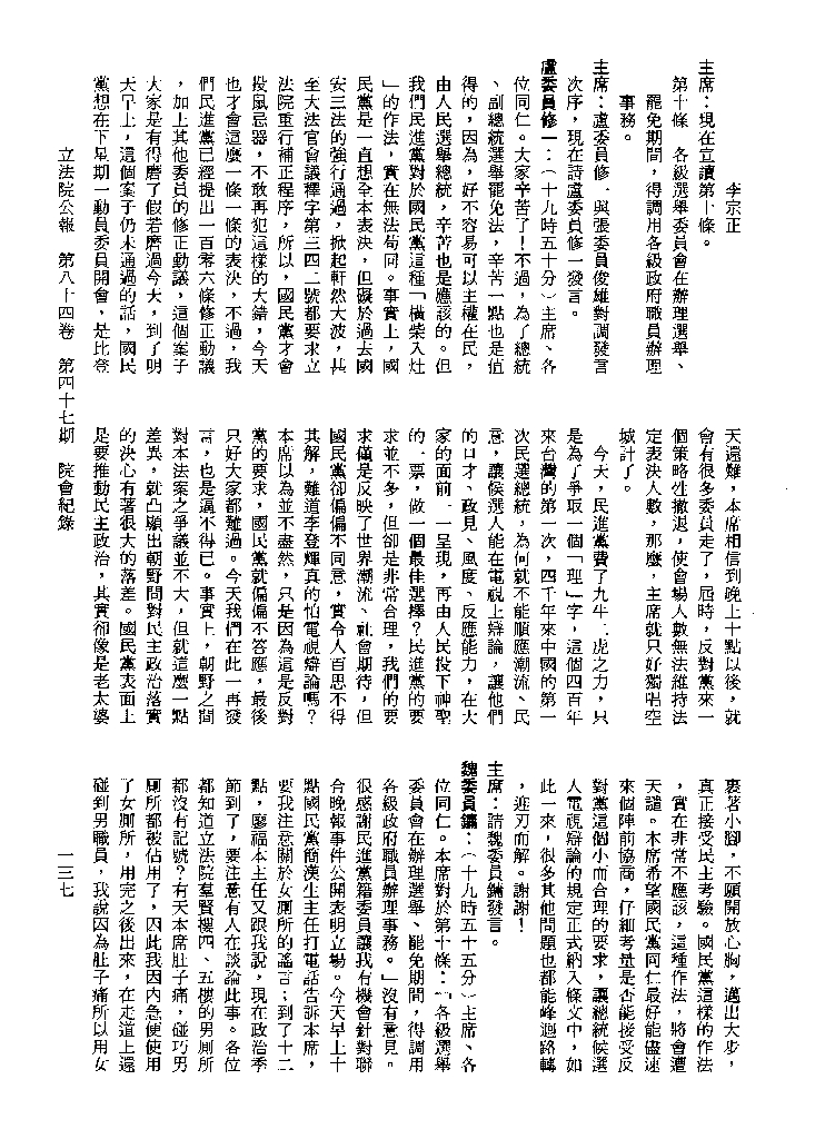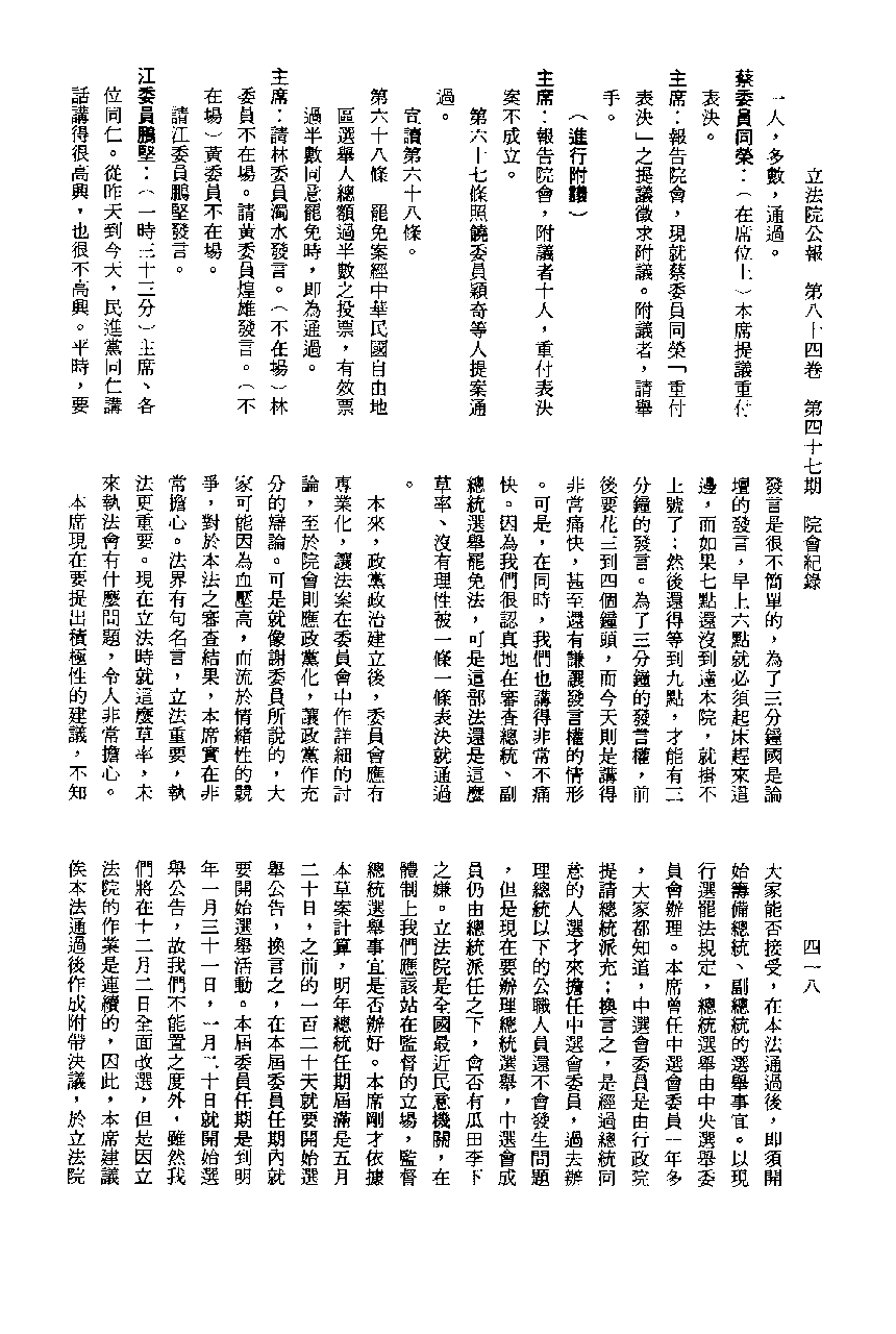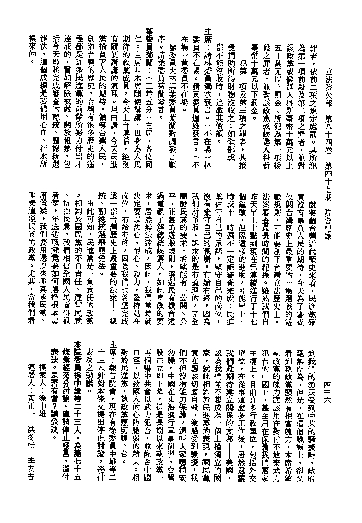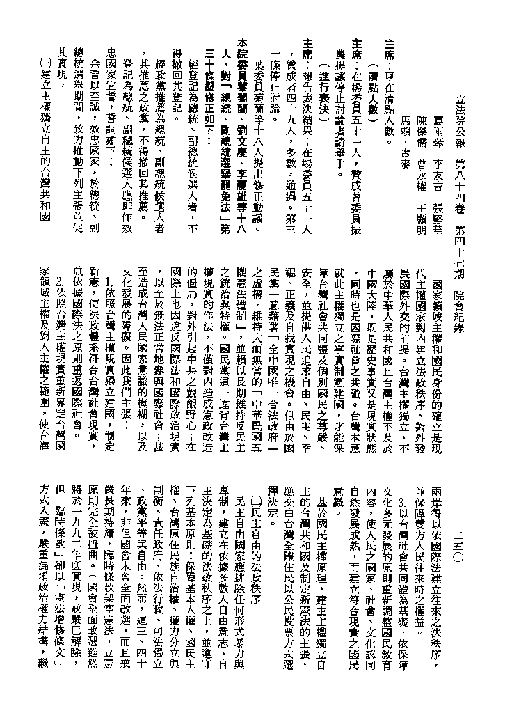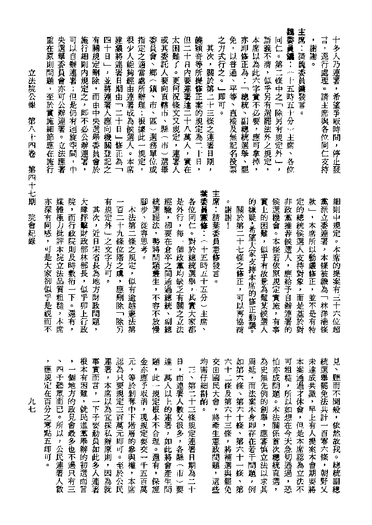 1.本案第2條以下條文,立法院第2屆第5會期第38次會議進行審議,第38次院會共包括民國84年7月14日下午、7月17日、7月18日、7月19日及7月20日上午等5個會議日。 2.由於民進黨團採取焦土策略,會議主席堅持依據議事規則逐條處理,拒絕包裹表決。因此本案第2條以下各條文的進行,按議事規則作同一模式的處理,在宣讀條文後由1位或2位委員發言,國民黨團委員即提出停止討論逕付表決之動議,停止討論動議經表決通過,該條文停止討論提付表決,此時民進黨團委員提出書面修正動議,其修正動議如獲多數支持,即照其修正動議通過,如其修正動議少數不通過,即將饒委員提案條文提付表決通過。 3.本件立法院公報紀錄第84卷,記載第38次會議5個會議日逐條討論表決之經過(第47期第87頁至第523頁)。