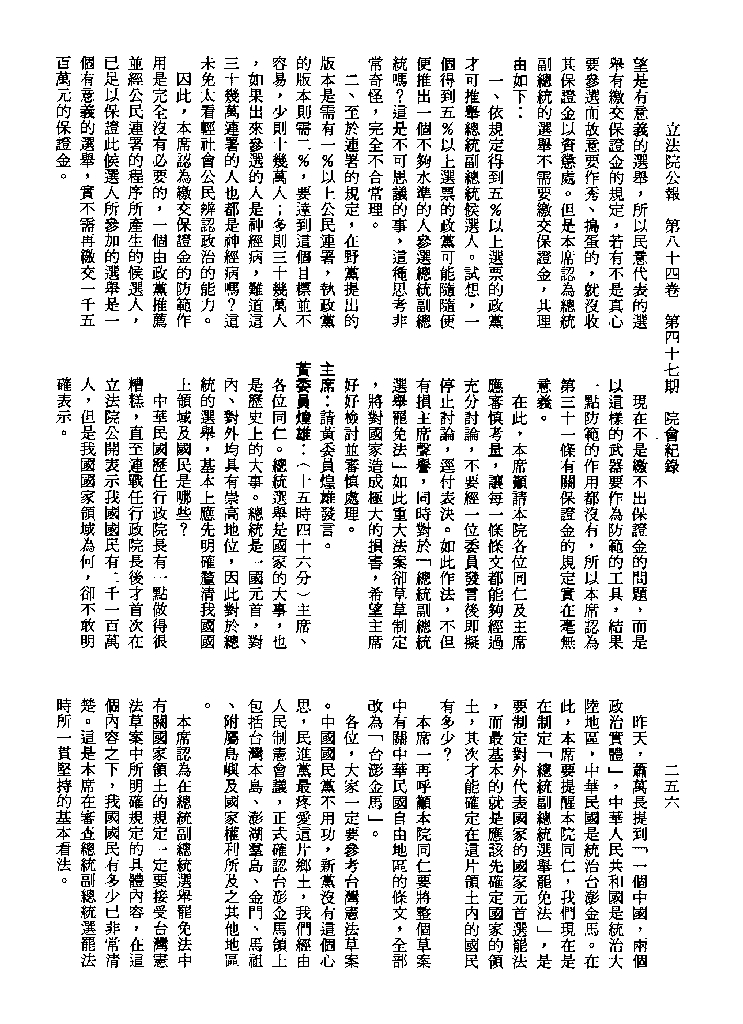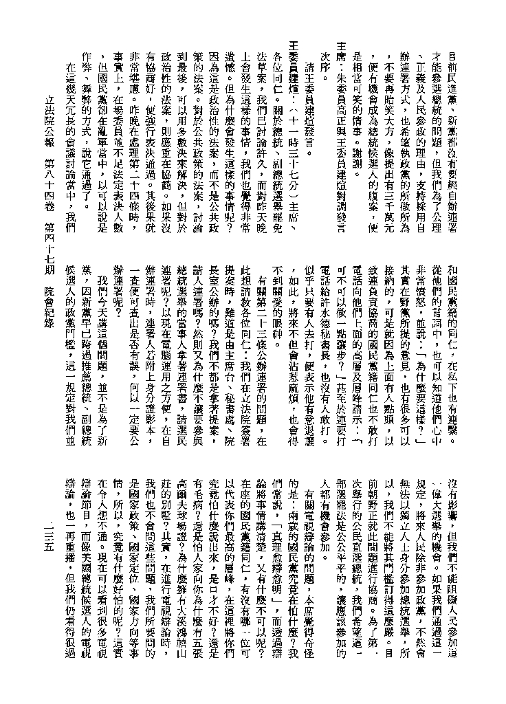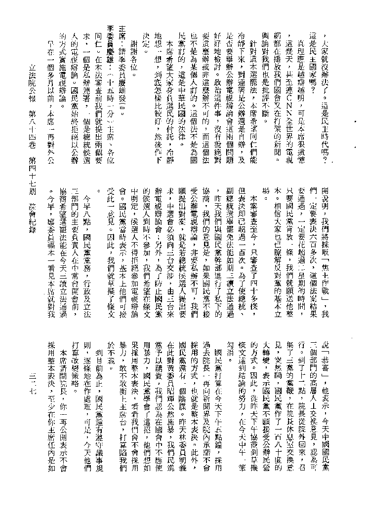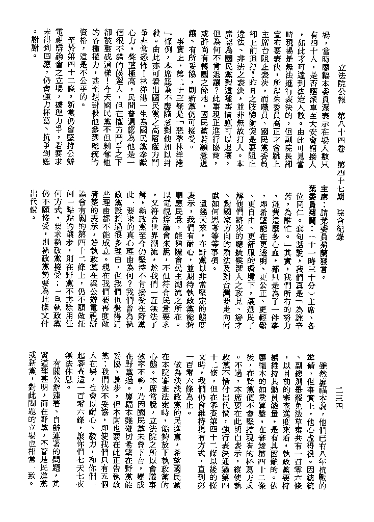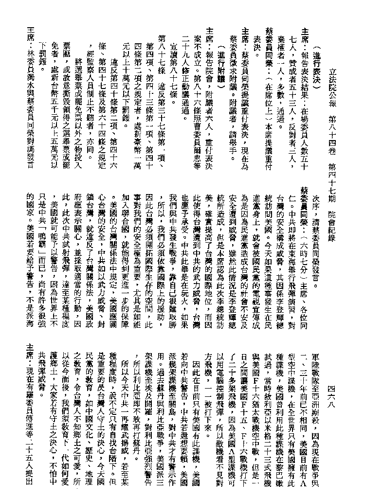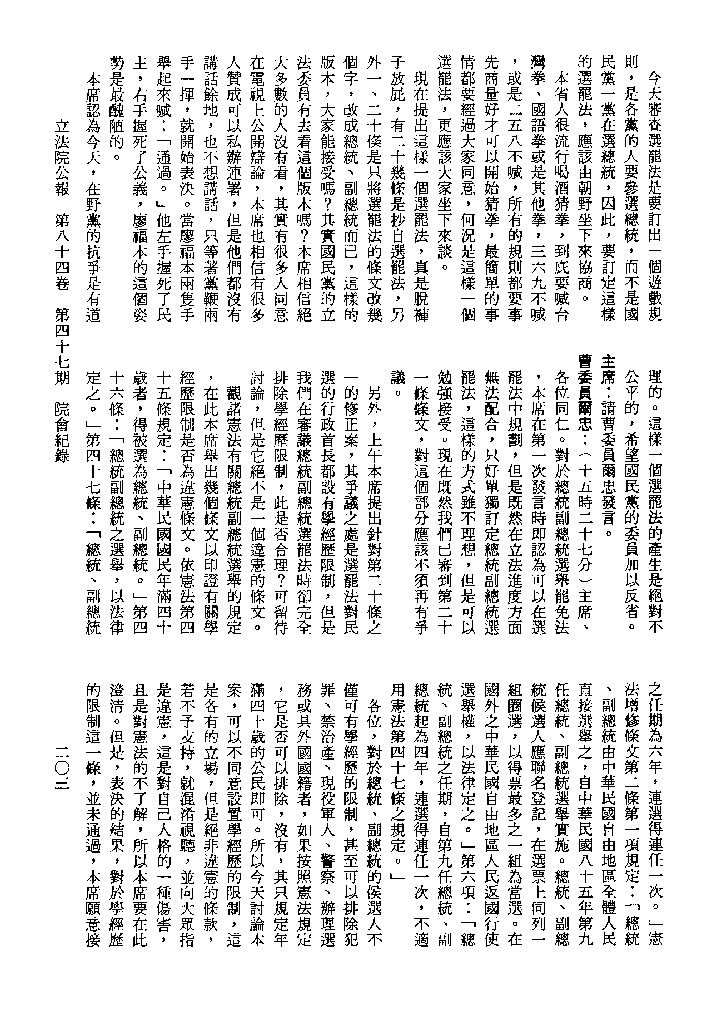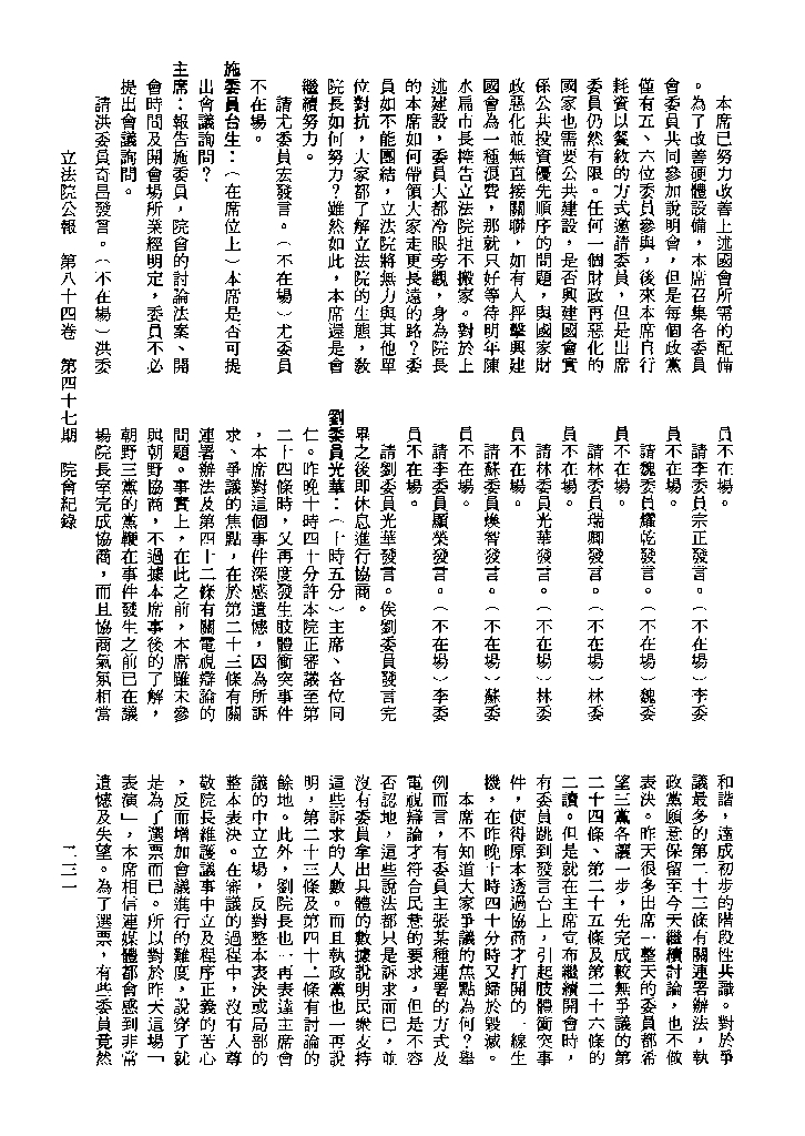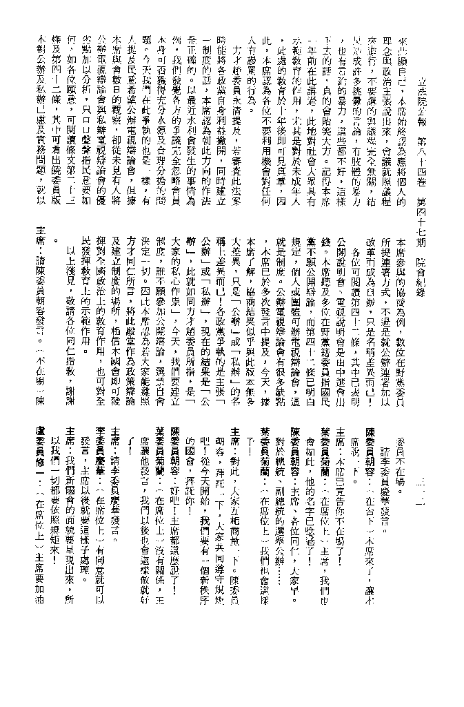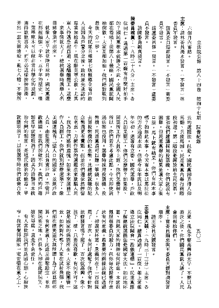 1.本案第2條以下條文,立法院第2屆第5會期第38次會議進行審議,第38次院會共包括民國84年7月14日下午、7月17日、7月18日、7月19日及7月20日上午等5個會議日。 2.由於民進黨團採取焦土策略,會議主席堅持依據議事規則逐條處理,拒絕包裹表決。因此本案第2條以下各條文的進行,按議事規則作同一模式的處理,在宣讀條文後由1位或2位委員發言,國民黨團委員即提出停止討論逕付表決之動議,停止討論動議經表決通過,該條文停止討論提付表決,此時民進黨團委員提出書面修正動議,其修正動議如獲多數支持,即照其修正動議通過,如其修正動議少數不通過,即將饒委員提案條文提付表決通過。 3.本件立法院公報紀錄第84卷,記載第38次會議5個會議日逐條討論表決之經過(第47期第87頁至第523頁)。