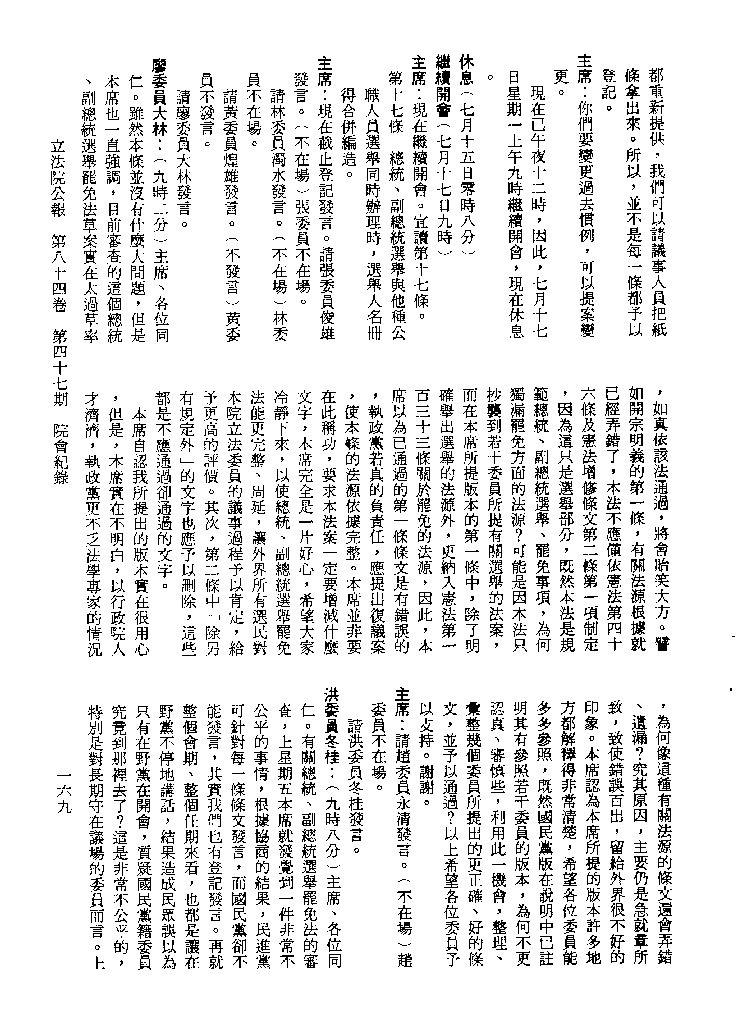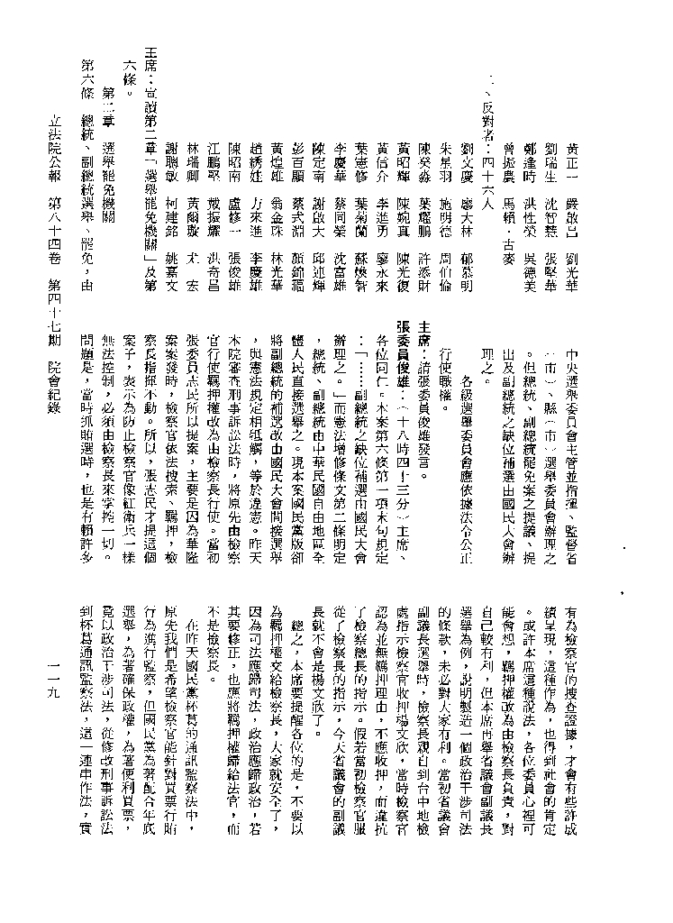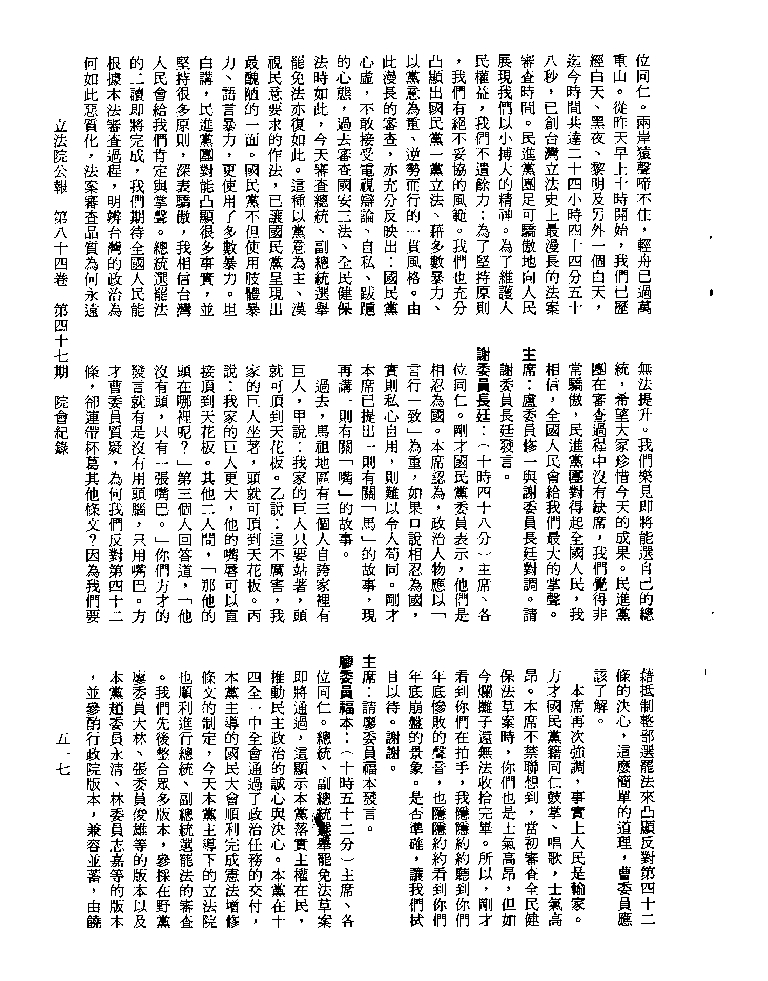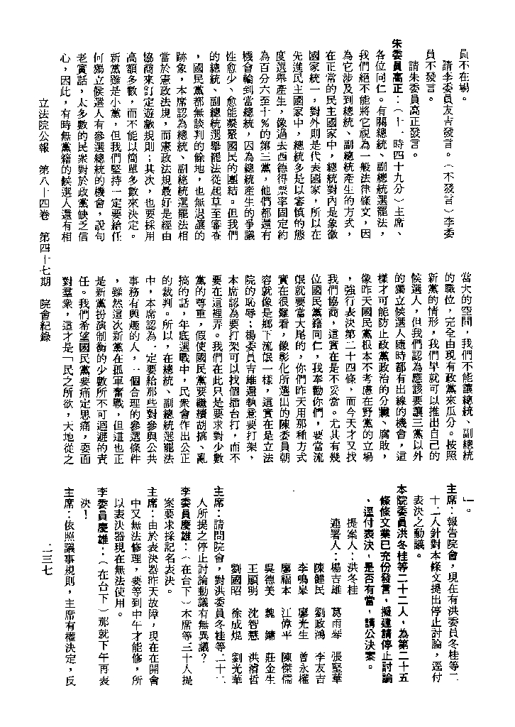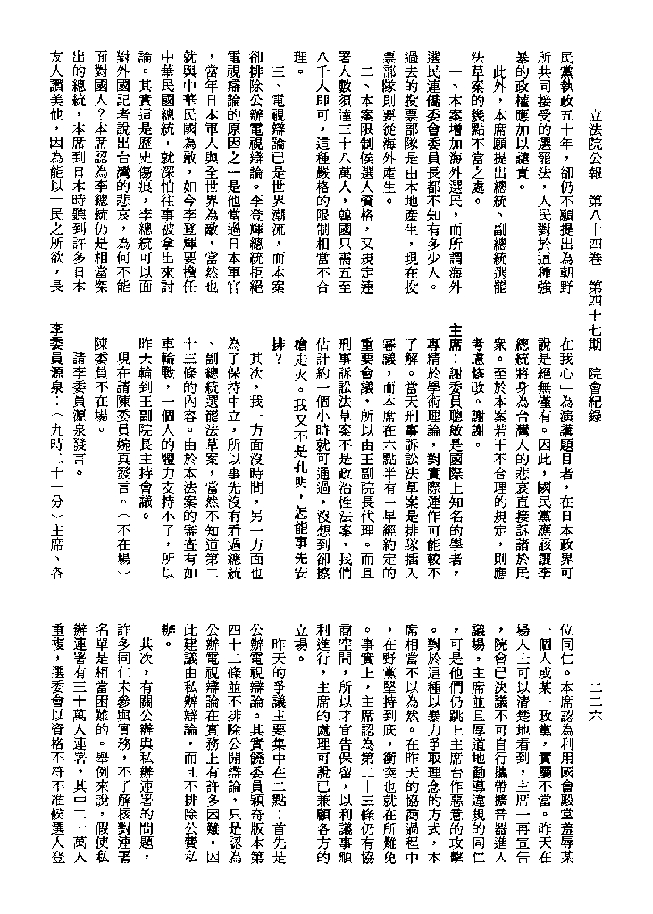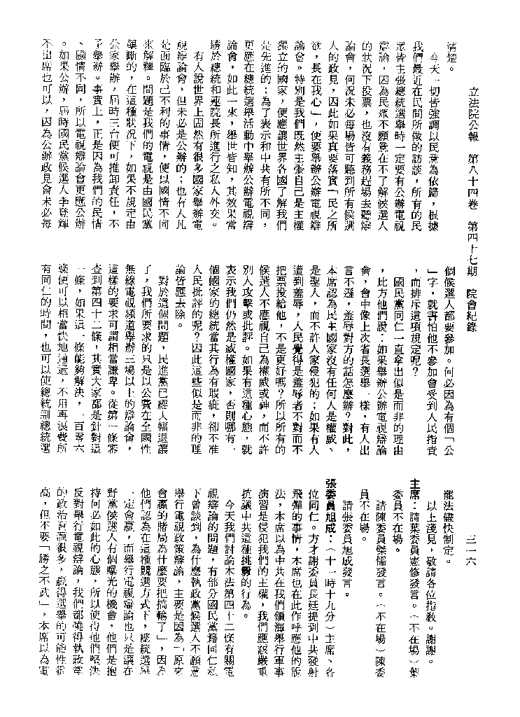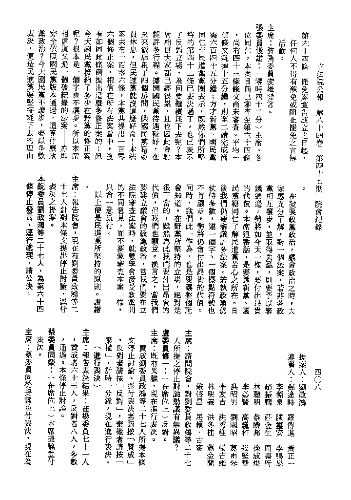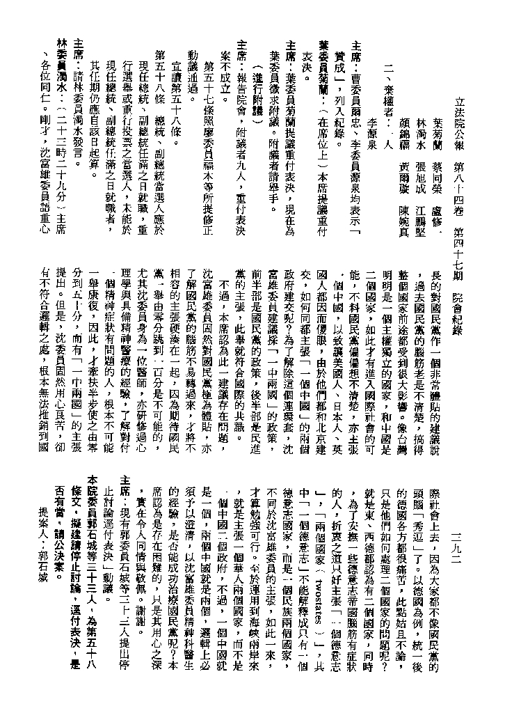 1.本案第2條以下條文,立法院第2屆第5會期第38次會議進行審議,第38次院會共包括民國84年7月14日下午、7月17日、7月18日、7月19日及7月20日上午等5個會議日。 2.由於民進黨團採取焦土策略,會議主席堅持依據議事規則逐條處理,拒絕包裹表決。因此本案第2條以下各條文的進行,按議事規則作同一模式的處理,在宣讀條文後由1位或2位委員發言,國民黨團委員即提出停止討論逕付表決之動議,停止討論動議經表決通過,該條文停止討論提付表決,此時民進黨團委員提出書面修正動議,其修正動議如獲多數支持,即照其修正動議通過,如其修正動議少數不通過,即將饒委員提案條文提付表決通過。 3.本件立法院公報紀錄第84卷,記載第38次會議5個會議日逐條討論表決之經過(第47期第87頁至第523頁)。