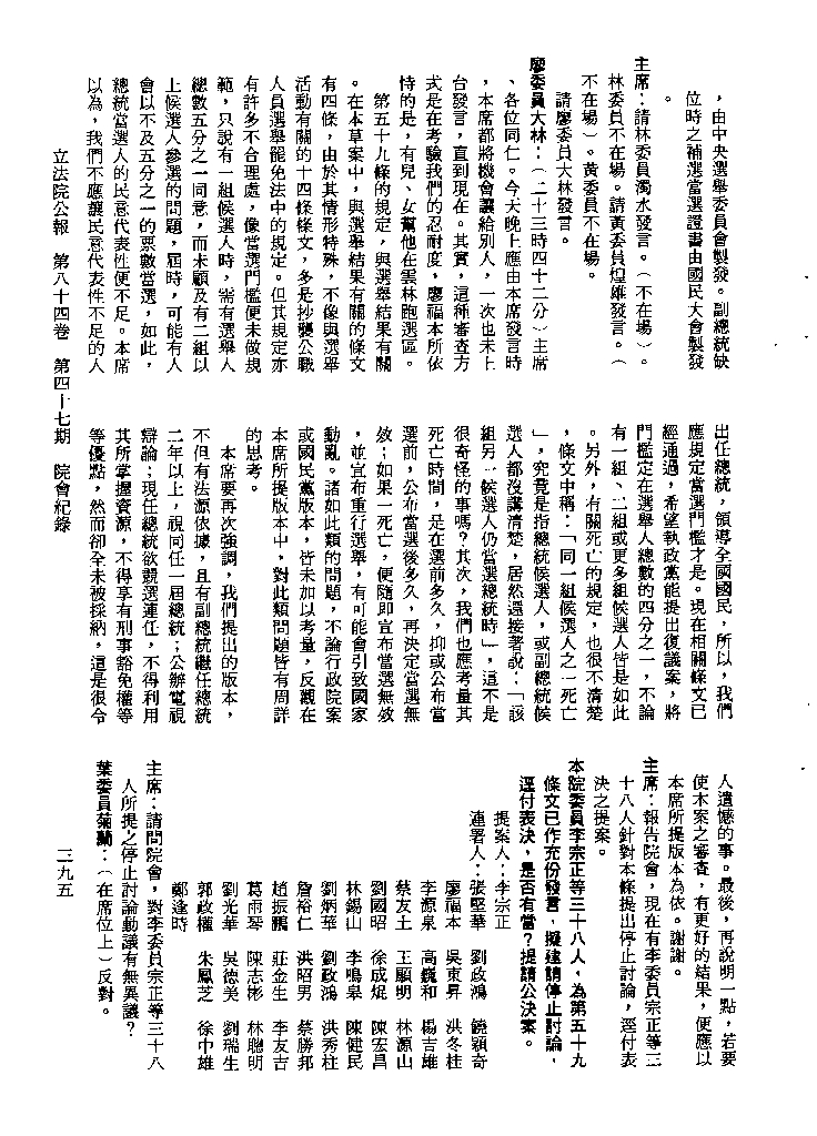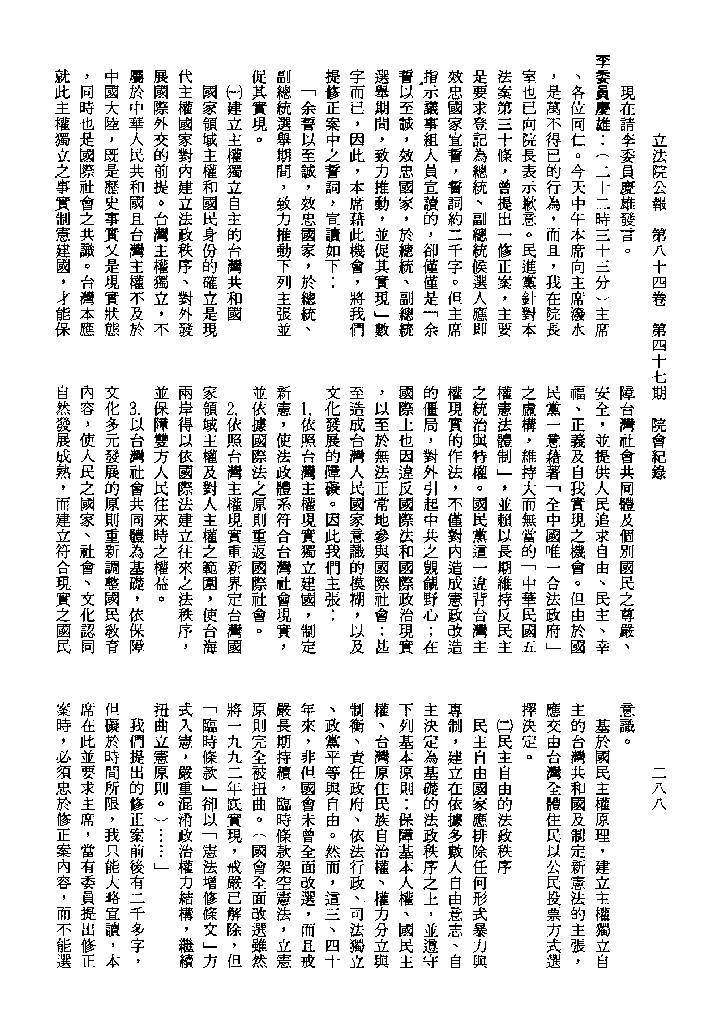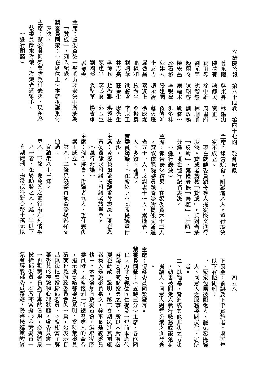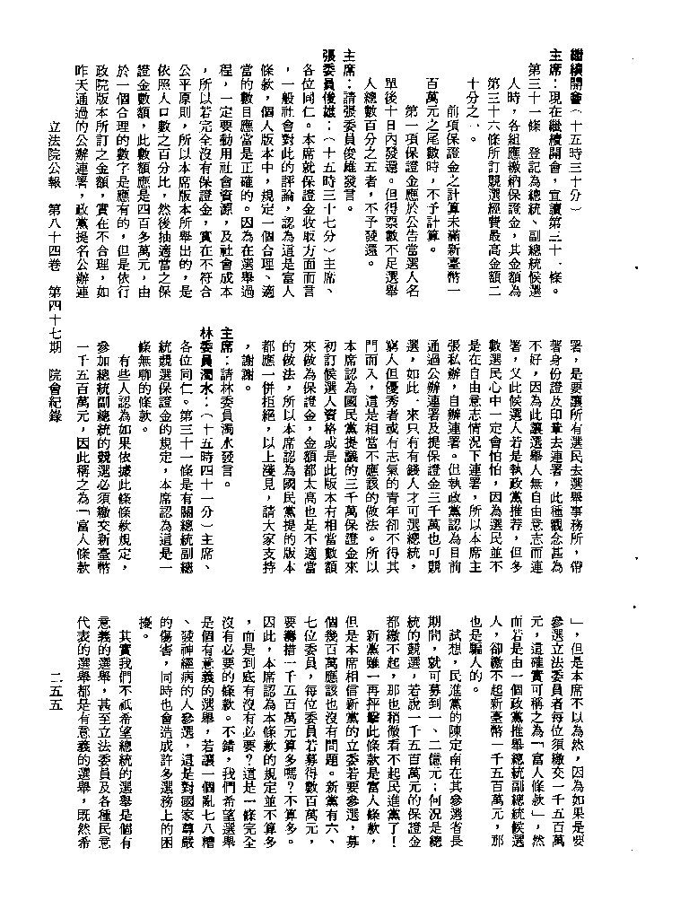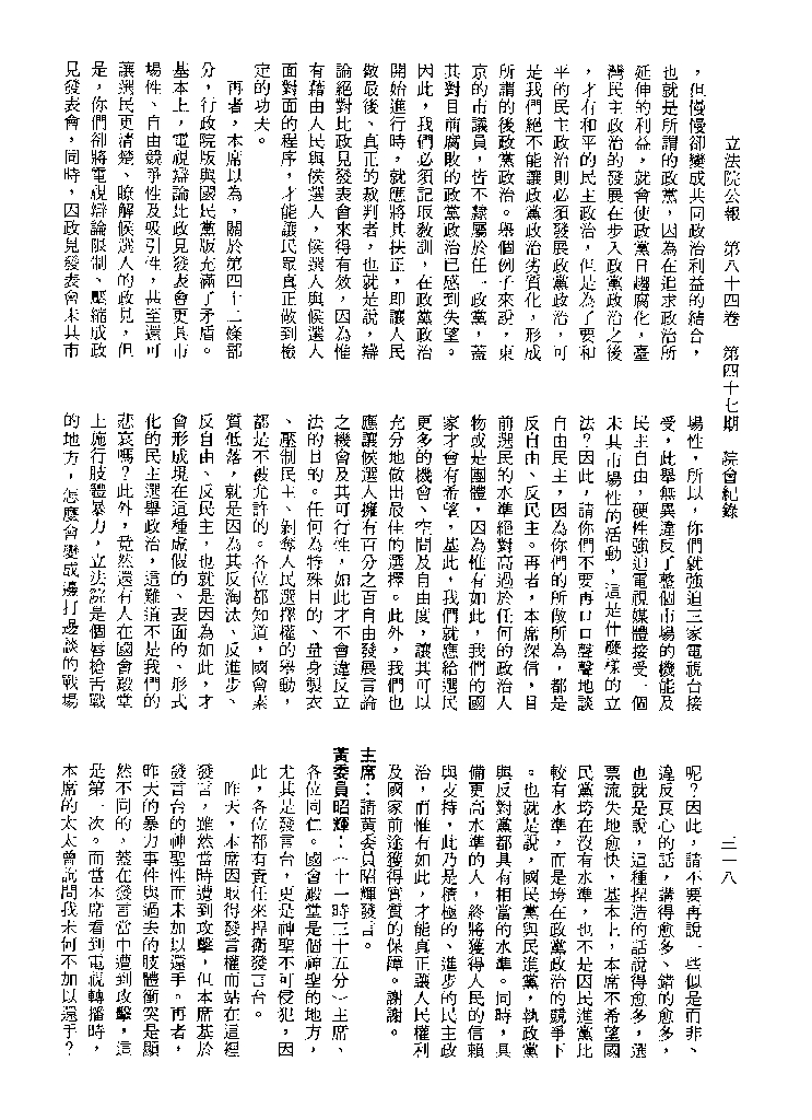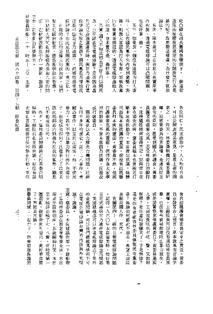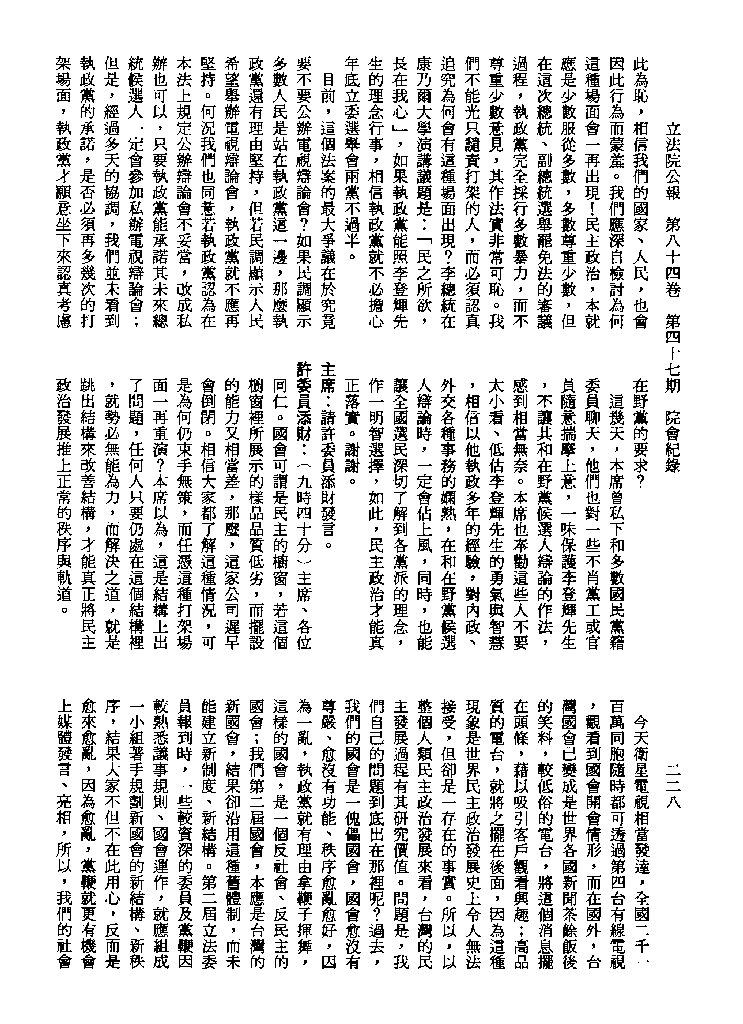 1.本案第2條以下條文,立法院第2屆第5會期第38次會議進行審議,第38次院會共包括民國84年7月14日下午、7月17日、7月18日、7月19日及7月20日上午等5個會議日。 2.由於民進黨團採取焦土策略,會議主席堅持依據議事規則逐條處理,拒絕包裹表決。因此本案第2條以下各條文的進行,按議事規則作同一模式的處理,在宣讀條文後由1位或2位委員發言,國民黨團委員即提出停止討論逕付表決之動議,停止討論動議經表決通過,該條文停止討論提付表決,此時民進黨團委員提出書面修正動議,其修正動議如獲多數支持,即照其修正動議通過,如其修正動議少數不通過,即將饒委員提案條文提付表決通過。 3.本件立法院公報紀錄第84卷,記載第38次會議5個會議日逐條討論表決之經過(第47期第87頁至第523頁)。