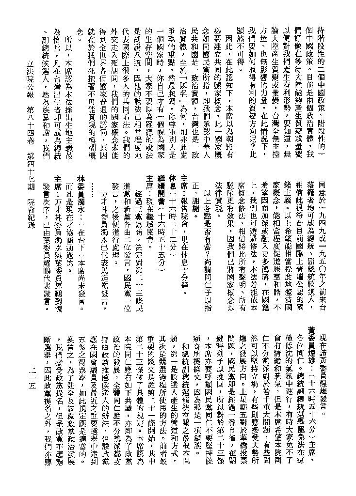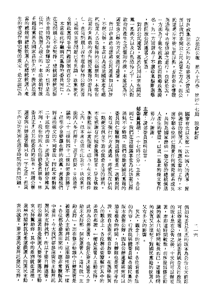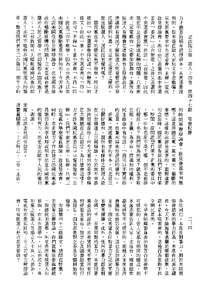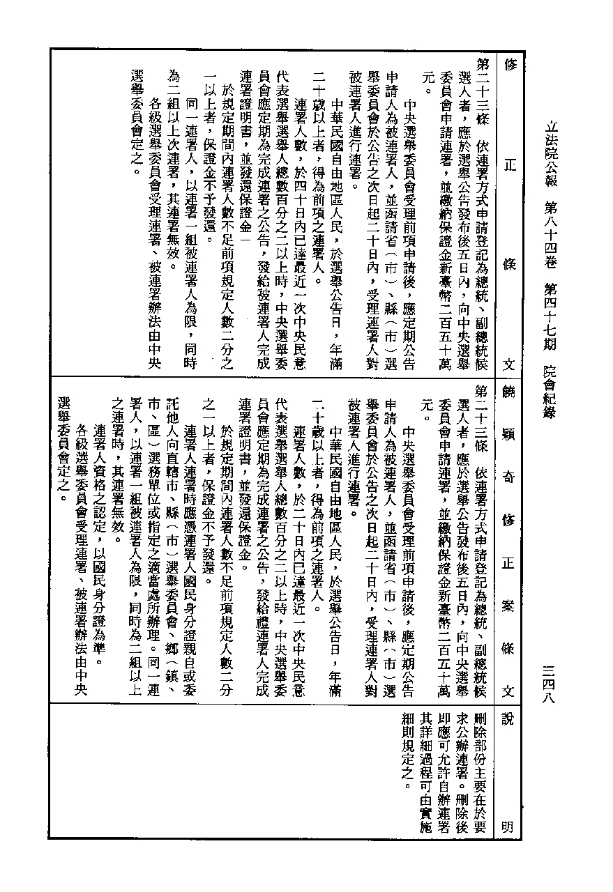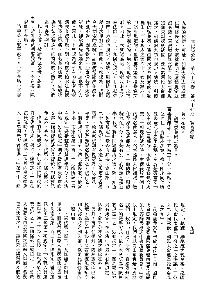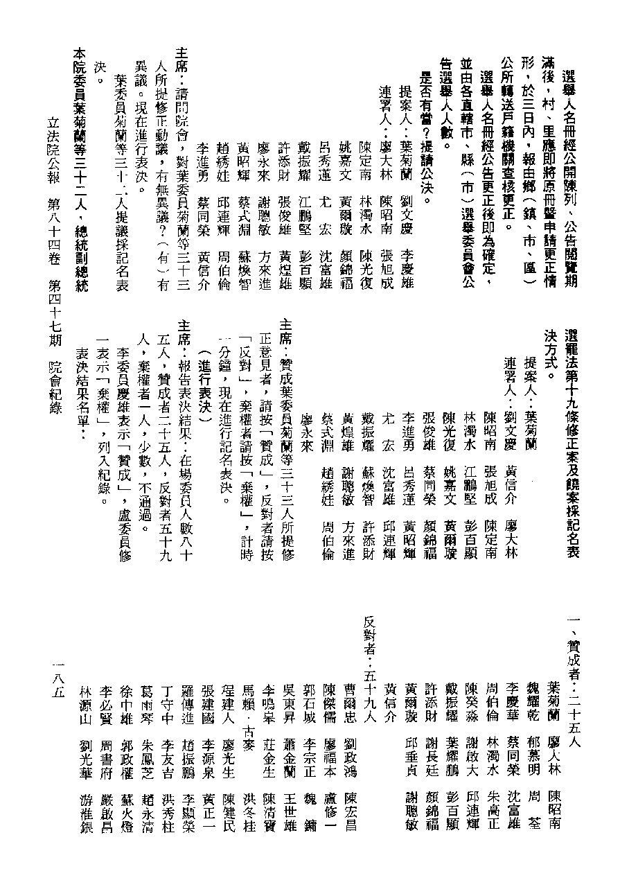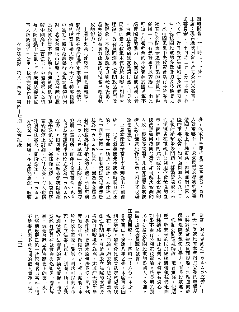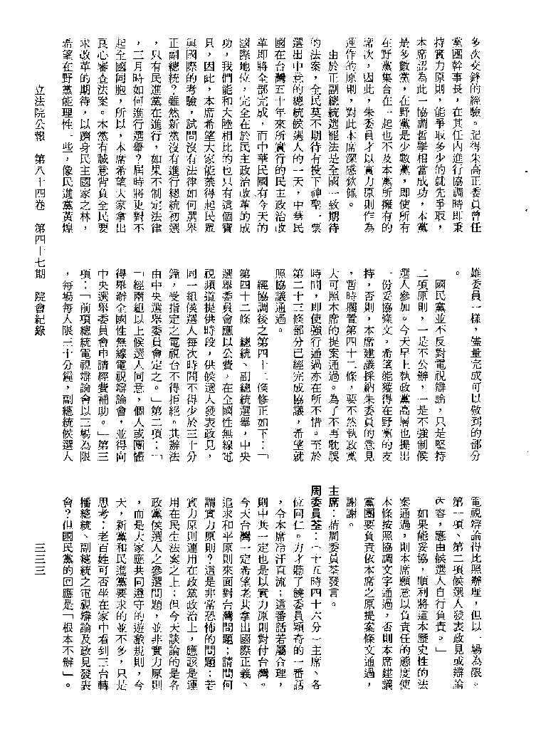 1.本案第2條以下條文,立法院第2屆第5會期第38次會議進行審議,第38次院會共包括民國84年7月14日下午、7月17日、7月18日、7月19日及7月20日上午等5個會議日。 2.由於民進黨團採取焦土策略,會議主席堅持依據議事規則逐條處理,拒絕包裹表決。因此本案第2條以下各條文的進行,按議事規則作同一模式的處理,在宣讀條文後由1位或2位委員發言,國民黨團委員即提出停止討論逕付表決之動議,停止討論動議經表決通過,該條文停止討論提付表決,此時民進黨團委員提出書面修正動議,其修正動議如獲多數支持,即照其修正動議通過,如其修正動議少數不通過,即將饒委員提案條文提付表決通過。 3.本件立法院公報紀錄第84卷,記載第38次會議5個會議日逐條討論表決之經過(第47期第87頁至第523頁)。