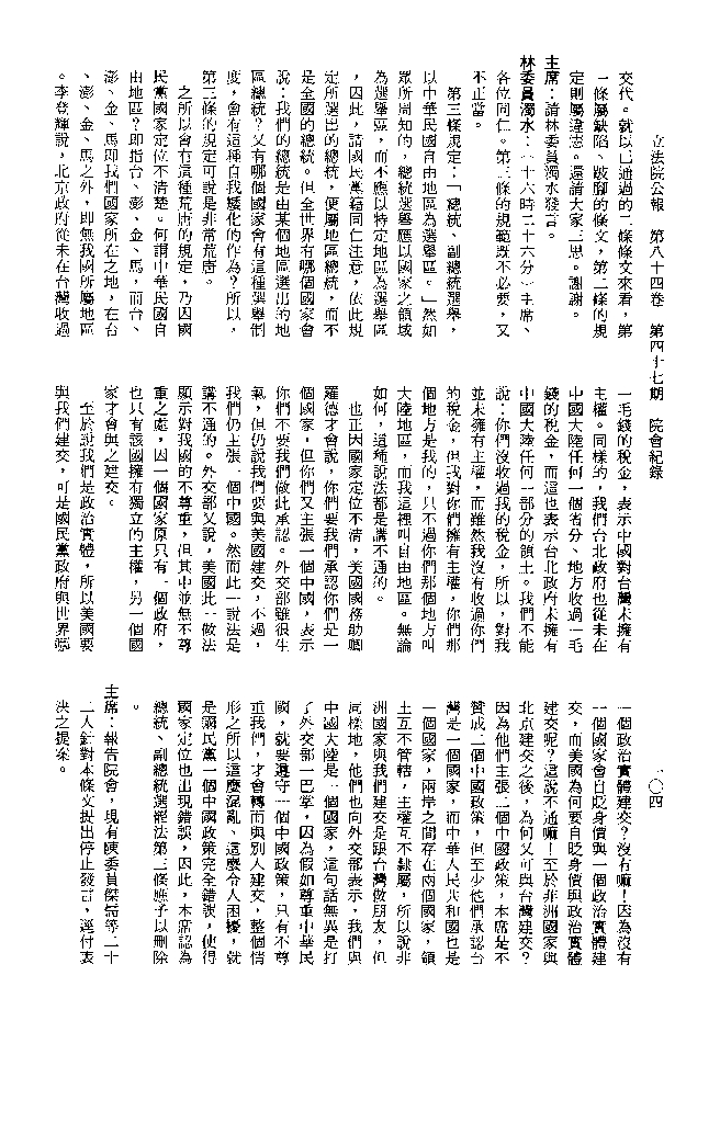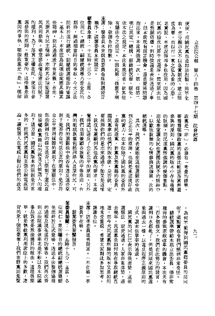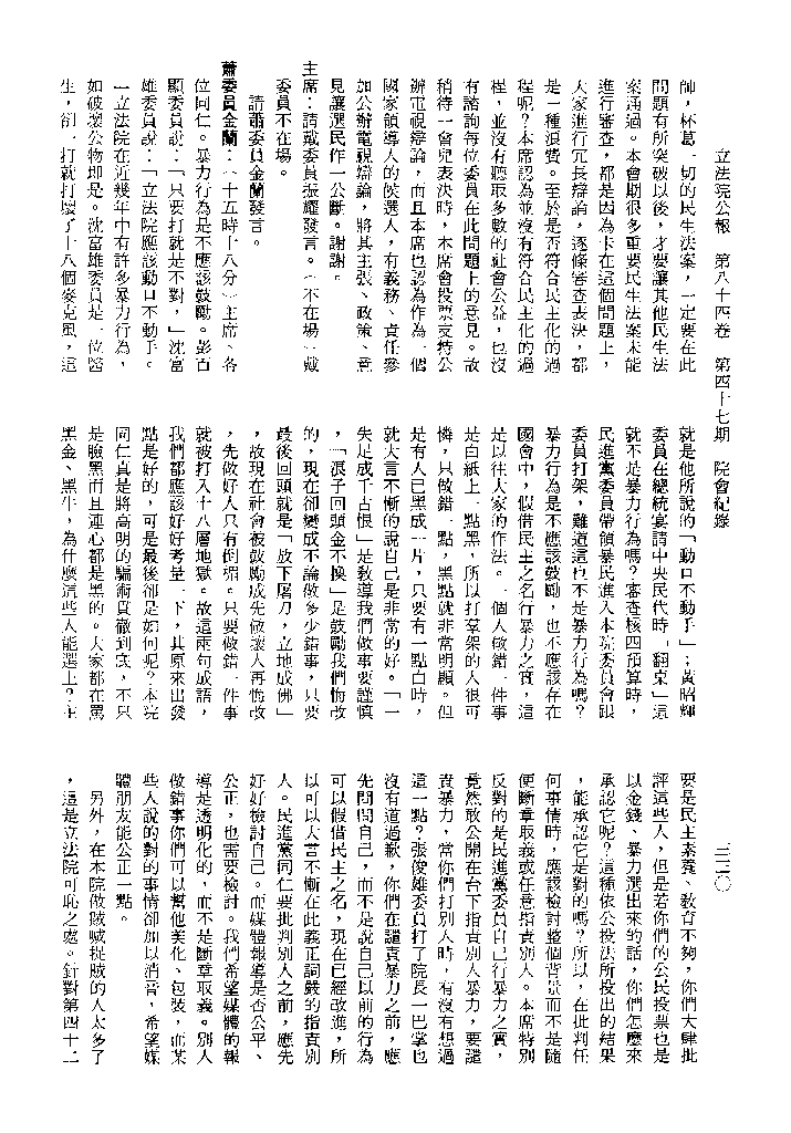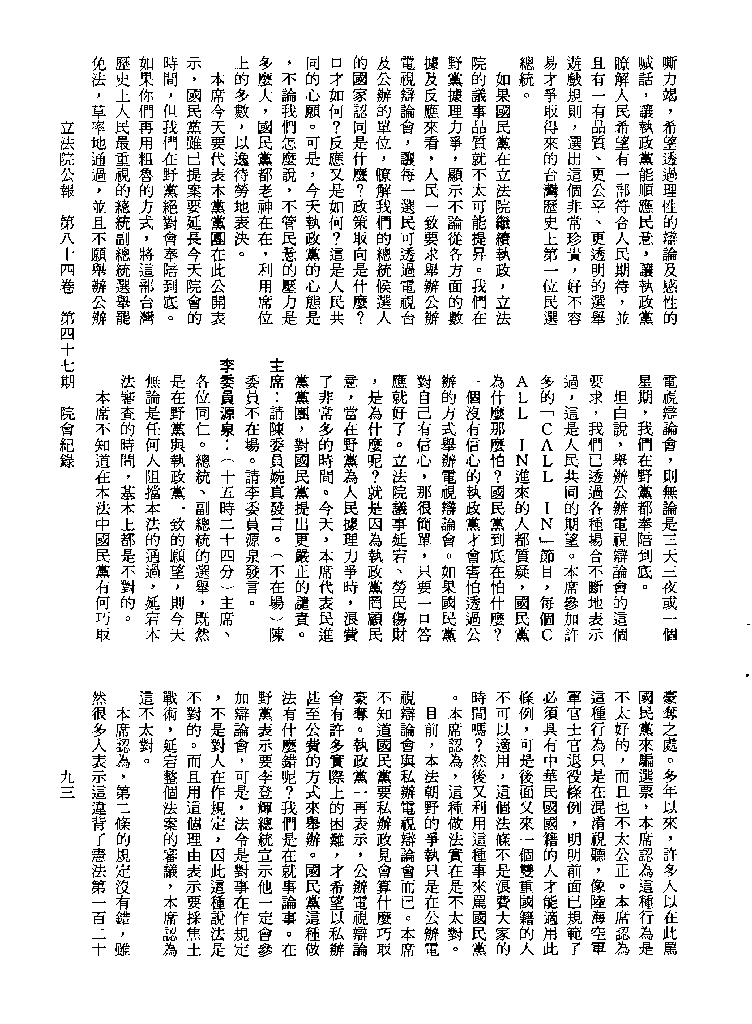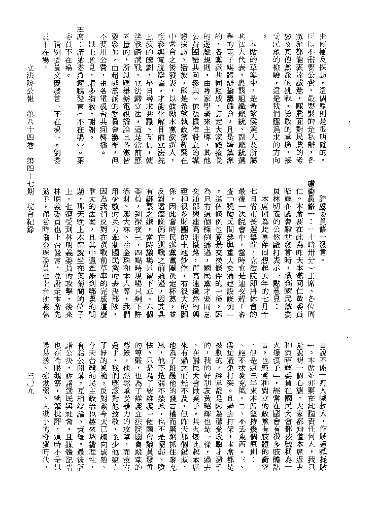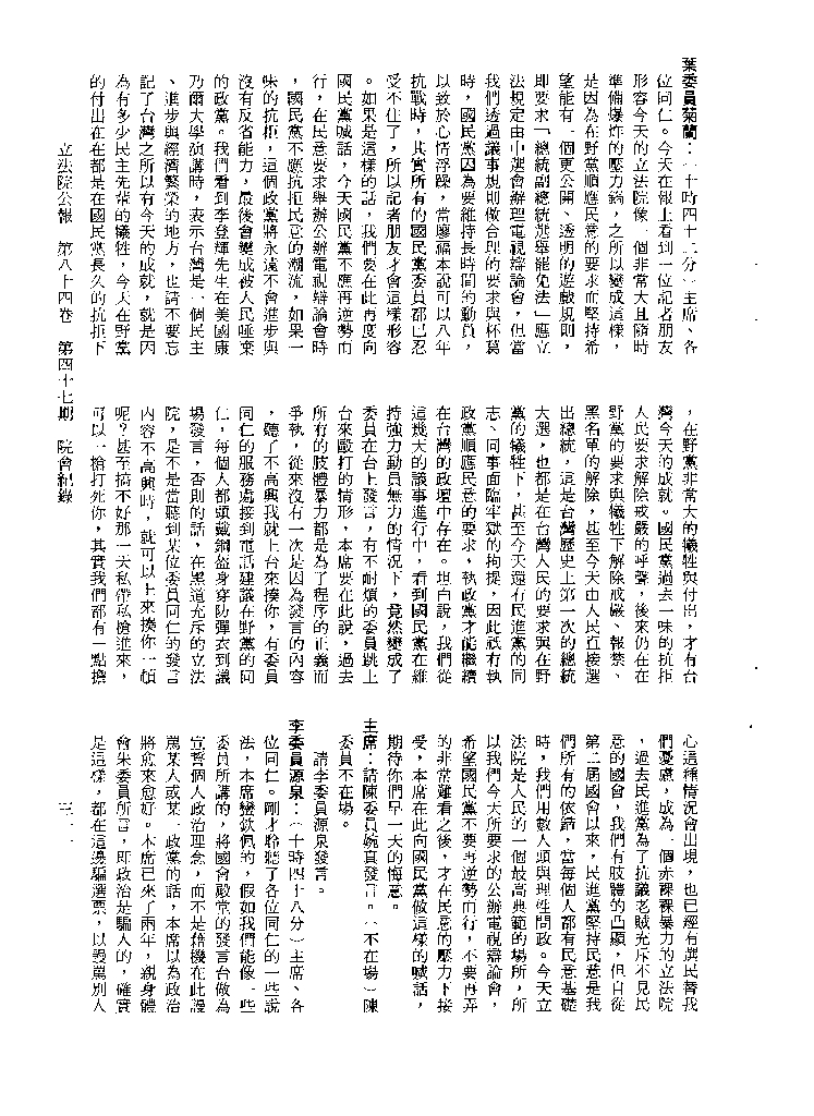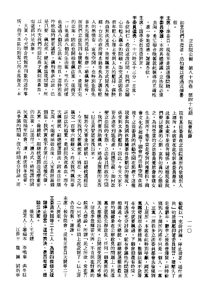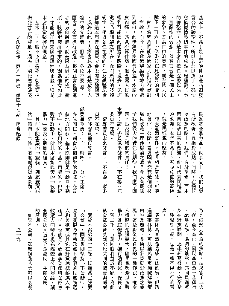 1.本案第2條以下條文,立法院第2屆第5會期第38次會議進行審議,第38次院會共包括民國84年7月14日下午、7月17日、7月18日、7月19日及7月20日上午等5個會議日。 2.由於民進黨團採取焦土策略,會議主席堅持依據議事規則逐條處理,拒絕包裹表決。因此本案第2條以下各條文的進行,按議事規則作同一模式的處理,在宣讀條文後由1位或2位委員發言,國民黨團委員即提出停止討論逕付表決之動議,停止討論動議經表決通過,該條文停止討論提付表決,此時民進黨團委員提出書面修正動議,其修正動議如獲多數支持,即照其修正動議通過,如其修正動議少數不通過,即將饒委員提案條文提付表決通過。 3.本件立法院公報紀錄第84卷,記載第38次會議5個會議日逐條討論表決之經過(第47期第87頁至第523頁)。