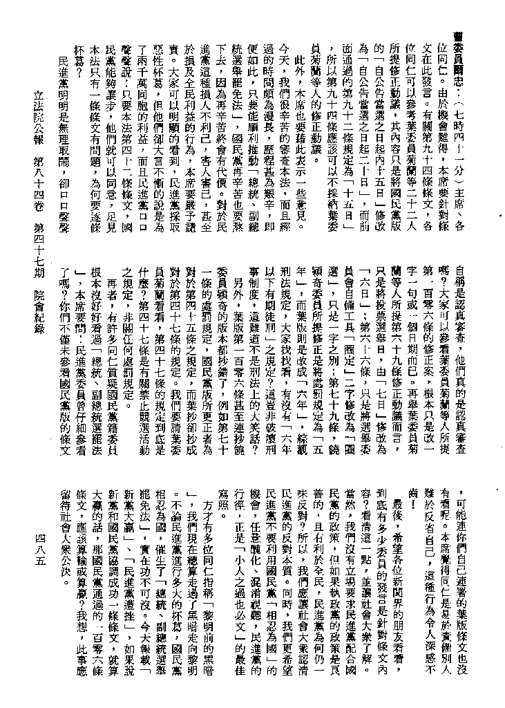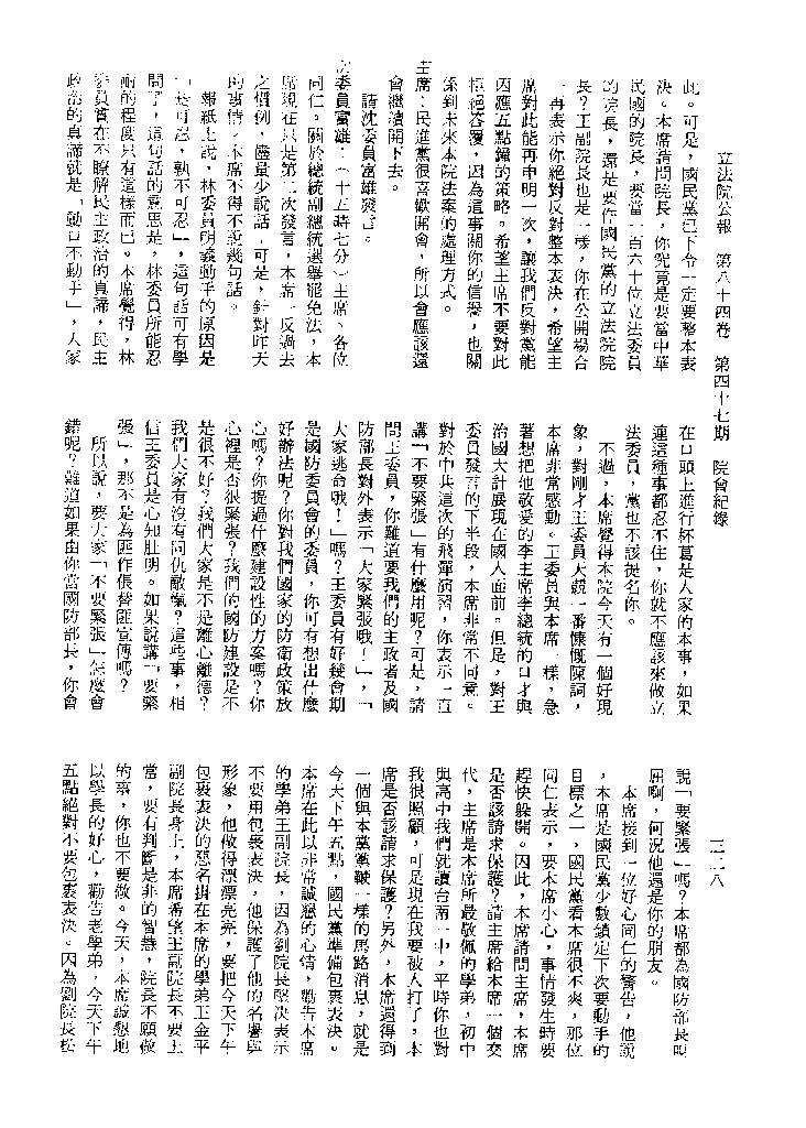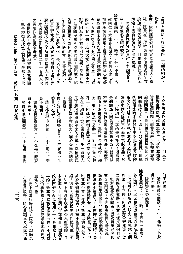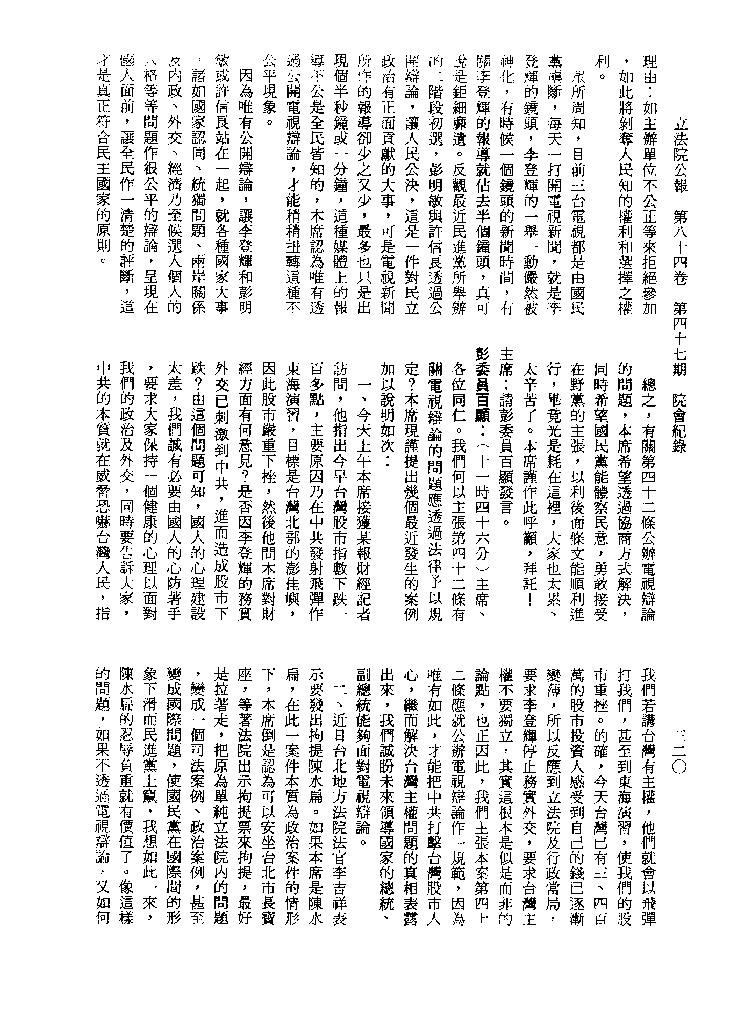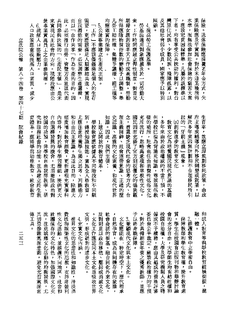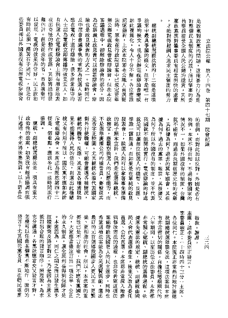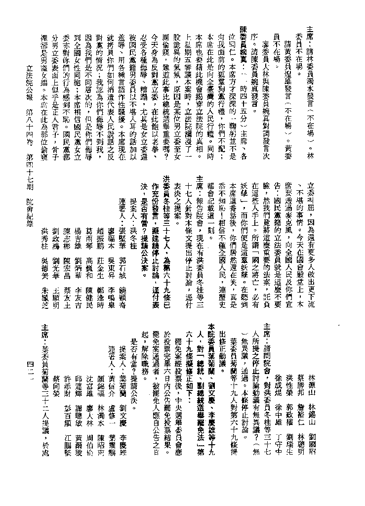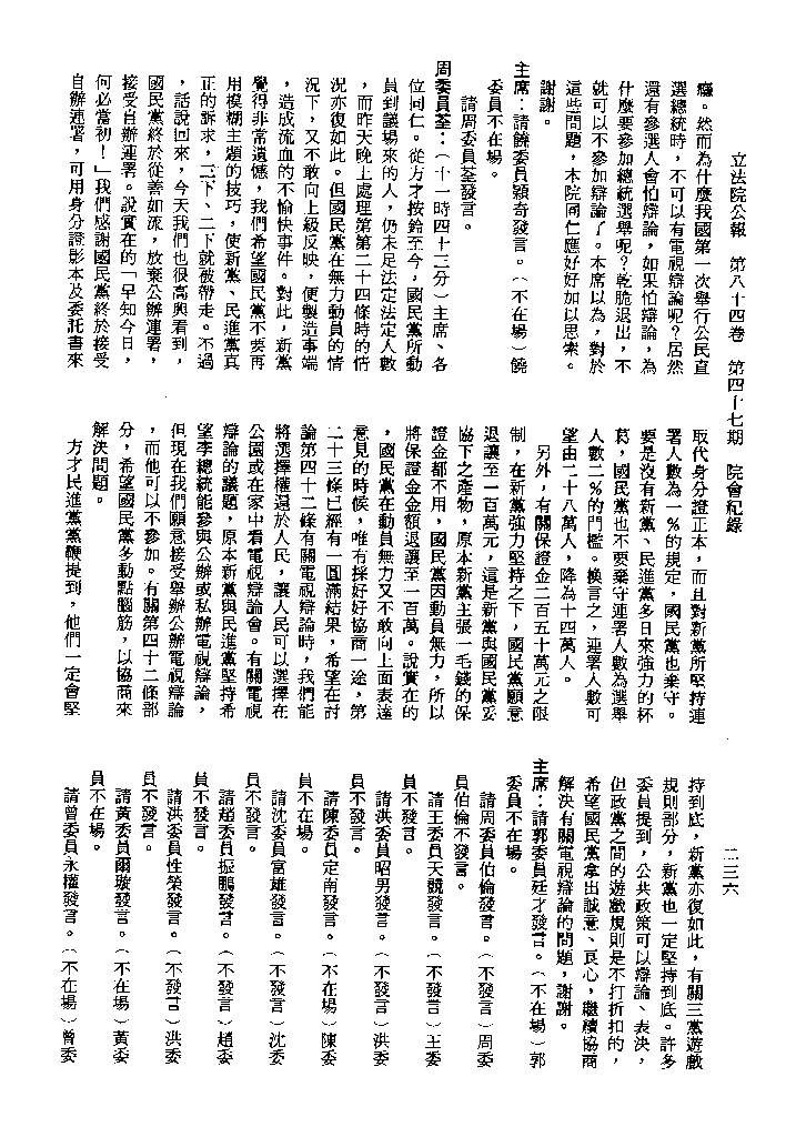 1.本案第2條以下條文,立法院第2屆第5會期第38次會議進行審議,第38次院會共包括民國84年7月14日下午、7月17日、7月18日、7月19日及7月20日上午等5個會議日。 2.由於民進黨團採取焦土策略,會議主席堅持依據議事規則逐條處理,拒絕包裹表決。因此本案第2條以下各條文的進行,按議事規則作同一模式的處理,在宣讀條文後由1位或2位委員發言,國民黨團委員即提出停止討論逕付表決之動議,停止討論動議經表決通過,該條文停止討論提付表決,此時民進黨團委員提出書面修正動議,其修正動議如獲多數支持,即照其修正動議通過,如其修正動議少數不通過,即將饒委員提案條文提付表決通過。 3.本件立法院公報紀錄第84卷,記載第38次會議5個會議日逐條討論表決之經過(第47期第87頁至第523頁)。