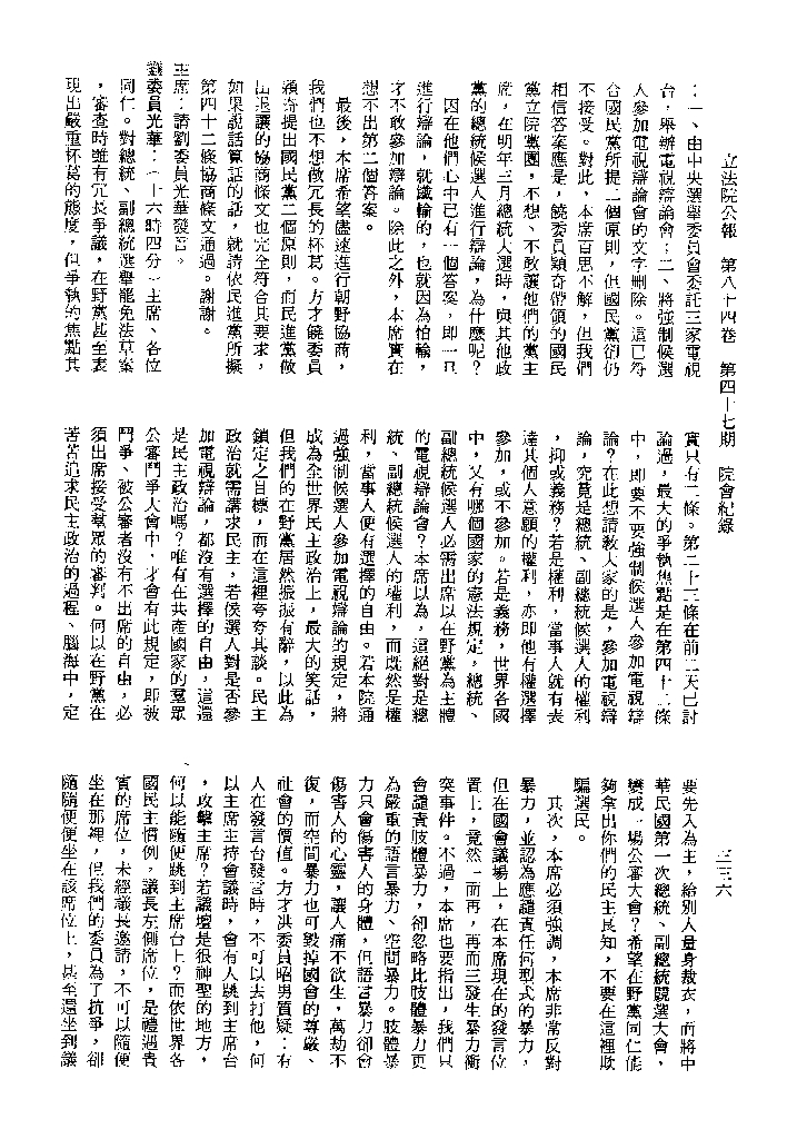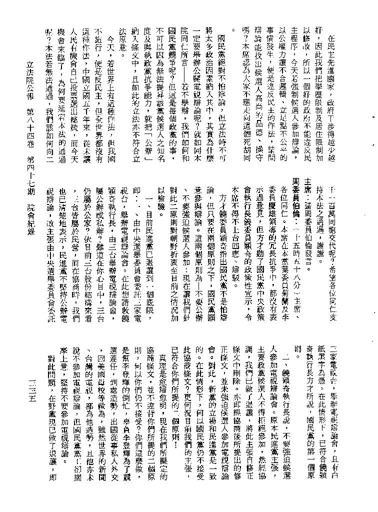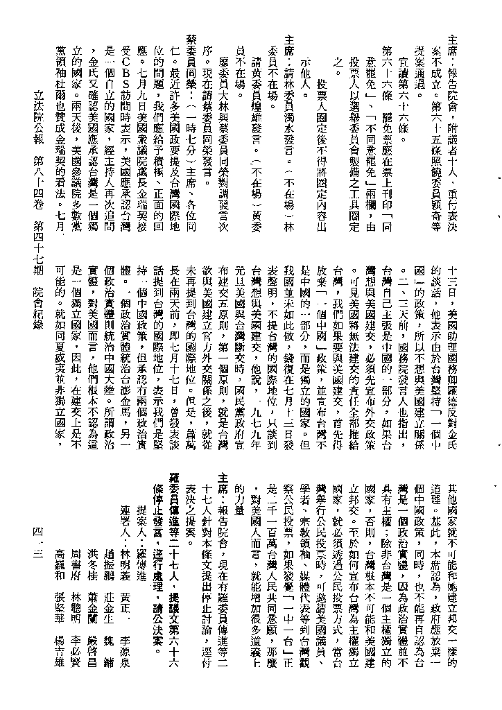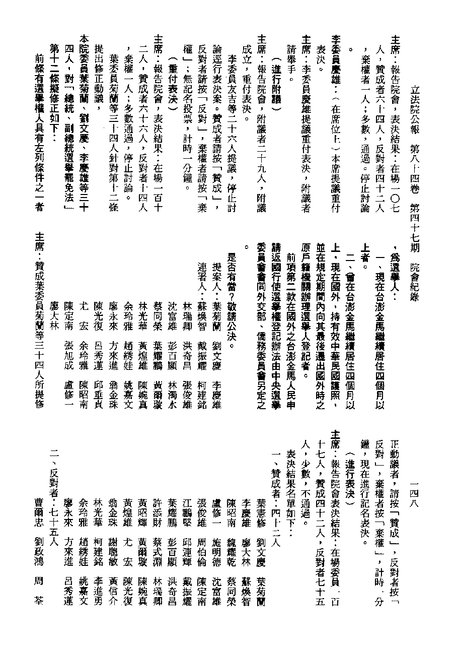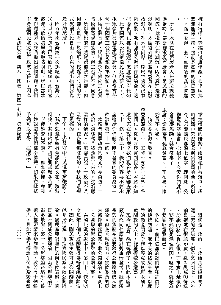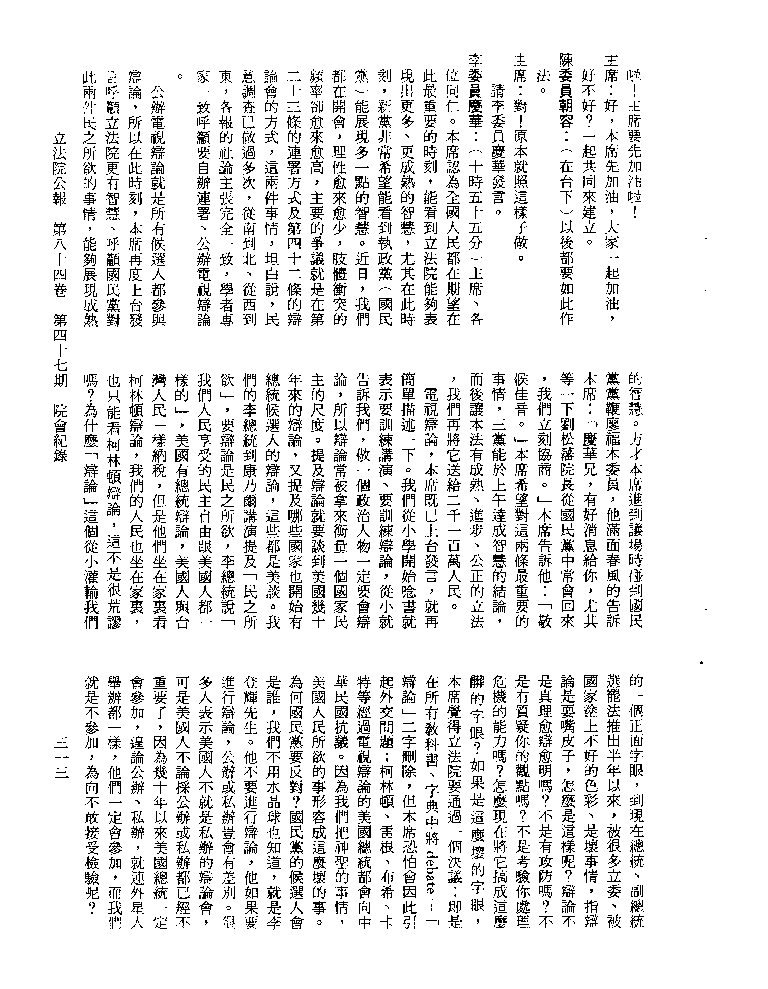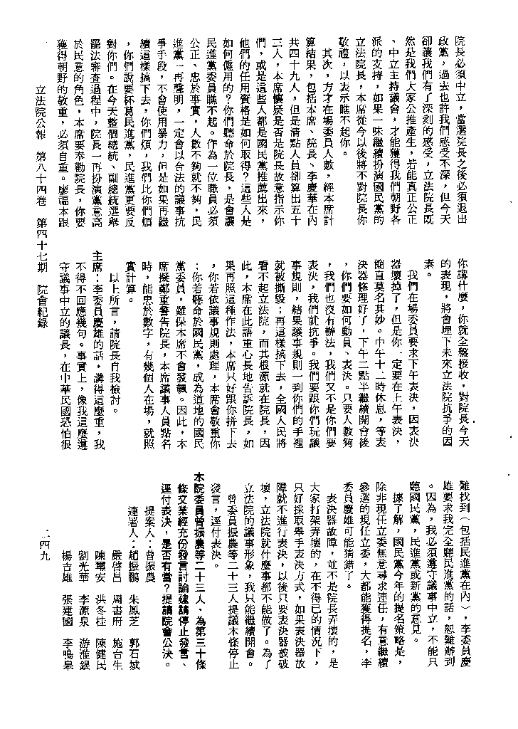 1.本案第2條以下條文,立法院第2屆第5會期第38次會議進行審議,第38次院會共包括民國84年7月14日下午、7月17日、7月18日、7月19日及7月20日上午等5個會議日。 2.由於民進黨團採取焦土策略,會議主席堅持依據議事規則逐條處理,拒絕包裹表決。因此本案第2條以下各條文的進行,按議事規則作同一模式的處理,在宣讀條文後由1位或2位委員發言,國民黨團委員即提出停止討論逕付表決之動議,停止討論動議經表決通過,該條文停止討論提付表決,此時民進黨團委員提出書面修正動議,其修正動議如獲多數支持,即照其修正動議通過,如其修正動議少數不通過,即將饒委員提案條文提付表決通過。 3.本件立法院公報紀錄第84卷,記載第38次會議5個會議日逐條討論表決之經過(第47期第87頁至第523頁)。