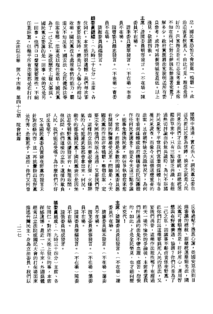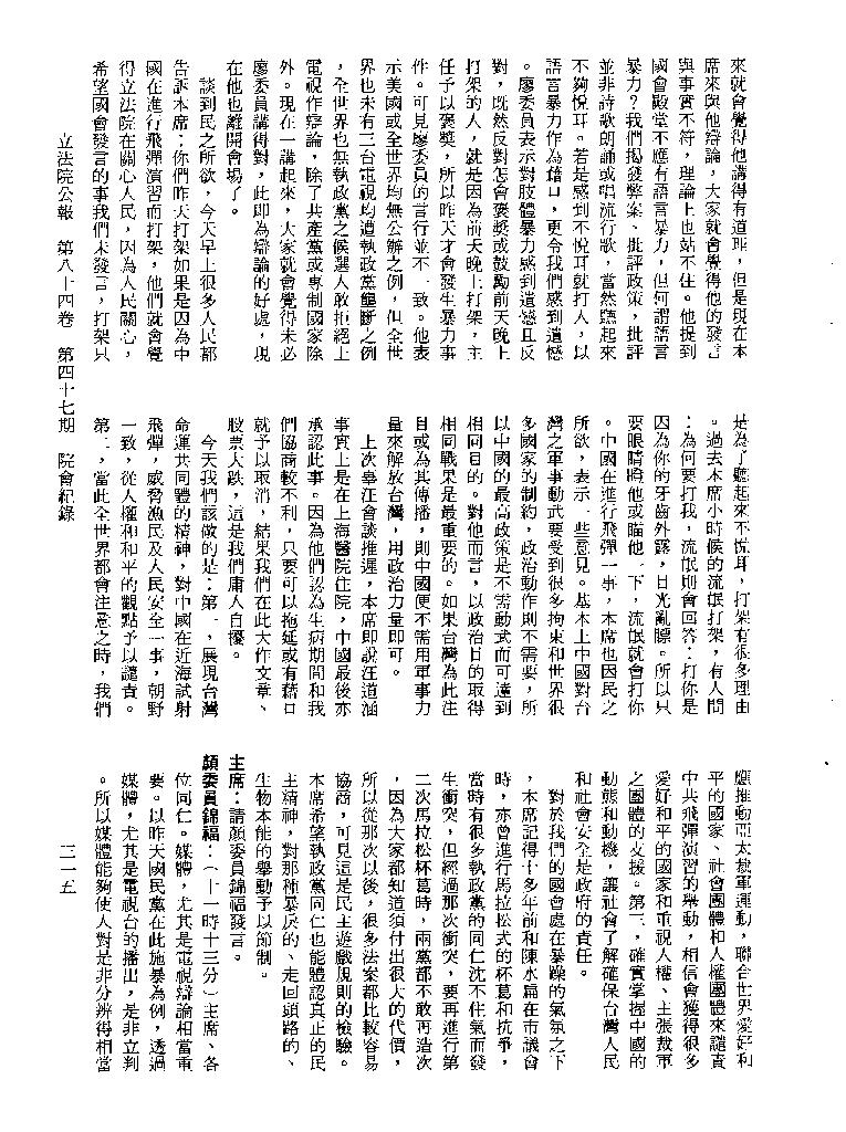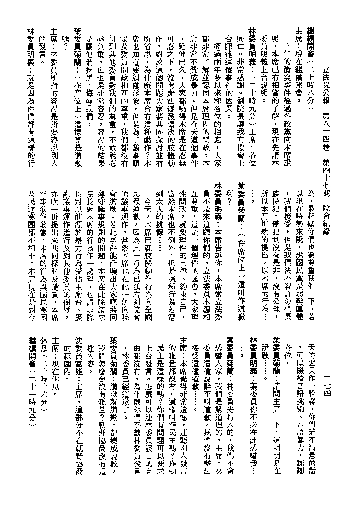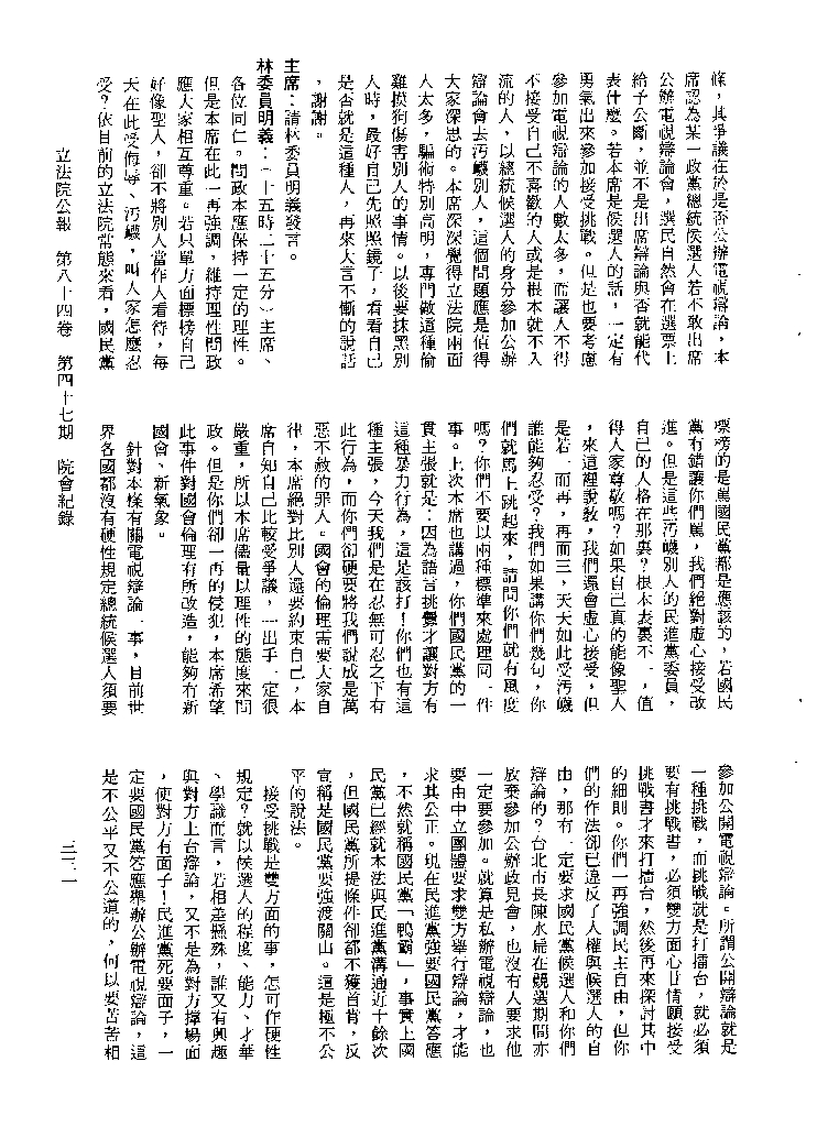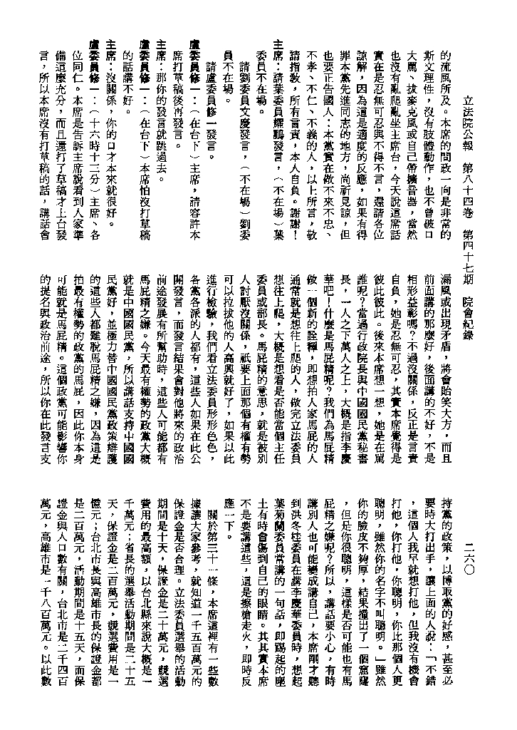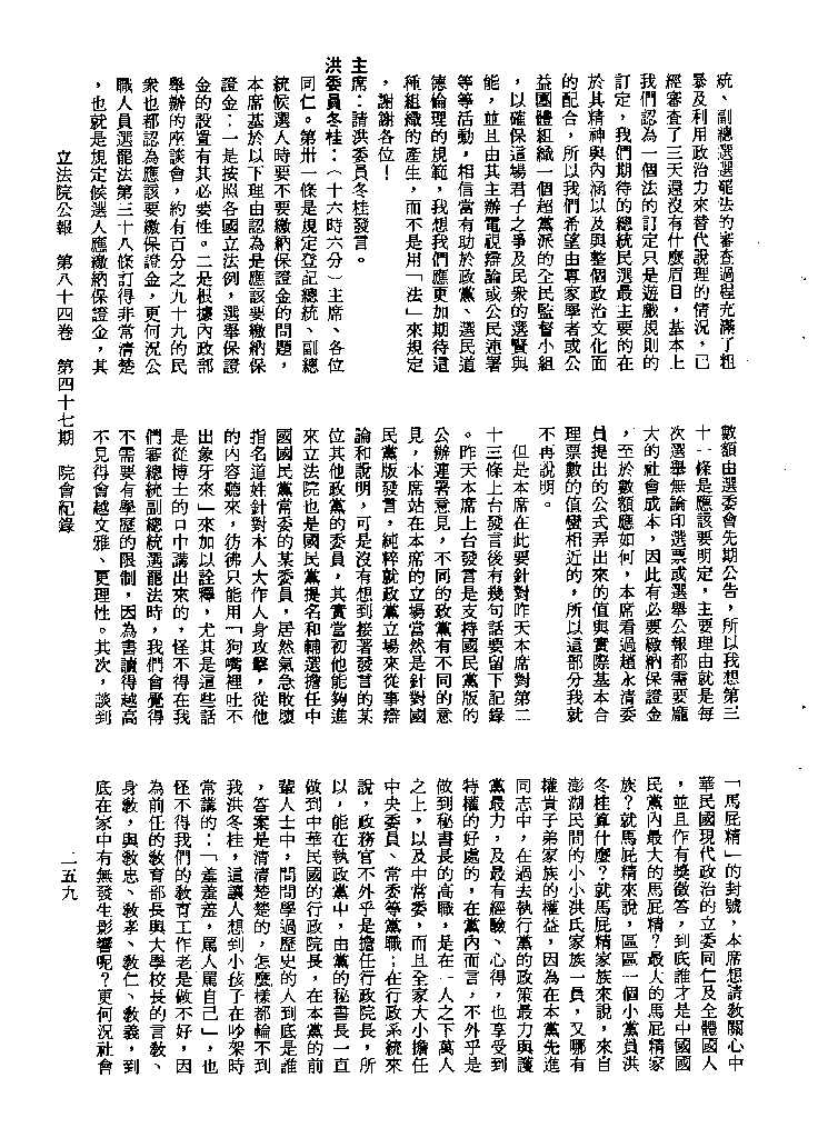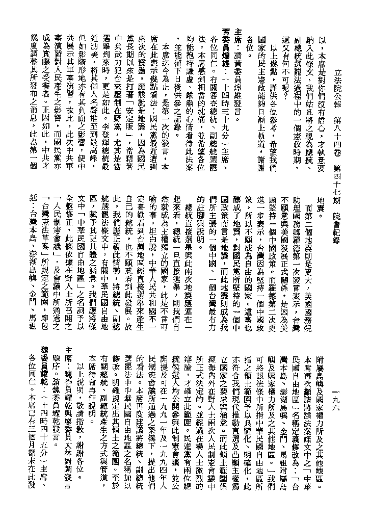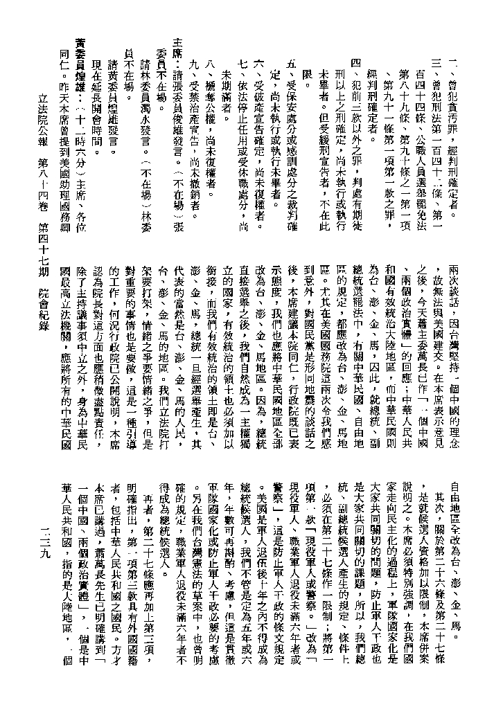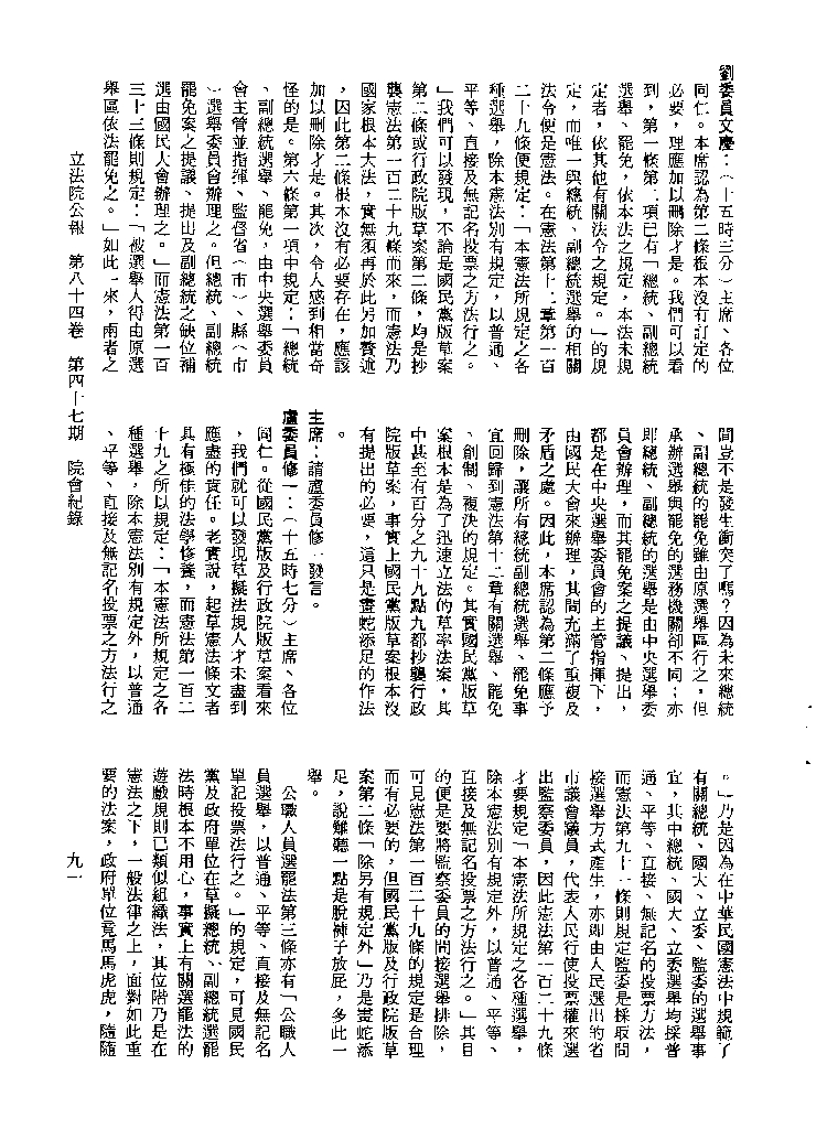 1.本案第2條以下條文,立法院第2屆第5會期第38次會議進行審議,第38次院會共包括民國84年7月14日下午、7月17日、7月18日、7月19日及7月20日上午等5個會議日。 2.由於民進黨團採取焦土策略,會議主席堅持依據議事規則逐條處理,拒絕包裹表決。因此本案第2條以下各條文的進行,按議事規則作同一模式的處理,在宣讀條文後由1位或2位委員發言,國民黨團委員即提出停止討論逕付表決之動議,停止討論動議經表決通過,該條文停止討論提付表決,此時民進黨團委員提出書面修正動議,其修正動議如獲多數支持,即照其修正動議通過,如其修正動議少數不通過,即將饒委員提案條文提付表決通過。 3.本件立法院公報紀錄第84卷,記載第38次會議5個會議日逐條討論表決之經過(第47期第87頁至第523頁)。