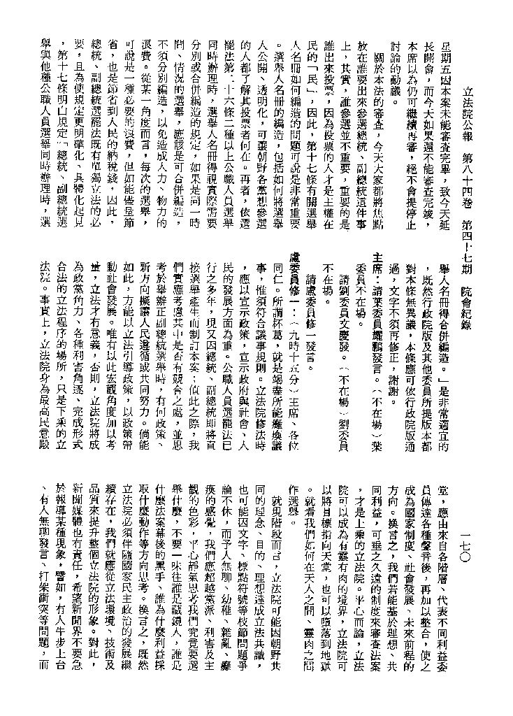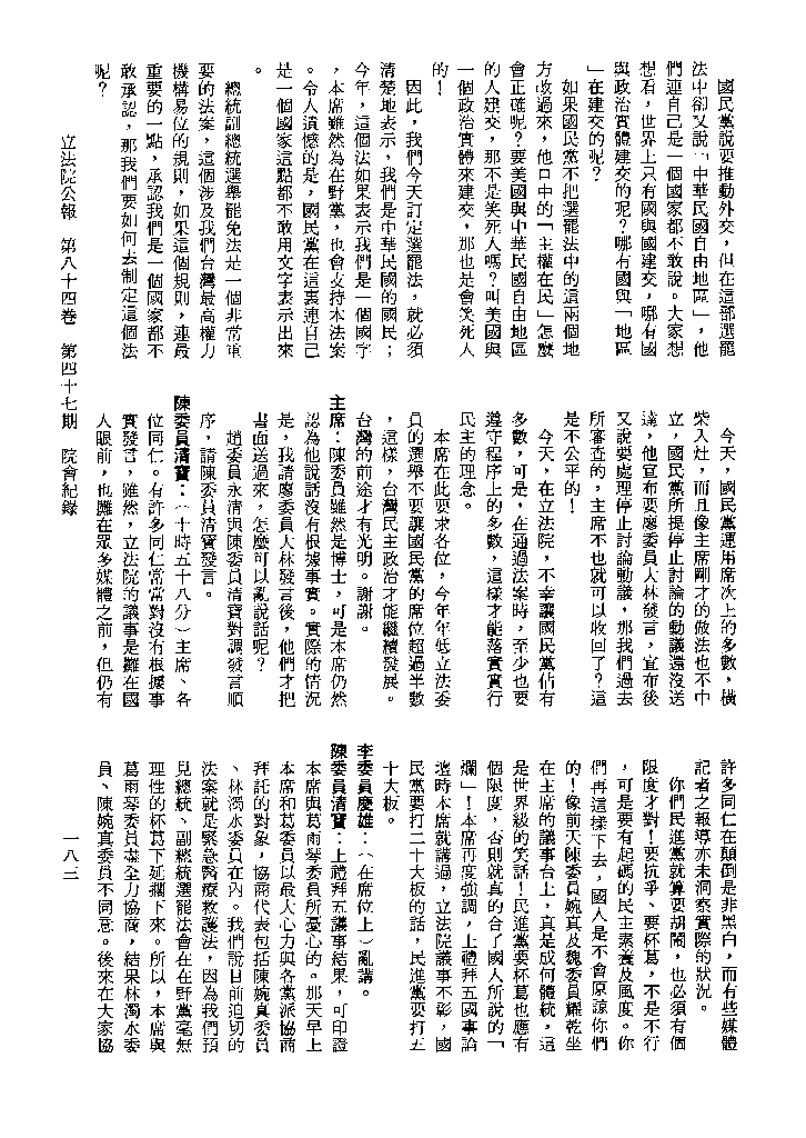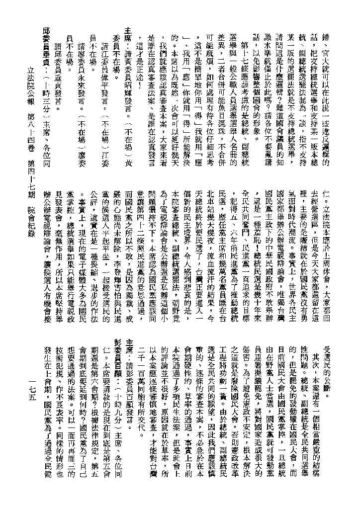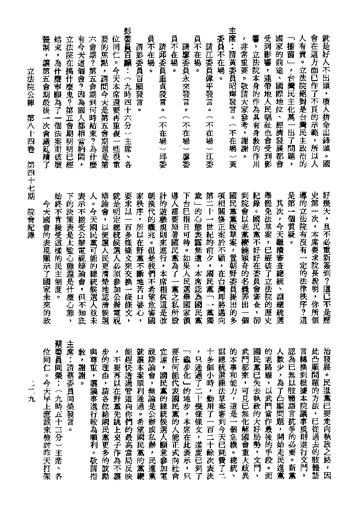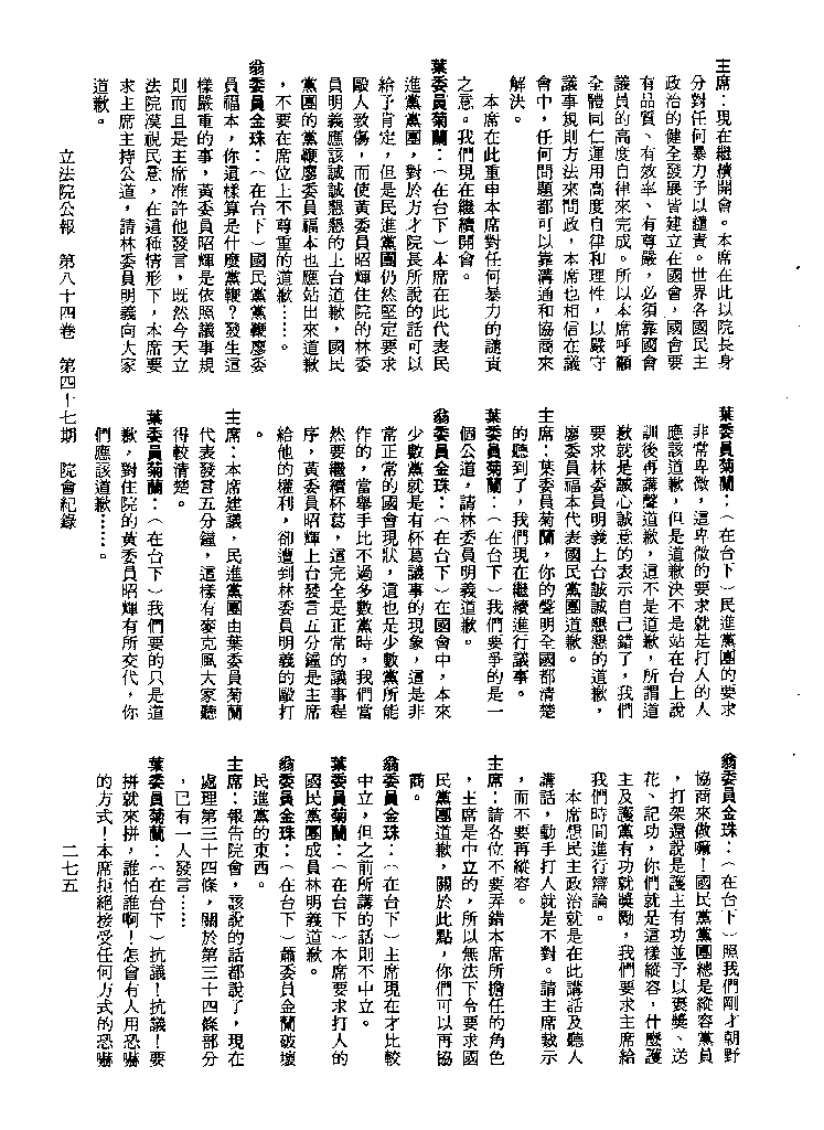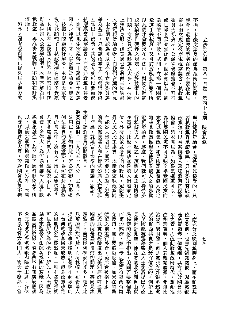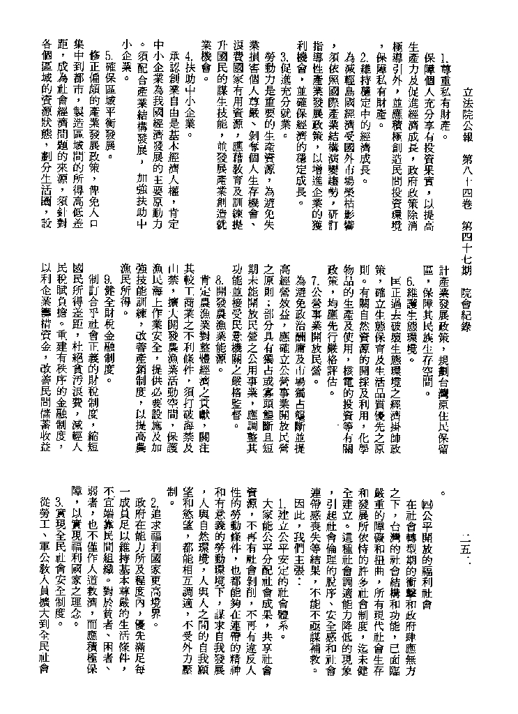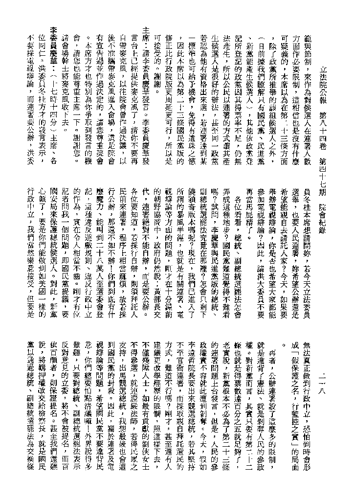 1.本案第2條以下條文,立法院第2屆第5會期第38次會議進行審議,第38次院會共包括民國84年7月14日下午、7月17日、7月18日、7月19日及7月20日上午等5個會議日。 2.由於民進黨團採取焦土策略,會議主席堅持依據議事規則逐條處理,拒絕包裹表決。因此本案第2條以下各條文的進行,按議事規則作同一模式的處理,在宣讀條文後由1位或2位委員發言,國民黨團委員即提出停止討論逕付表決之動議,停止討論動議經表決通過,該條文停止討論提付表決,此時民進黨團委員提出書面修正動議,其修正動議如獲多數支持,即照其修正動議通過,如其修正動議少數不通過,即將饒委員提案條文提付表決通過。 3.本件立法院公報紀錄第84卷,記載第38次會議5個會議日逐條討論表決之經過(第47期第87頁至第523頁)。